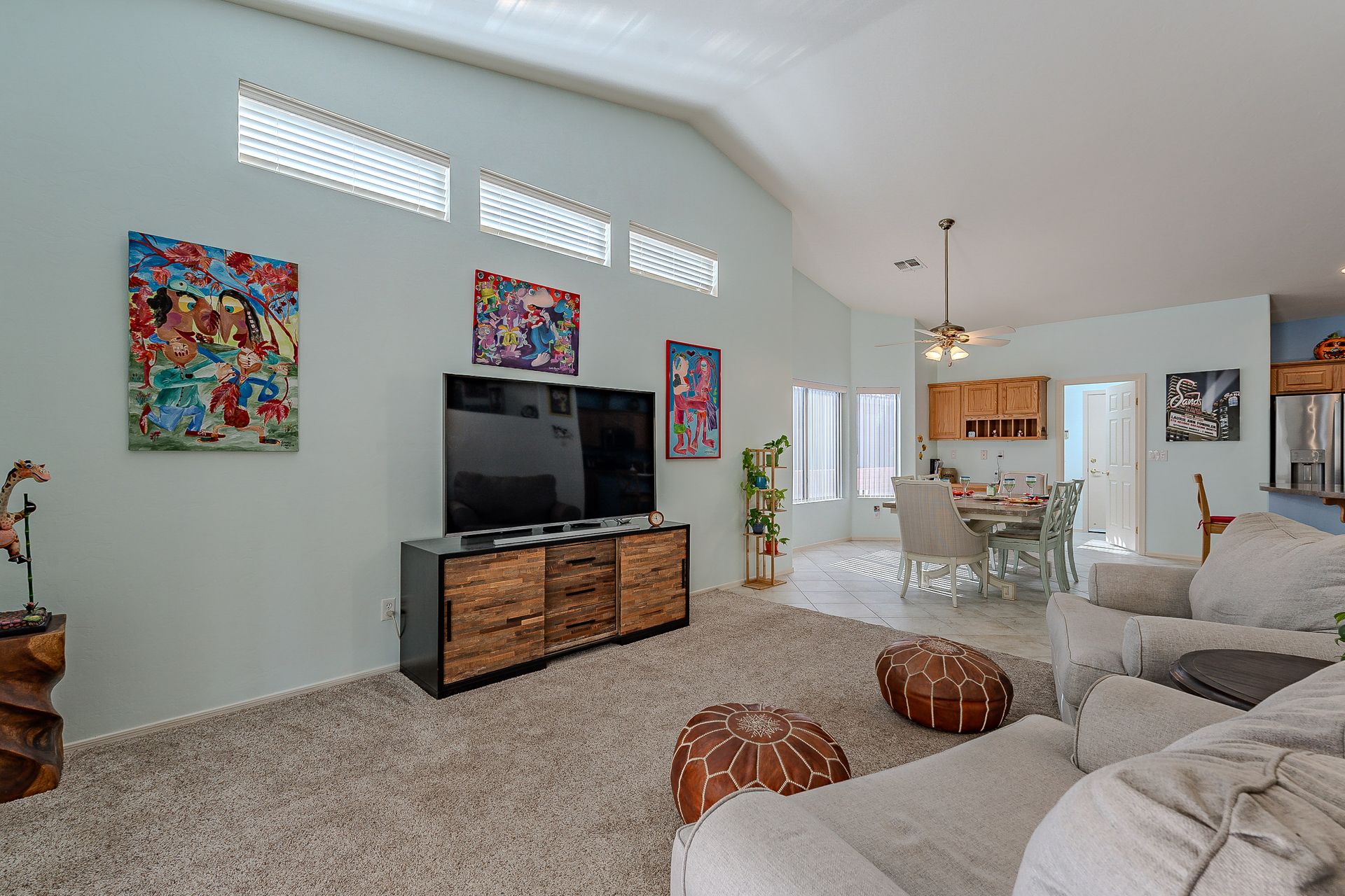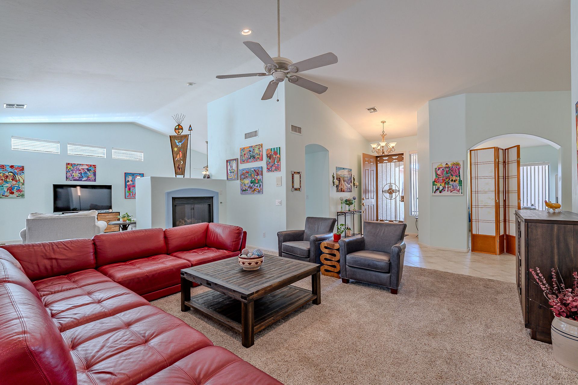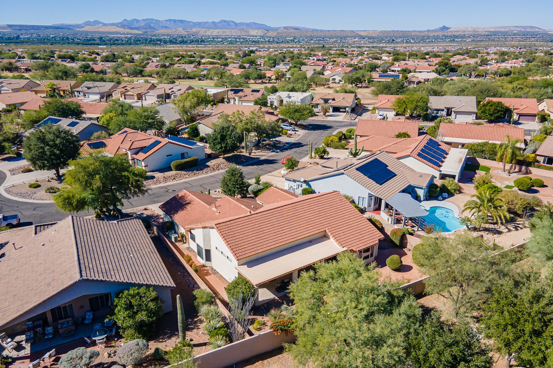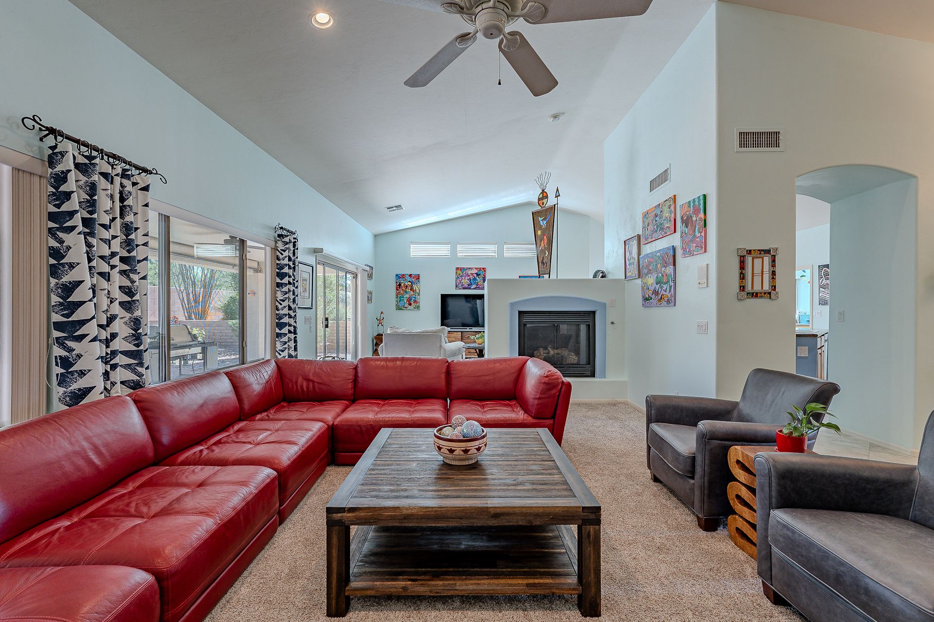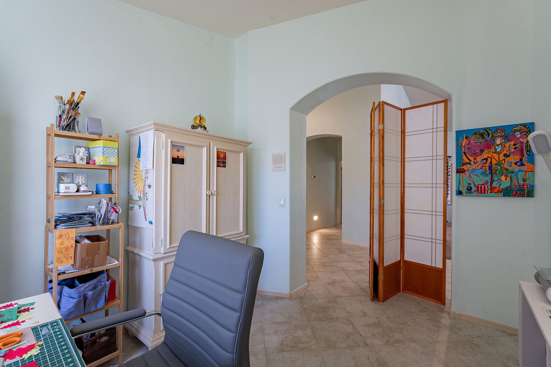 Discover this charming two-bedroom home, plus den, nestled in the renowned Robson Retirement Community of Quail Creek. Spanning approximately 2,195 square feet, this beautifully furnished residence features vibrant Southwestern décor. The backyard is a serene oasis with lush landscaping and a private, covered patio. The great room floor plan includes a cozy TV area and a separate living area with a gas fireplace. Enjoy abundant natural light from the many large windows and the high ceilings. The spacious kitchen boasts stainless steel appliances, ample cabinets with pull-outs, generous counter space and a large island with a farmhouse sink. The sizeable laundry room is equipped with a washer, dryer, sink and countertops. The garage offers storage cabinets and a workbench area.