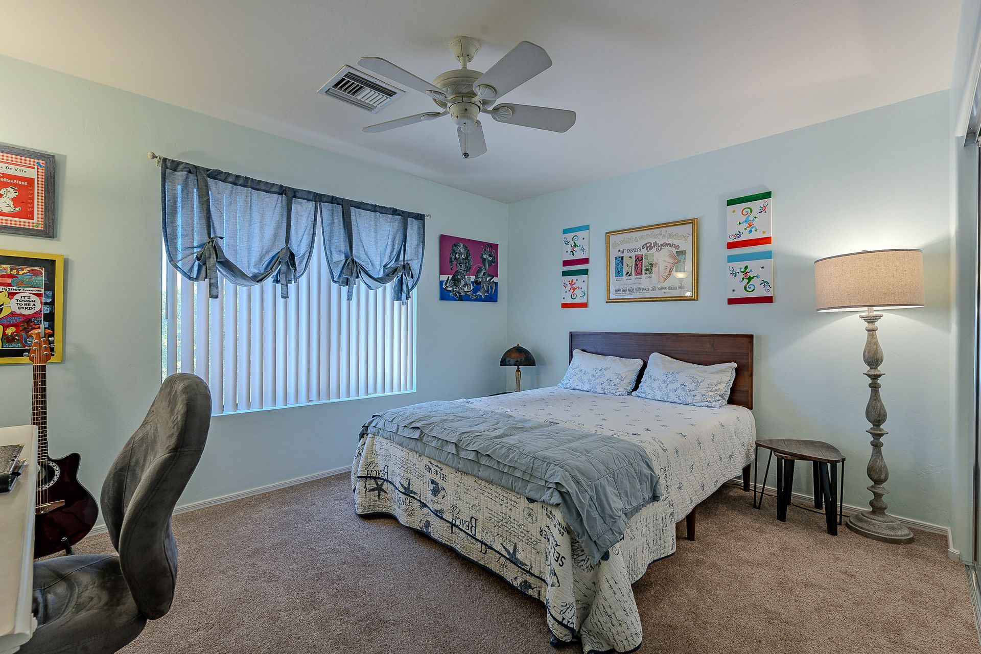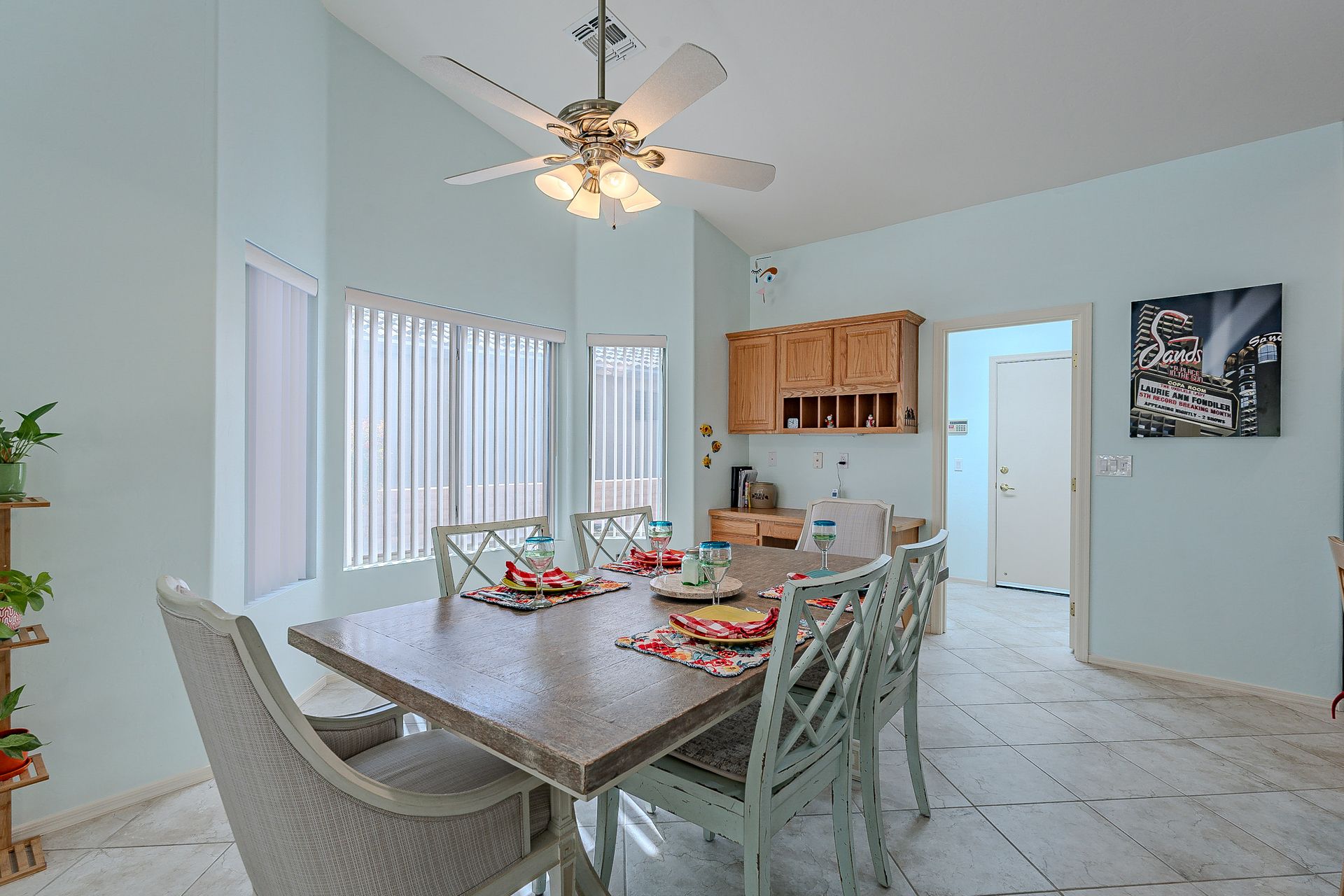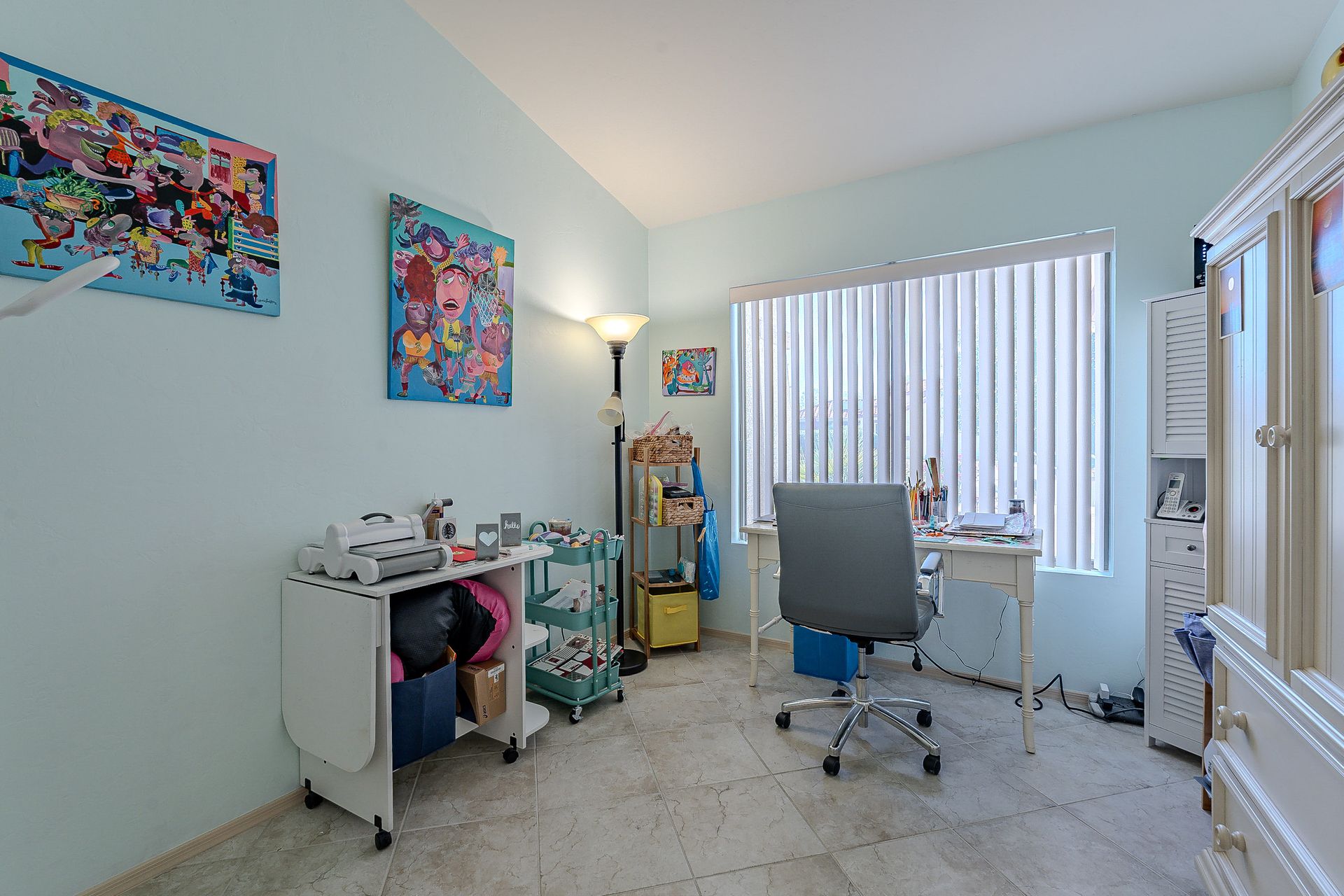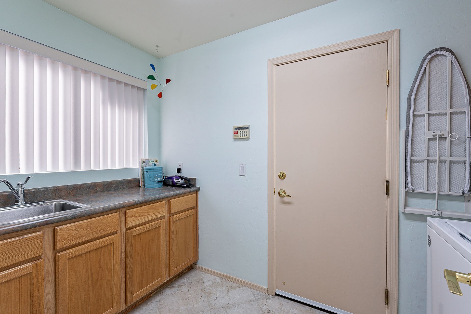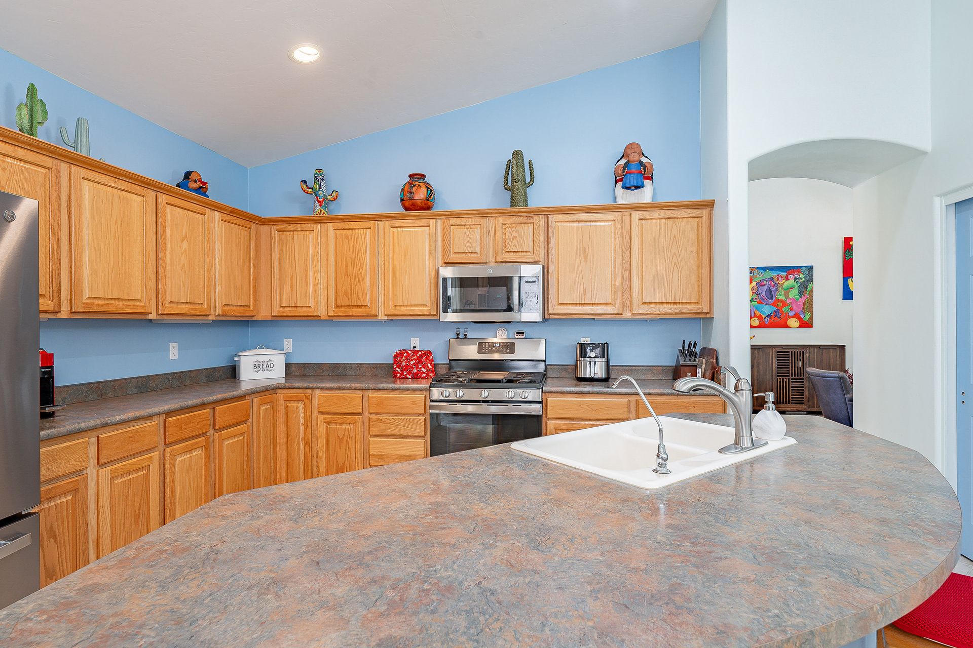 Discover this charming two-bedroom home, plus den, nestled in the renowned Robson Retirement Community of Quail Creek. Spanning approximately 2,195 square feet, this beautifully furnished residence features vibrant Southwestern décor. The backyard is a serene oasis with lush landscaping and a private, covered patio. The great room floor plan includes a cozy TV area and a separate living area with a gas fireplace. Enjoy abundant natural light from the many large windows and the high ceilings. The spacious kitchen boasts stainless steel appliances, ample cabinets with pull-outs, generous counter space and a large island with a farmhouse sink. The sizeable laundry room is equipped with a washer, dryer, sink and countertops. The garage offers storage cabinets and a workbench area.