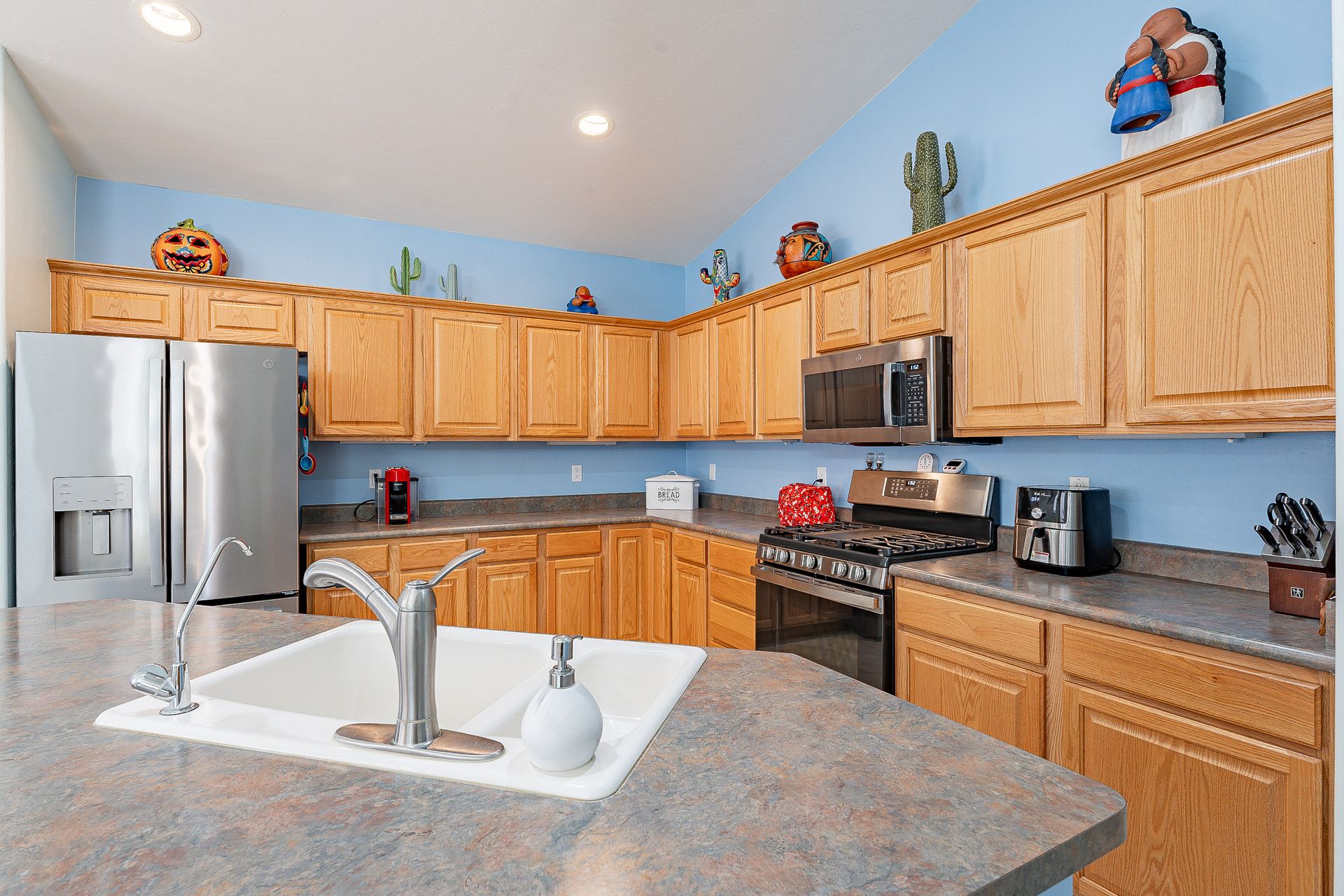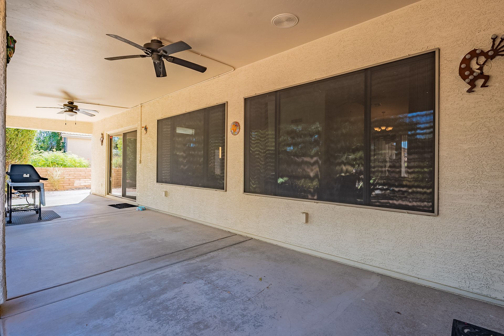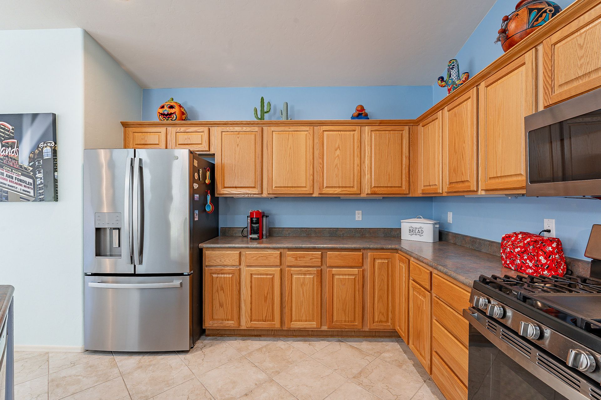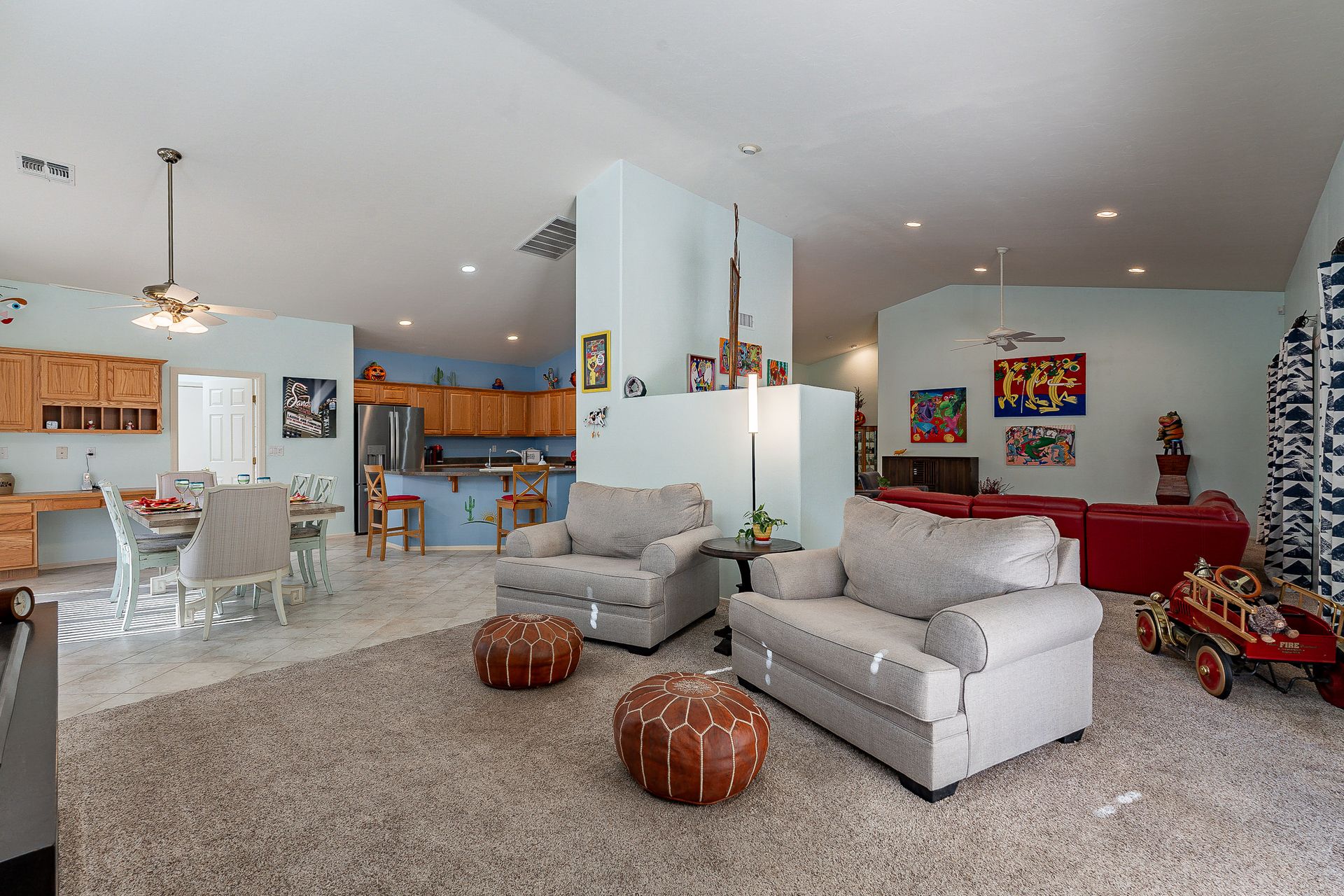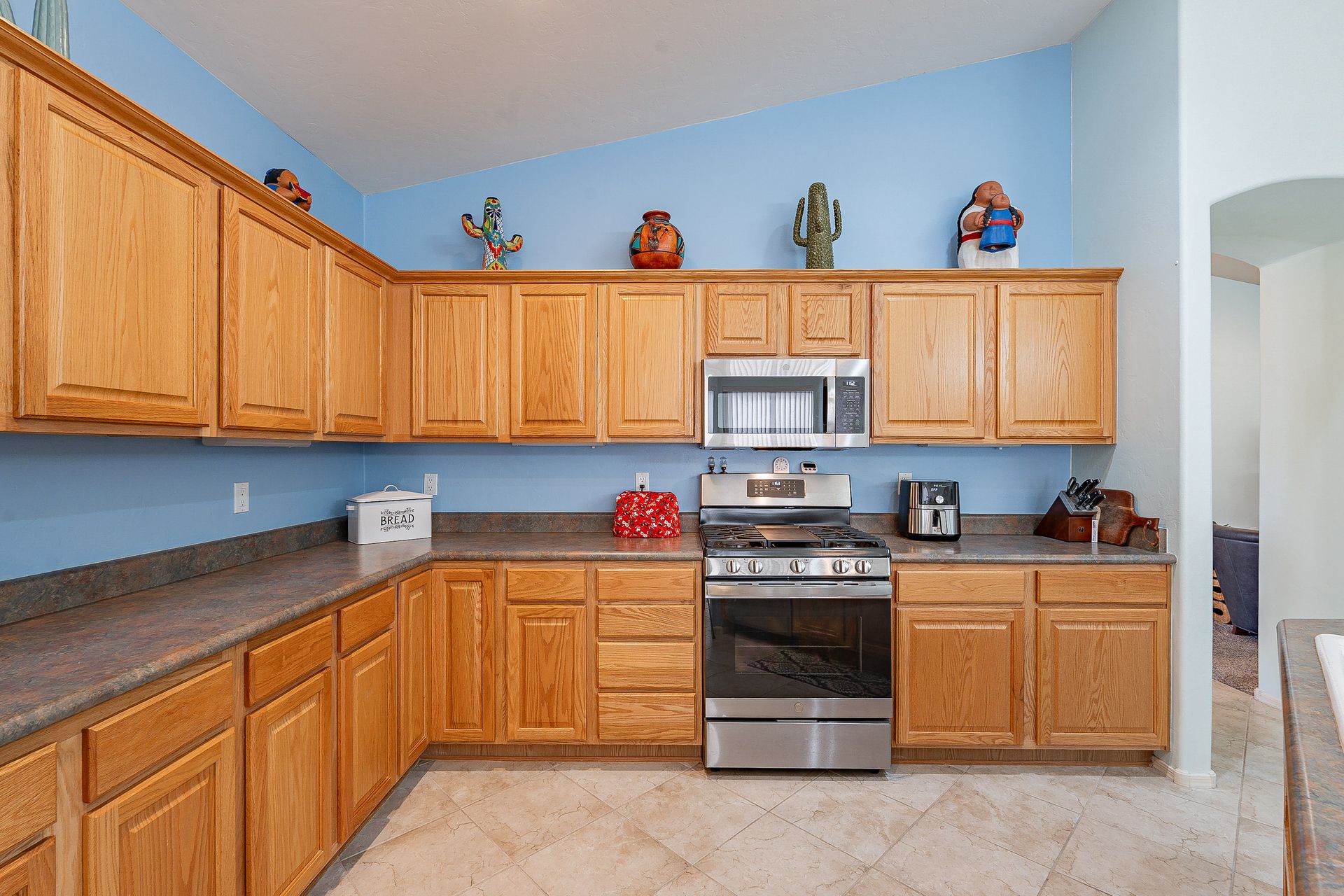 Discover this charming two-bedroom home, plus den, nestled in the renowned Robson Retirement Community of Quail Creek. Spanning approximately 2,195 square feet, this beautifully furnished residence features vibrant Southwestern décor. The backyard is a serene oasis with lush landscaping and a private, covered patio. The great room floor plan includes a cozy TV area and a separate living area with a gas fireplace. Enjoy abundant natural light from the many large windows and the high ceilings. The spacious kitchen boasts stainless steel appliances, ample cabinets with pull-outs, generous counter space and a large island with a farmhouse sink. The sizeable laundry room is equipped with a washer, dryer, sink and countertops. The garage offers storage cabinets and a workbench area.