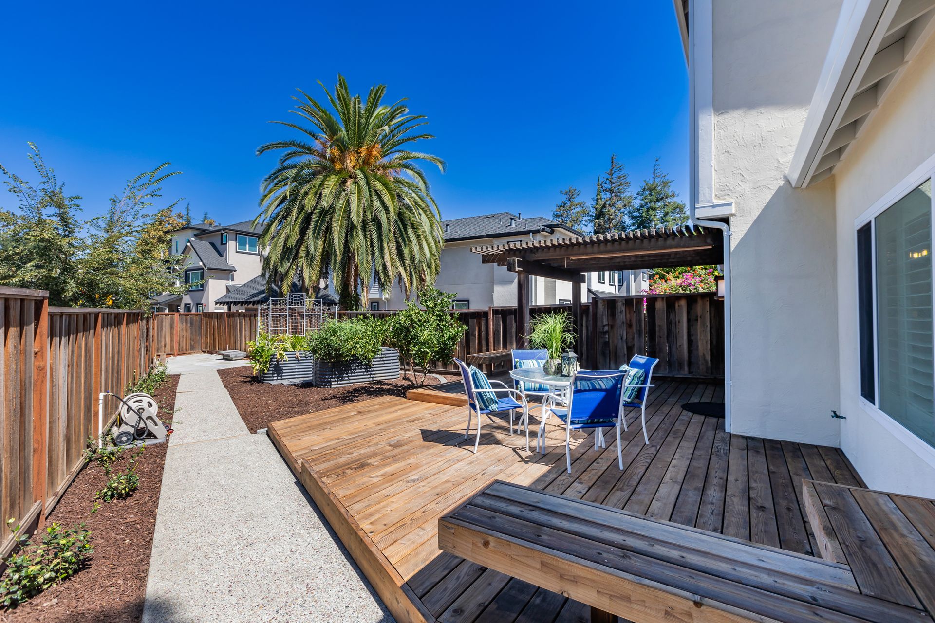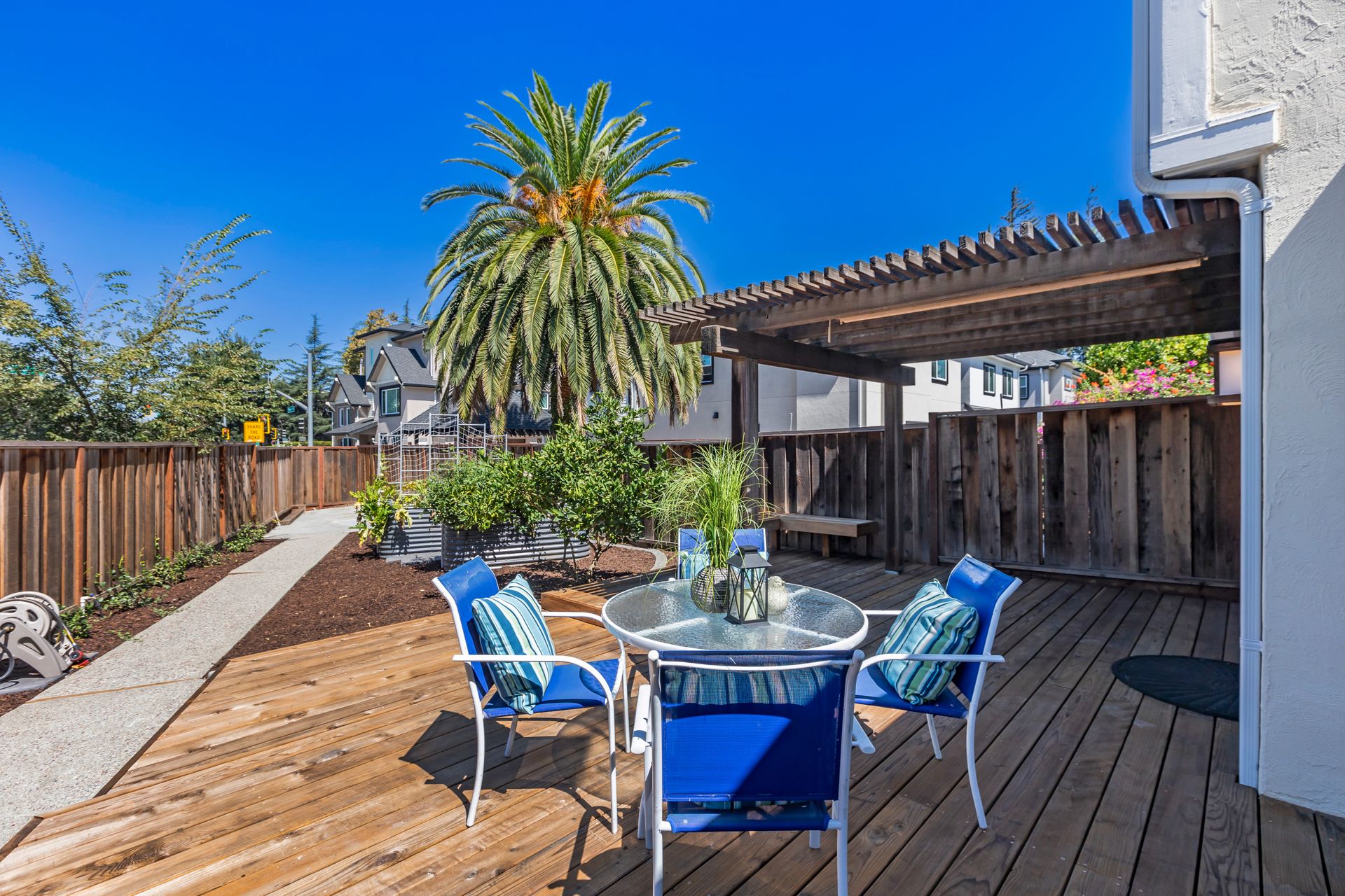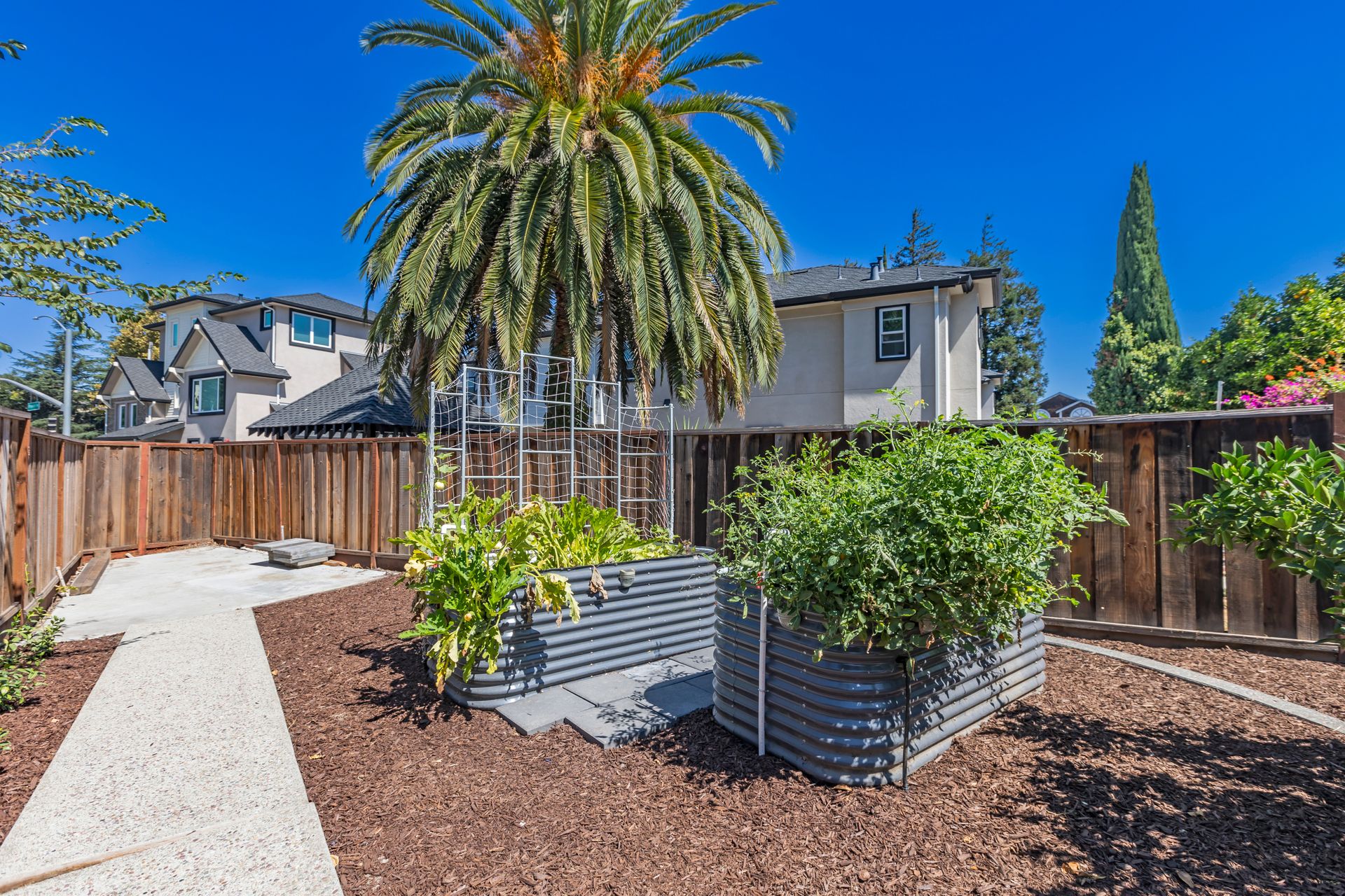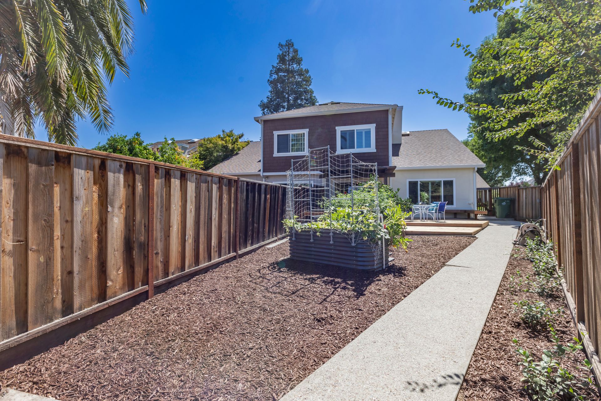 Outdoors, the property boasts a spacious deck, offering an inviting space for outdoor enjoyment. The irrigated raised planting beds and prolific Meyer lemon tree provide opportunities for gardening and fresh produce. The home's proximity to public transit, including the Milpitas BART and Berryessa BART stations, as well as the San Jose International Airport, offers convenient access to the surrounding area.