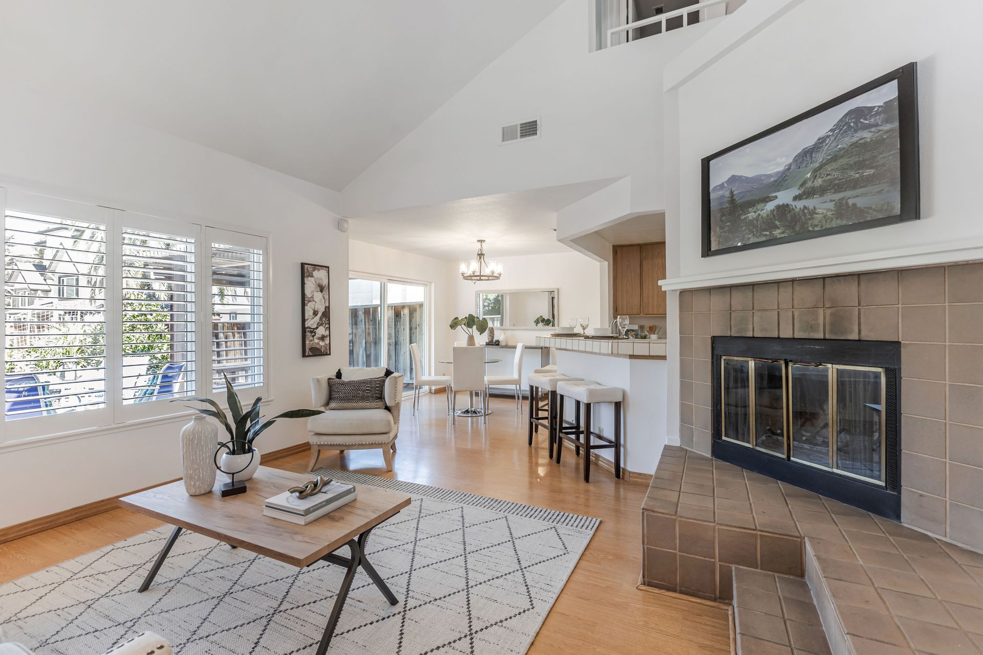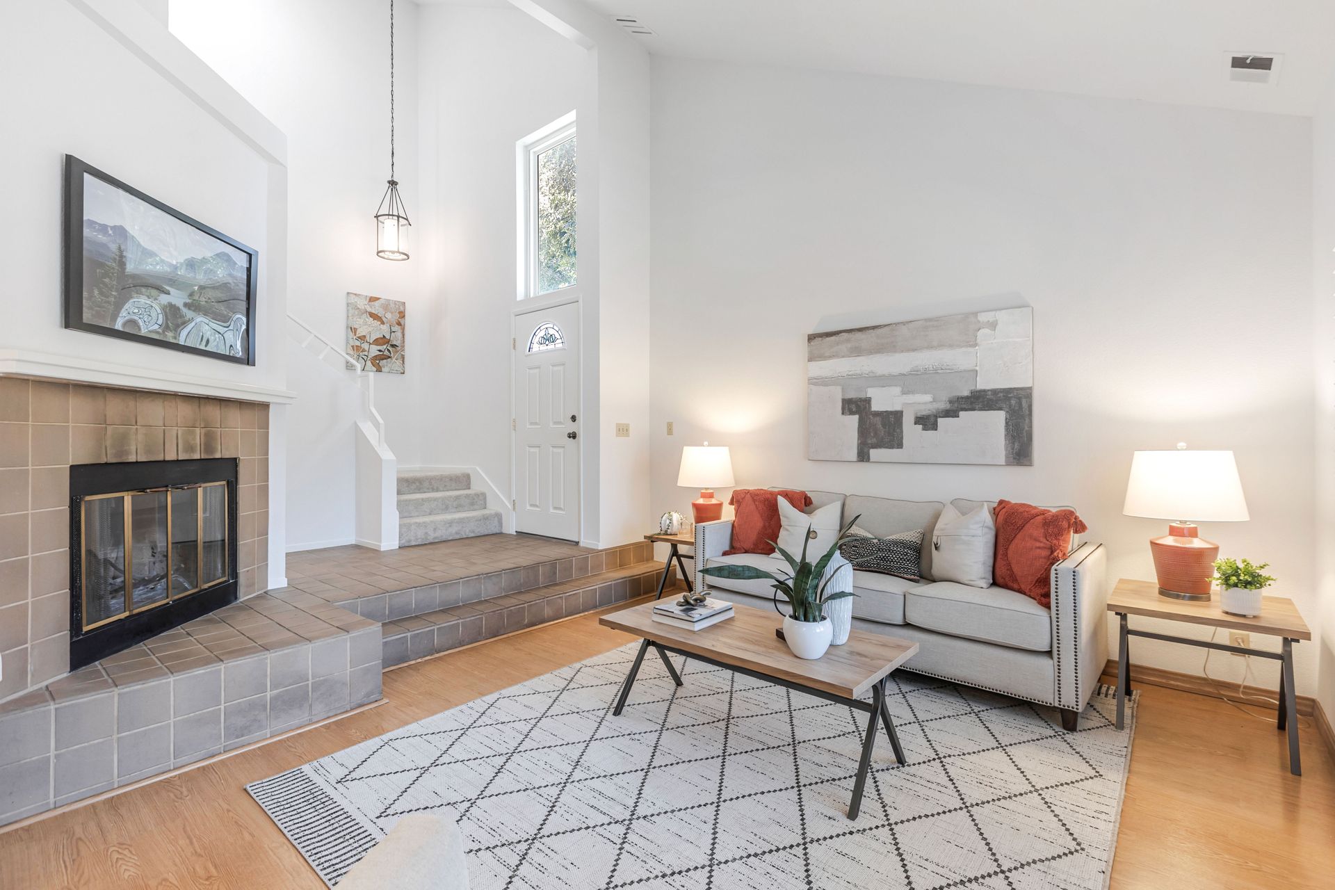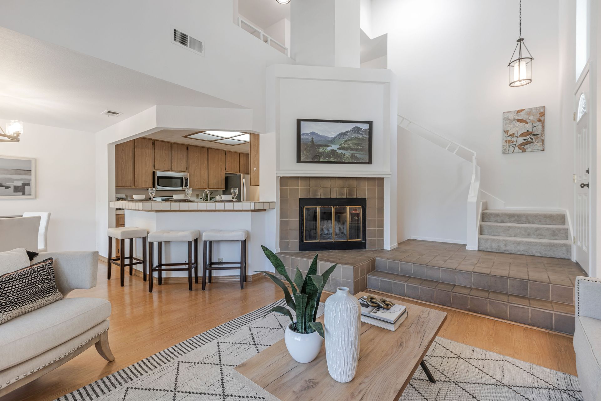 The home offers approximately 1,490 square feet of living space with three bedrooms and two and a half bathrooms. The spacious layout features an open concept design, allowing for ample natural light and a seamless flow between the living areas. The elegant fireplace serves as a focal point, complemented by the neutral color palette and new plush carpeting upstairs.