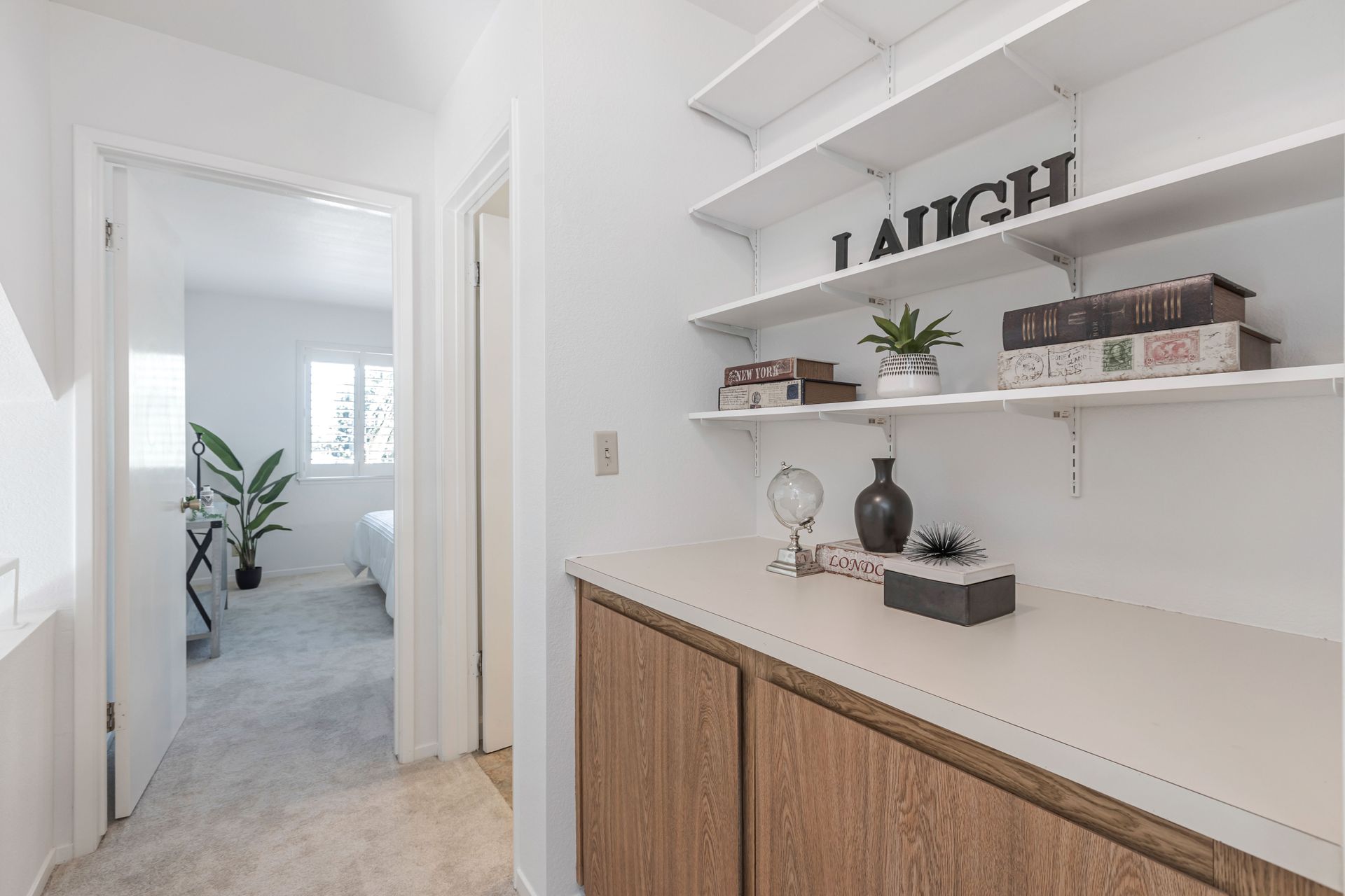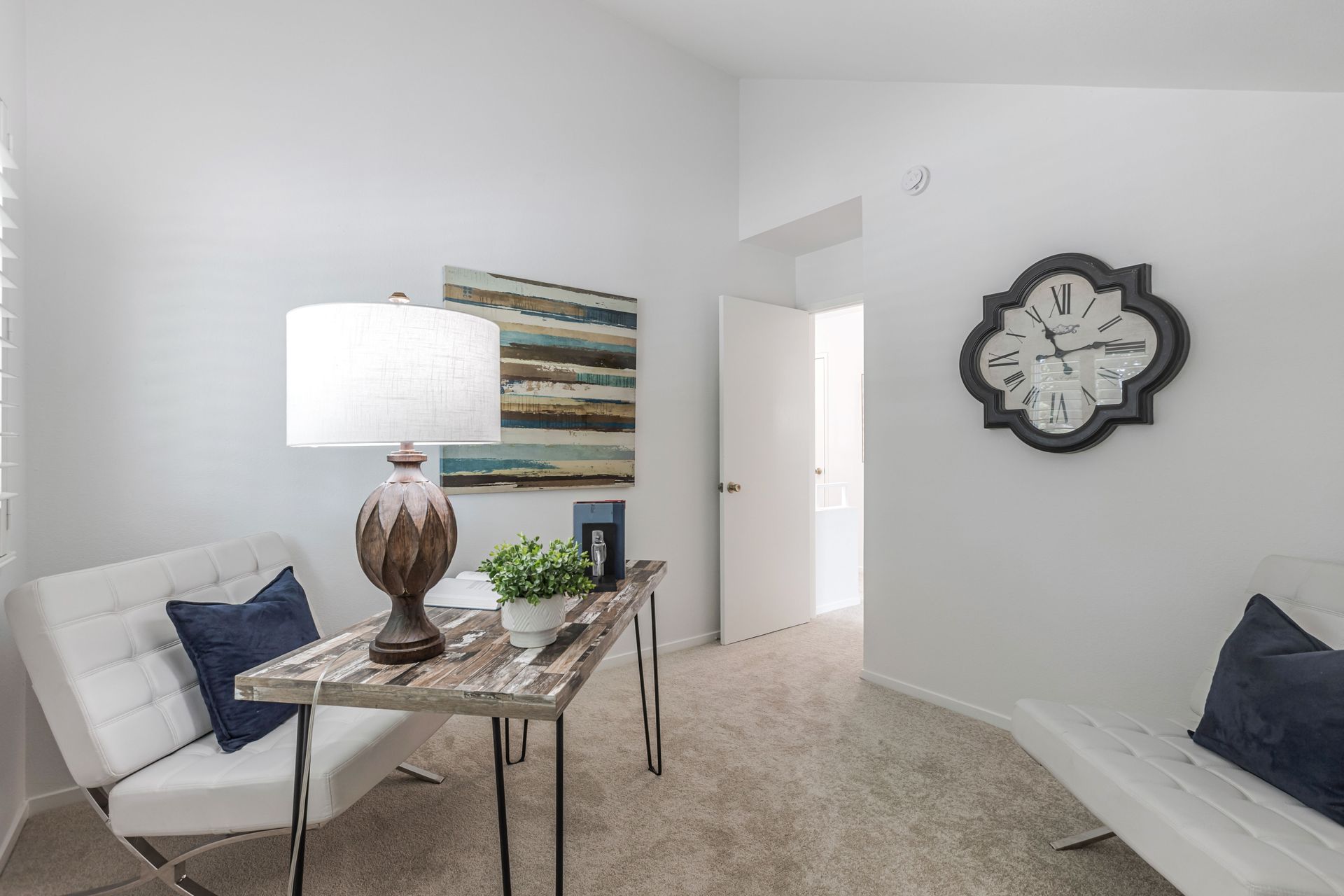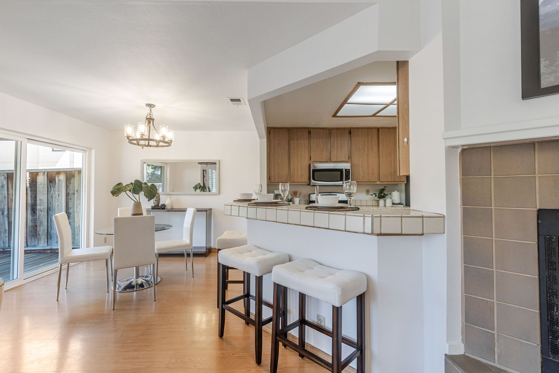 The home offers approximately 1,490 square feet of living space with three bedrooms and two and a half bathrooms. The spacious layout features an open concept design, allowing for ample natural light and a seamless flow between the living areas. The elegant fireplace serves as a focal point, complemented by the neutral color palette and new plush carpeting upstairs.