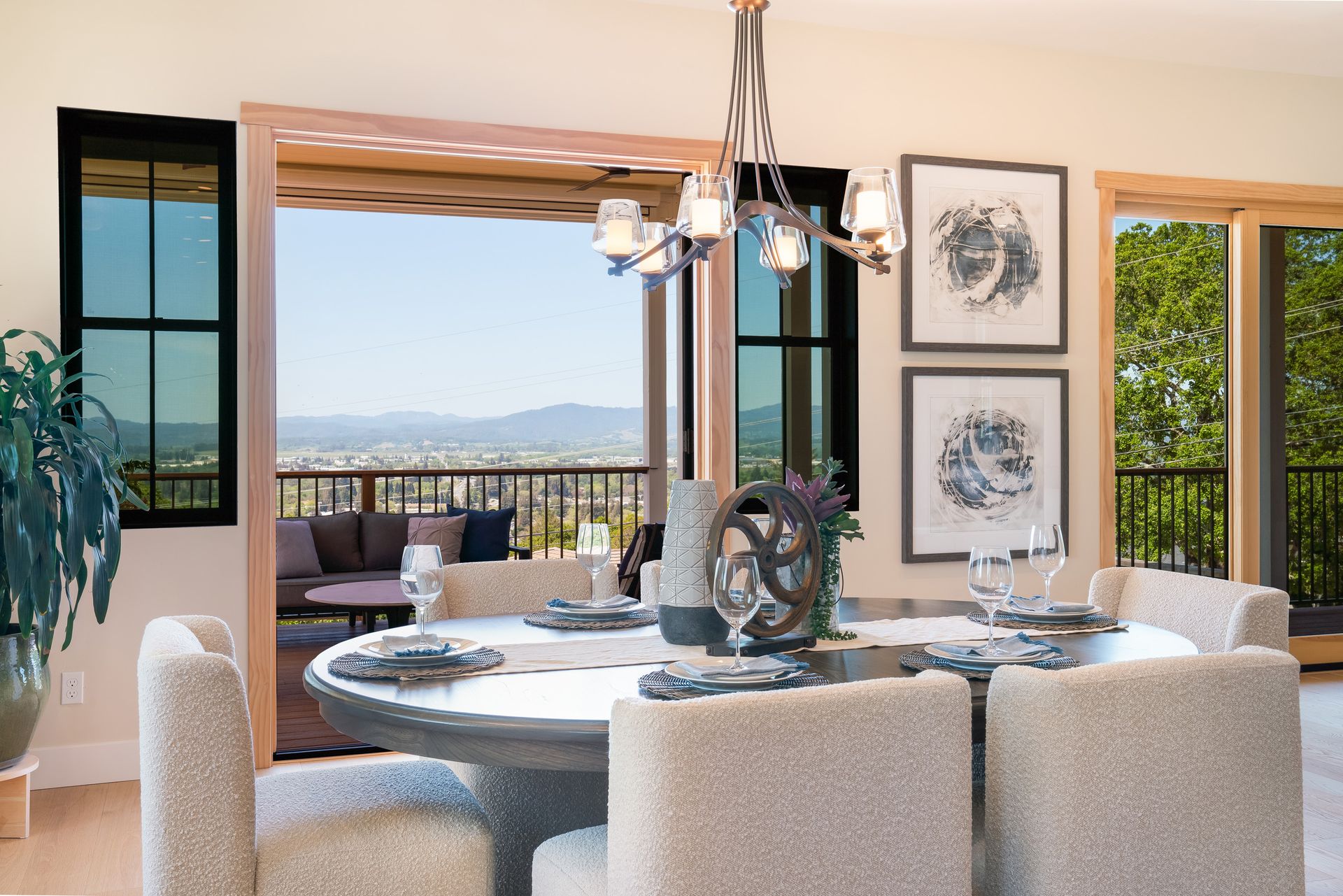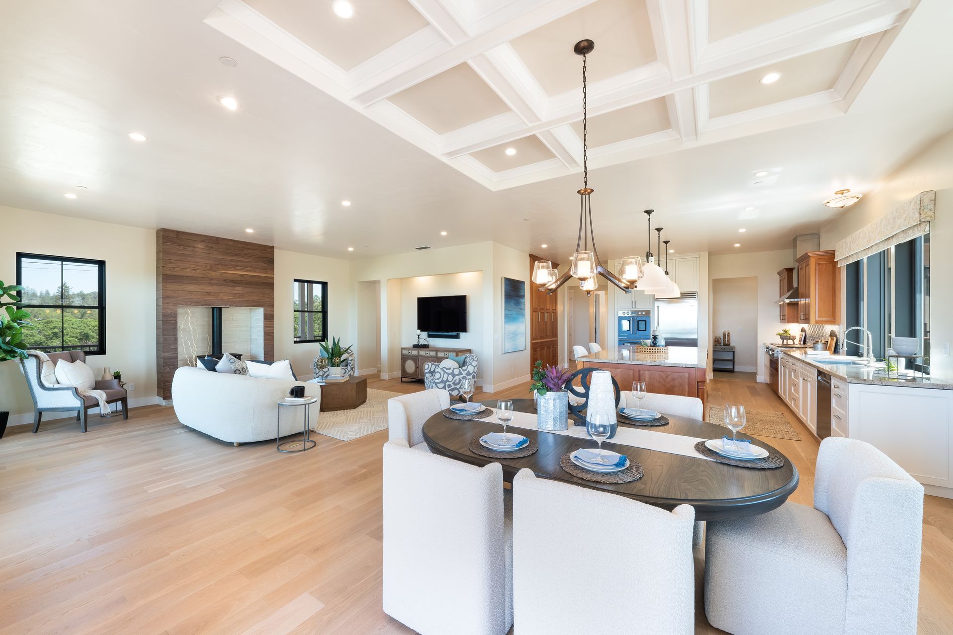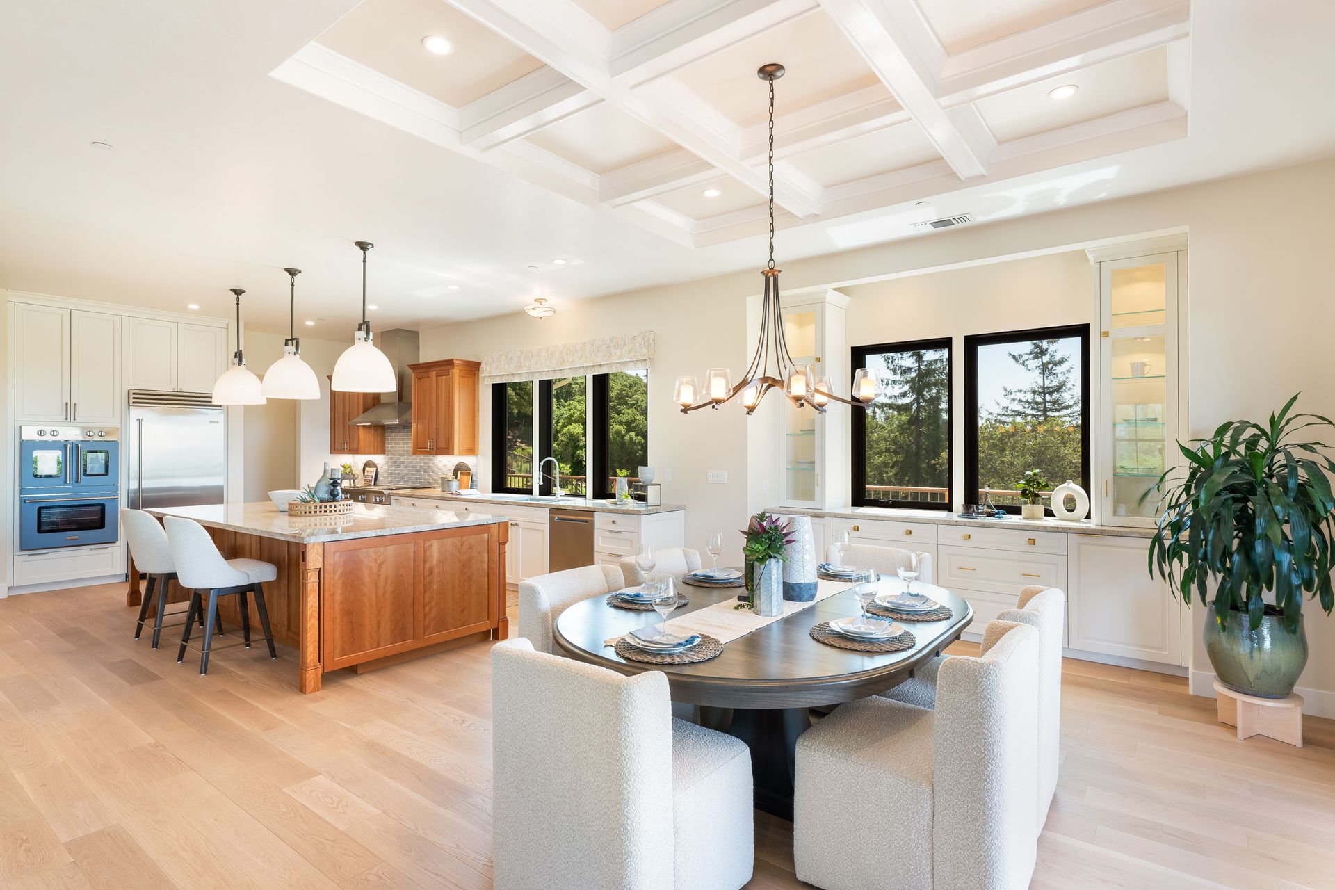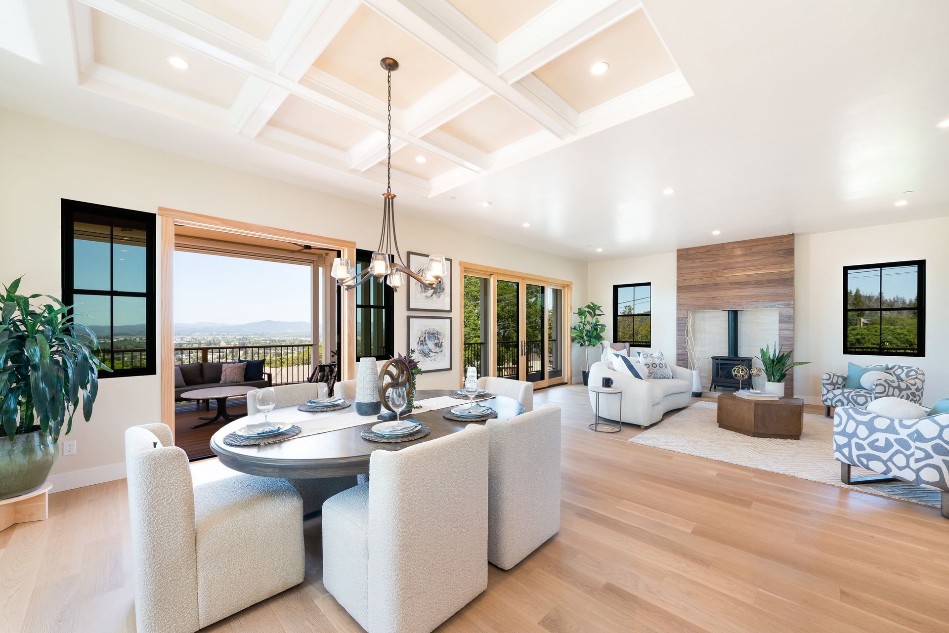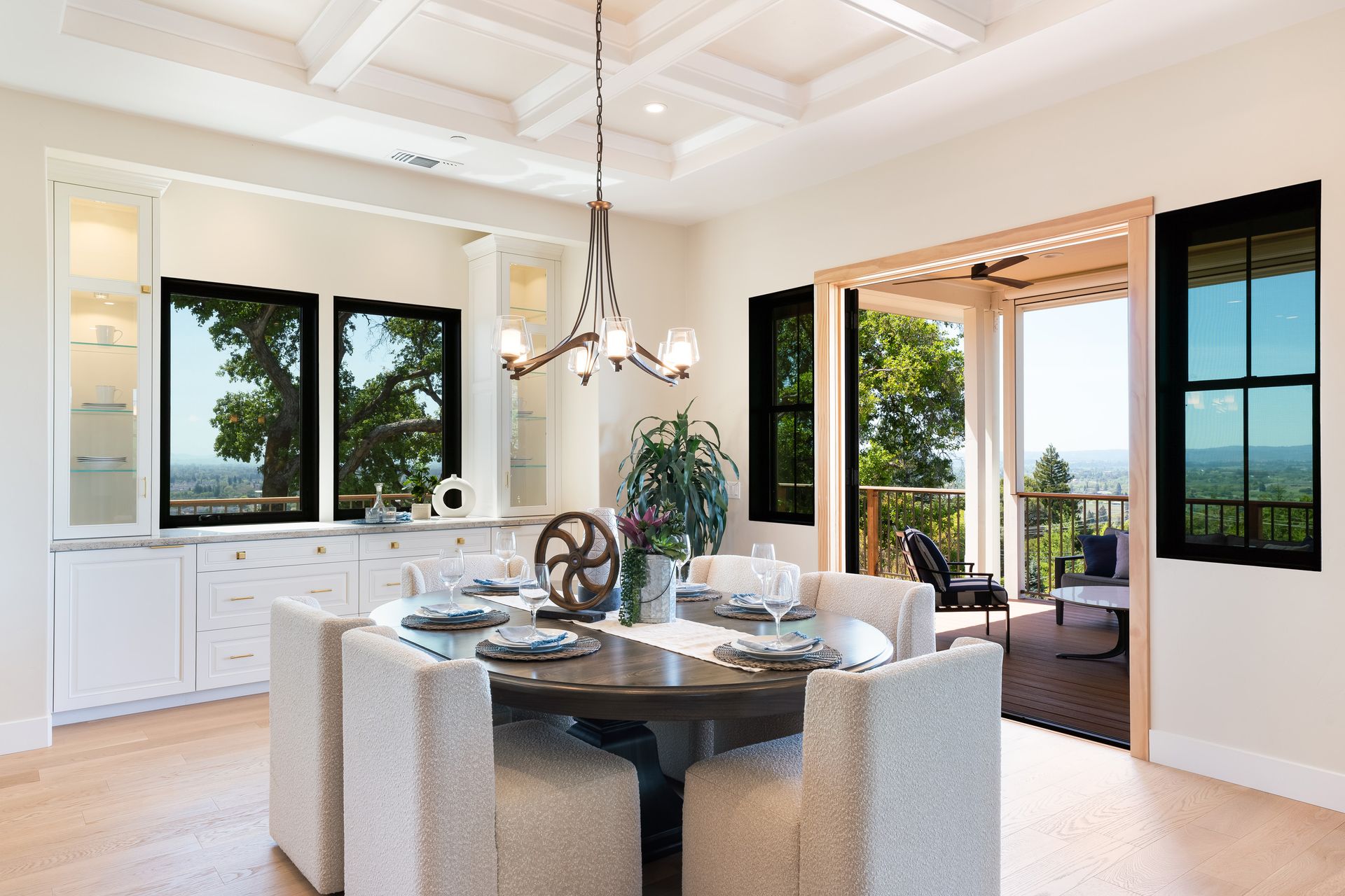 Dining area with architecturally appealing coffered ceiling, built-in buffet, direct access to the view deck