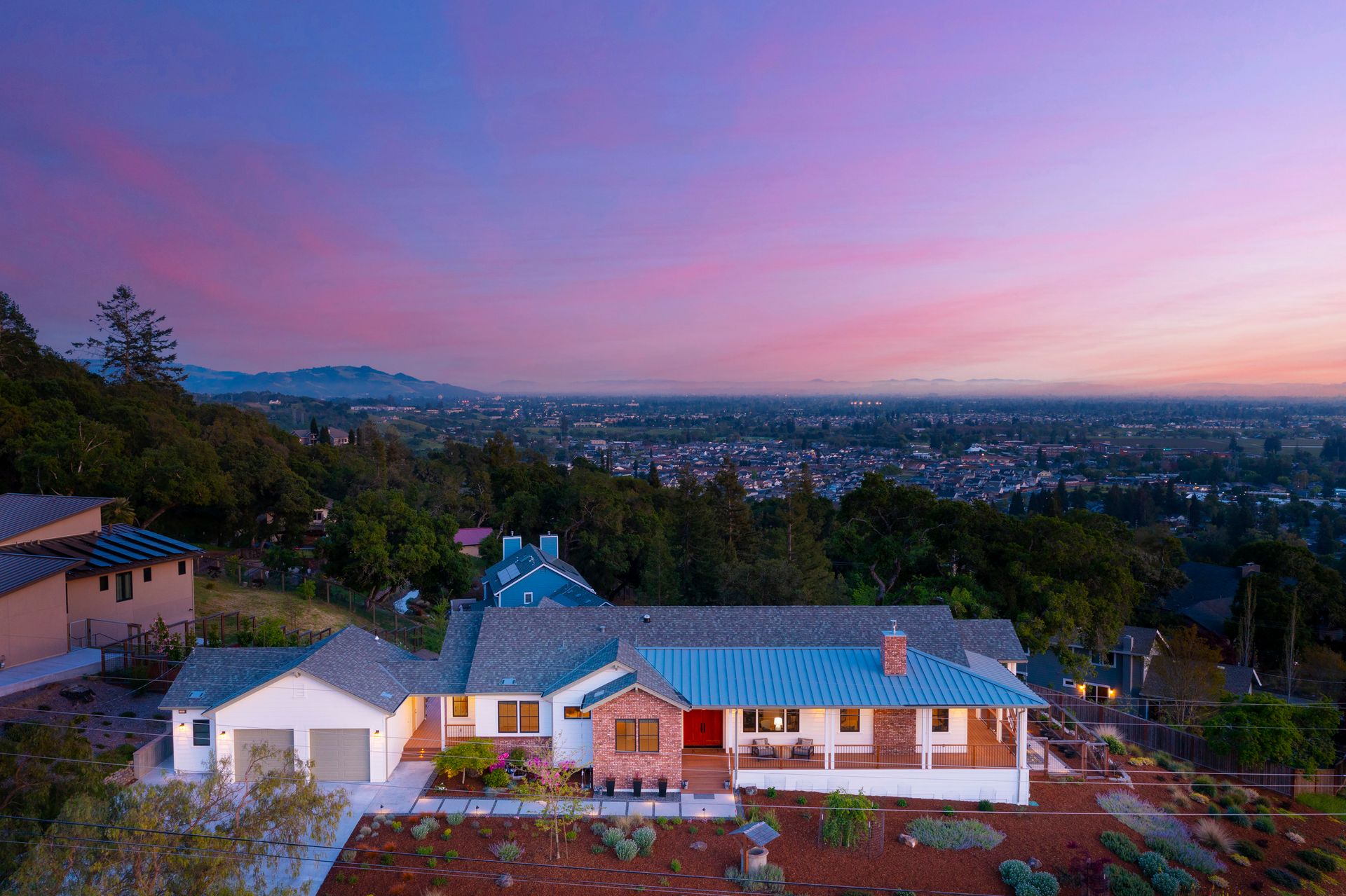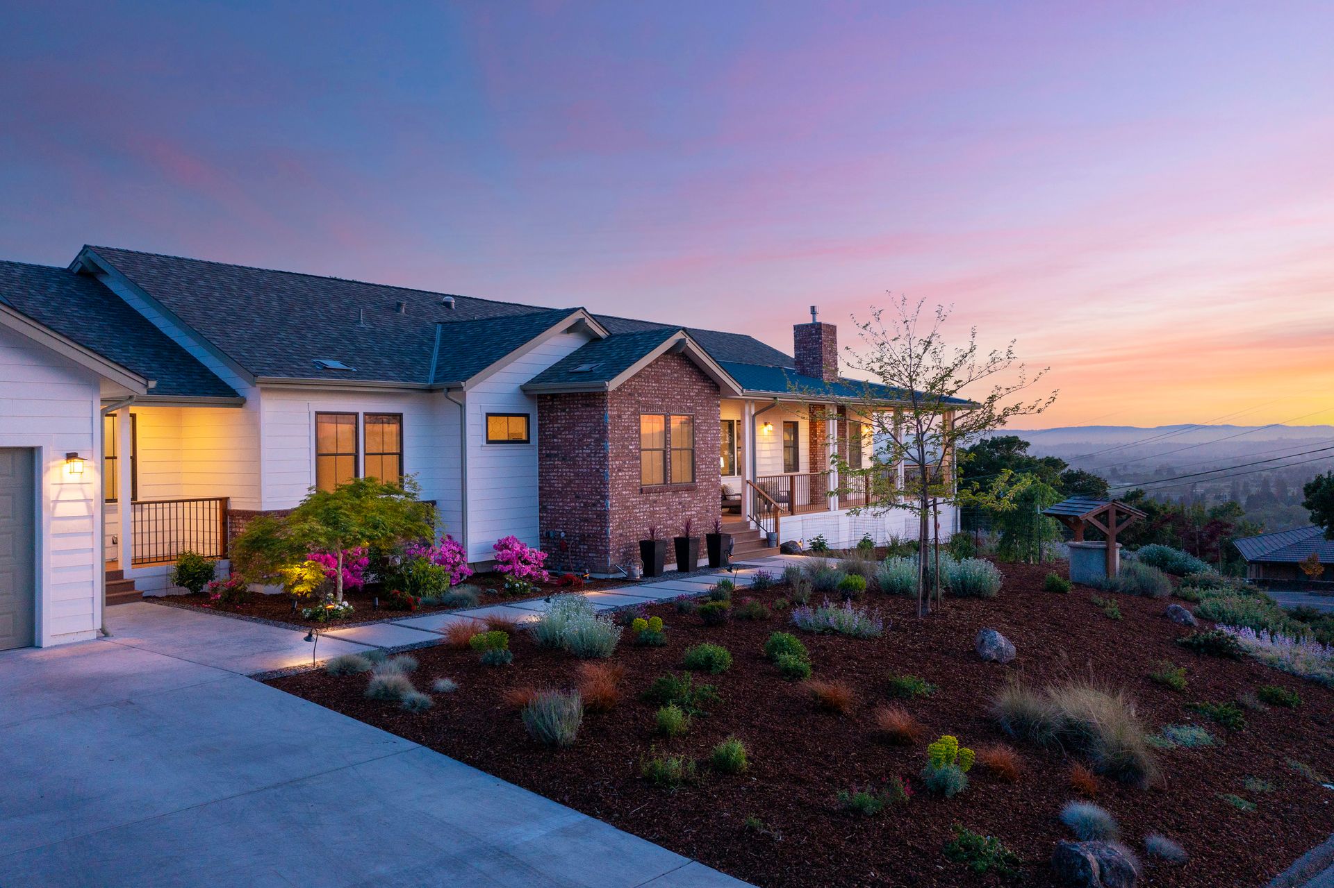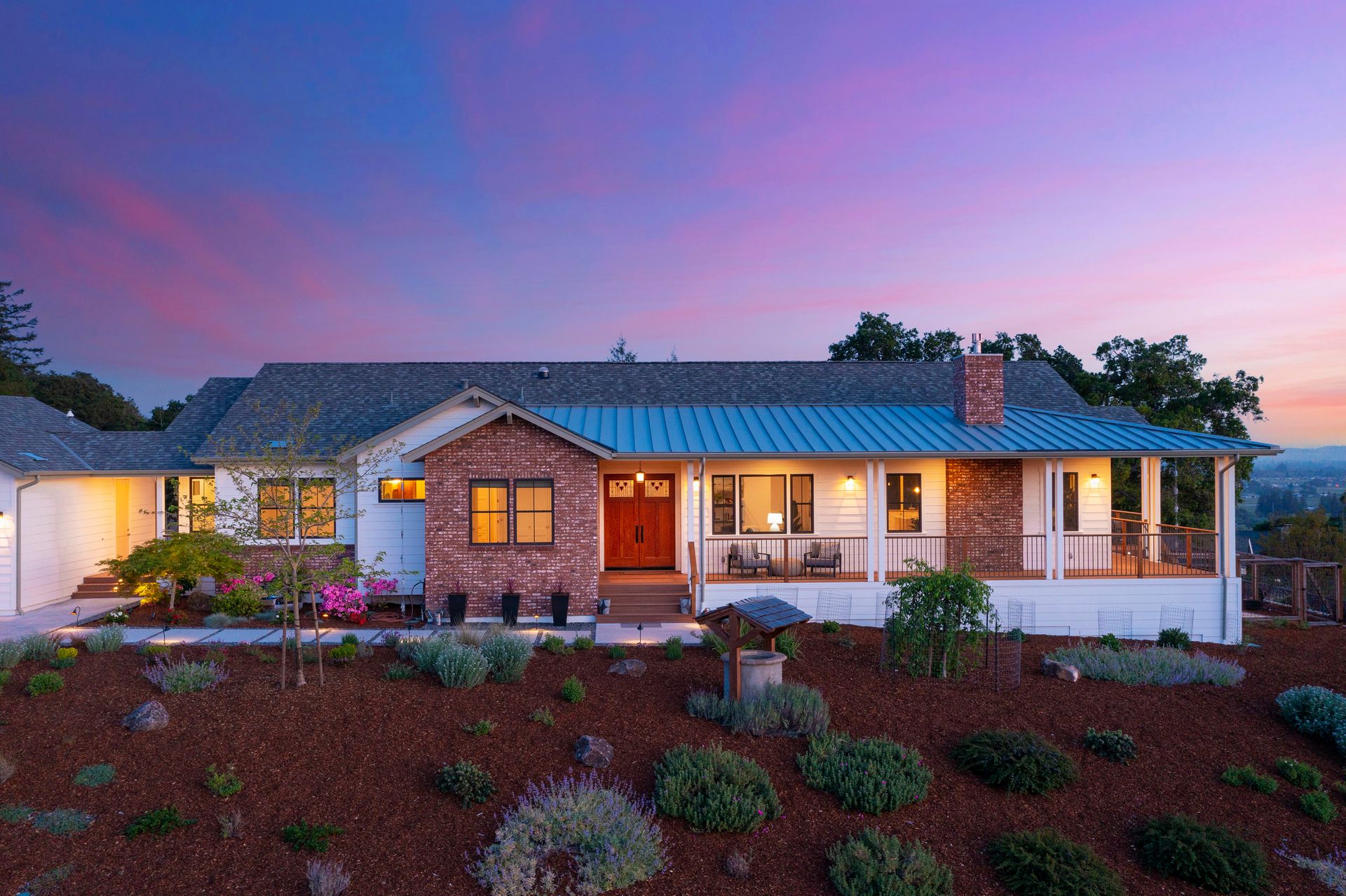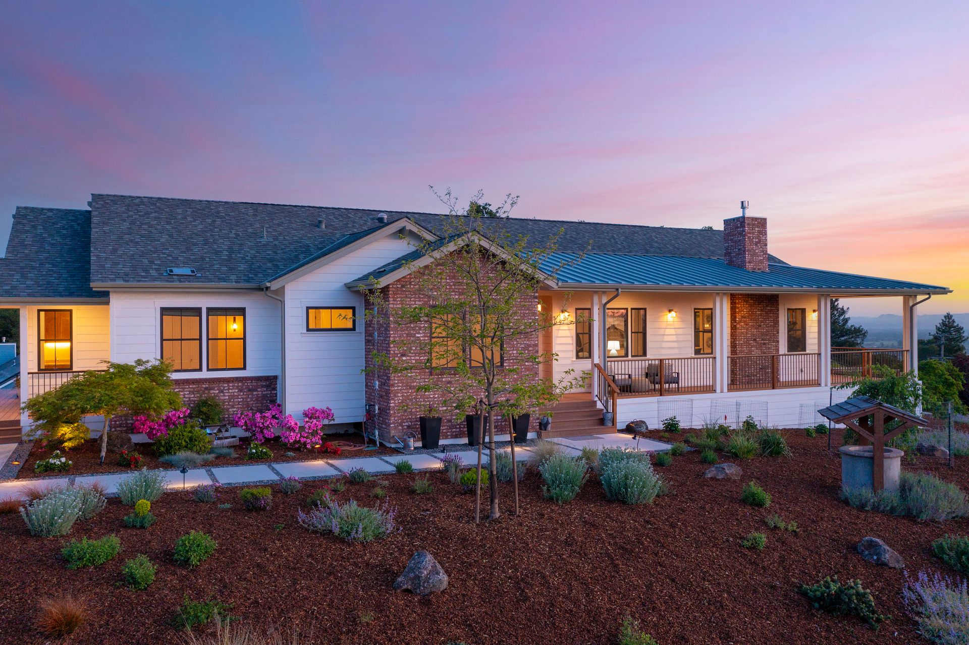 This highly desirable location in Wikiup offers sweeping city light views from this stunning single level home with 4 bedrooms and 2.5 baths on more than 1/2 acre. The exceptional designer appeal showcases solid cherry double entry doors. Extensive use of wide plank white oak flooring adds a touch of elegance and sophistication. An open concept floor plan with an abundance of natural light makes the home spacious and airy. The wrap around porch is accessible from the front entry to the great room providing a sunny spot to enjoy views from morning to evening. The great room is open to the gourmet kitchen and dining area with architecturally appealing coffered ceiling and a free standing fireplace with floor to ceiling solid walnut surround. The kitchen boasts a large island, high-end BlueStar appliances, and walk-in pantry. Additionally, there is a home office. The primary suite features wool carpet, coved ceiling, and direct access to the patio. There are 3 additional bedrooms. Great outdoor entertaining space includes Trex decking, a spacious patio, professionally landscaped grounds include many fruit trees and flowering foliage for a colorful garden. This recently built custom home is set in the heart of wine country with close proximity to wineries, shopping & fine dining.