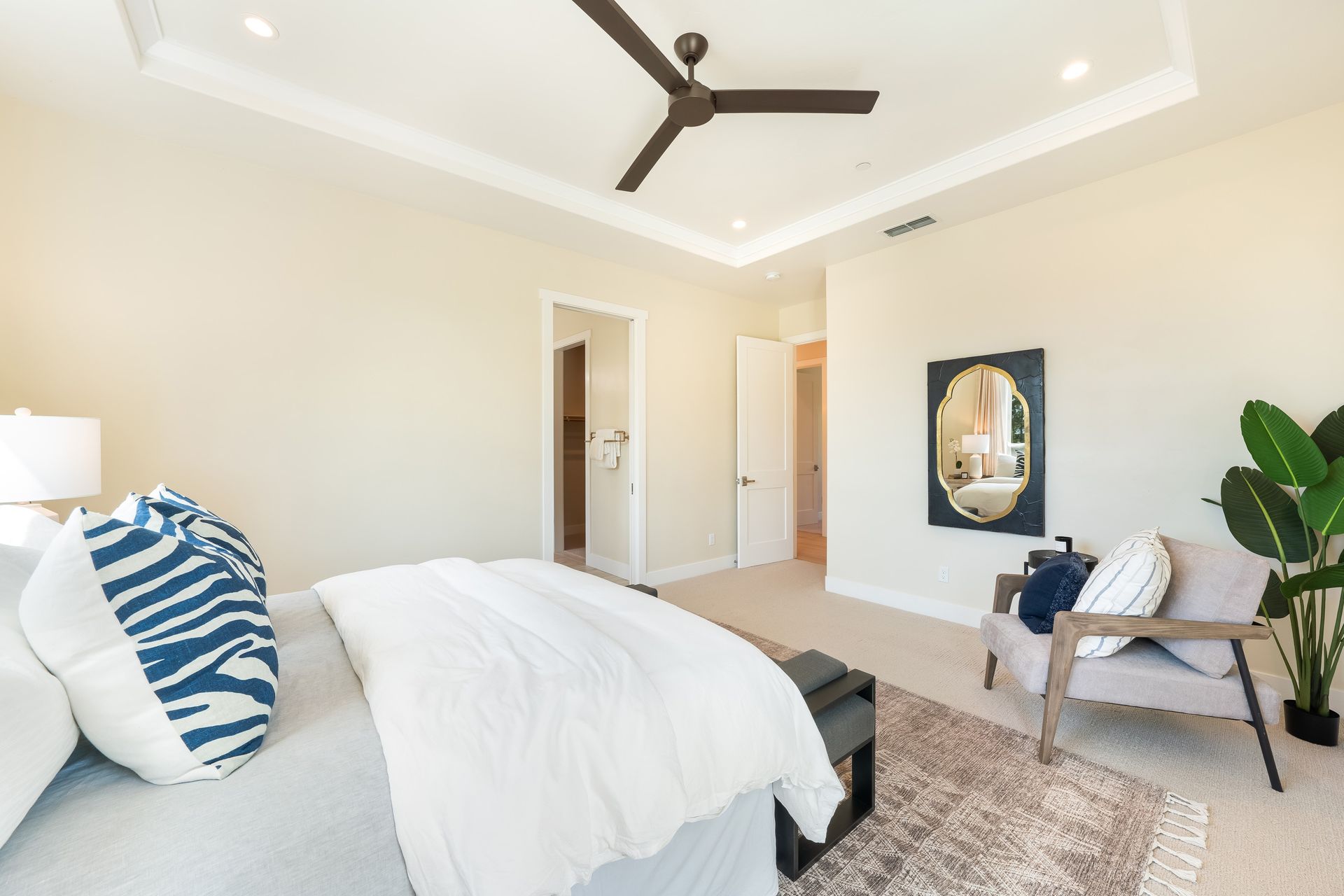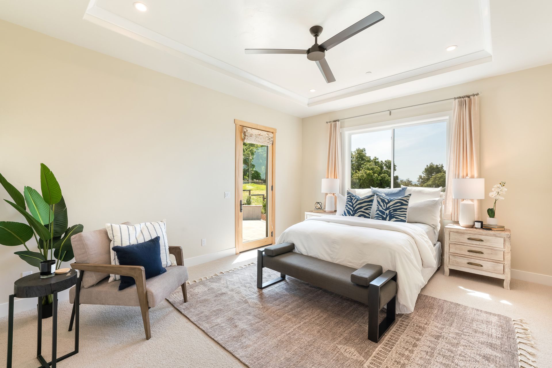 Primary bedroom features ceiling fan, wool carpet, and direct access to patio