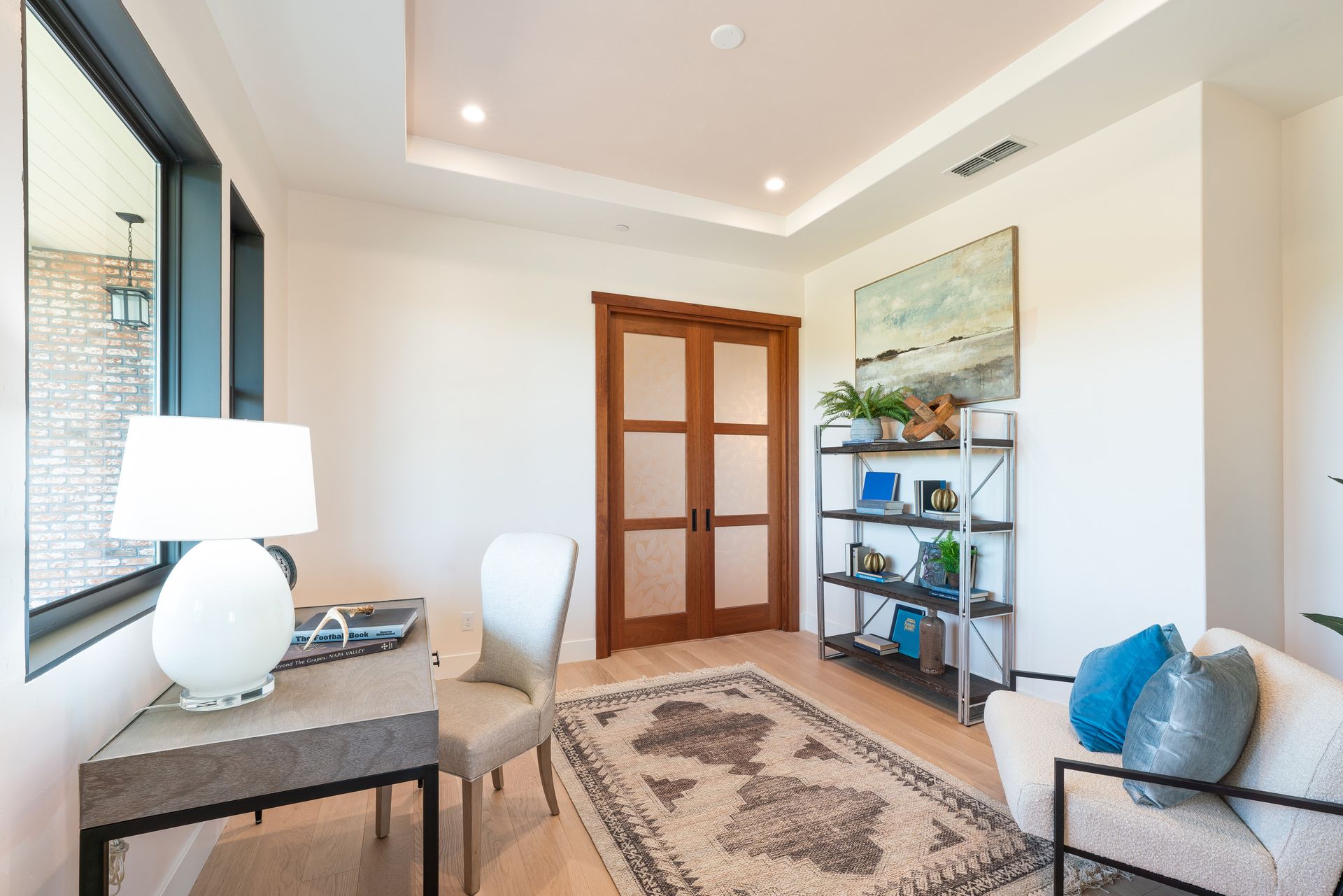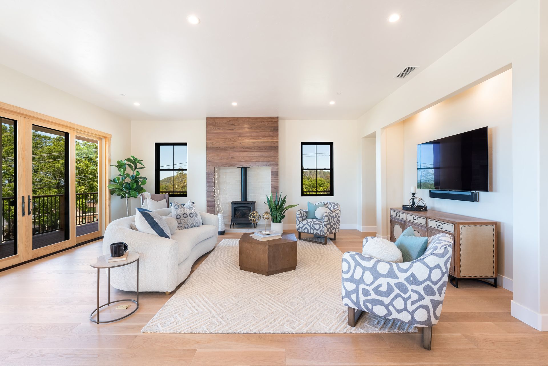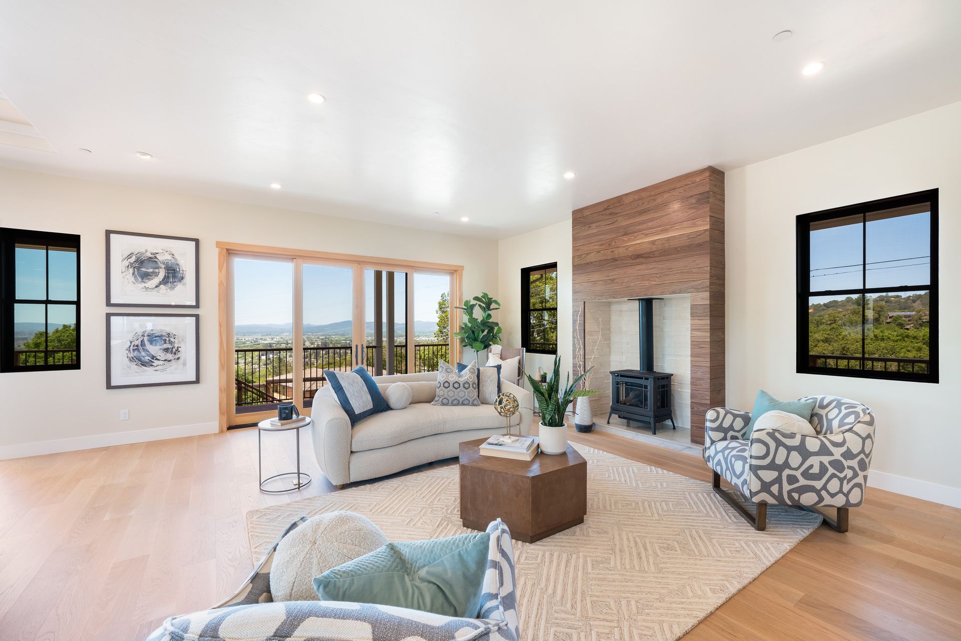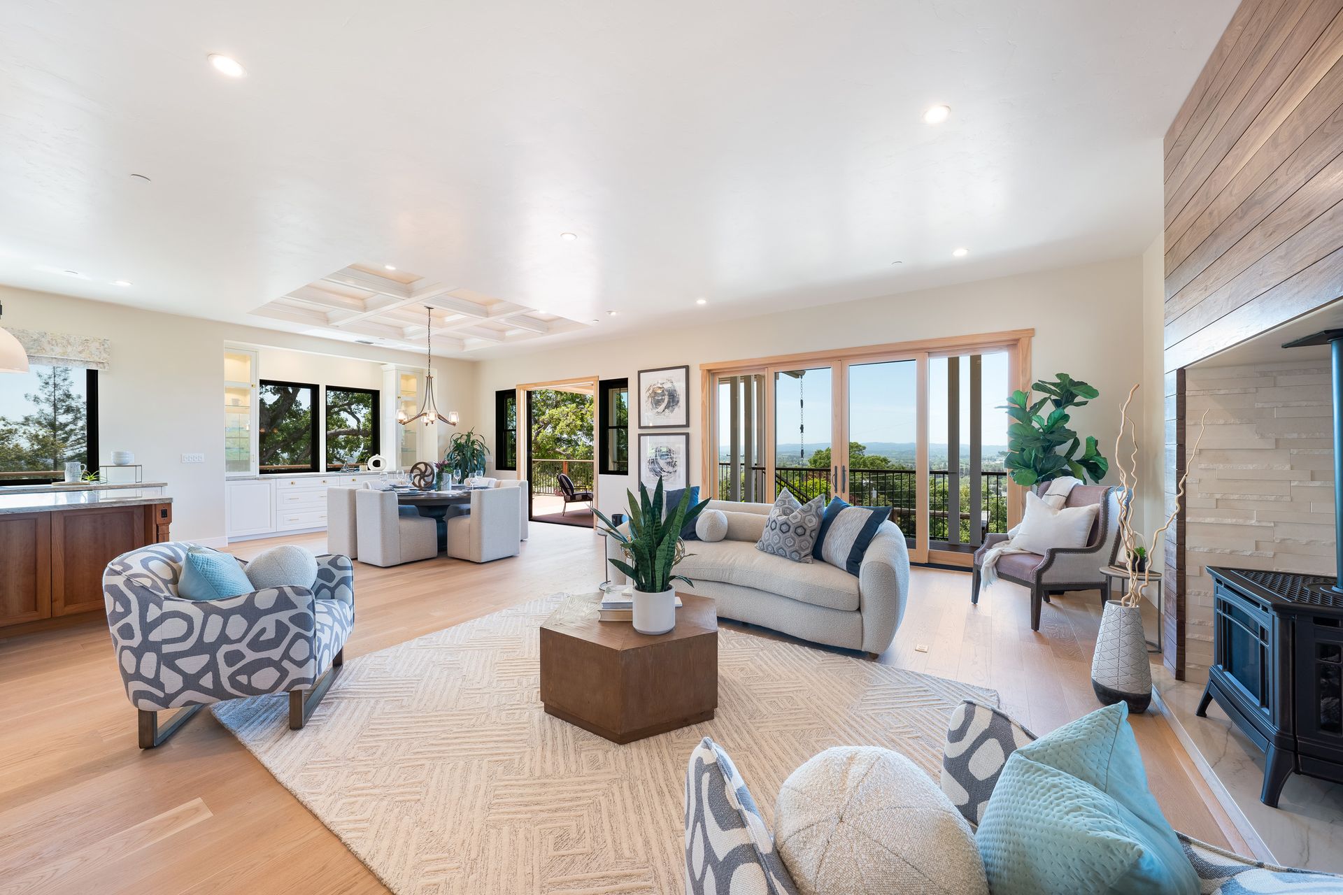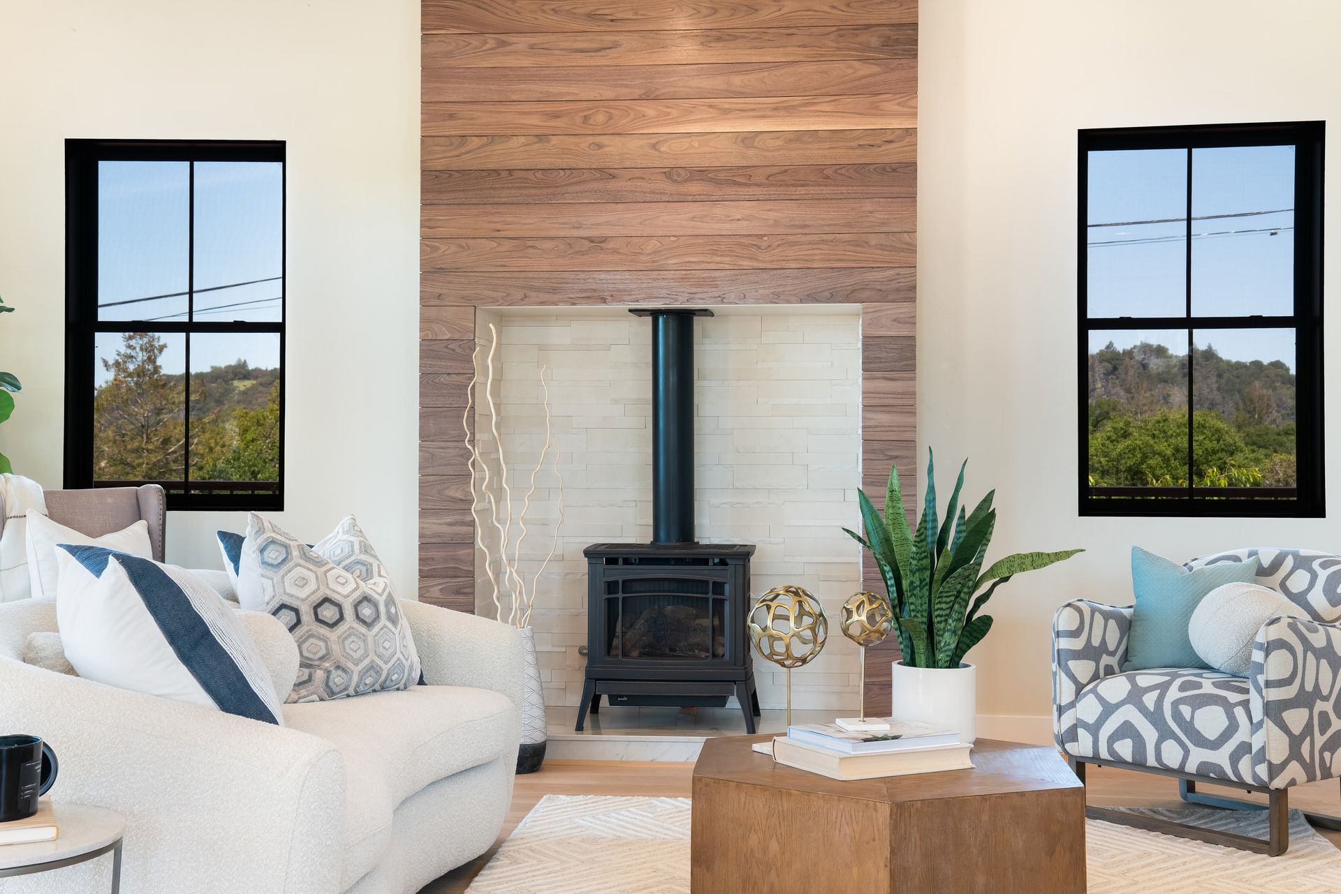 Great room living with a free standing fireplace and custom milled, nickel gap, floor to ceiling solid walnut fireplace surround, Marvin double French slider to the view deck