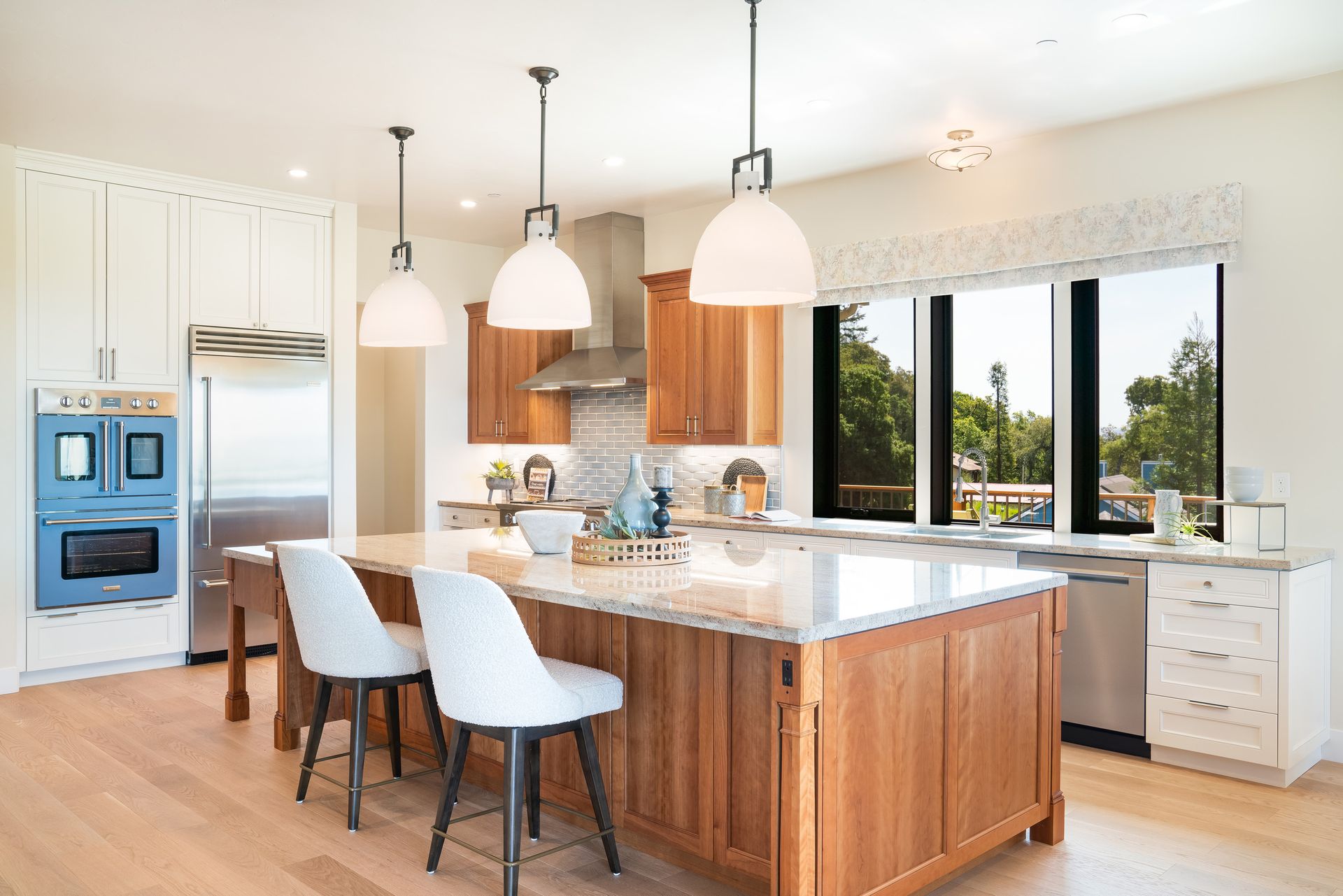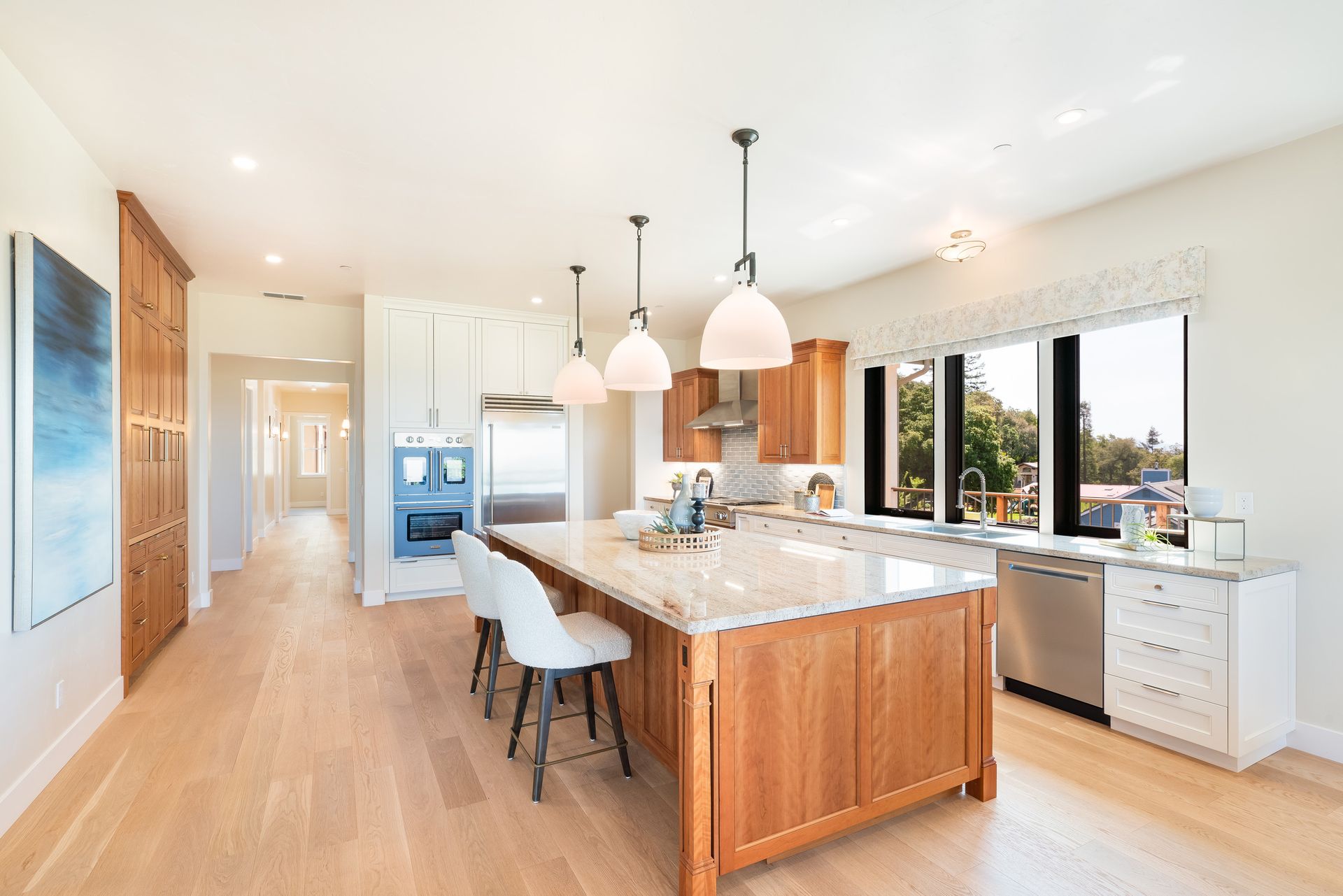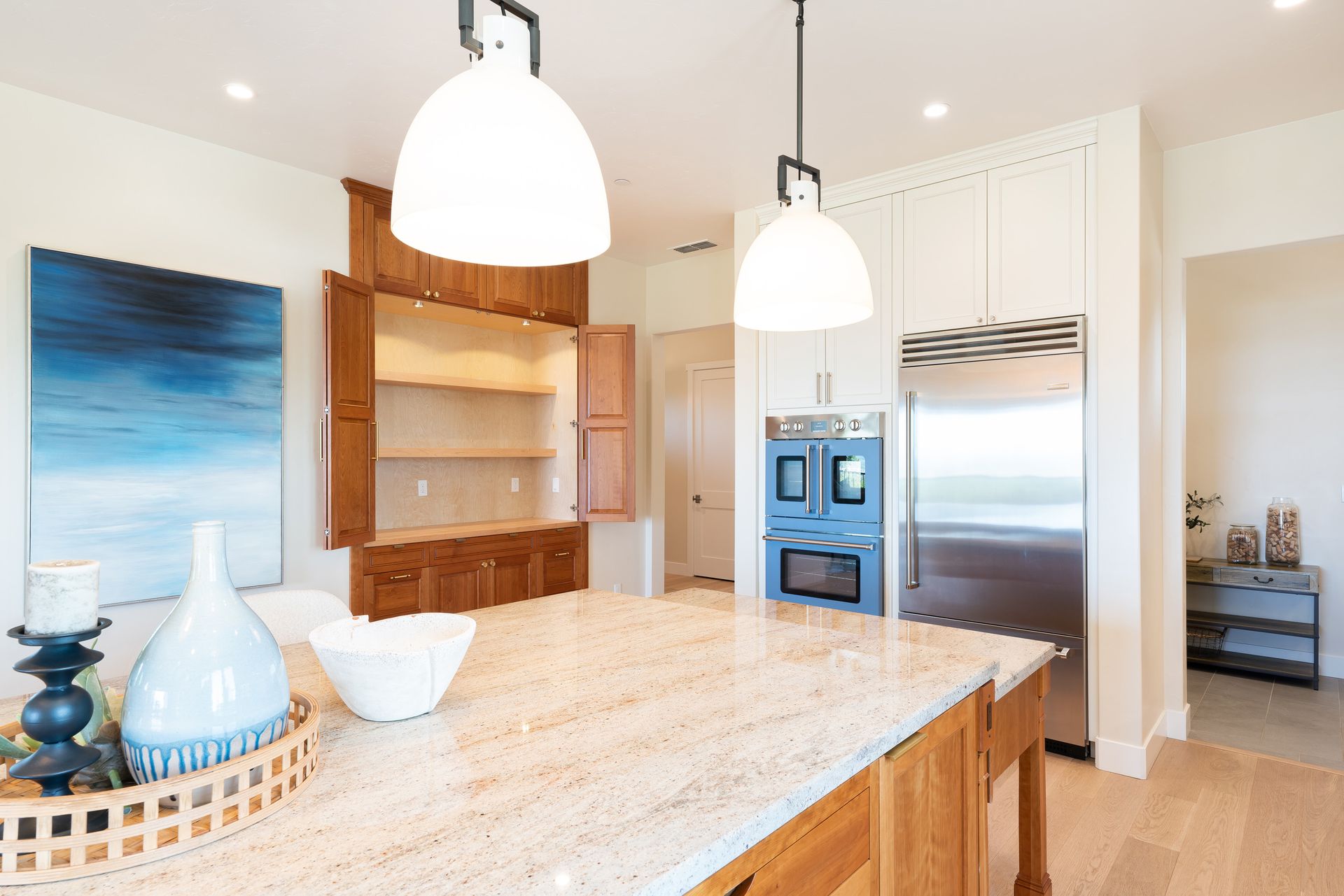 Kitchen boasts a large center island with granite counter, recessed lighting, BlueStar refrigerator/freezer, BlueStar 5 burner gas cooktop and double ovens, custom solid cherry cabinetry by Rhyn Design with built-in coffee bar/baking center, dishwasher, hood over range, soft close cabinets and drawers, walk-in pantry has porcelain tile floor, solar window shades are remote controlled