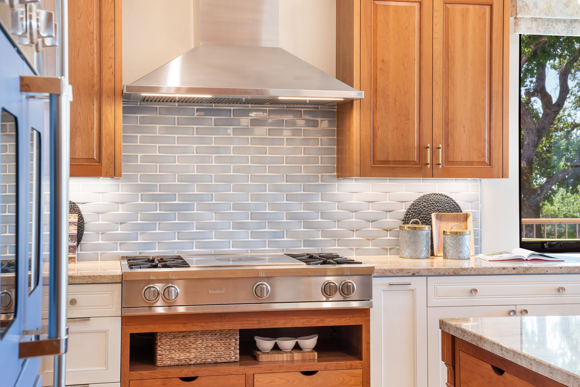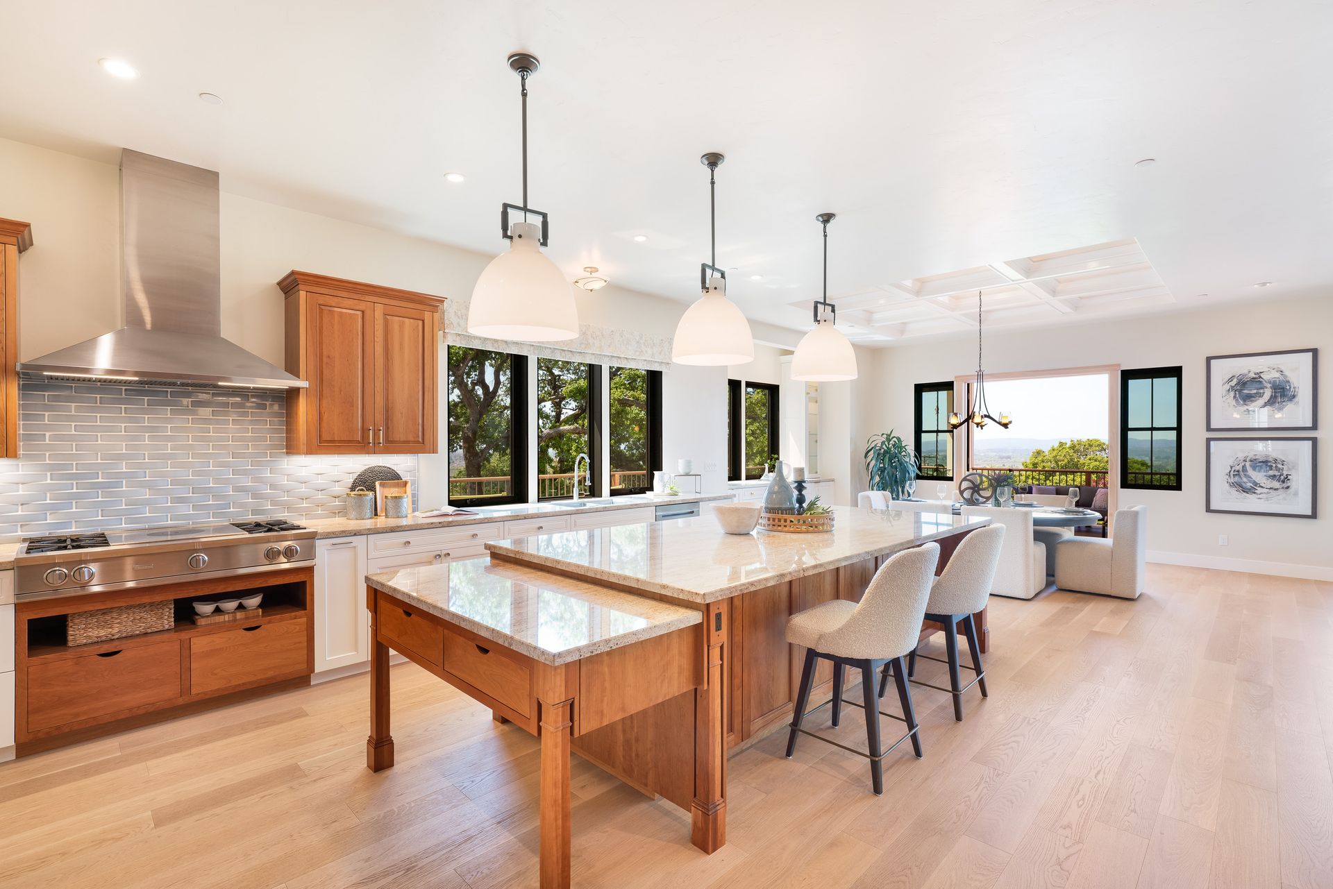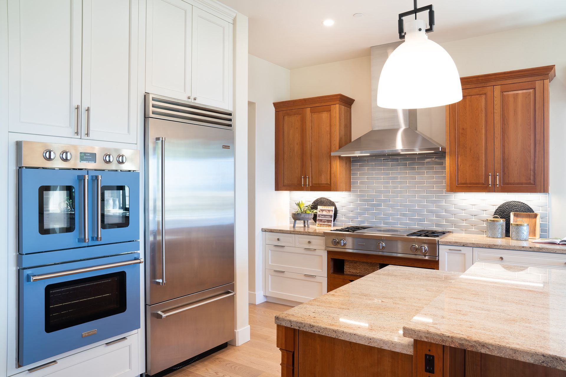 Kitchen boasts a large center island with granite counter, recessed lighting, BlueStar refrigerator/freezer, BlueStar 5 burner gas cooktop and double ovens, custom solid cherry cabinetry by Rhyn Design with built-in coffee bar/baking center, dishwasher, hood over range, soft close cabinets and drawers, walk-in pantry has porcelain tile floor, solar window shades are remote controlled