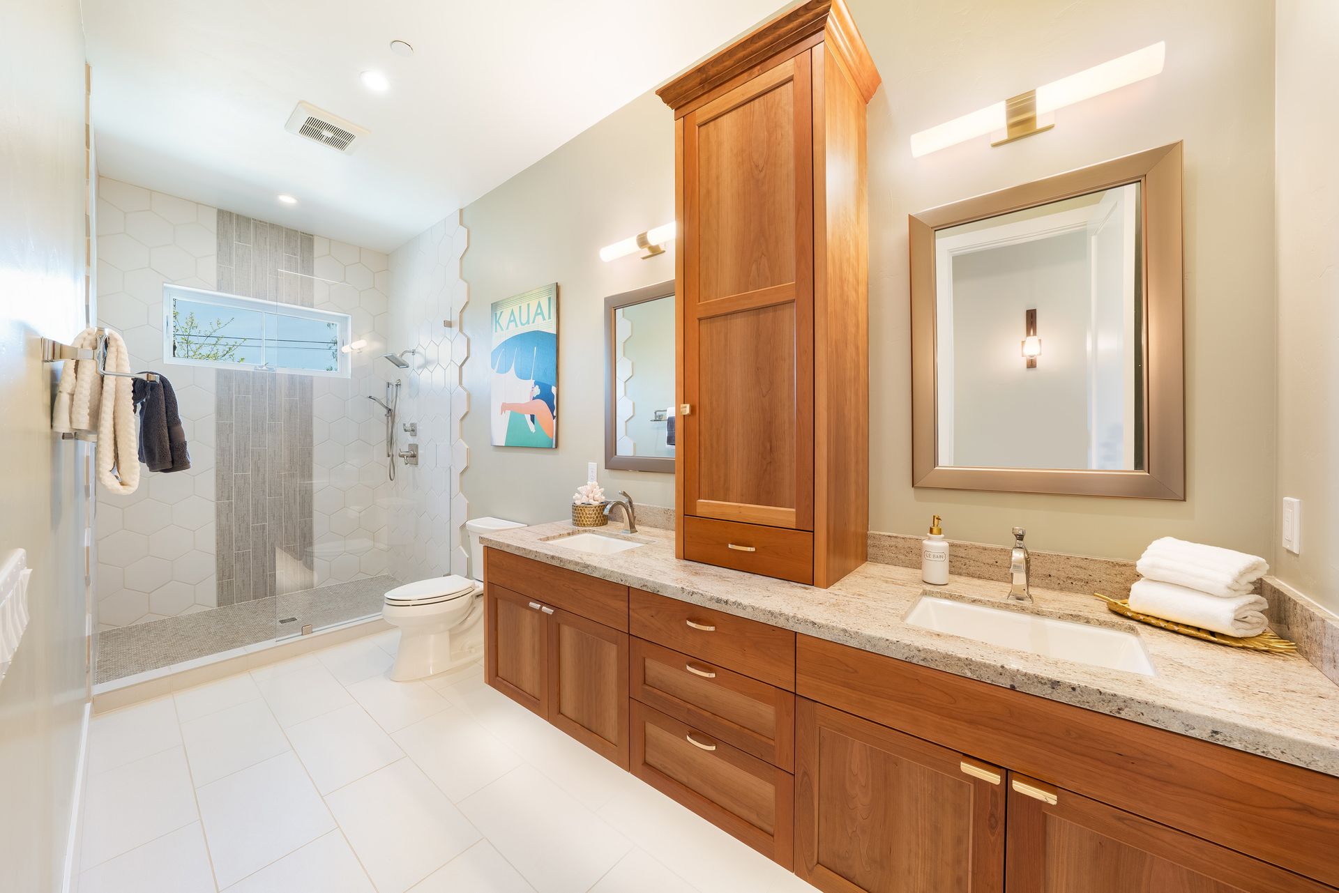 Primary bathroom with dual sinks, radiant heat in floor, shower stall with rain shower head and handheld wand, walk-in closet with organizers