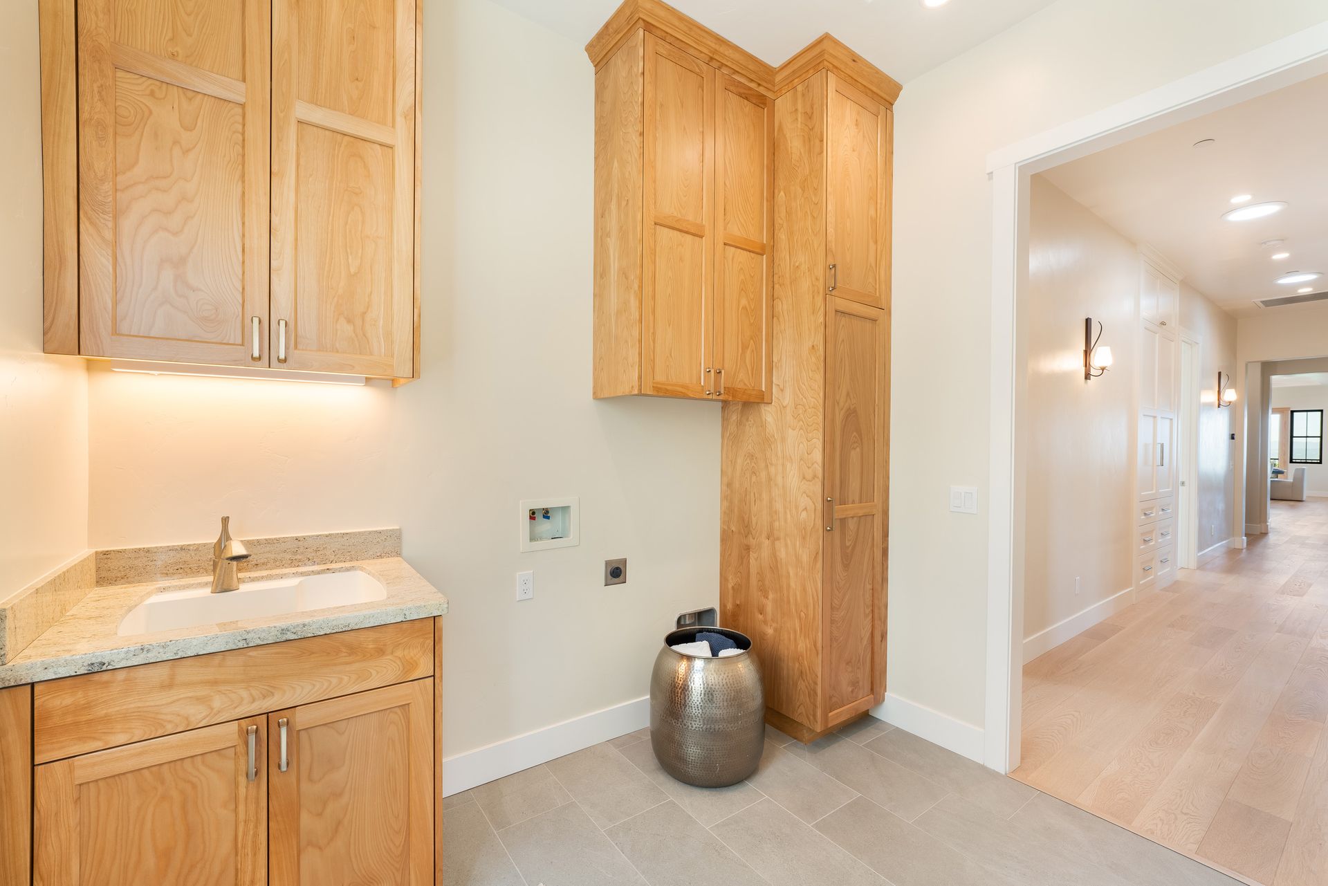 Laundry/mud room with basin, porcelain tile floor and abundant storage cabinets