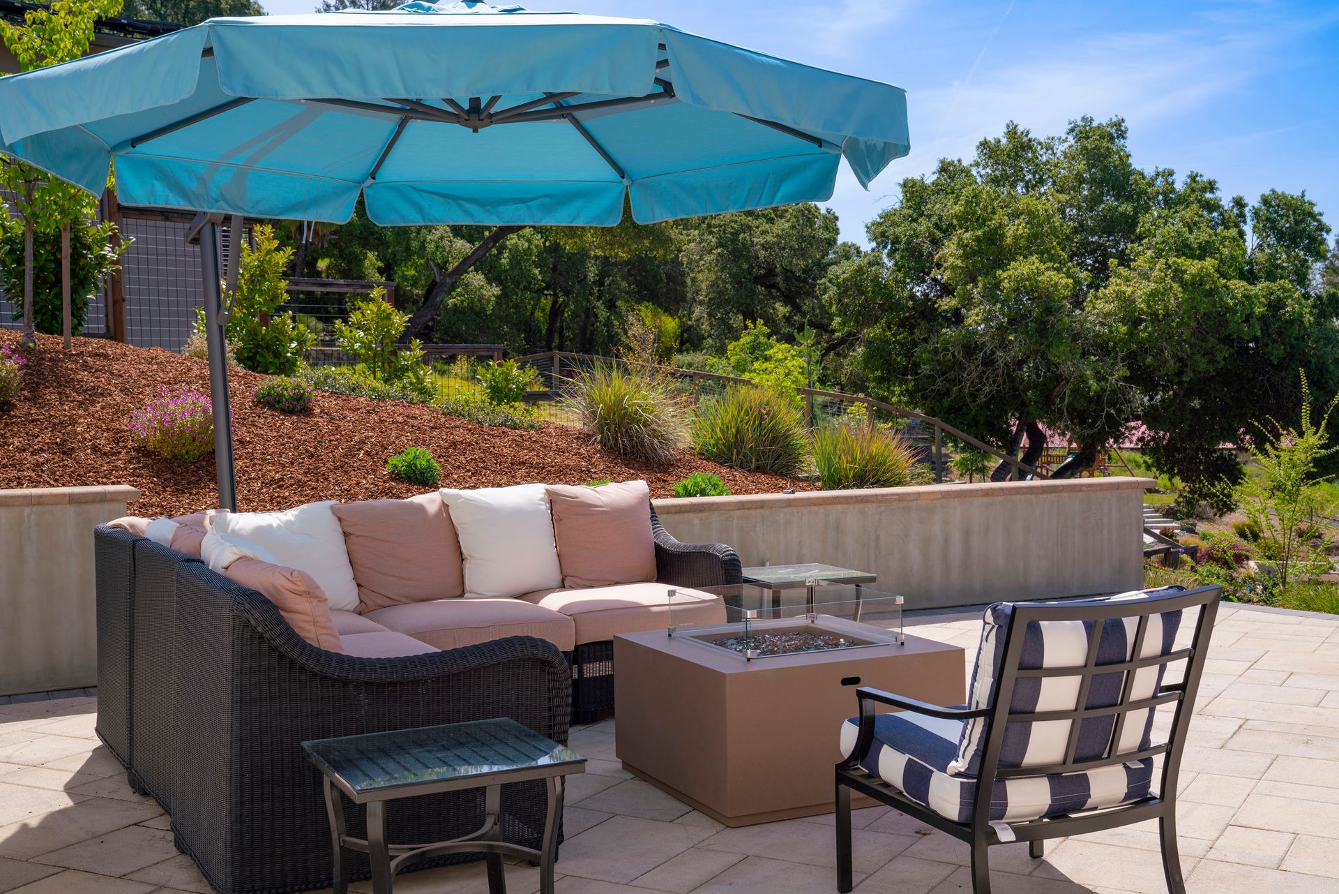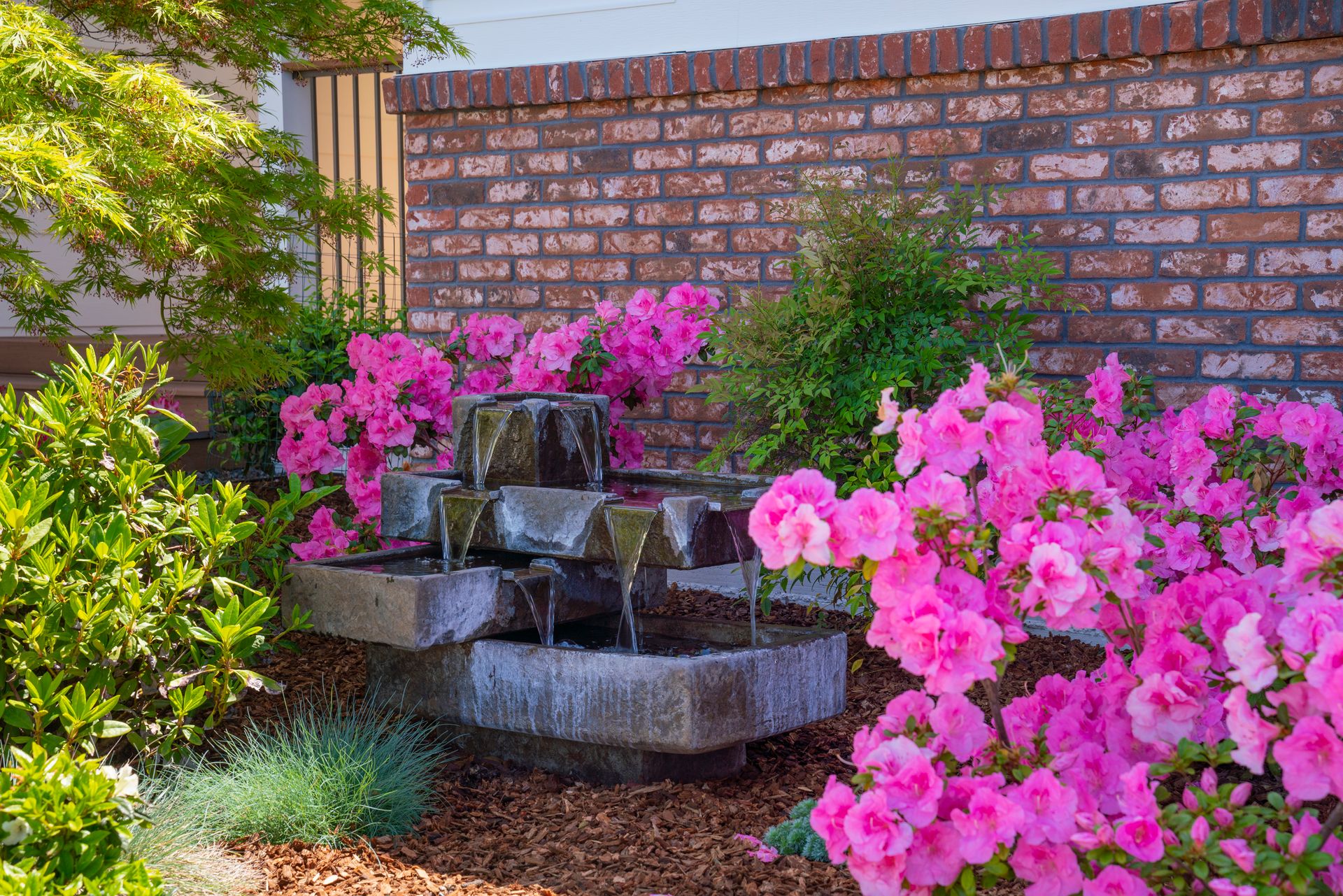 The patio is bordered by lush landscaping, maple trees, azaleas, hydrangeas, rhododendrons,