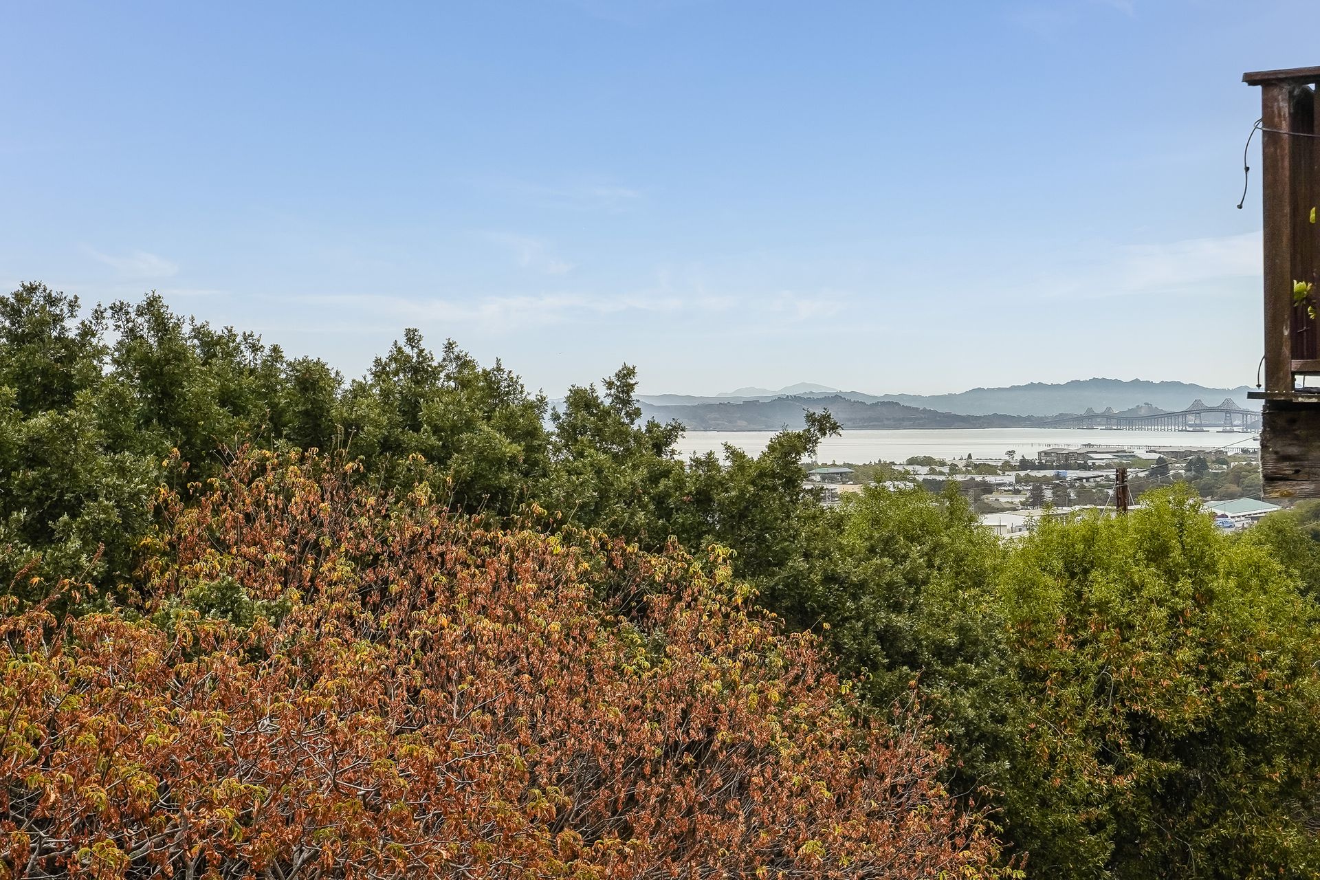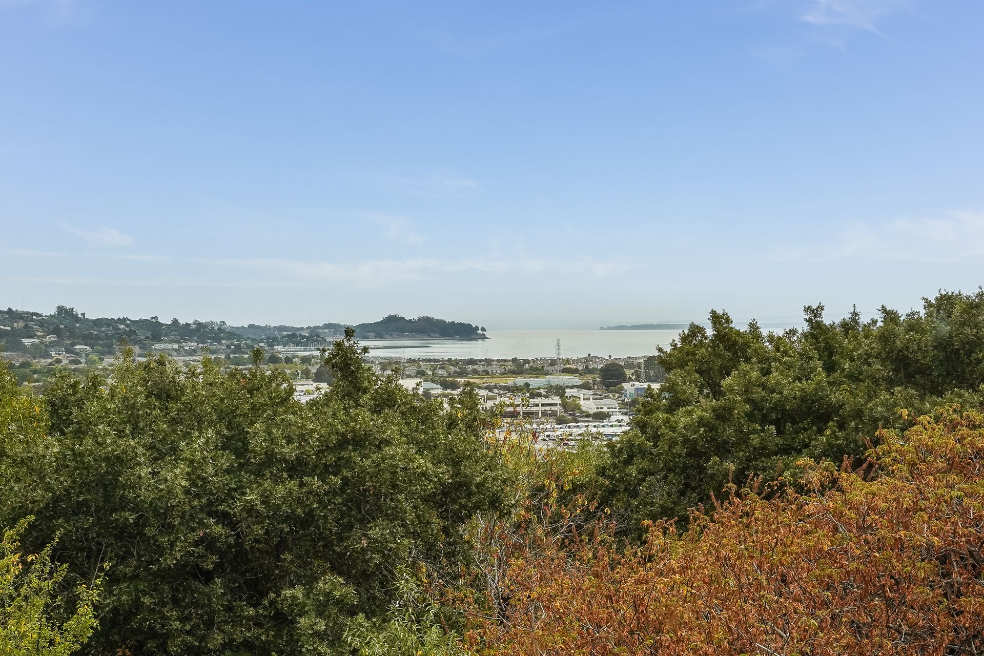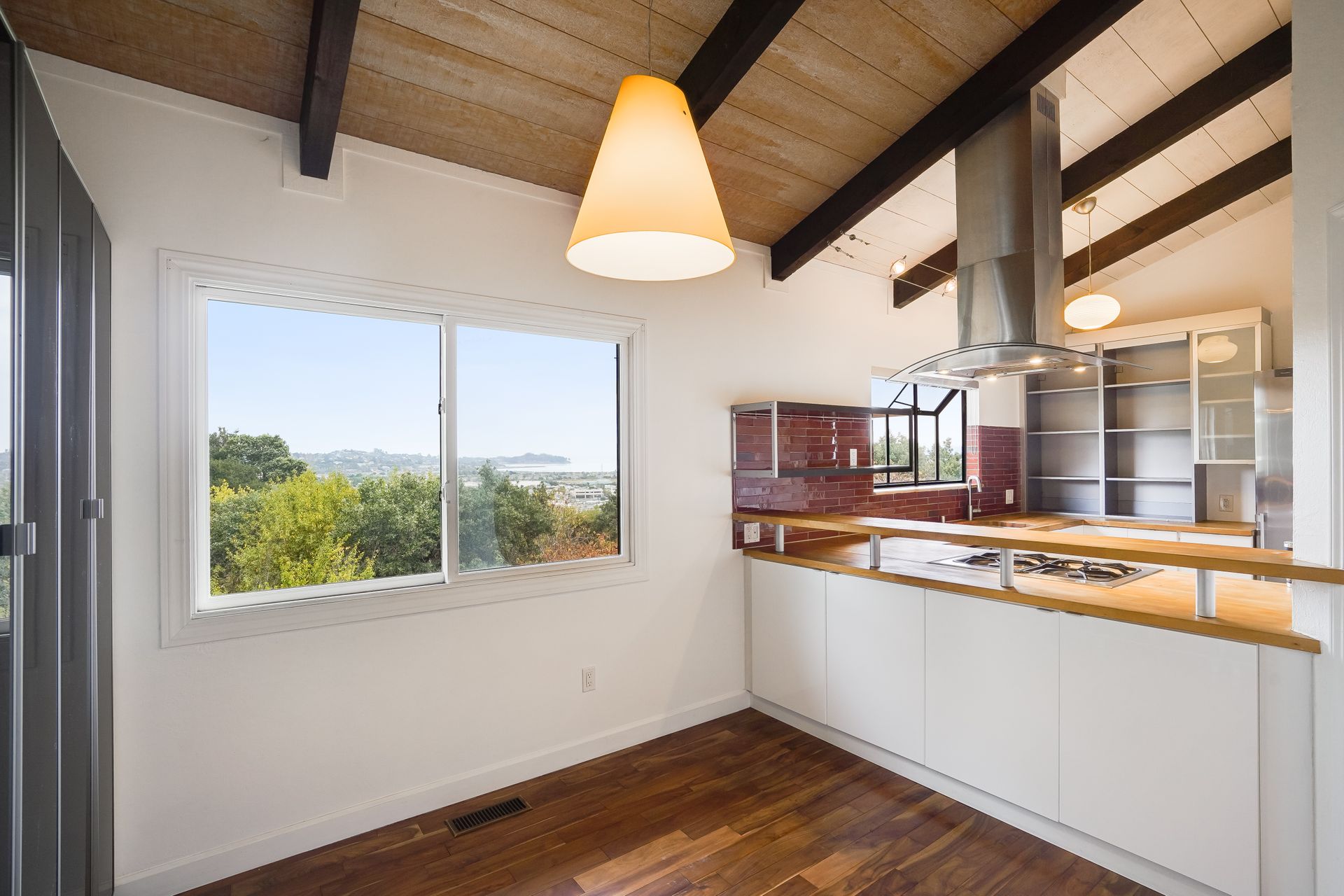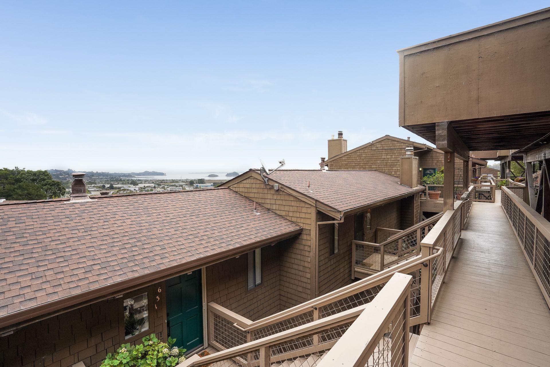 This mid-century contemporary, turn-key ready, two bedroom, one and one-half bath condo boasts privacy with a spectacular view of the San Pablo Bay! The vaulted open beam ceilings lends to the airy appeal with butcher block kitchen counters, a garden window and range hood open to the dining area providing ample space to enjoy with cabinets galore. Walnut wood floors flow into the living room area complimented by a brick fireplace and sliding doors to the deck with city bay views. The spacious bedrooms are downstairs with a full bath and a laundry closet. This is all conveniently located near Larkspur Ferry Terminal, the 101 and the surrounding Bay area.