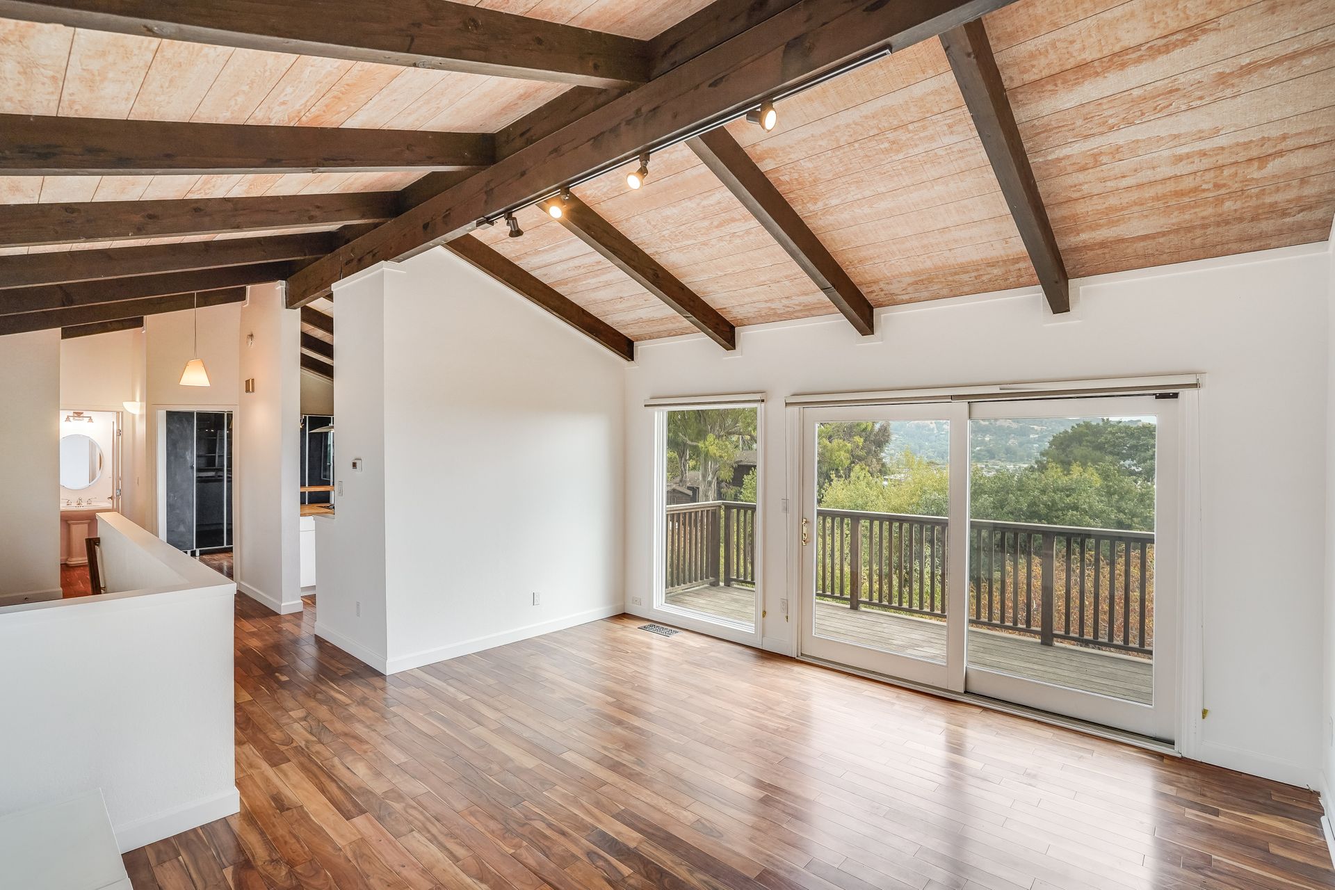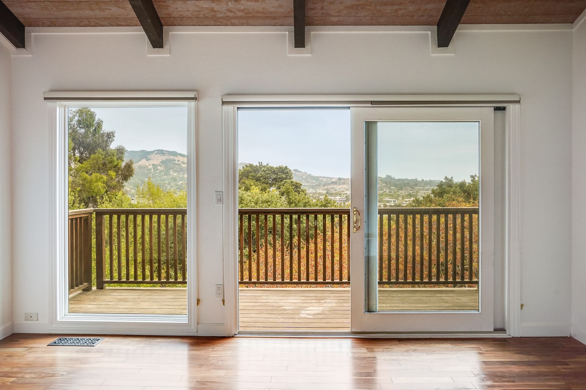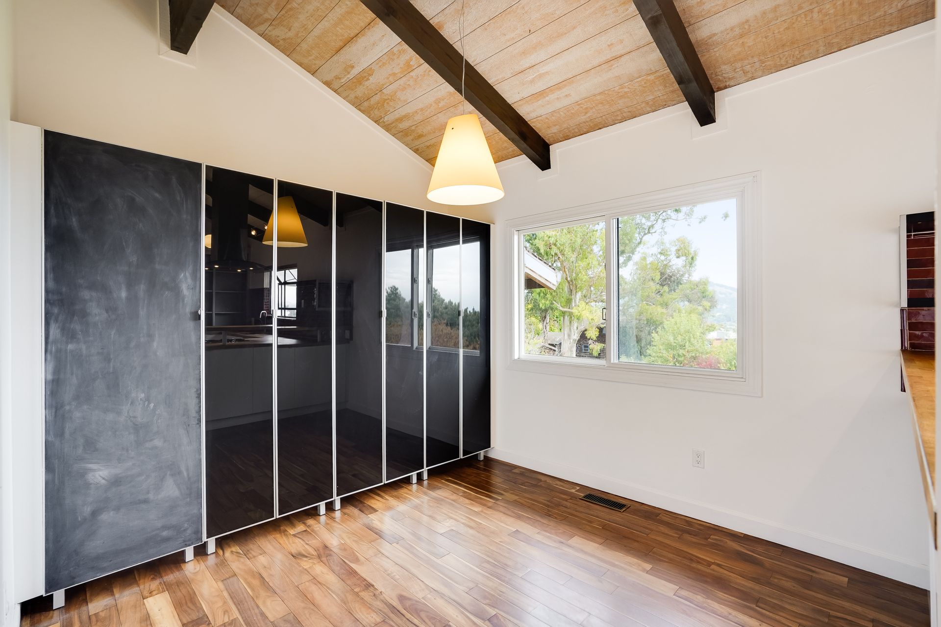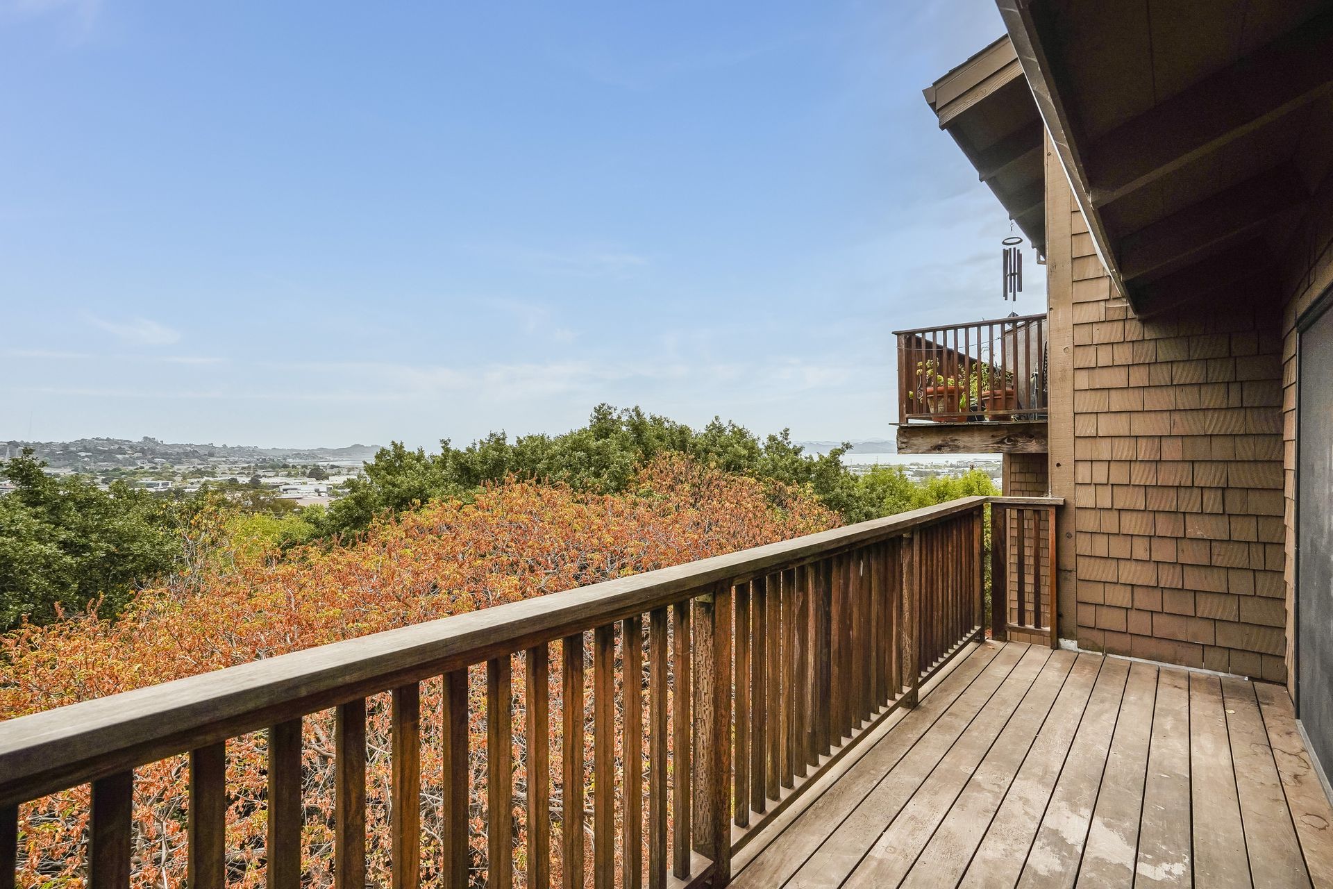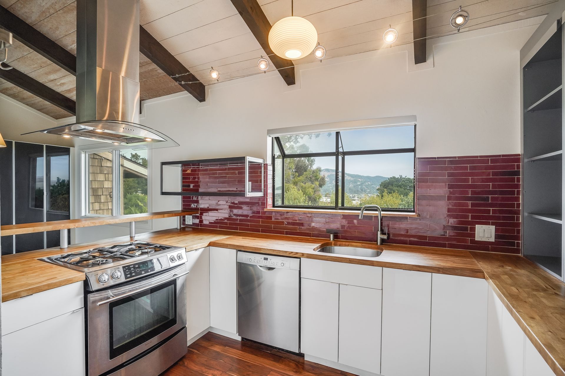 This mid-century contemporary, turn-key ready, two bedroom, one and one-half bath condo boasts privacy with a spectacular view of the San Pablo Bay! The vaulted open beam ceilings lends to the airy appeal with butcher block kitchen counters, a garden window and range hood open to the dining area providing ample space to enjoy with cabinets galore. Walnut wood floors flow into the living room area complimented by a brick fireplace and sliding doors to the deck with city bay views. The spacious bedrooms are downstairs with a full bath and a laundry closet. This is all conveniently located near Larkspur Ferry Terminal, the 101 and the surrounding Bay area.