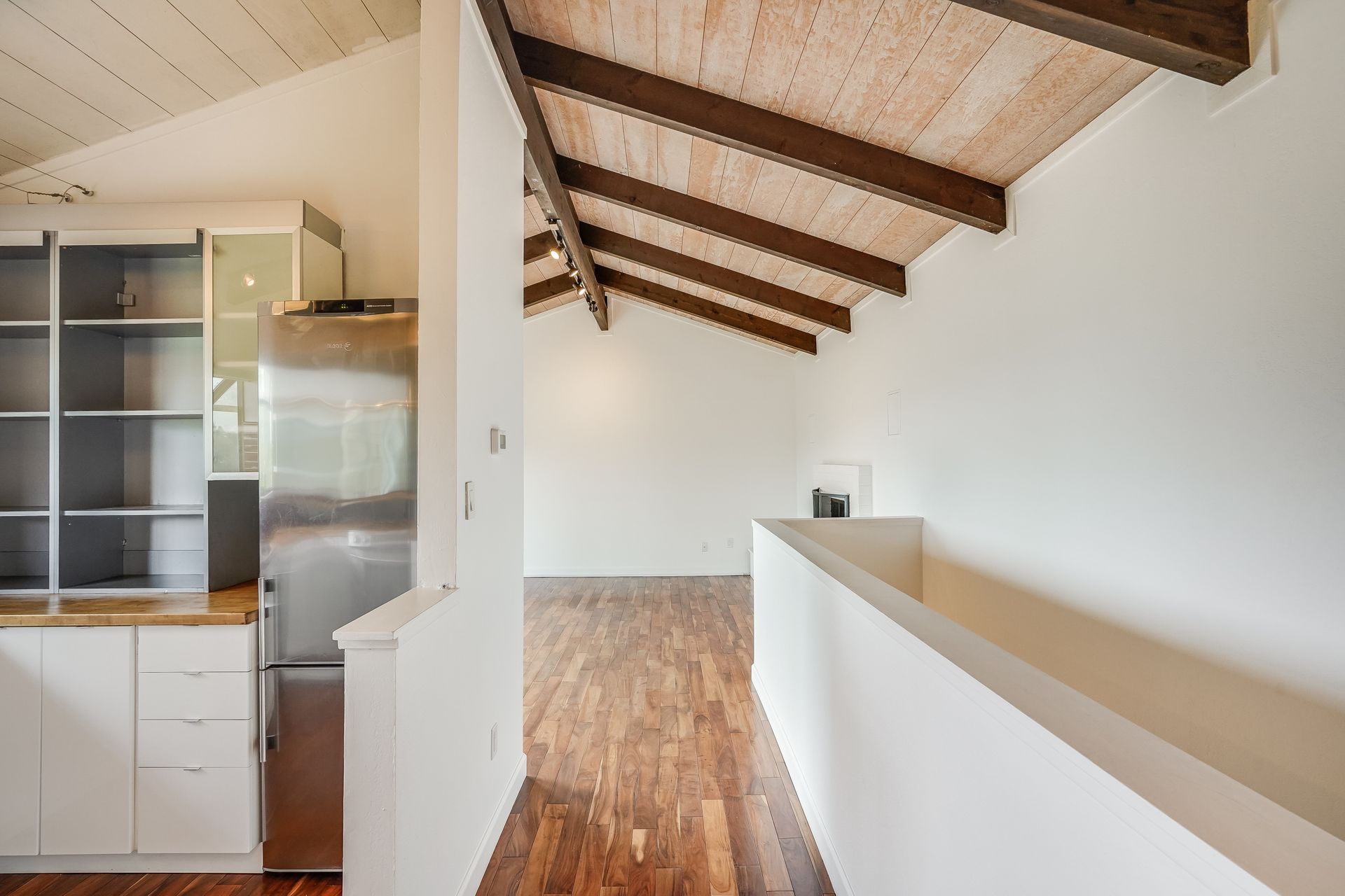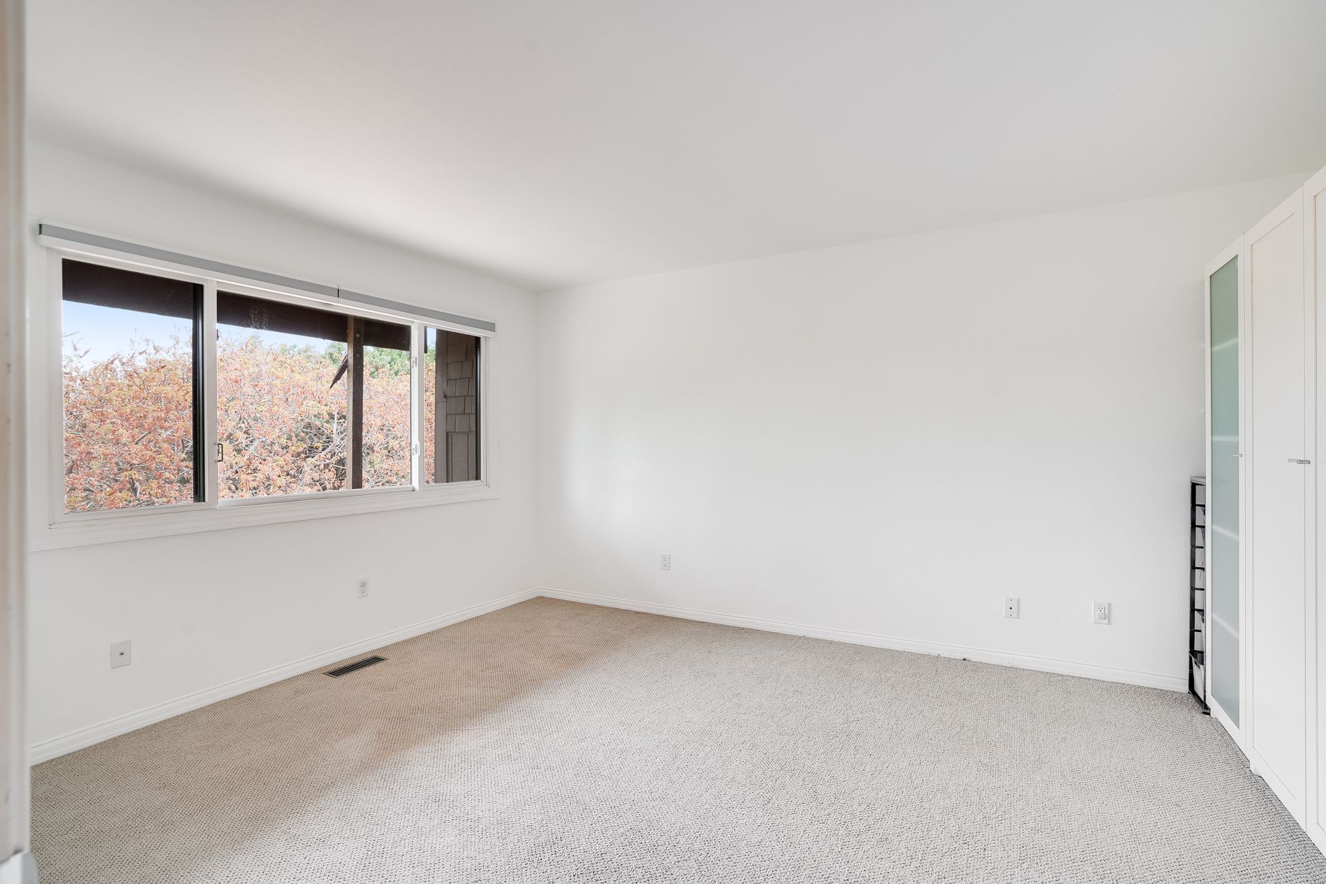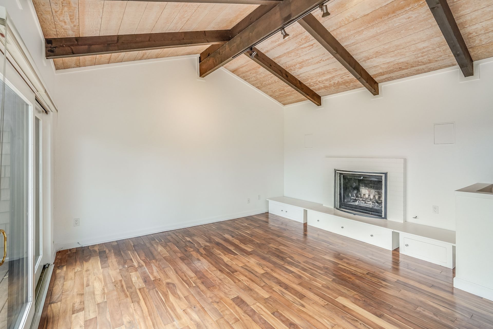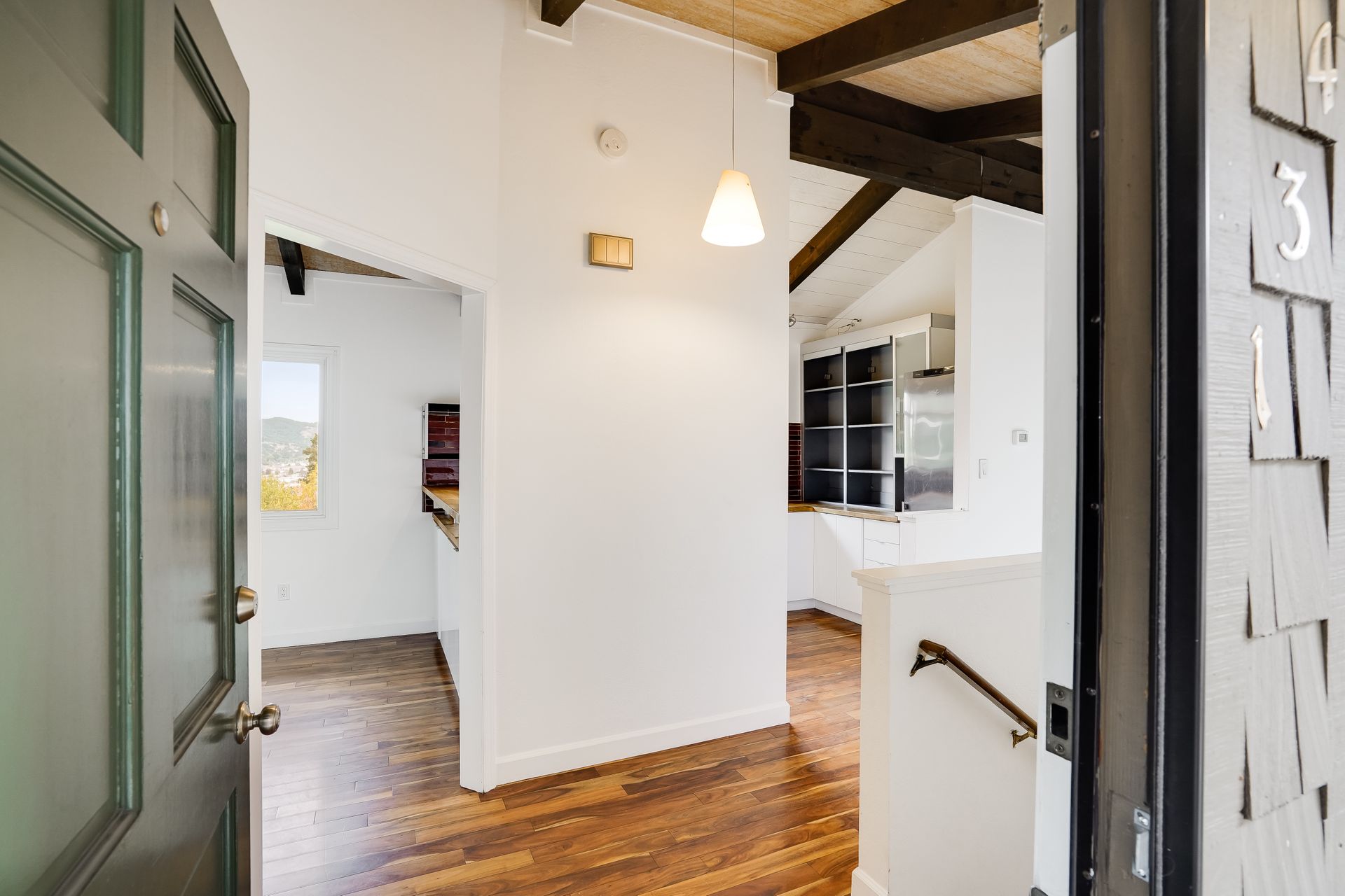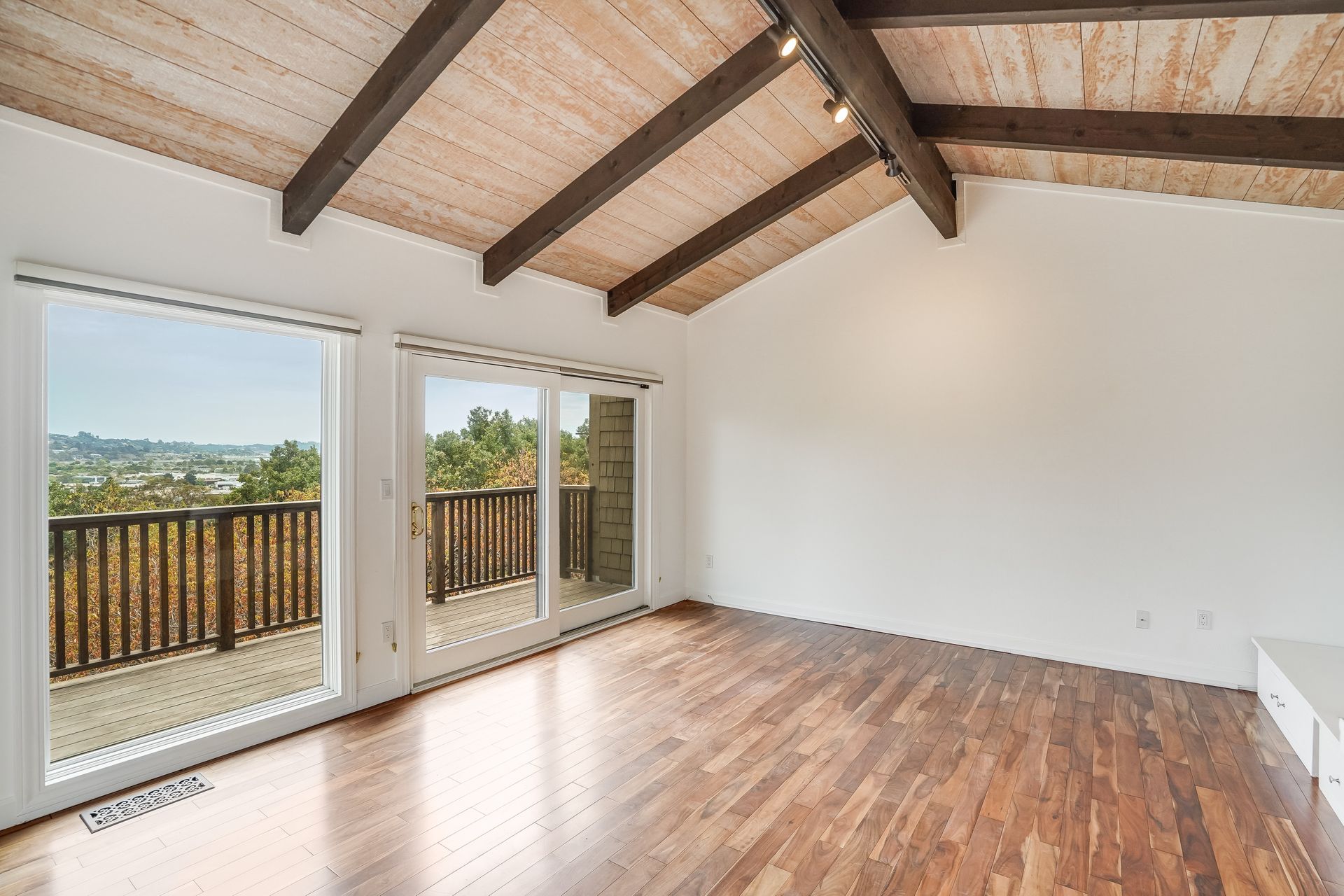 This mid-century contemporary, turn-key ready, two bedroom, one and one-half bath condo boasts privacy with a spectacular view of the San Pablo Bay! The vaulted open beam ceilings lends to the airy appeal with butcher block kitchen counters, a garden window and range hood open to the dining area providing ample space to enjoy with cabinets galore. Walnut wood floors flow into the living room area complimented by a brick fireplace and sliding doors to the deck with city bay views. The spacious bedrooms are downstairs with a full bath and a laundry closet. This is all conveniently located near Larkspur Ferry Terminal, the 101 and the surrounding Bay area.
