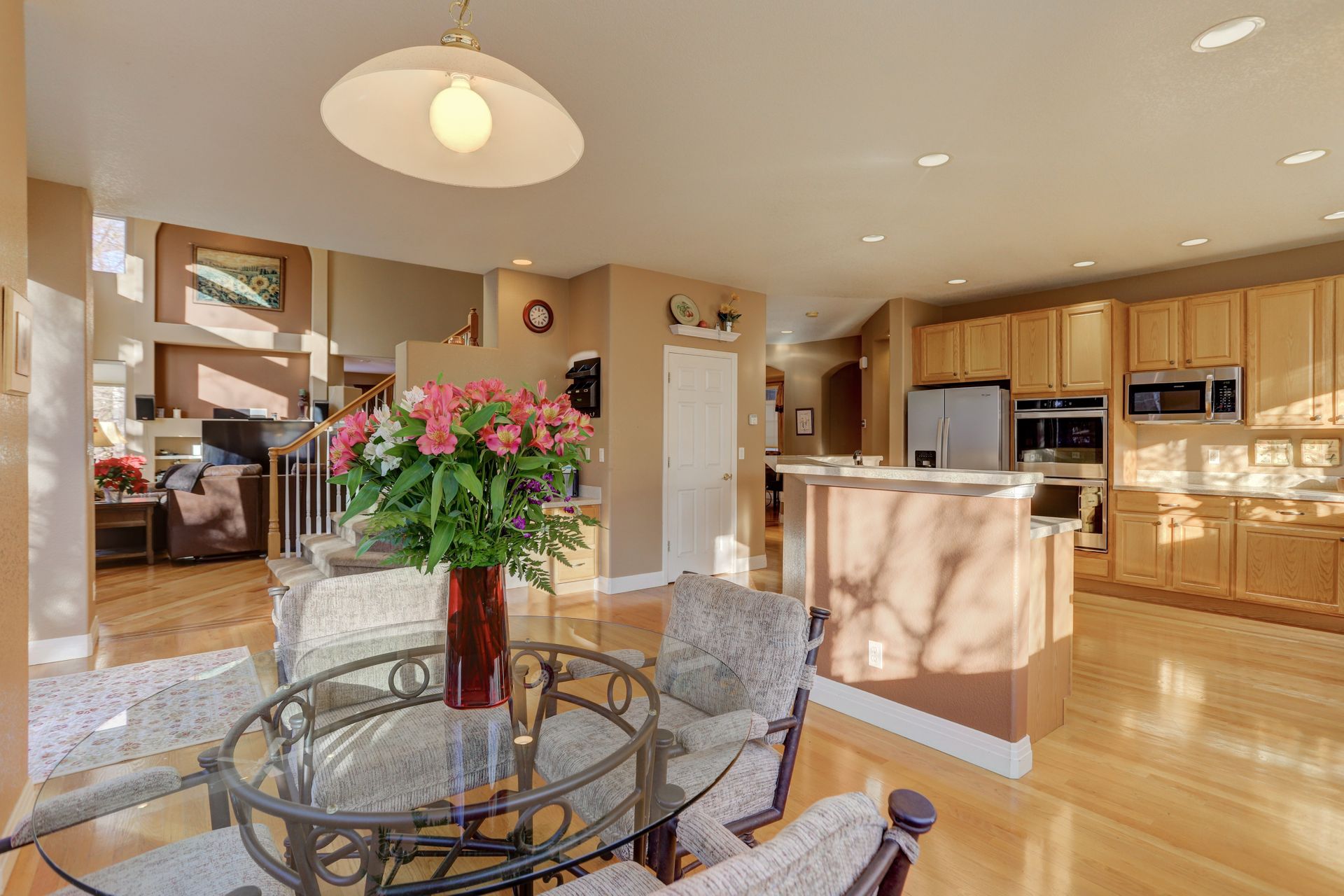 This wonderful home has a great floor plan with soaring 20-foot ceilings and a wall of windows. There is three-sided gas fireplace as well as extensive hardwood floors throughout the main level. The kitchen hosts newer stainless steel appliances, lots of counter space, a kitchen nook, a breakfast bar, a work desk and a pantry. Enjoy the main floor office with glass French doors. A one-half bath and large laundry room with a utility sink complete the main level. Upstairs, the large master suite features vaulted ceilings, hardwood floors, a five-piece bath with a big walk-in closet. Upstairs you'll also find a large loft overlooking the living room, two spacious secondary bedrooms and two additional baths. The backyard is complete with mature landscaping, lots of trees and a large patio. The huge 1893 square foot basement adds endless possibilities for future expansion. This wonderful home is situated on a quiet street, in a great community with a nice pool and clubhouse.