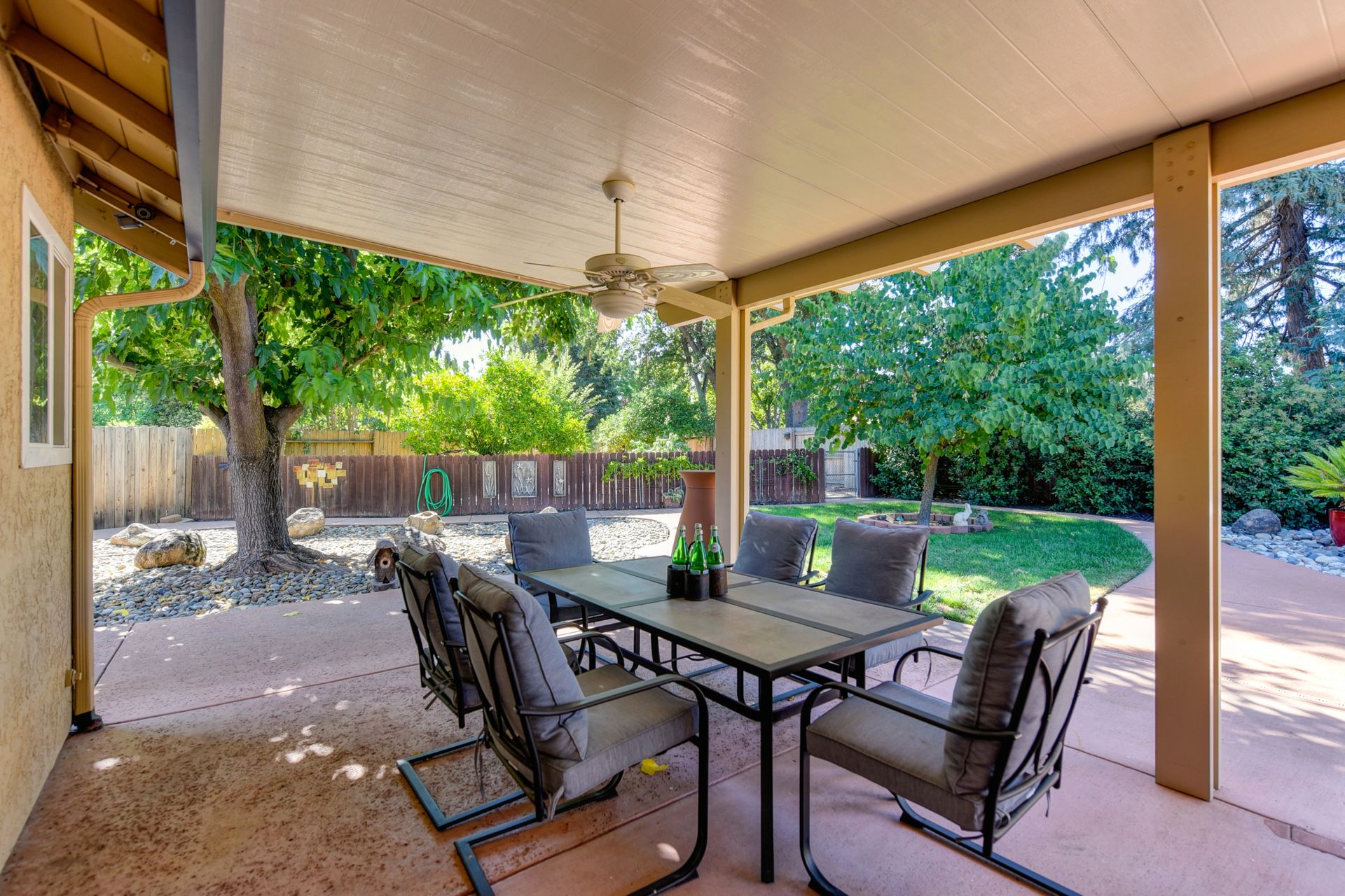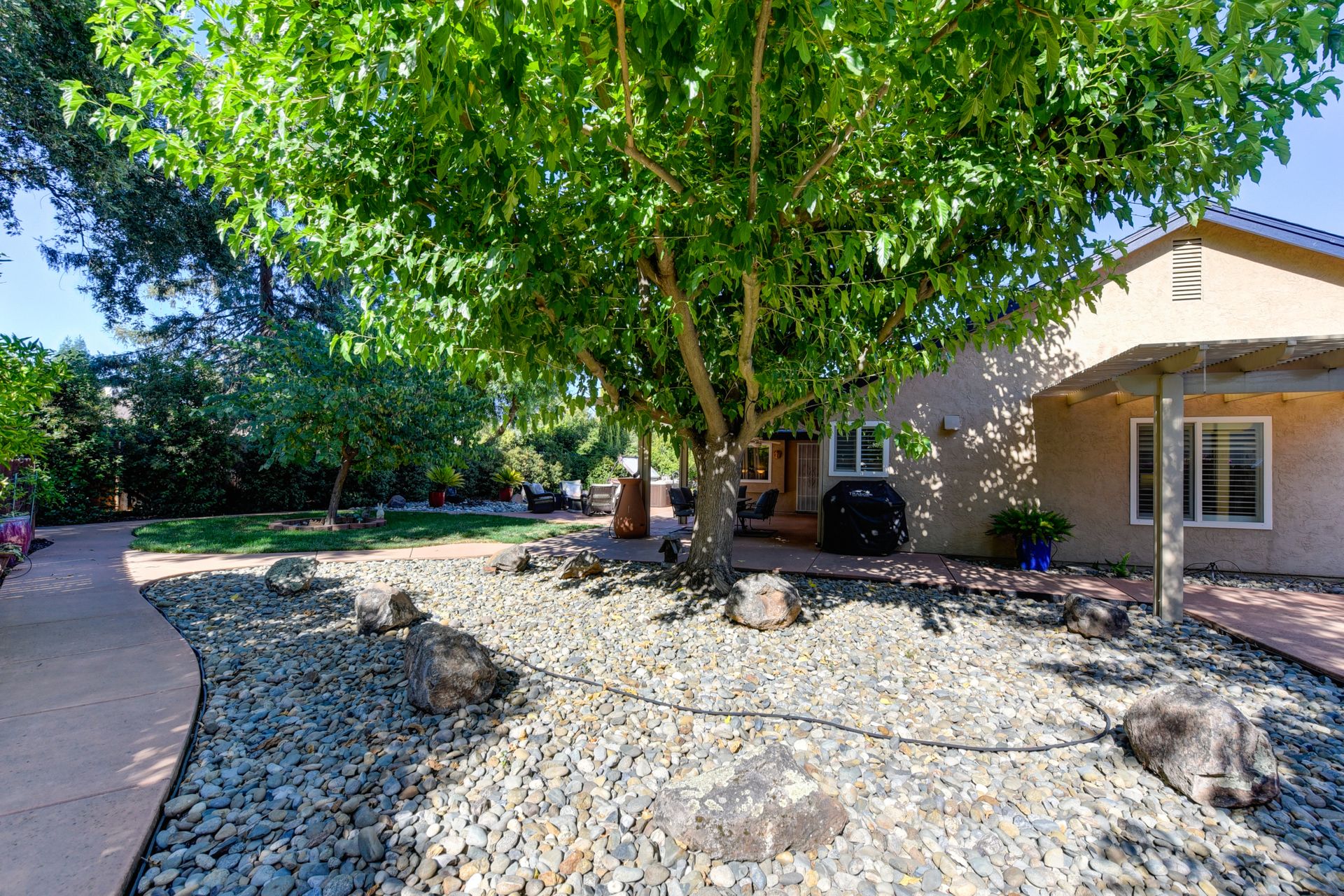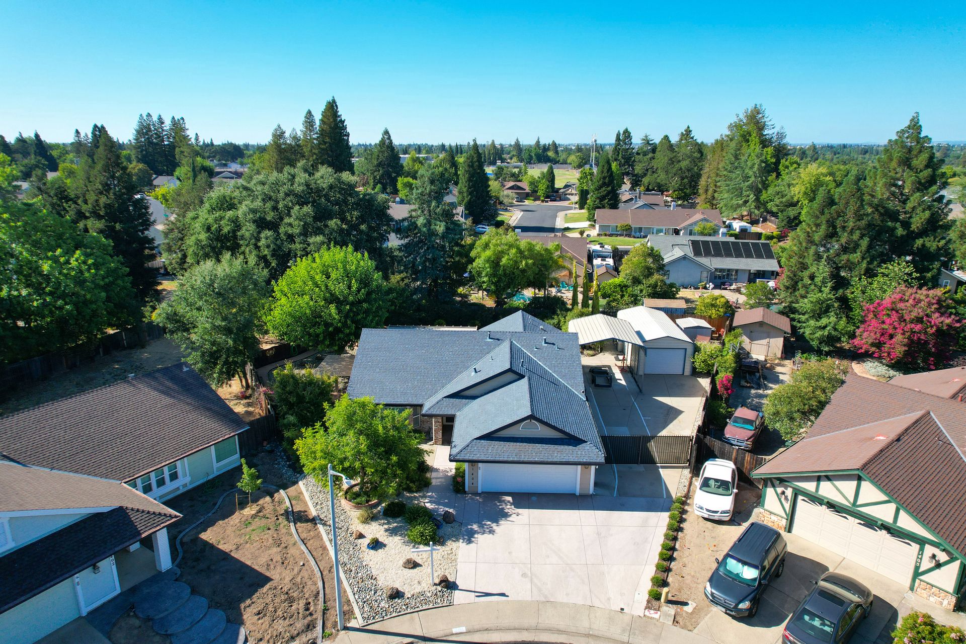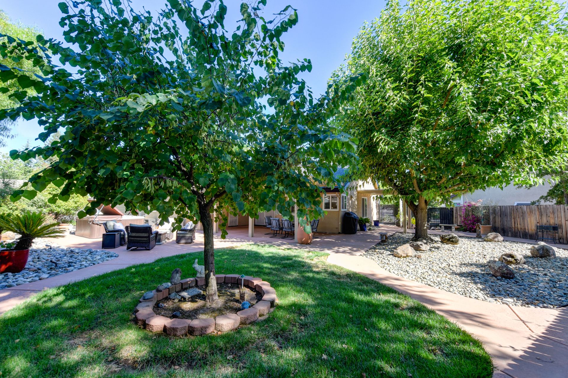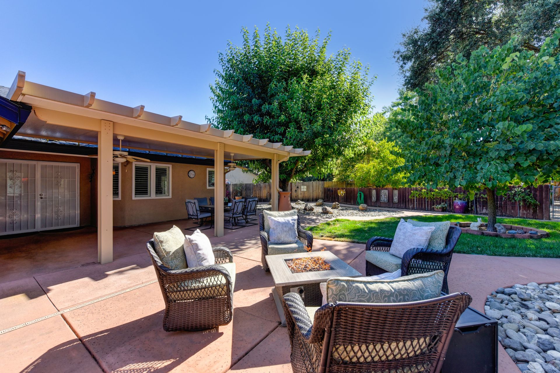 A HOME THAT CHECKS ALL THE BOXES! Cul-de-sac location, single story, fabulously designed great room floor plan that offers many accessible features, multiple security doors to enjoy the evening & morning breezes, amazing wrap around yard, 300 sq ft patio with ceiling fans, mini orchard, patio, spa and water fall features. 14X30 insulated garage/workshop with power and lighting, 13-foot RV parking cover with 30-amp electrical outlet, 9X9 vented storage with windows, 3X6 metal tool shed and a 2 car garage with insulated doors, built in storage & epoxy flooring. The owners labor of love and careful attention to detail, outshines the competition! The home and lot were remodeled and improved at just about every square inch, including windows. This home definitely has a WOW factor the instant you enter the home! The enhanced great room floor plan, has open flowing space, amazing filtered light through plantation shutters, architectural features and a kitchen to do amazing cooking & entertaining. The formal dining area has built-ins and lighted cabinetry and the kitchen has custom cabinetry, updated appliances, multiple counters and dinning options, that flow to the rear patios and yard. A custom bar/wine storage cabinet is located in the hallway, which could be used for many things- you choose!. Gorgeous custom bathrooms enhance the space and make this home easy to love!