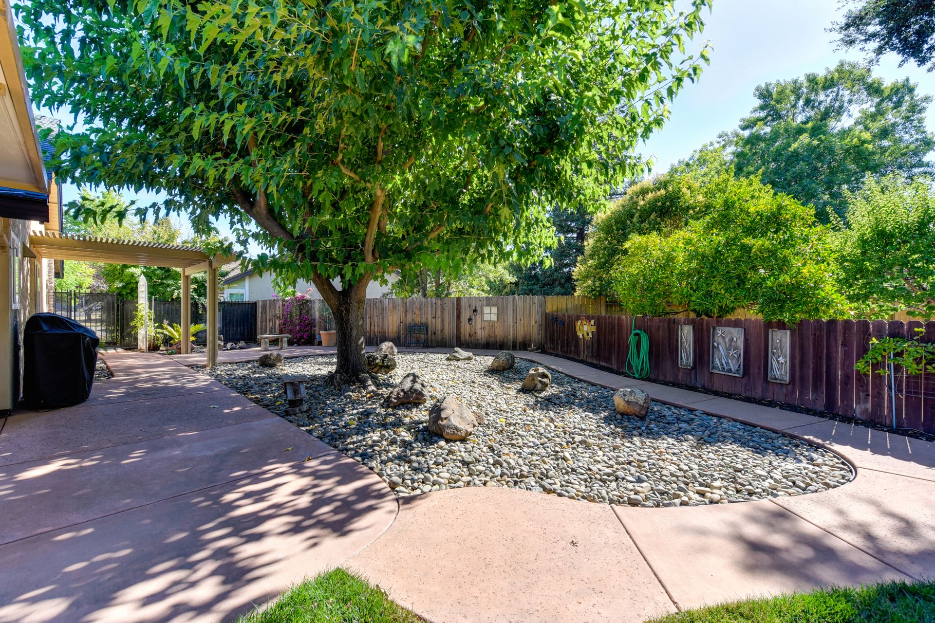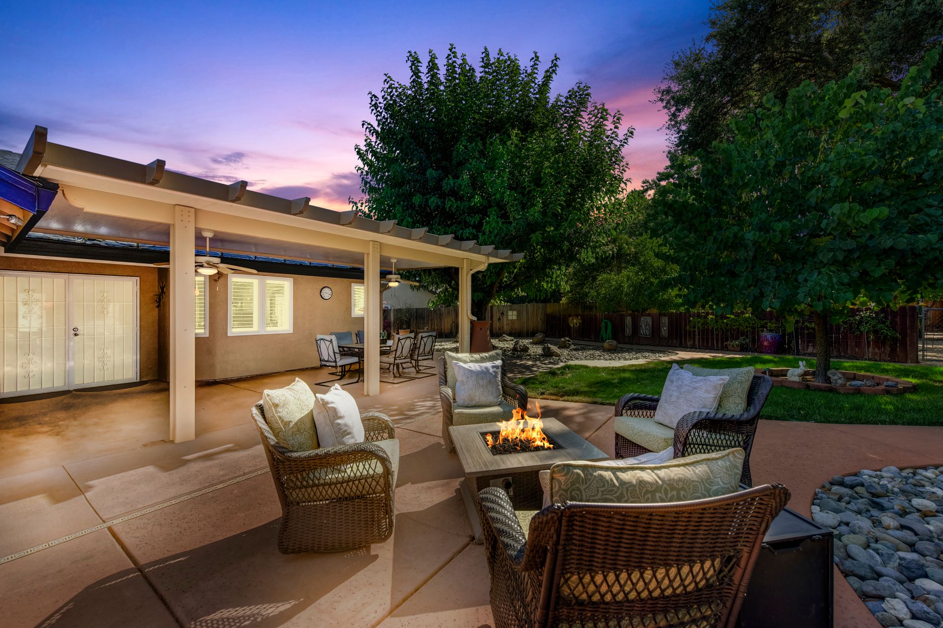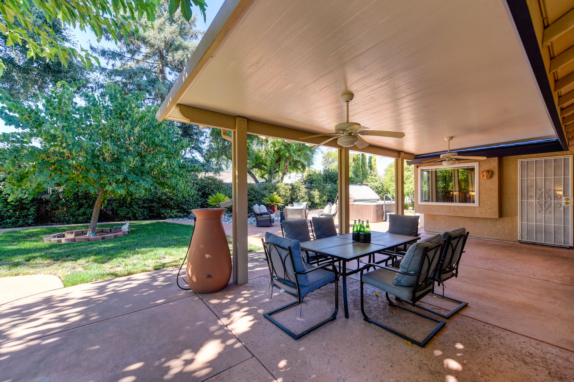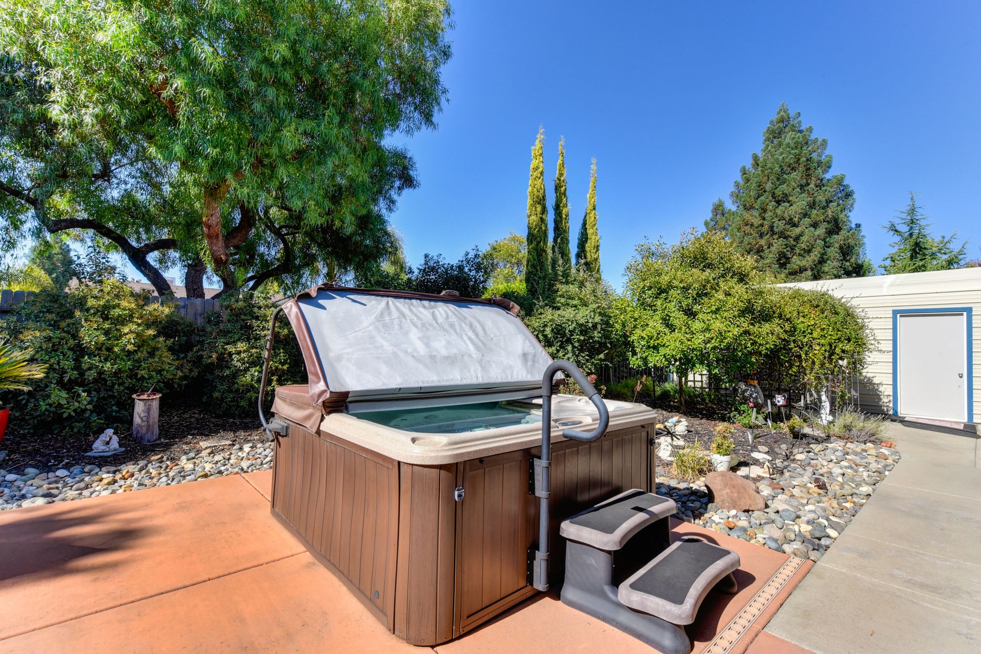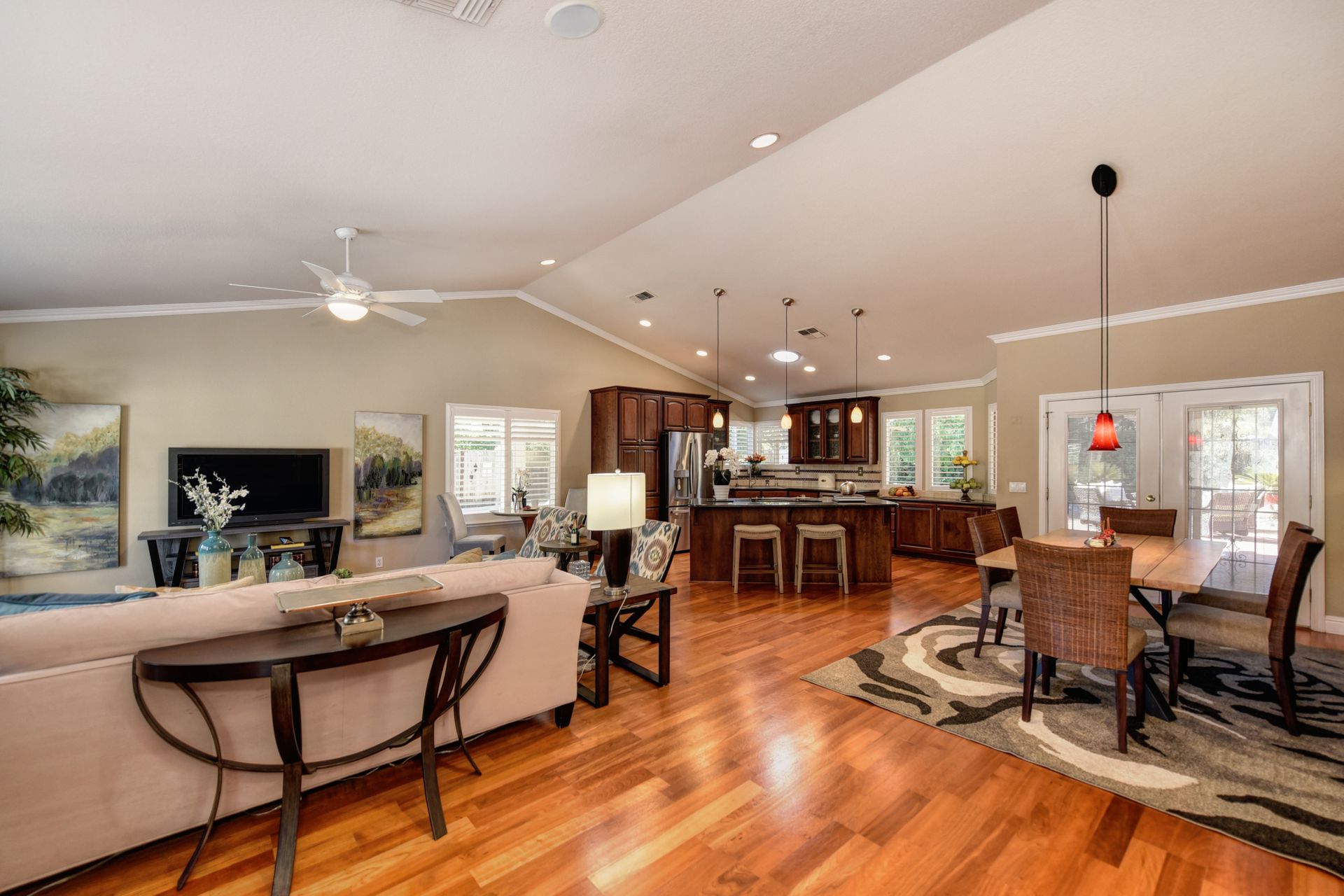 A HOME THAT CHECKS ALL THE BOXES! Cul-de-sac location, single story, fabulously designed great room floor plan that offers many accessible features, multiple security doors to enjoy the evening & morning breezes, amazing wrap around yard, 300 sq ft patio with ceiling fans, mini orchard, patio, spa and water fall features. 14X30 insulated garage/workshop with power and lighting, 13-foot RV parking cover with 30-amp electrical outlet, 9X9 vented storage with windows, 3X6 metal tool shed and a 2 car garage with insulated doors, built in storage & epoxy flooring. The owners labor of love and careful attention to detail, outshines the competition! The home and lot were remodeled and improved at just about every square inch, including windows. This home definitely has a WOW factor the instant you enter the home! The enhanced great room floor plan, has open flowing space, amazing filtered light through plantation shutters, architectural features and a kitchen to do amazing cooking & entertaining. The formal dining area has built-ins and lighted cabinetry and the kitchen has custom cabinetry, updated appliances, multiple counters and dinning options, that flow to the rear patios and yard. A custom bar/wine storage cabinet is located in the hallway, which could be used for many things- you choose!. Gorgeous custom bathrooms enhance the space and make this home easy to love!