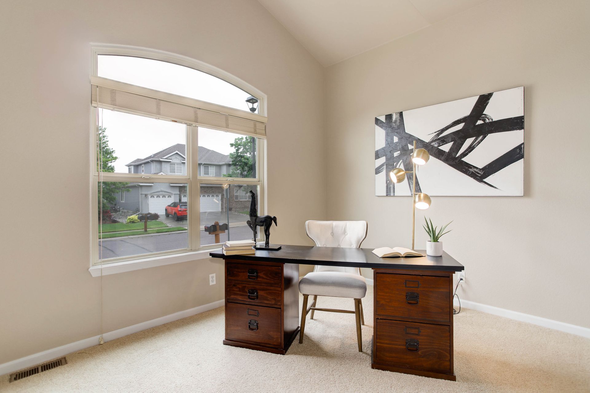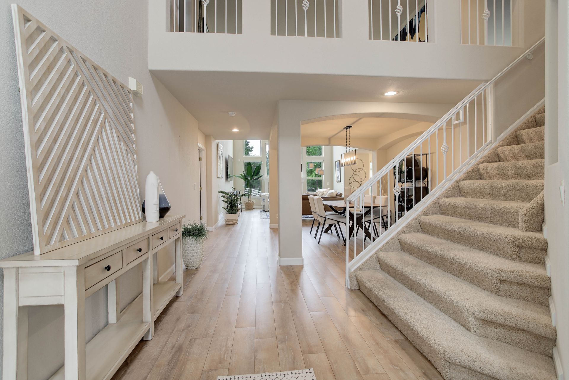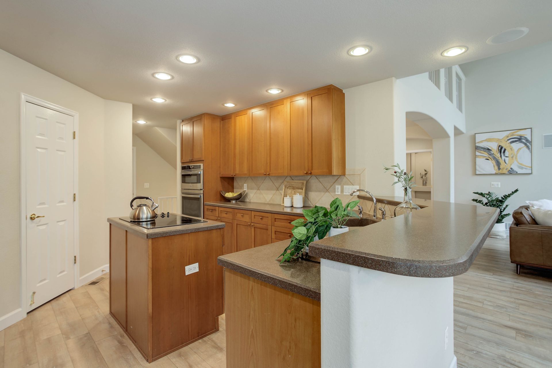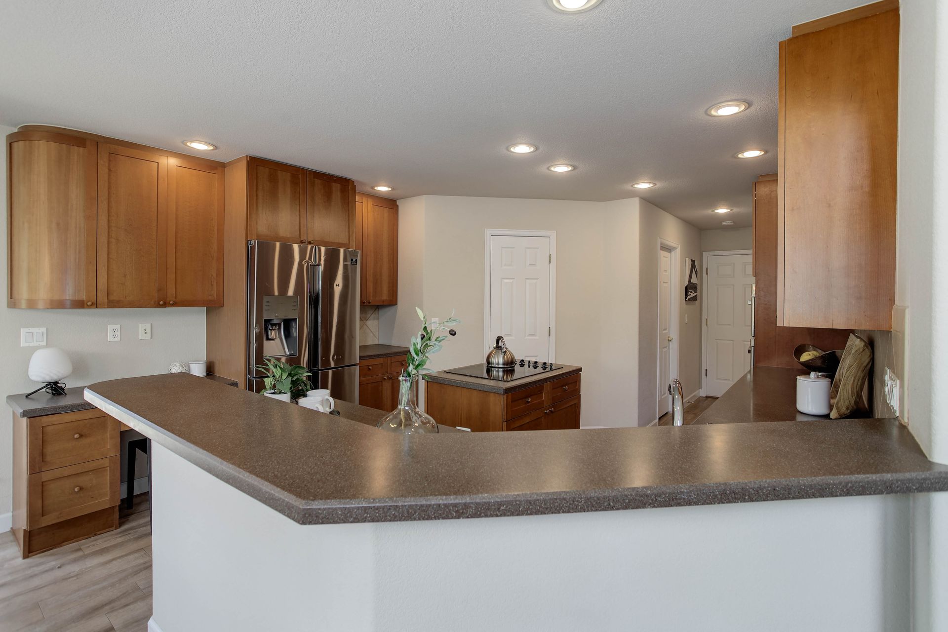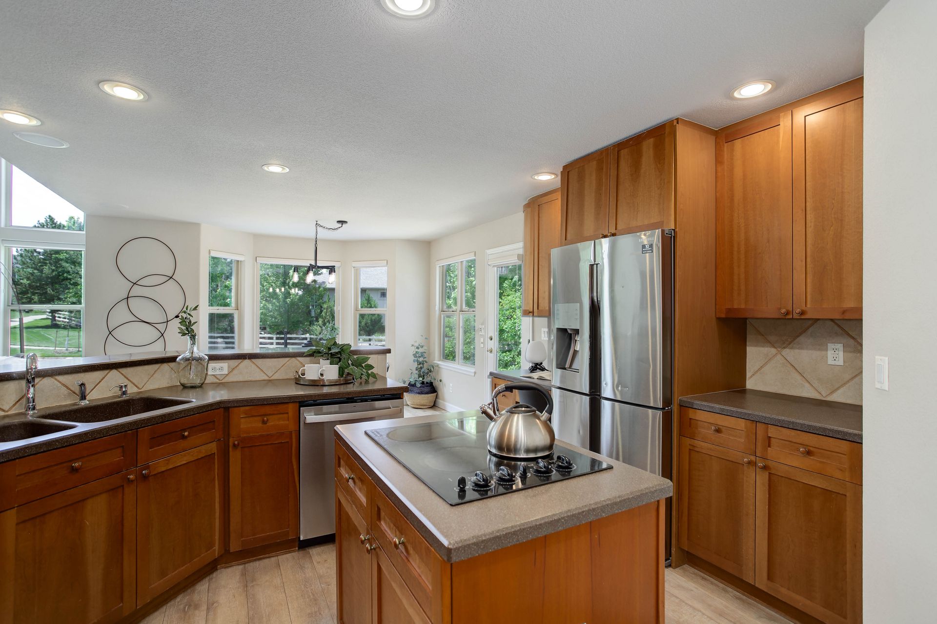 Enter a sun-drenched open layout where soaring ceilings and expansive windows create an inviting atmosphere. The kitchen features stainless steel appliances, a large walk-in pantry, an island with a cook-top, a new refrigerator, a generous amount of cabinet space, and a bar-height peninsula, perfect for cooking with loved ones or hosting unforgettable gatherings. Also included on the main floor is a bright, airy office that is ideal for work-from-home days.