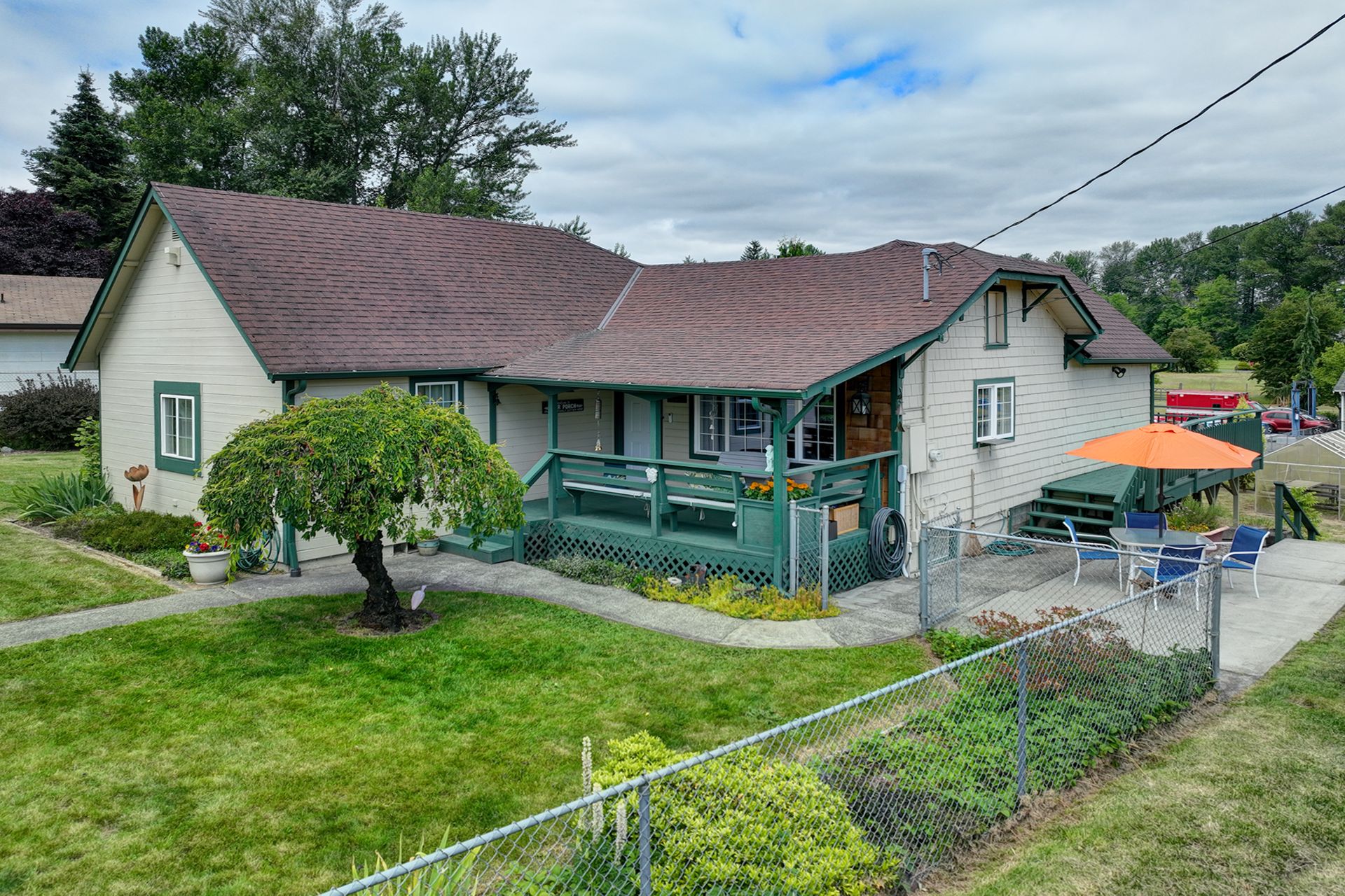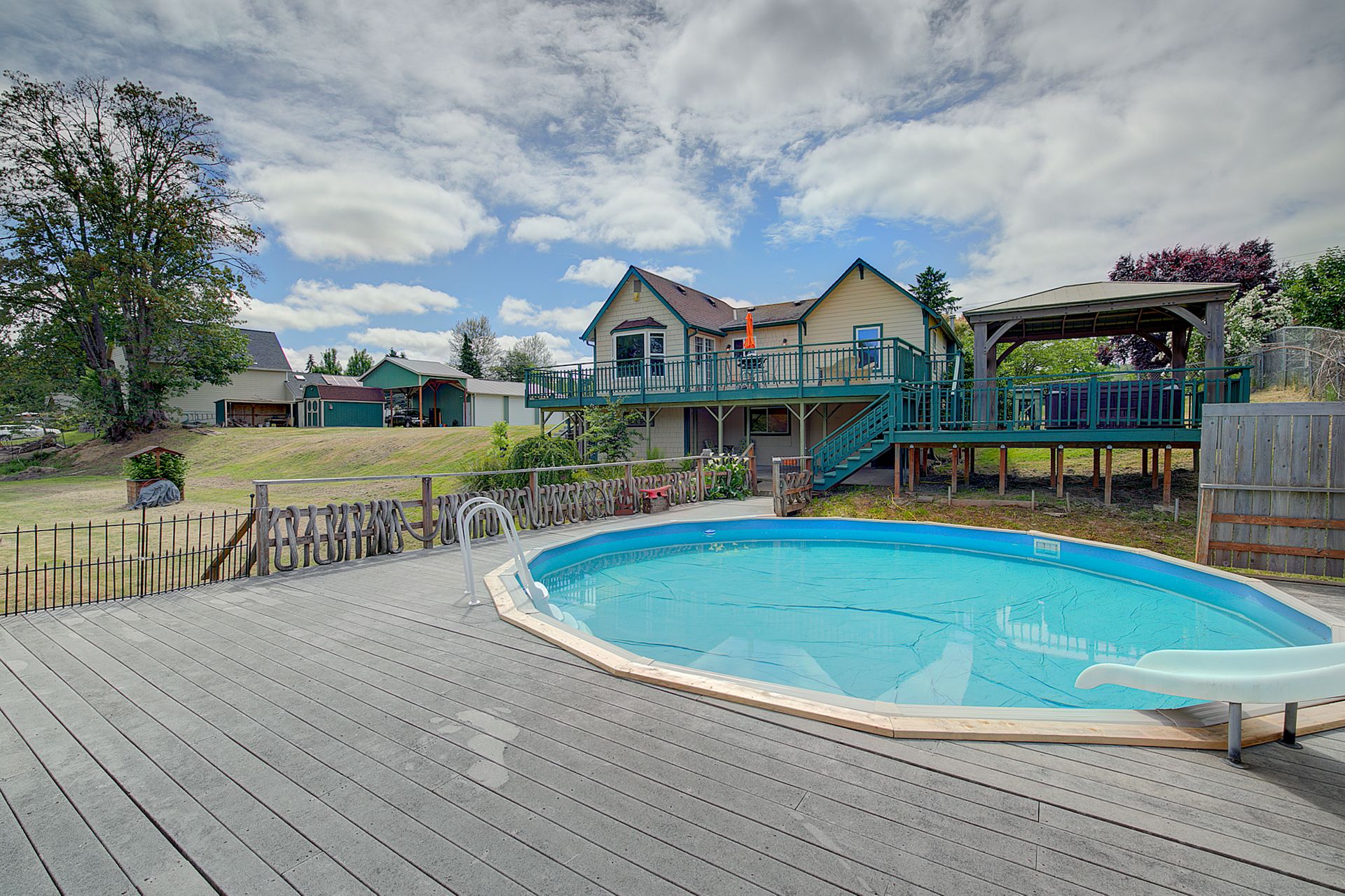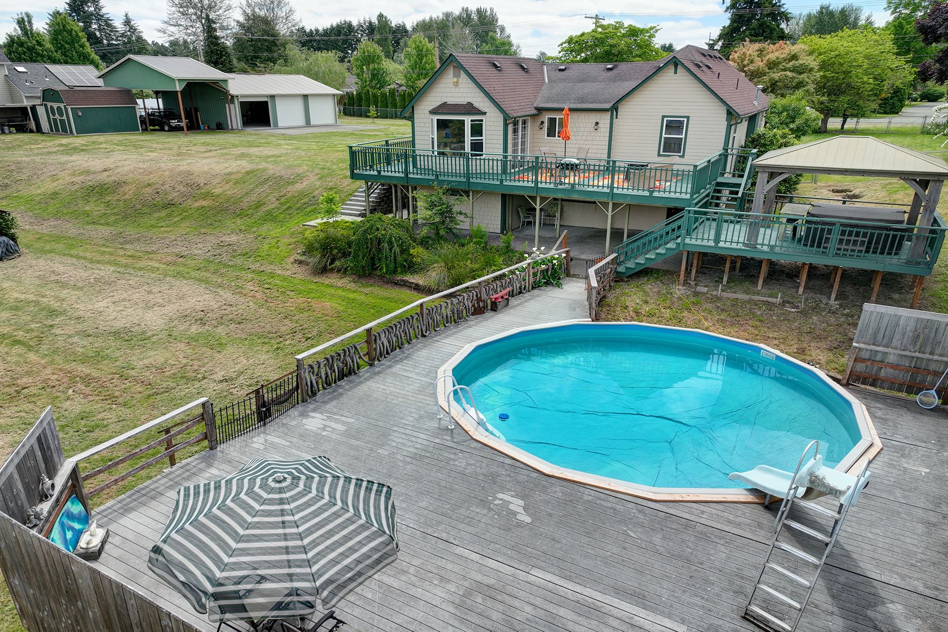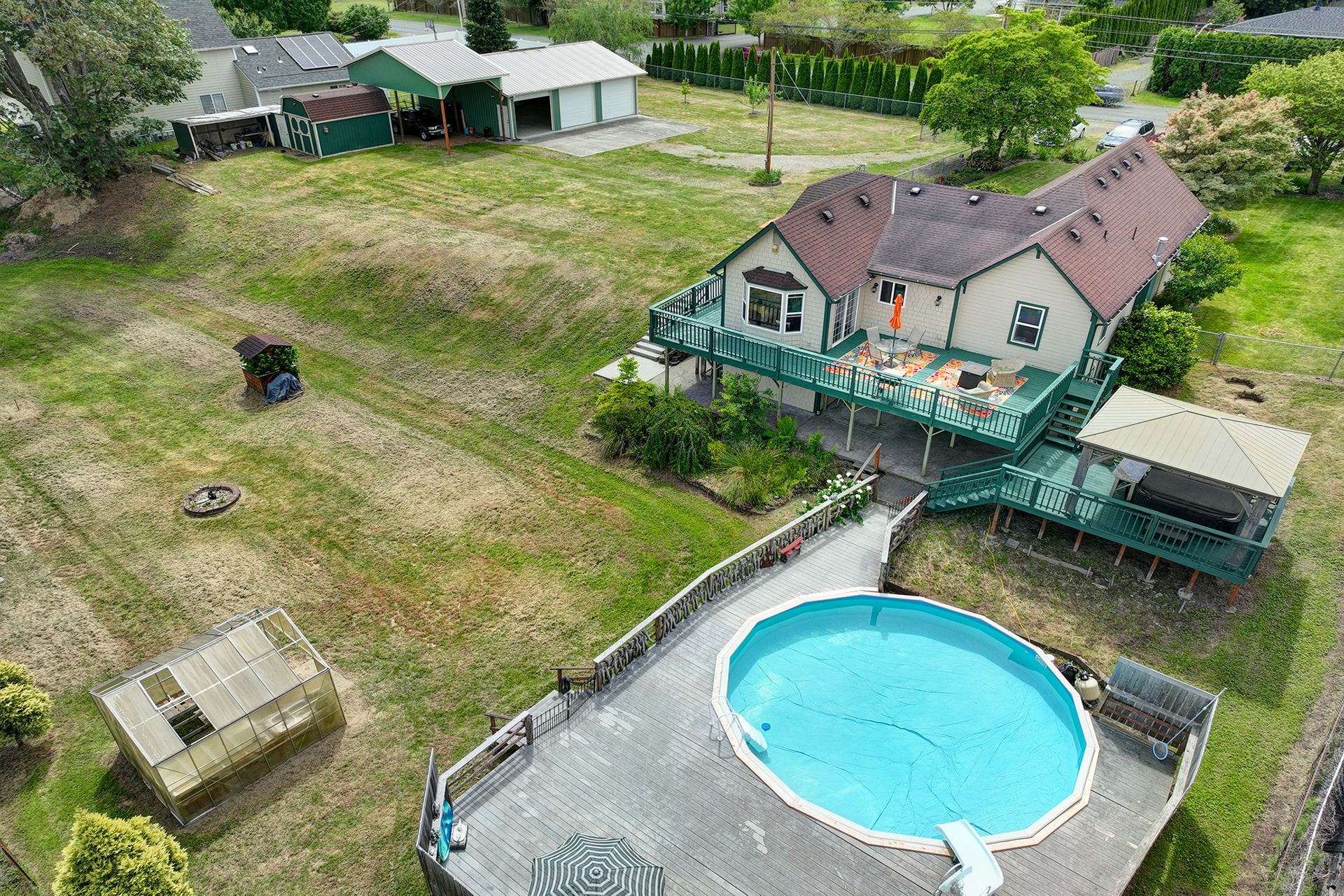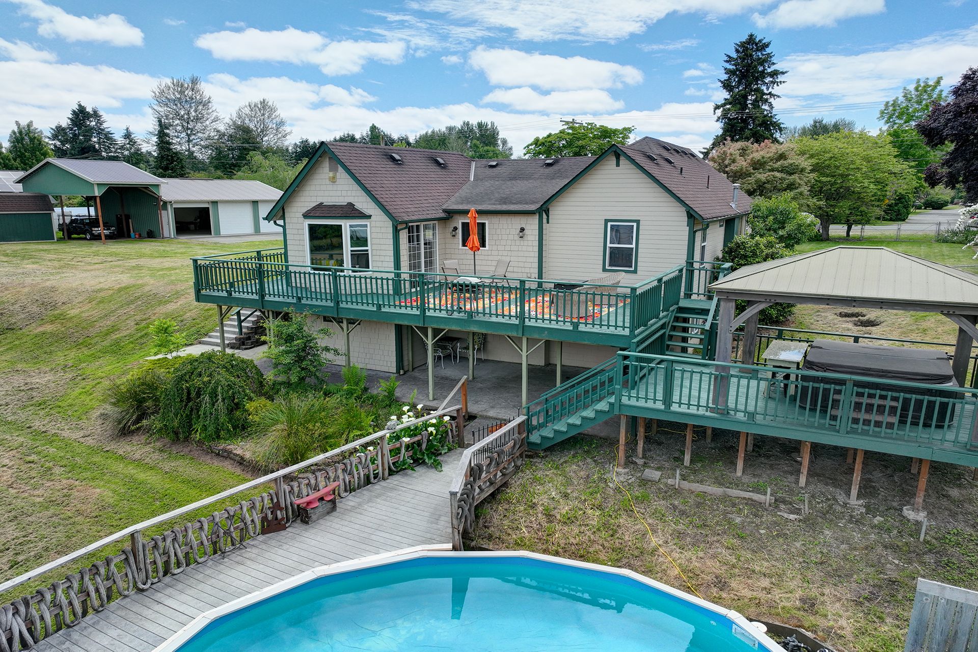 This charming farmhouse, on just shy of an acre, offers a unique blend of vintage character and modern comfort. The renovated kitchen features new cabinets, butcher block countertops and stainless-steel appliances, while hardwood floors add warmth and elegance throughout. The lower level provides a flexible recreation room or office space, three-quarter bath and additional finished room, ideal for a fourth bedroom. The utility/mud room leads to the patio and expansive deck, where you can relax by the pool or in the hot tub. Outdoor and hobby enthusiasts will appreciate the approximately 1,080 square foot shop with a metal roof - perfect for projects or storage, RV carport, outbuildings, covered woodshed and a greenhouse. Conveniently located near freeways, restaurants, shops and more!