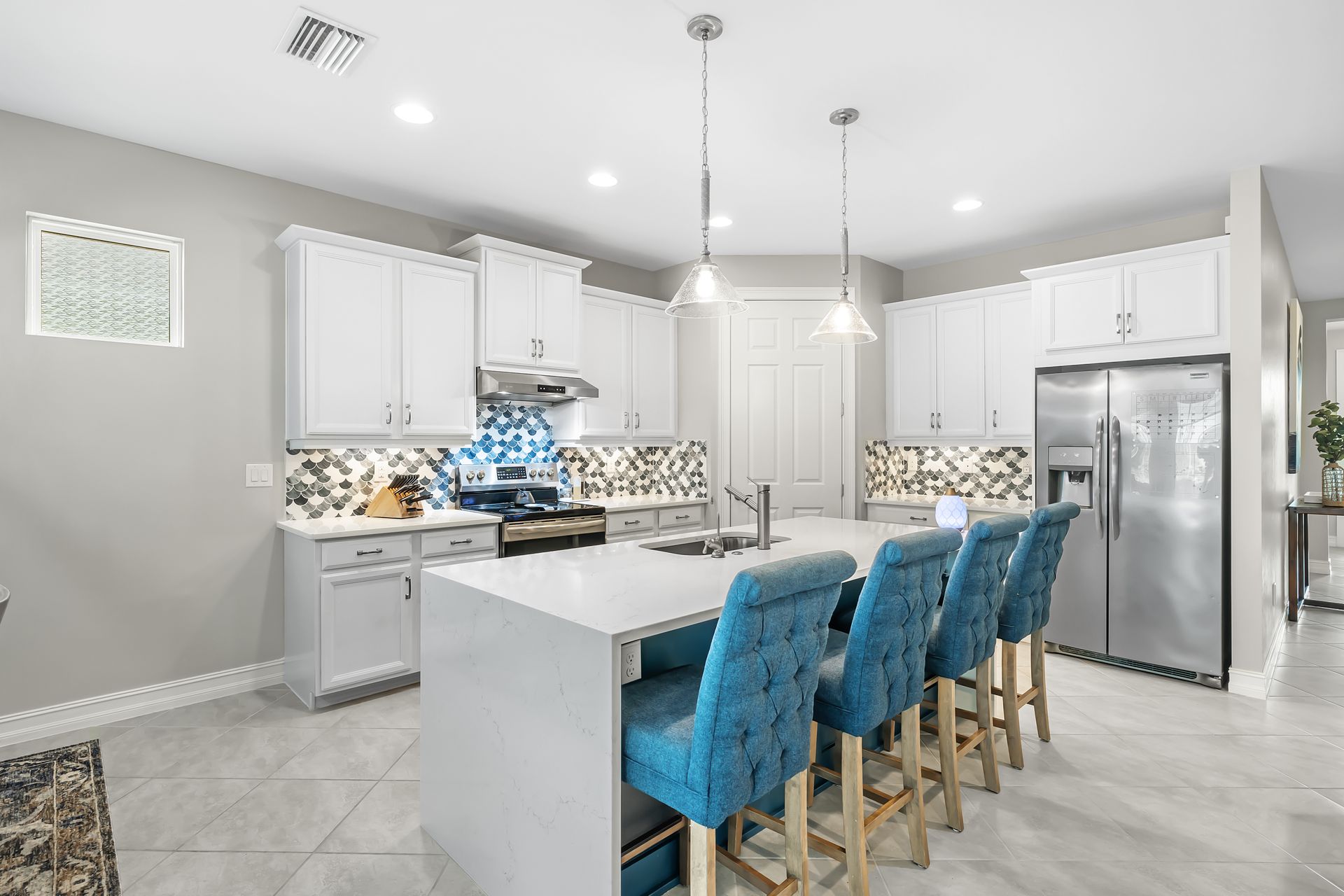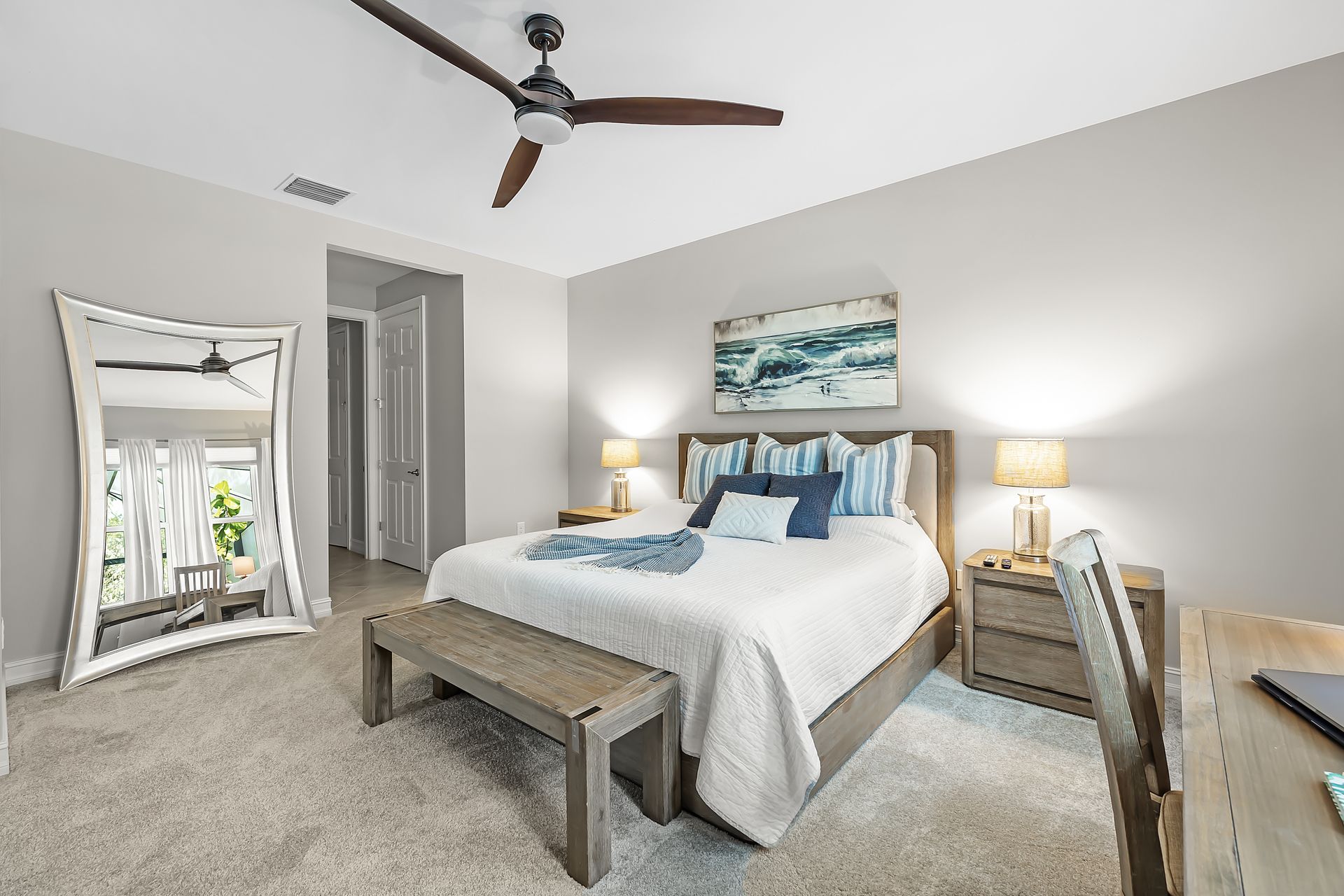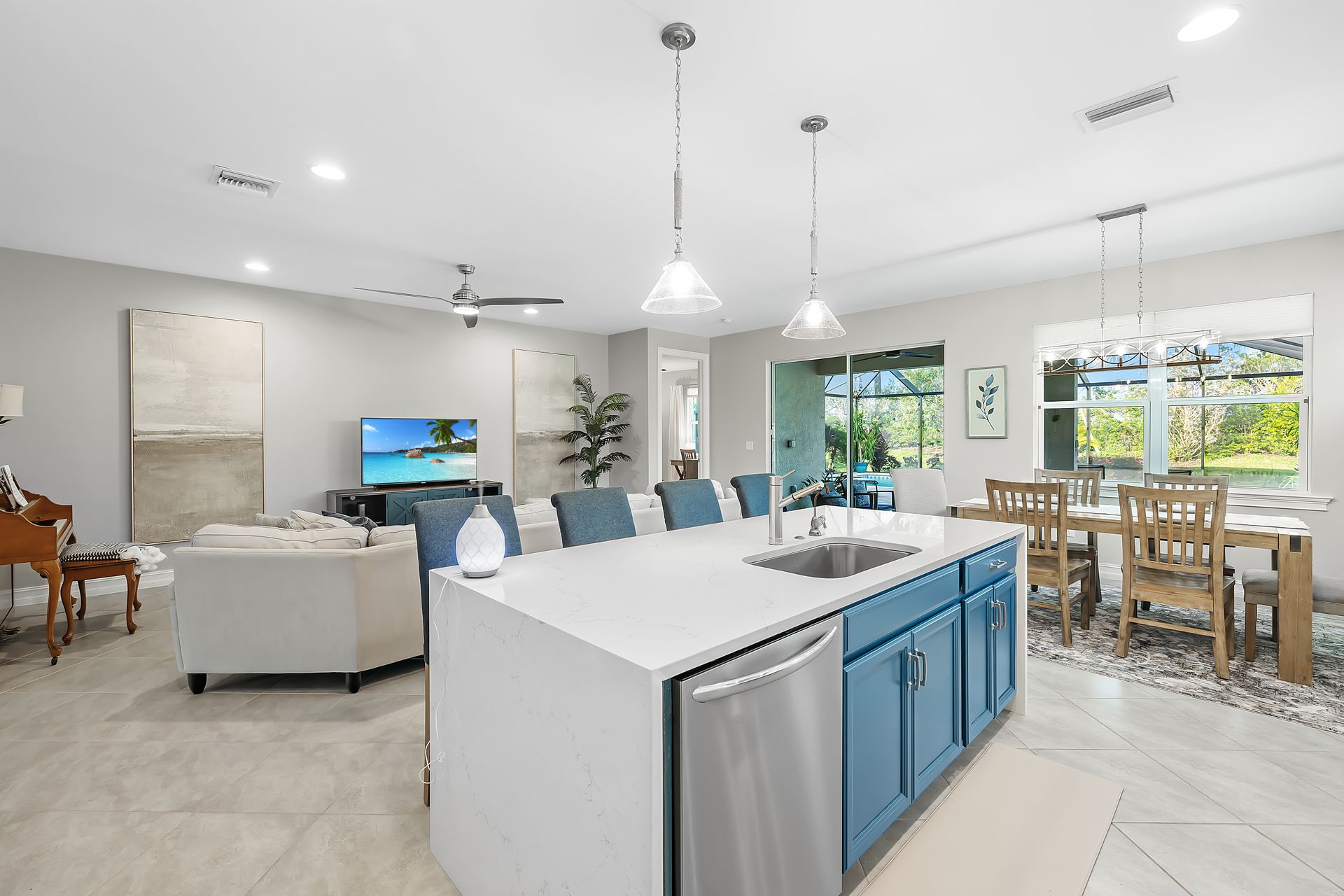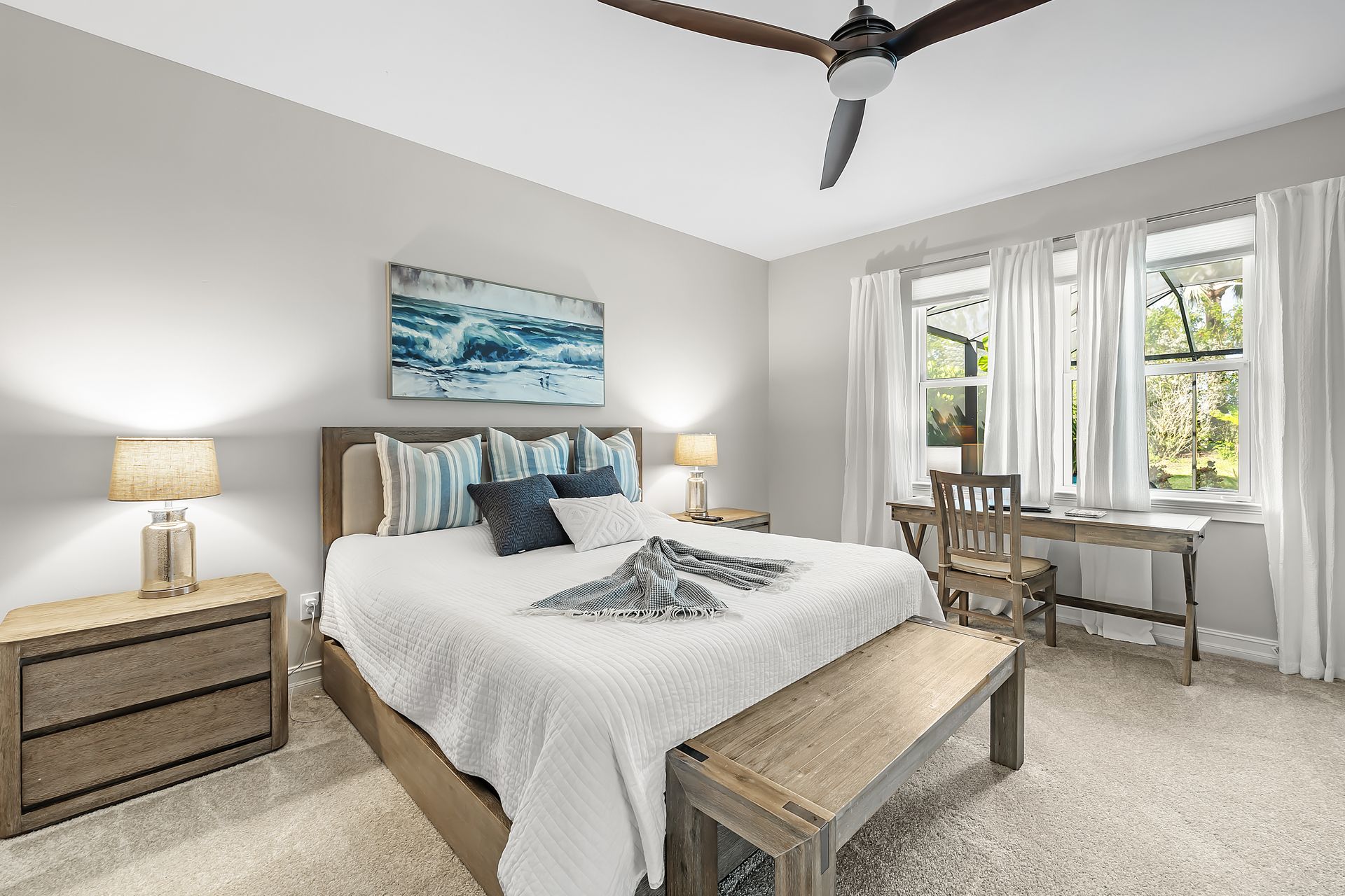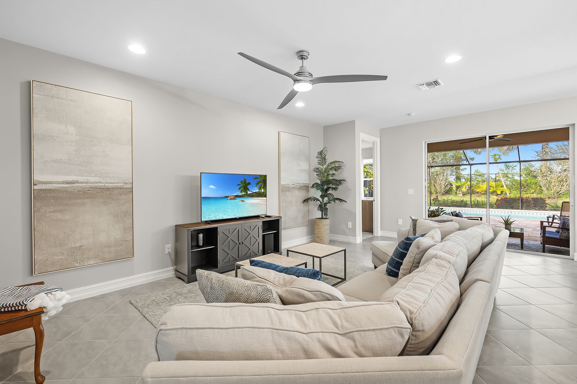 This spacious coastal contemporary four bedroom, two bath, Delray model, in beautiful Naples Reserve is a showstopper! Offering over 2,000 square feet of open-concept living space and a gorgeous lanai with a state-of-the-art pool! The carefully planned kitchen offers lots of storage and counter space, RO water filtration, and an oversize kitchen island. Home features include a whole-house water filtration system and Solar panels for energy efficiency. The primary suite offers dual walk-in closets and a large ensuite bath with dual sinks and a large walk-in shower. The family room leads to large sliding doors out to the spacious lanai extended all the way to the property line and pool area which is just perfect for entertaining or enjoying the Florida sun. Golf cart and propane grill included with the home! Community amenities include a 24-hour guarded gate, 22 lakes (all navigable), a one-mile-long rowing lane, a boat ramp, an Island Club, a fitness center, two bocce ball courts, beach volleyball, tiki bar and café, a resort-style pool, fire pit, use of electric boats, Kontiki Island, stand-up paddle boards, kayaks and canoes, five tennis courts, four pickle ball courts, two dog parks, miles of paths, play area and more!