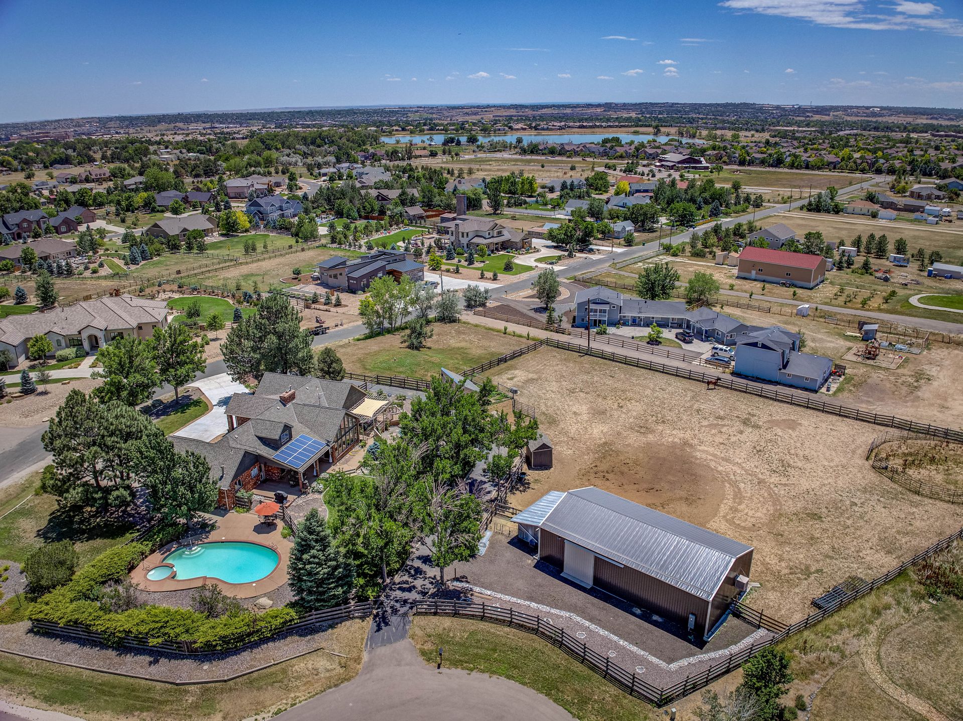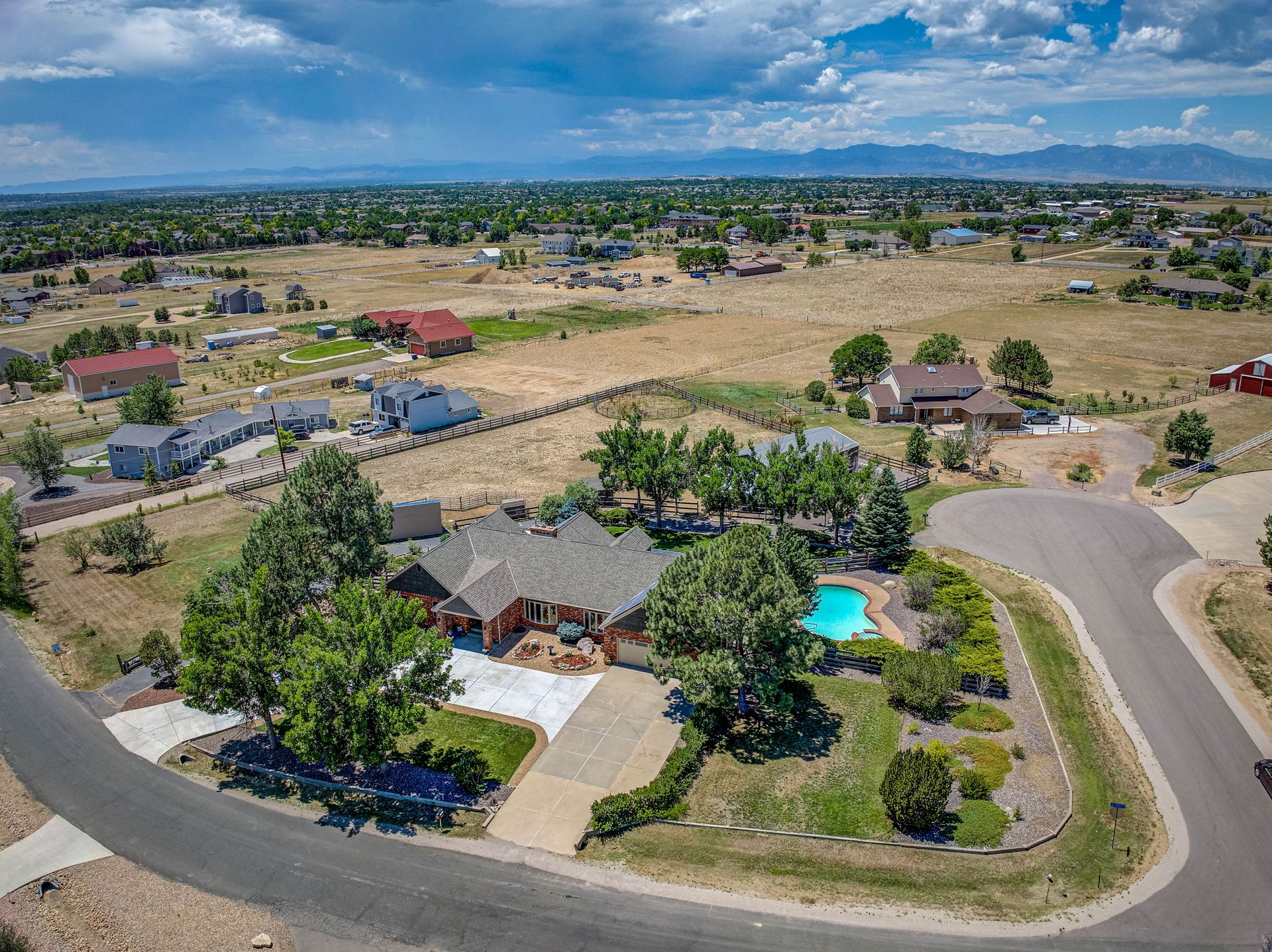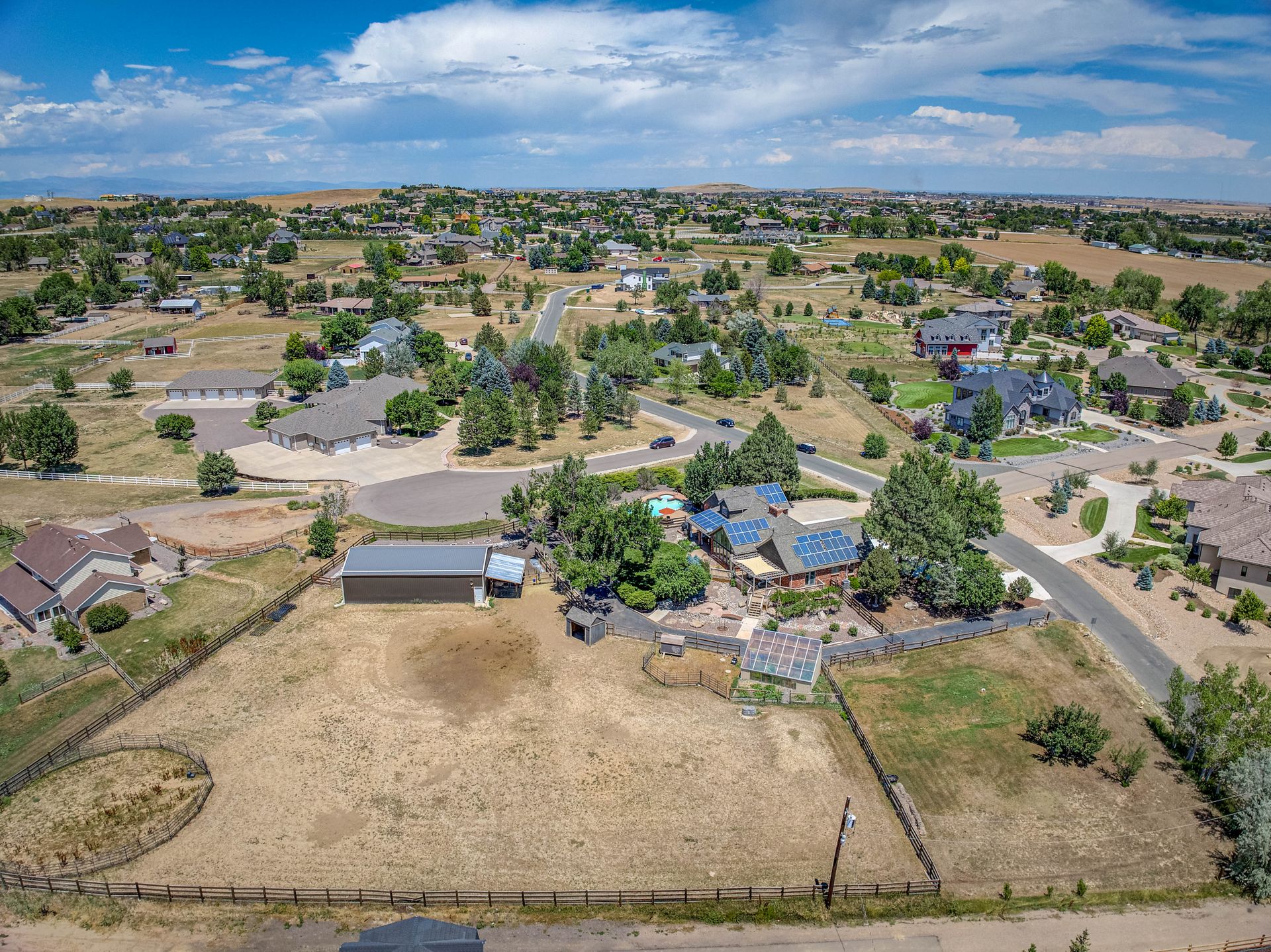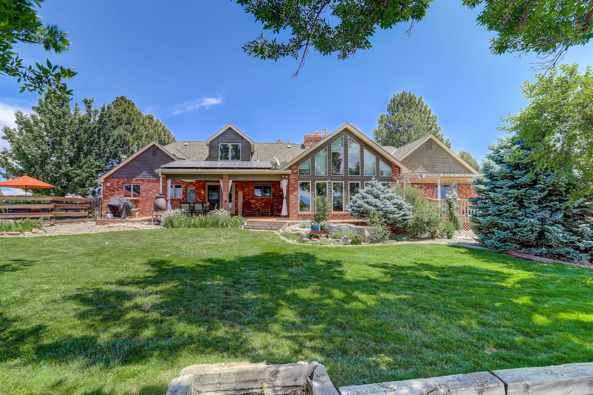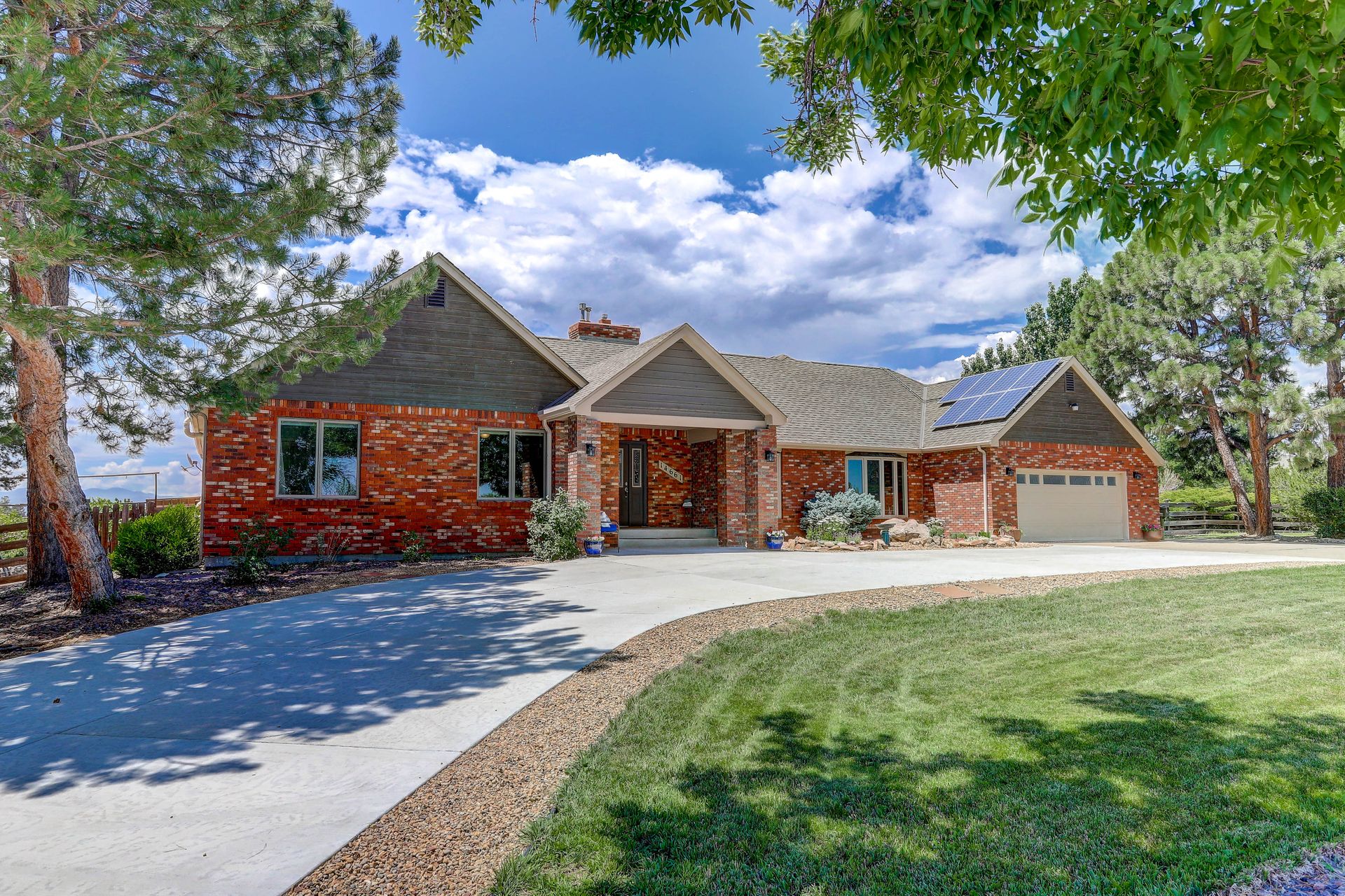 Sprawling 4300+ sqft. Colorado country estate is the perfect combination of manicured lawns, mature trees/plants and horse facilities! This welcoming home has casement windows, solid wood 6-panel doors, gleaming wood floors, new carpet and on the main level features...sunken 13x20 living room with new wood floors, bay window and arched entry to formal dining room, with bay window and art/pottery niches...12x14 office with wood floors and divided light French doors...19x24 great room with vaulted ceilings, West-facing window wall, floor-to-ceiling brick fireplace, view up to loft and walkout to both covered Trex decks...updated, sunny eat-in kitchen with hickory cabinets, granite counters, all appliances including newer SS smooth top range with double oven and SS fridge, recessed lighting, two pantries, and walk-out to the covered deck...convenient laundry and powder bath off the kitchen...17x20 primary bedroom with mountain views, pergola-covered deck access, and ensuite 5-pc bath with French doors, clawfoot tub, hickory cabinets and walk-in closet with custom shelving and ironing center...and 2nd bedroom with convenient access to full hall bath with new vanity and glass block window. The 11x18 upper level loft with wrought iron railing overlooks the great room, and leads to the tucked away spacious, yet cozy, 3rd bedroom with dormer and new ensuite 3/4 bath. The basement features a large game/rec room...spacious 4th bedroom with walk-in closet...and 15x27 mech/storage room. Outside, you'll enjoy the fenced pool area with waterfall and in-ground spa... park-like backyard...mature, producing grape vines (sellers make their own wine!), greenhouse & garden with abundant vegetables & plants...fenced pasture with round pen and lean-to stable/stall access...and easy in-and-out, paved/road base access to 56x30 garage/barn/workshop. Solar panels, central AC and so much more! Easy 3 mile bike ride to recreation at McKay Lake Park!