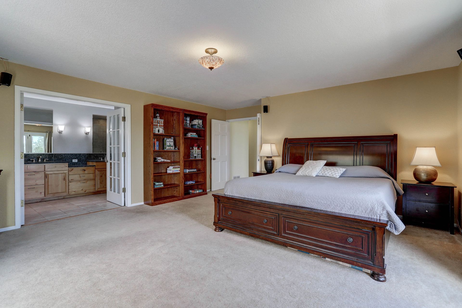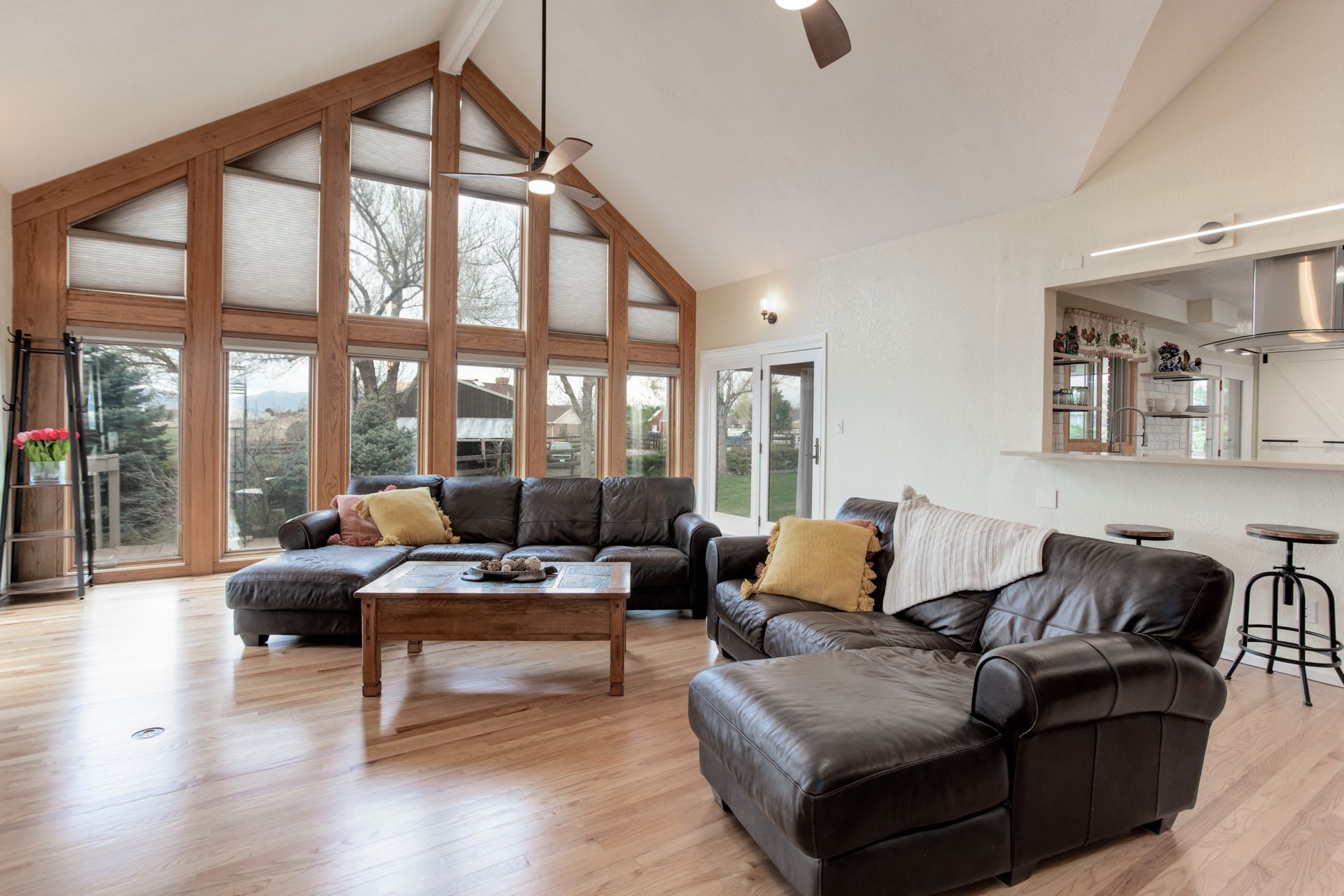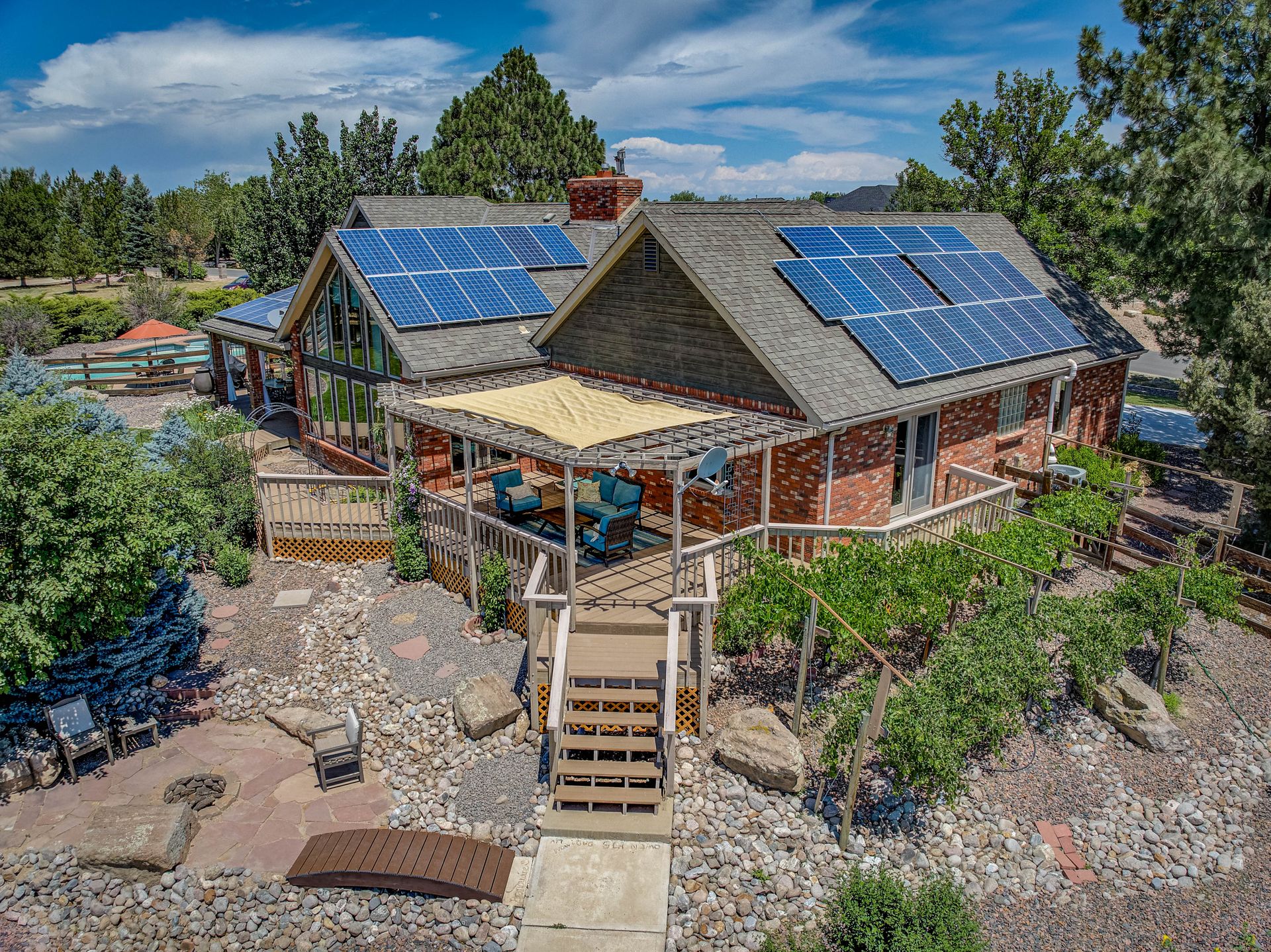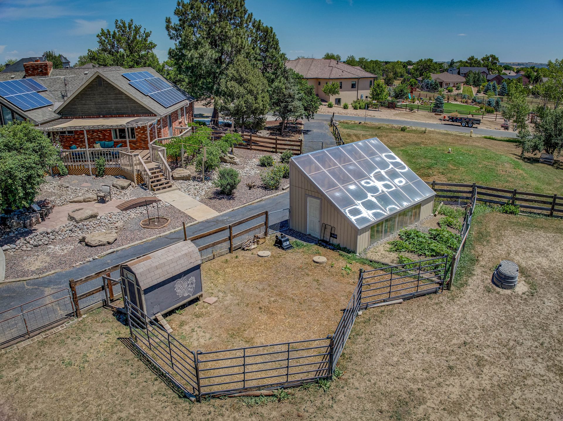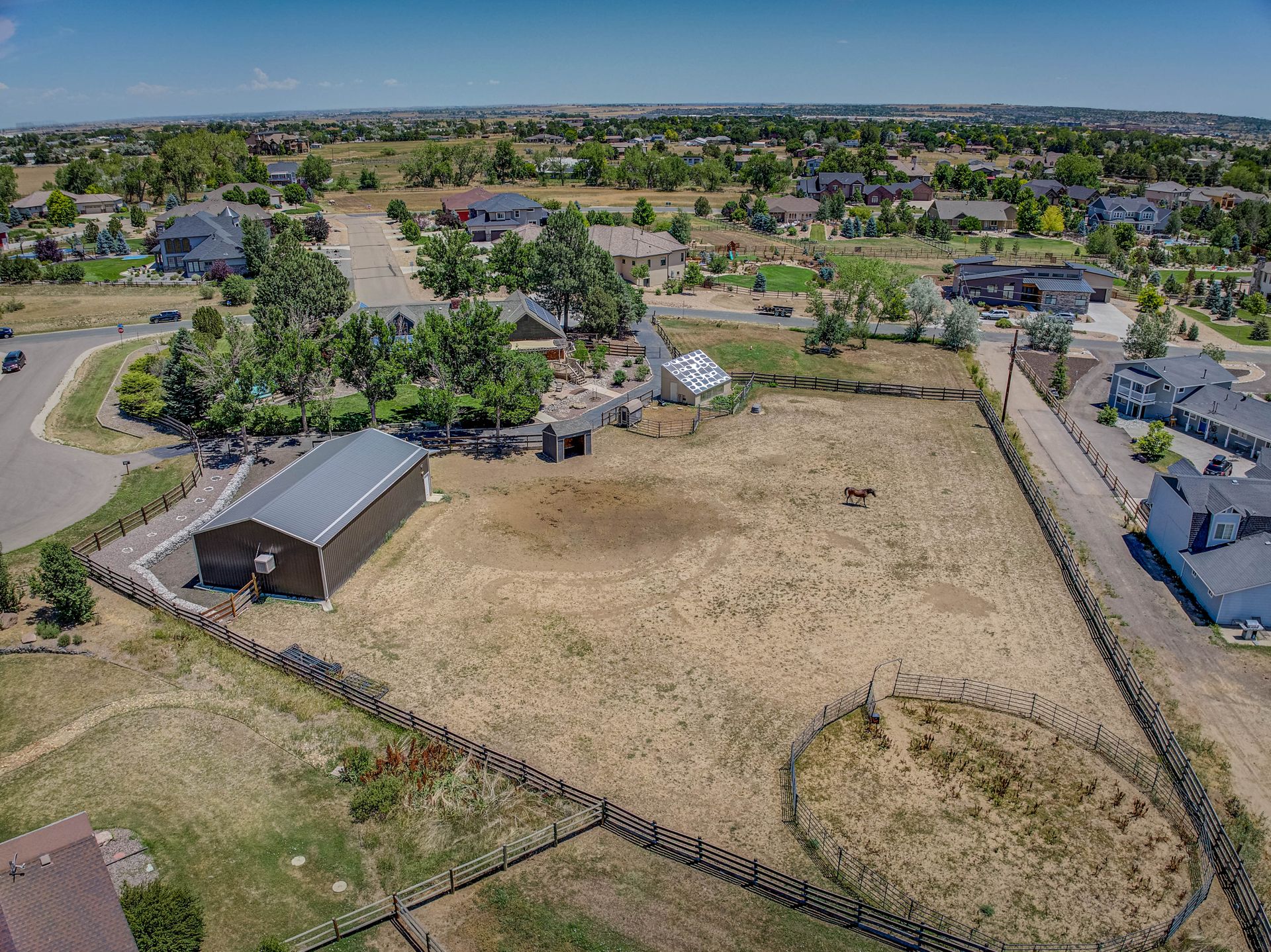Sprawling 4300+ sqft. Colorado country estate is the perfect combination of manicured lawns, mature trees/plants and horse facilities! This welcoming home has casement windows, solid wood 6-panel doors, gleaming wood floors, new carpet and on the main level features...sunken 13x20 living room with new wood floors, bay window and arched entry to formal dining room, with bay window and art/pottery niches...12x14 office with wood floors and divided light French doors...19x24 great room with vaulted ceilings, West-facing window wall, floor-to-ceiling brick fireplace, view up to loft and walkout to both covered Trex decks...updated, sunny eat-in kitchen with hickory cabinets, granite counters, all appliances including newer SS smooth top range with double oven and SS fridge, recessed lighting, two pantries, and walk-out to the covered deck...convenient laundry and powder bath off the kitchen...17x20 primary bedroom with mountain views, pergola-covered deck access, and ensuite 5-pc bath with French doors, clawfoot tub, hickory cabinets and walk-in closet with custom shelving and ironing center...and 2nd bedroom with convenient access to full hall bath with new vanity and glass block window. The 11x18 upper level loft with wrought iron railing overlooks the great room, and leads to the tucked away spacious, yet cozy, 3rd bedroom with dormer and new ensuite 3/4 bath. The basement features a large game/rec room...spacious 4th bedroom with walk-in closet...and 15x27 mech/storage room. Outside, you'll enjoy the fenced pool area with waterfall and in-ground spa... park-like backyard...mature, producing grape vines (sellers make their own wine!), greenhouse & garden with abundant vegetables & plants...fenced pasture with round pen and lean-to stable/stall access...and easy in-and-out, paved/road base access to 56x30 garage/barn/workshop. Solar panels, central AC and so much more! Easy 3 mile bike ride to recreation at McKay Lake Park!