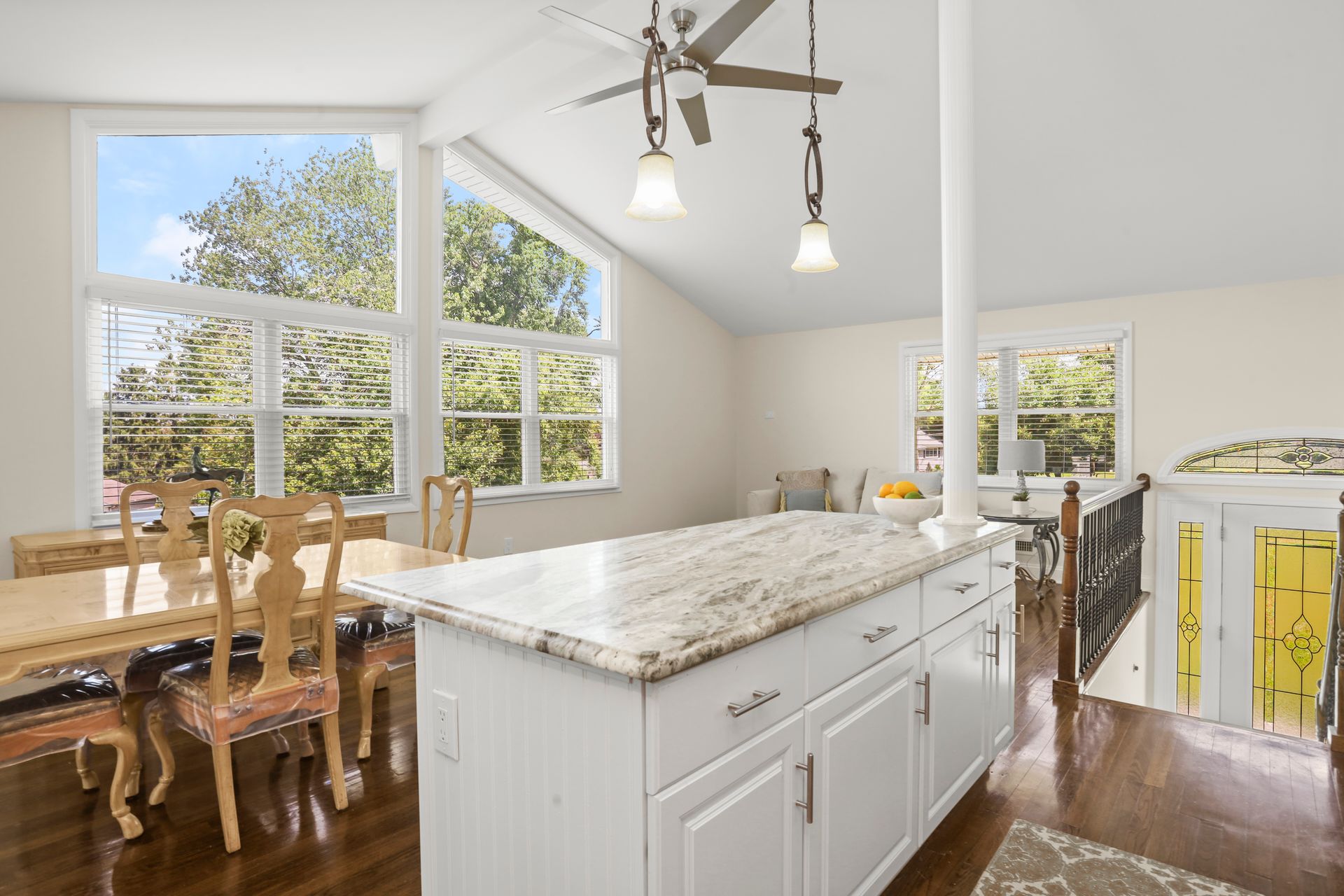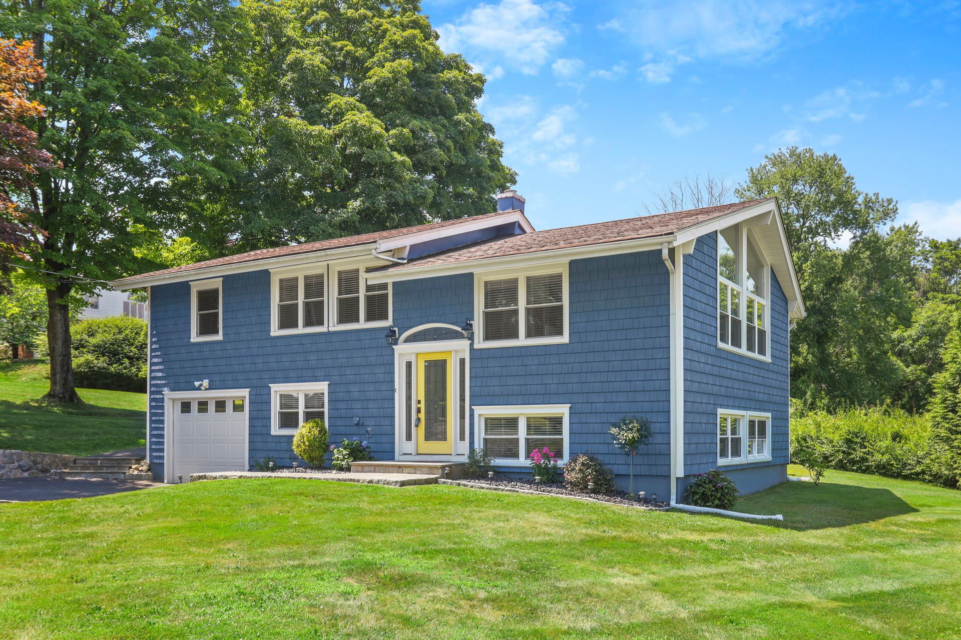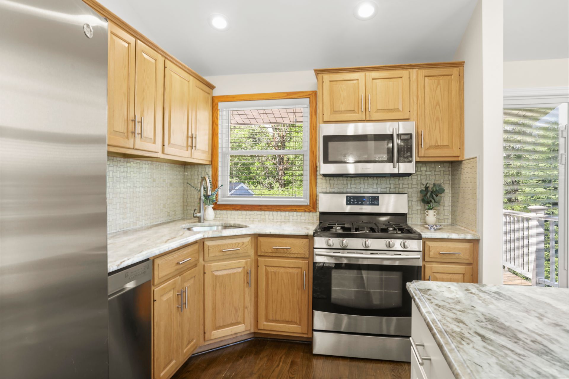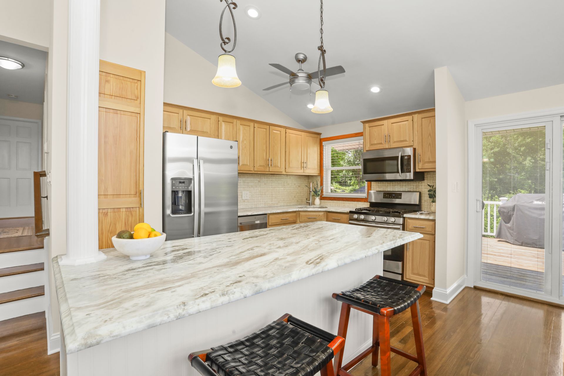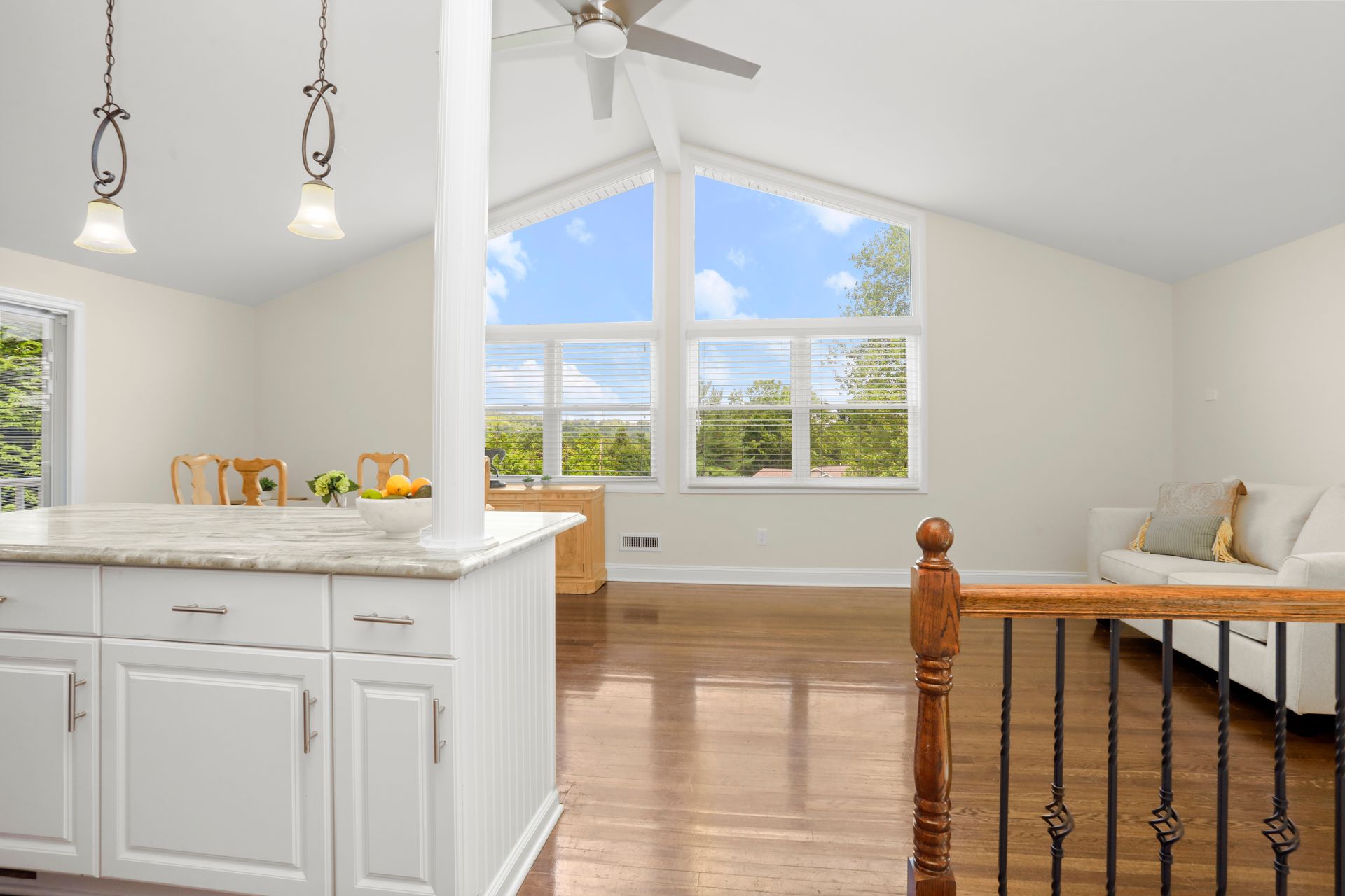 Two stone pillars, a stone wall and a flagstone walkway welcome you to this delightful home with an open floor plan, abundant windows providing natural light and striking updates. The main level features a living room, dining and eat-in kitchen that seamlessly flow together. Hardwood floors, breakfast counter with marble top, cathedral ceiling and oversized clerestory window create an inviting atmosphere. French doors from the kitchen lead to a sunny deck with distant Southern tree-top views, perfect for enjoying morning coffee or hosting outdoor gatherings. Just three steps up from the living room takes you to the bedroom level. The main bedroom boasts a cathedral ceiling and an updated bathroom with a tiled walk-in shower. Two additional bedrooms and an updated hall bath complete this level. Use the lower-level family room and office/fourth bedroom to suit your lifestyle - whether it’s movie night or a productive work from home setup. There is also a spotless laundry room with new lighting, a small office hideaway/storage and a sparkling one-car garage. Plush green lawns, a patio and deck enhance the outdoor ambience. This welcoming home is close to schools, parks, trails, businesses, shops and easy access to the parkway. Don’t miss out on this fantastic opportunity!