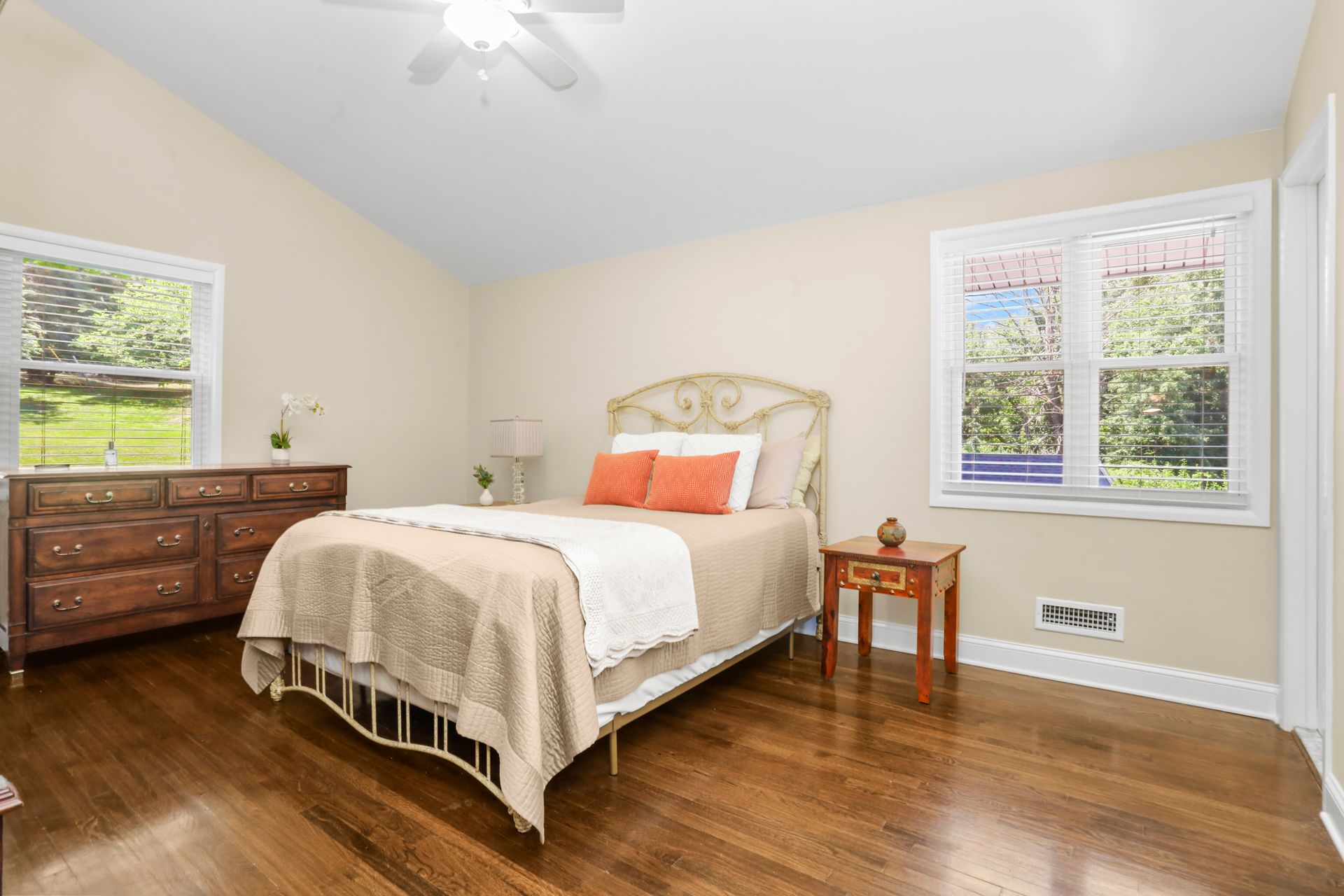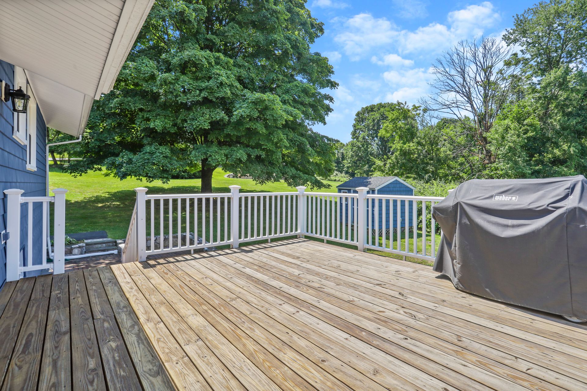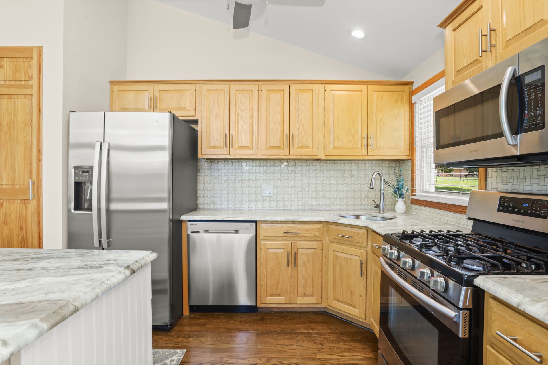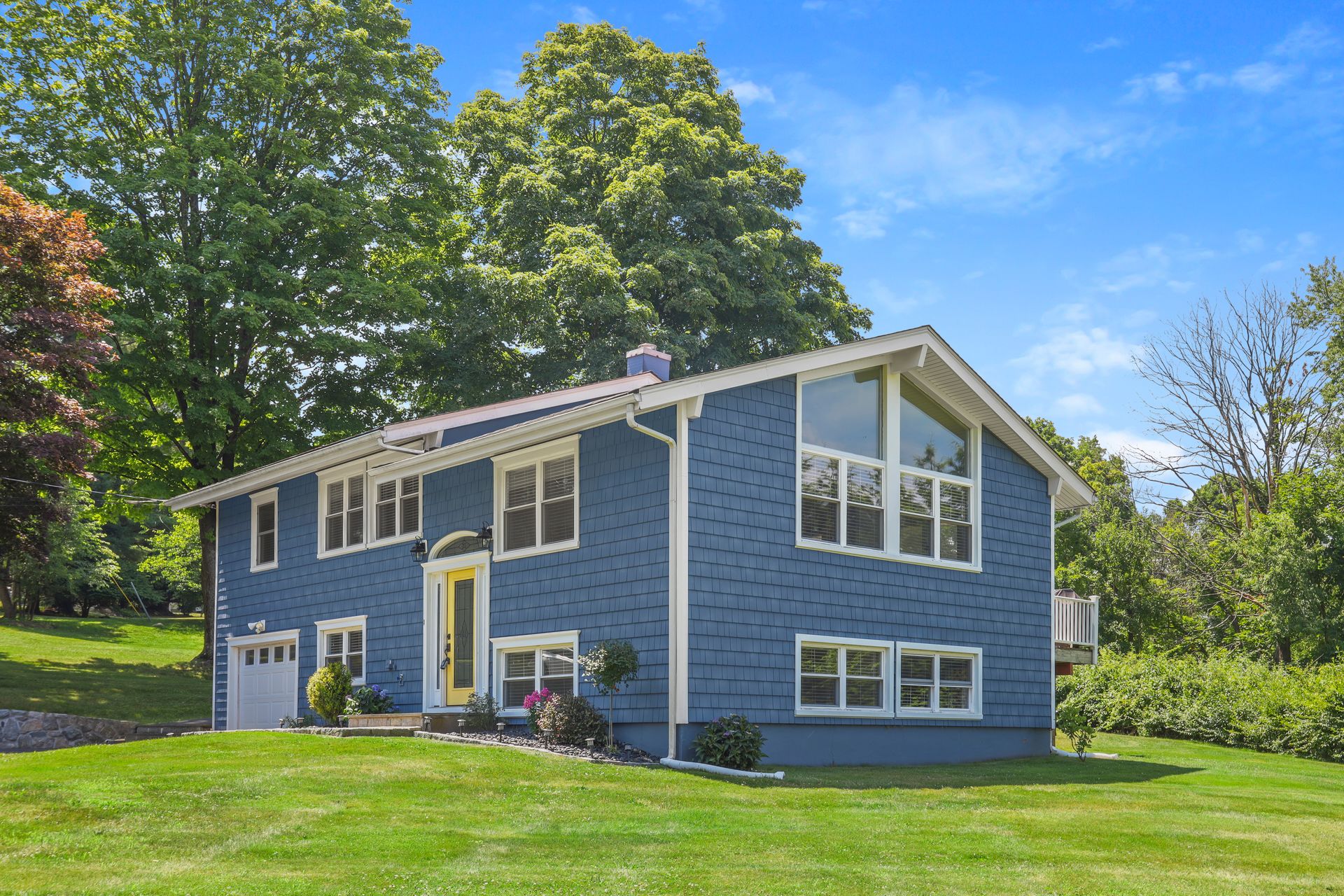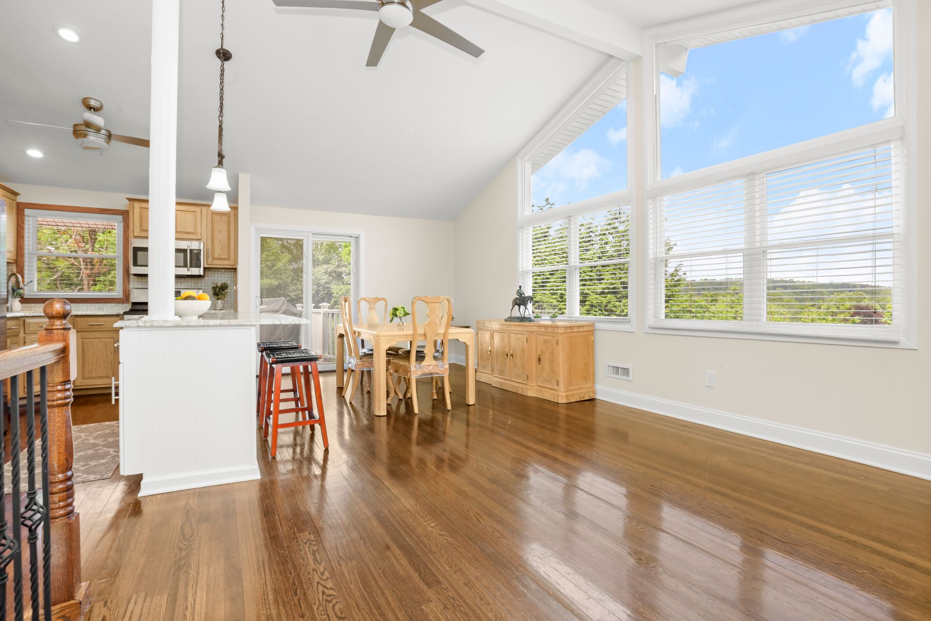Two stone pillars, a stone wall and a flagstone walkway welcome you to this delightful home with an open floor plan, abundant windows providing natural light and striking updates. The main level features a living room, dining and eat-in kitchen that seamlessly flow together. Hardwood floors, breakfast counter with marble top, cathedral ceiling and oversized clerestory window create an inviting atmosphere. French doors from the kitchen lead to a sunny deck with distant Southern tree-top views, perfect for enjoying morning coffee or hosting outdoor gatherings. Just three steps up from the living room takes you to the bedroom level. The main bedroom boasts a cathedral ceiling and an updated bathroom with a tiled walk-in shower. Two additional bedrooms and an updated hall bath complete this level. Use the lower-level family room and office/fourth bedroom to suit your lifestyle - whether it’s movie night or a productive work from home setup. There is also a spotless laundry room with new lighting, a small office hideaway/storage and a sparkling one-car garage. Plush green lawns, a patio and deck enhance the outdoor ambience. This welcoming home is close to schools, parks, trails, businesses, shops and easy access to the parkway. Don’t miss out on this fantastic opportunity!
