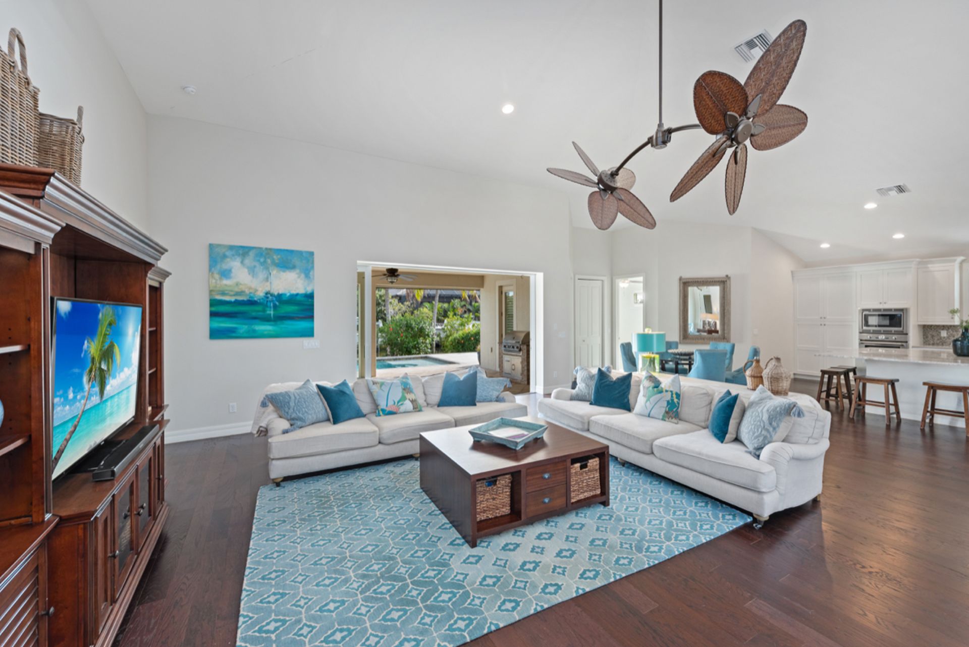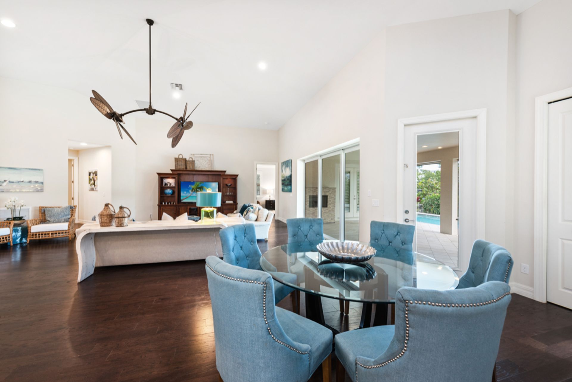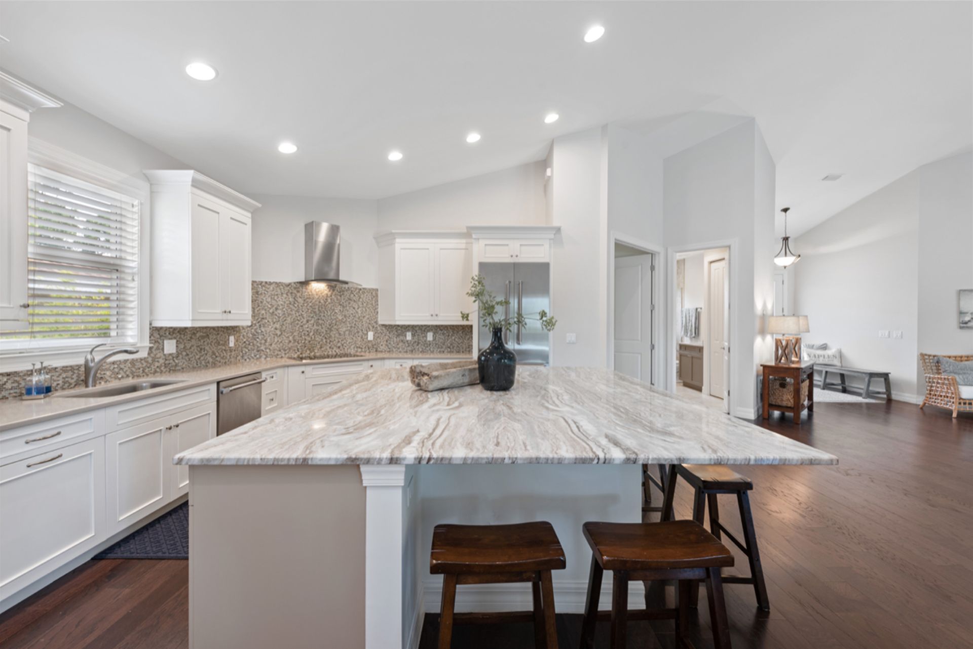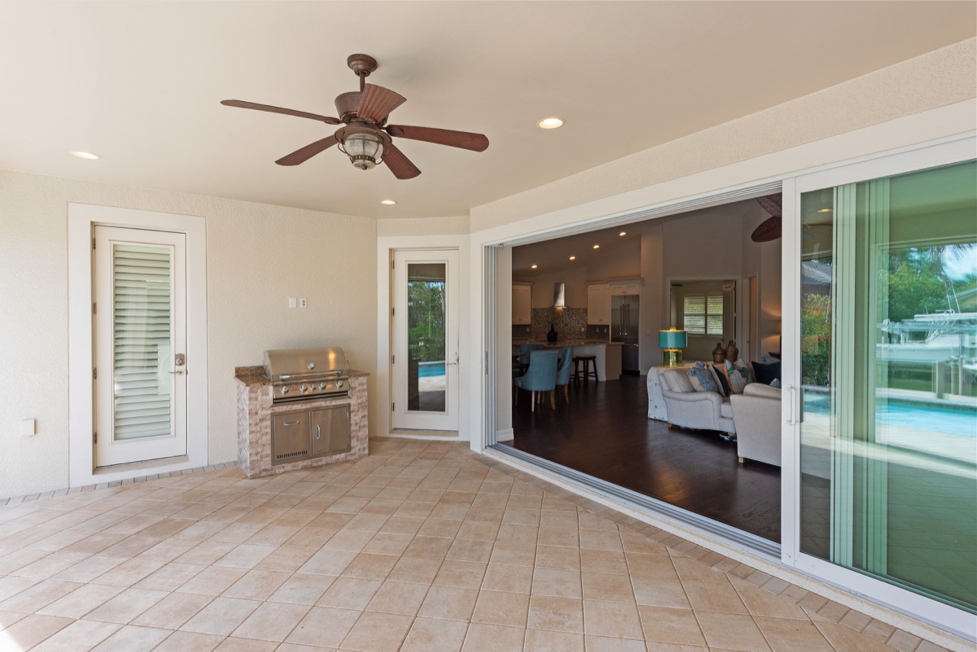 Enjoy the Naples lifestyle, within minutes to downtown out the front door and keeping your boat on the 12k lift out back with no bridges out to the Gulf of Mexico. Built in 2015, this home offers over 3,000 square feet, four bedrooms, four baths, a heated saltwater pool and a spa. The gourmet kitchen is perfect for entertaining with an oversized island and Thermador appliances and features 18' ceilings in the great room with water views. Some of the home's upgrades include quartz and granite counters, high-end cabinetry, vanities, tile showers, wood floors, built-in outdoor grill and fireplace, power retracting screens, impact windows and doors, plantation shutters, mature landscape and custom closet systems throughout. There are wonderful pool and canal views from the great room, kitchen, dining, guest and primary rooms.