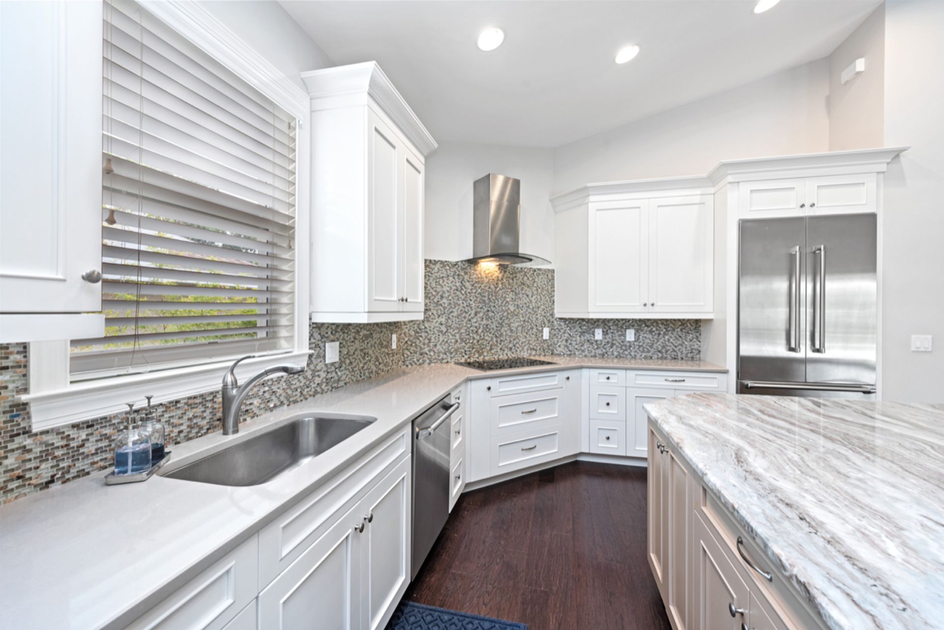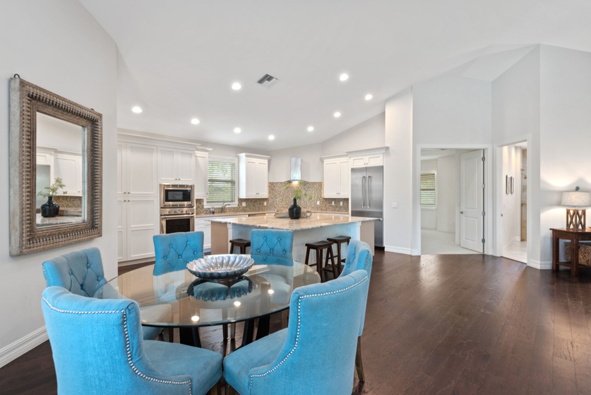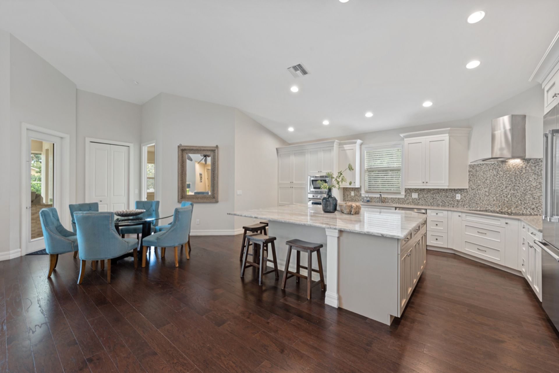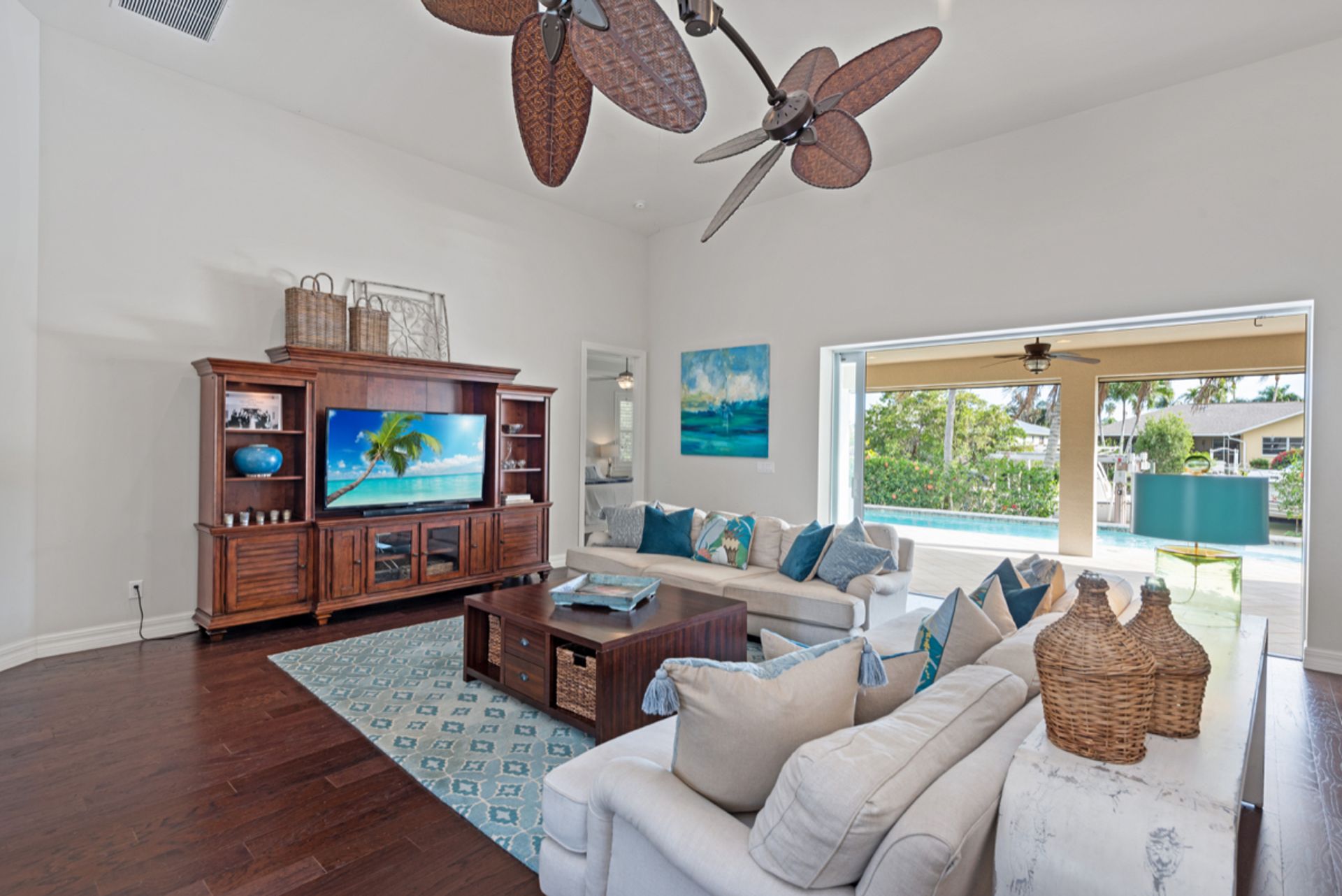 Enjoy the Naples lifestyle, within minutes to downtown out the front door and keeping your boat on the 12k lift out back with no bridges out to the Gulf of Mexico. Built in 2015, this home offers over 3,000 square feet, four bedrooms, four baths, a heated saltwater pool and a spa. The gourmet kitchen is perfect for entertaining with an oversized island and Thermador appliances and features 18' ceilings in the great room with water views. Some of the home's upgrades include quartz and granite counters, high-end cabinetry, vanities, tile showers, wood floors, built-in outdoor grill and fireplace, power retracting screens, impact windows and doors, plantation shutters, mature landscape and custom closet systems throughout. There are wonderful pool and canal views from the great room, kitchen, dining, guest and primary rooms.