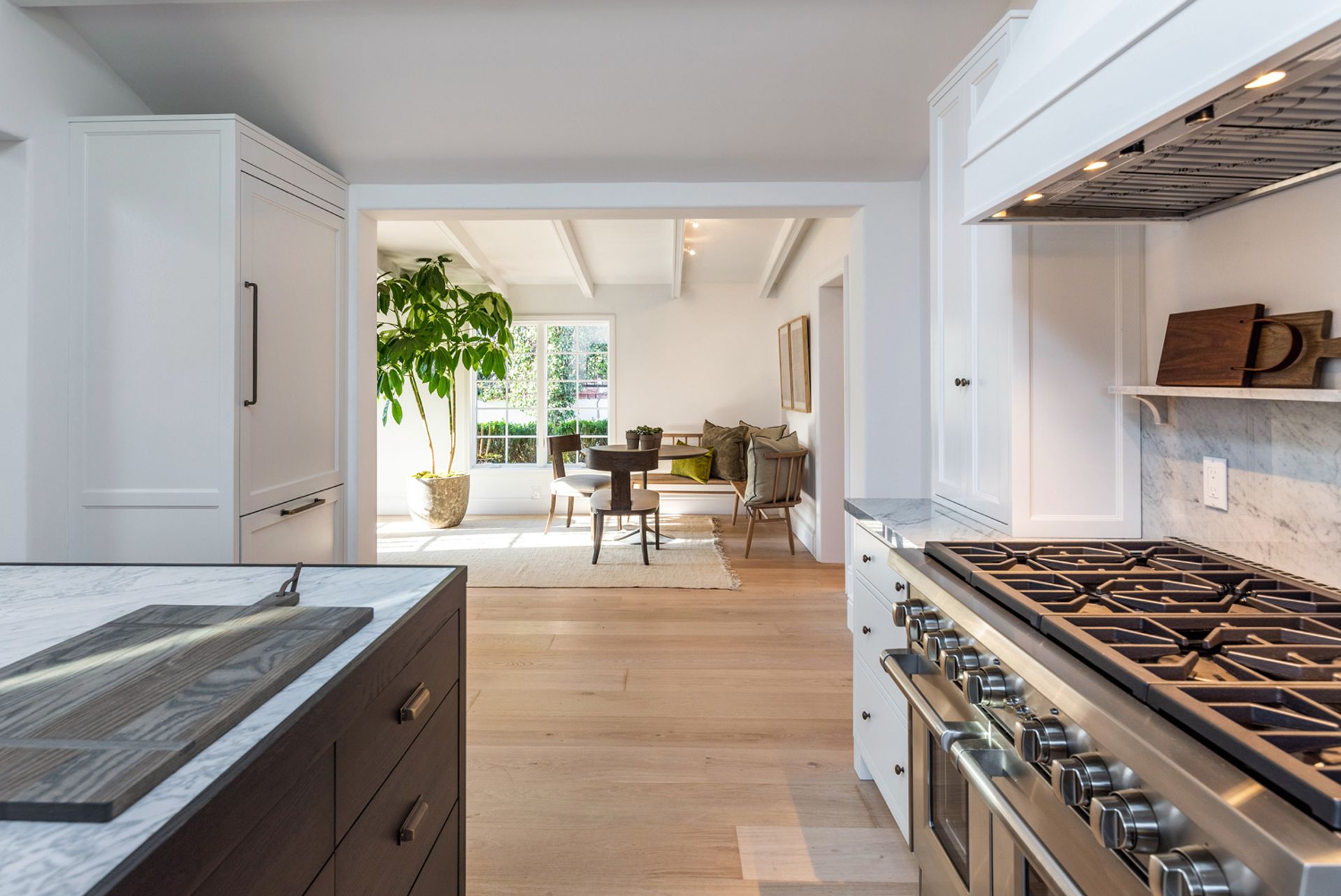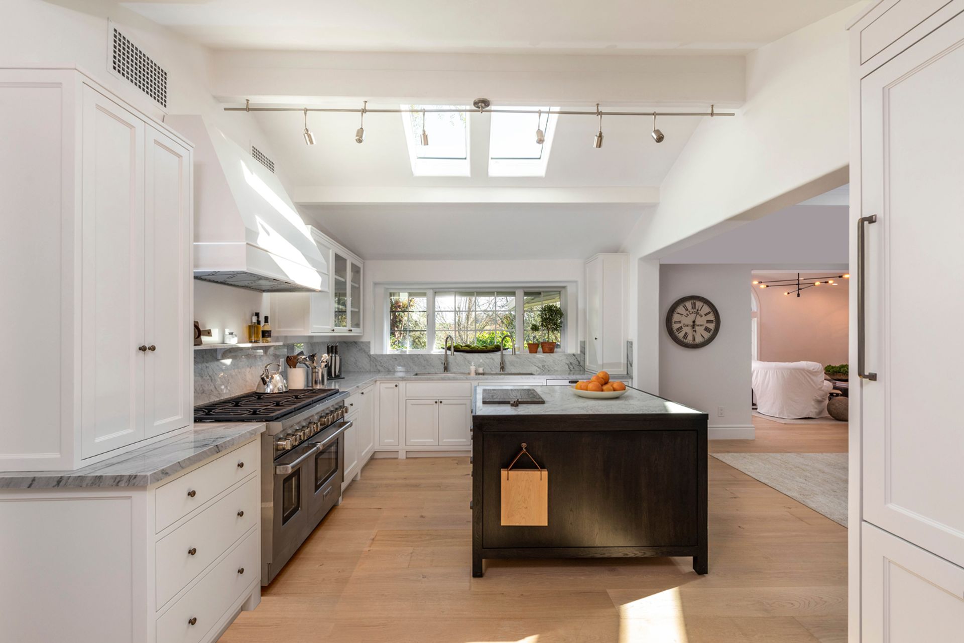 · Kitchen with built-in Frigidaire Professional refrigerator, 5 burner gas range and oven, built-in microwave, Frigidaire dishwasher