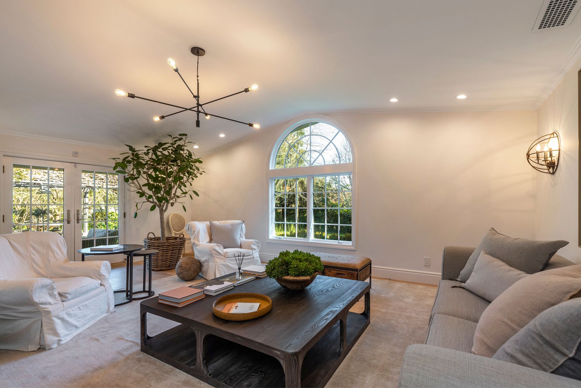 · Formal living room has arched window, fireplace with stone mantle and raised hearth, vaulted ceiling