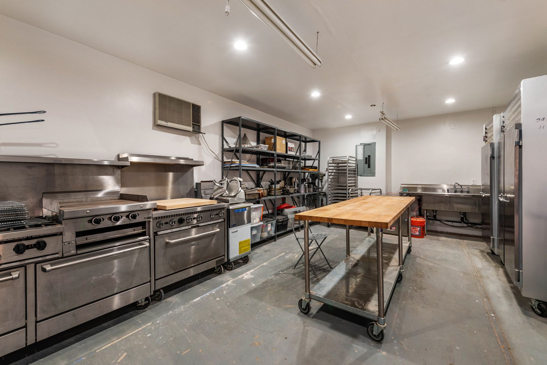 · Movable industrial kitchen appliances include Black Diamond gas range, w/double ovens, Sunfire gas range w/ double ovens, Traulsen refrigerator/freezer, sink