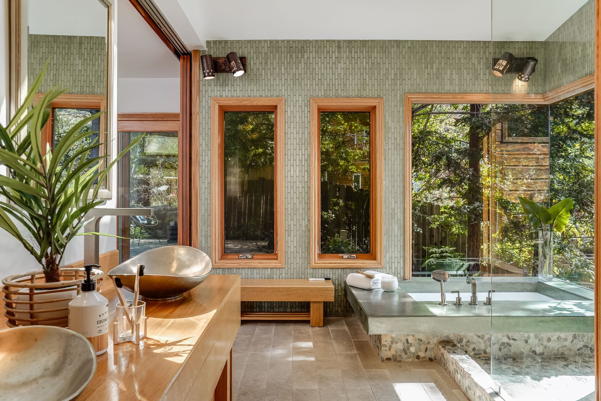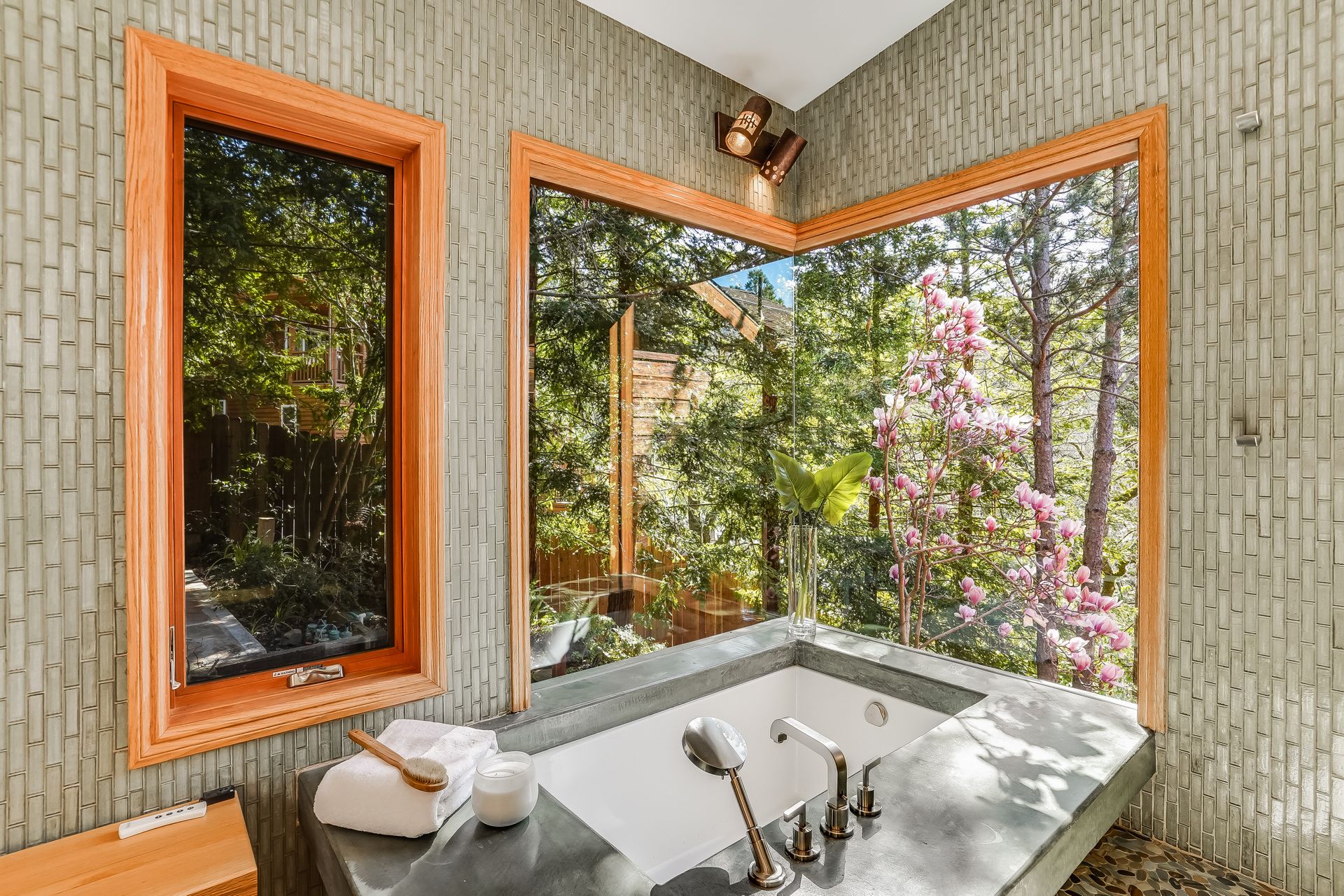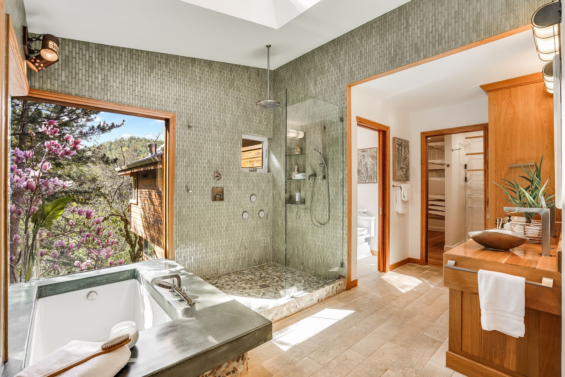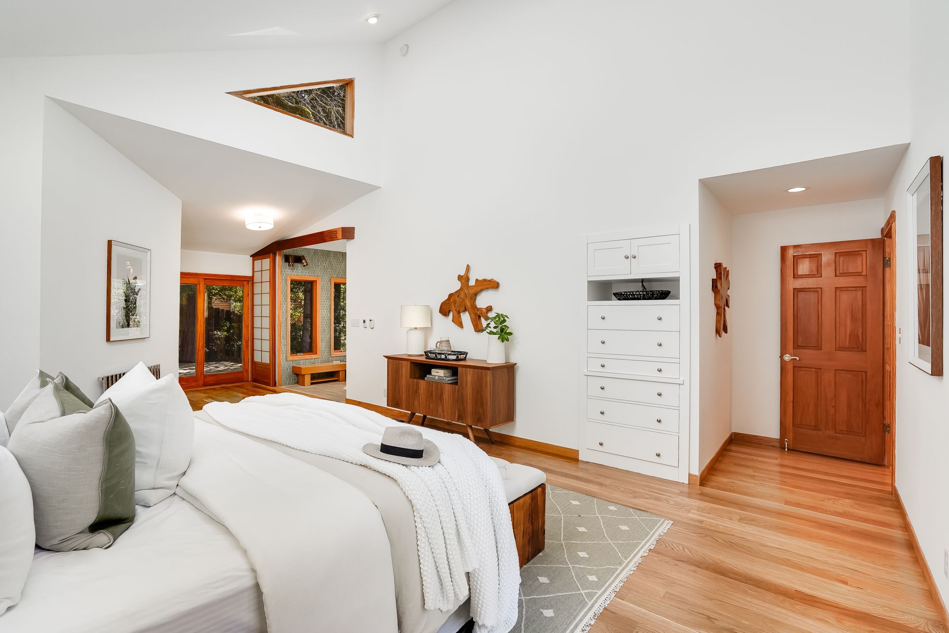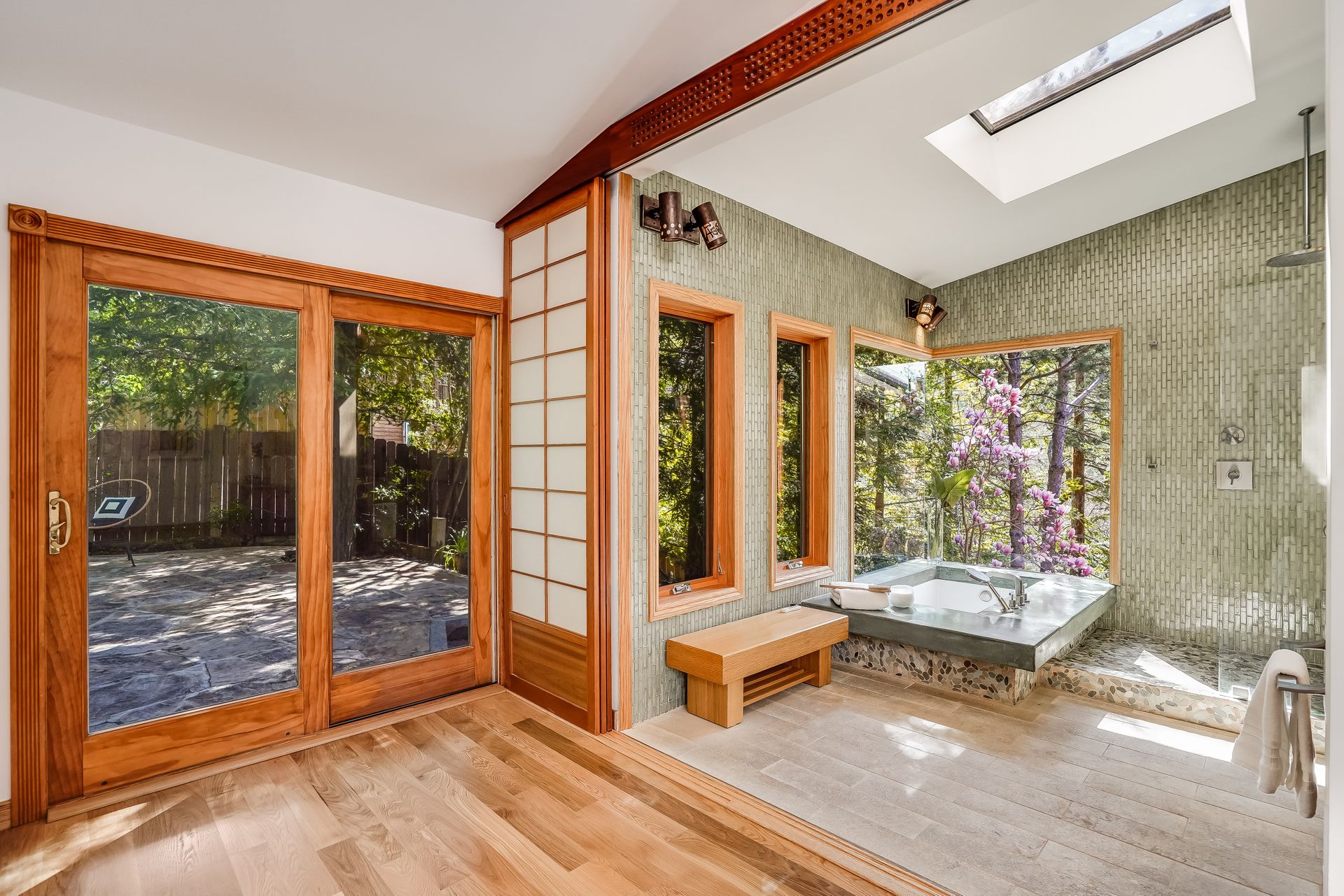 The primary suite is a true retreat. Located on the main living level, it is ample in size with natural light flooding from both the large skylight & sliders, which open onto two separate patios. The Balinese bath emits zen vibes with hand-built soaking tub overlooking blooming magnolia trees. Rain shower with pebbled floor, radiant heating and large walk-in closet complete this spa-like oasis.