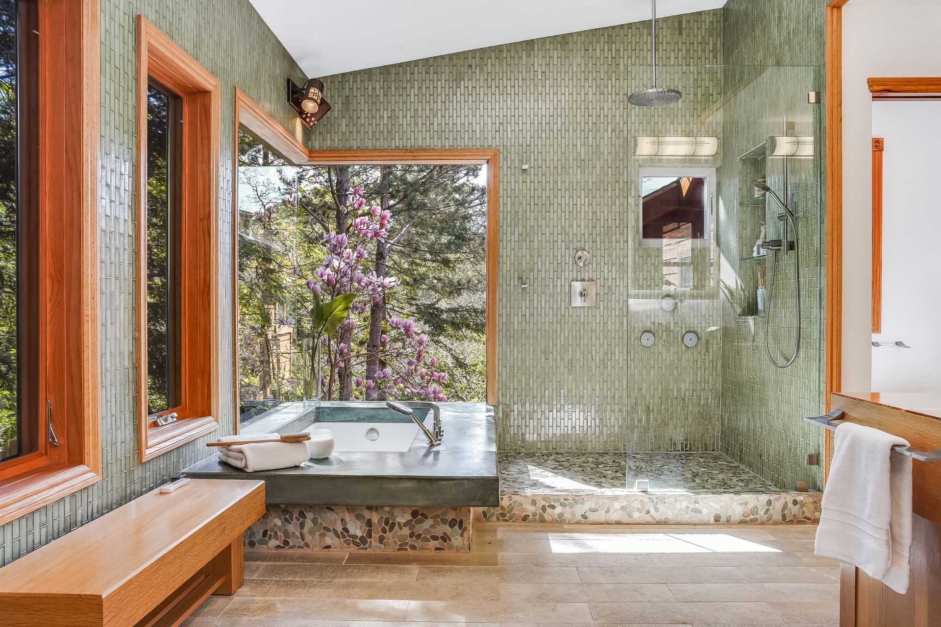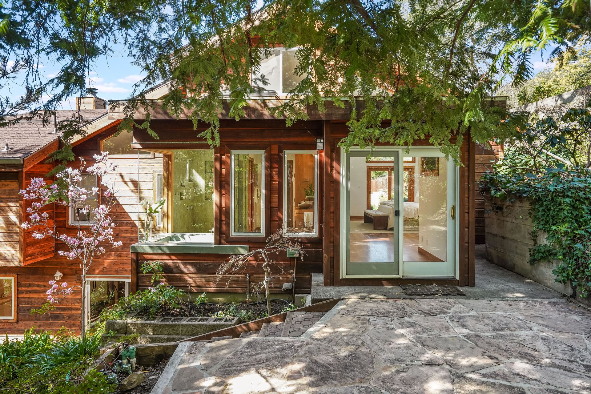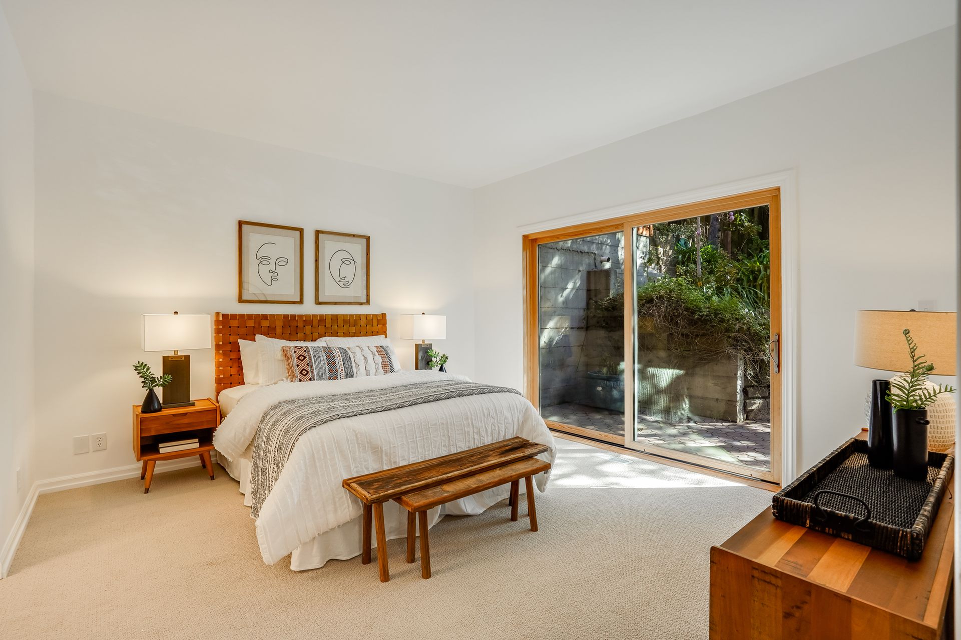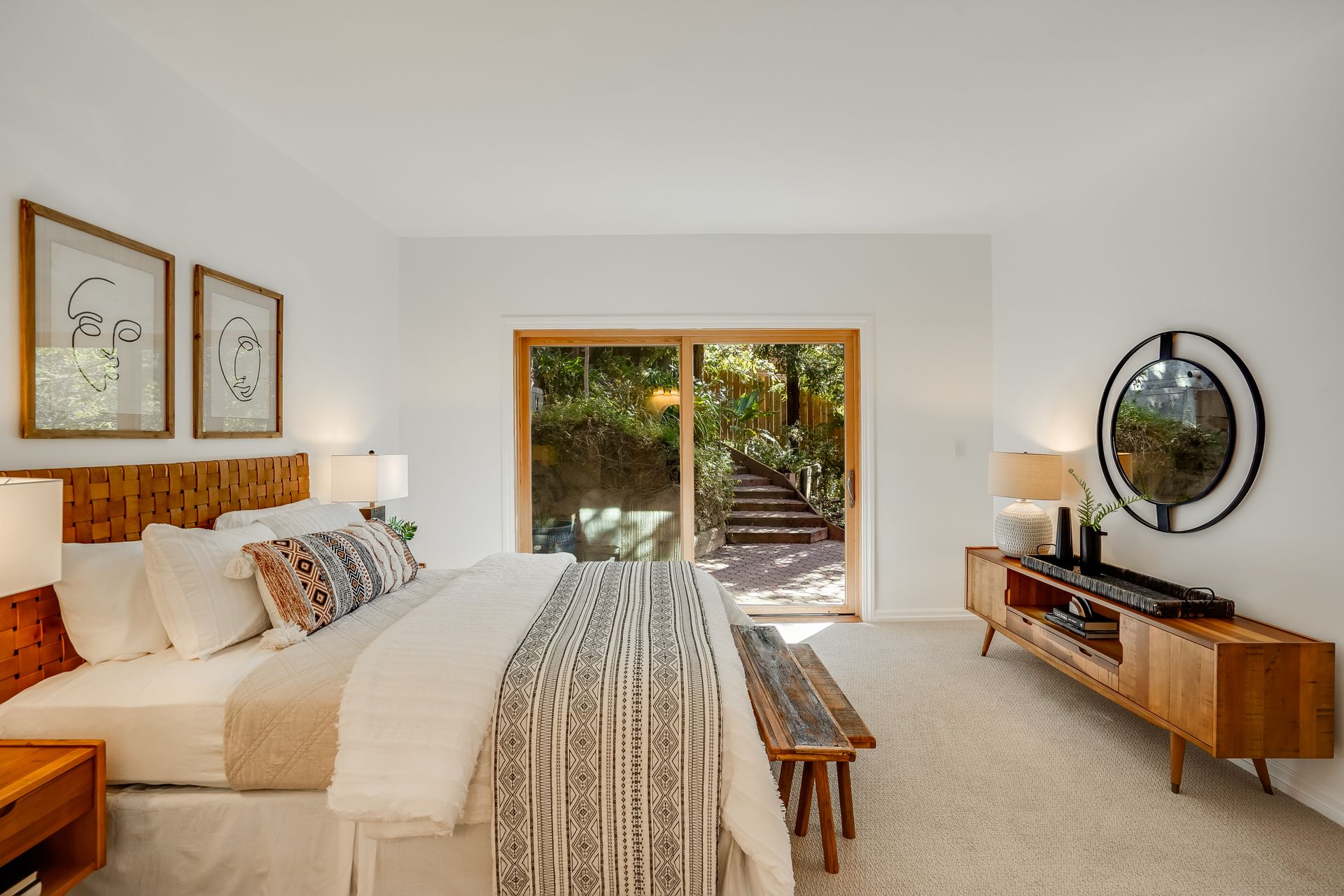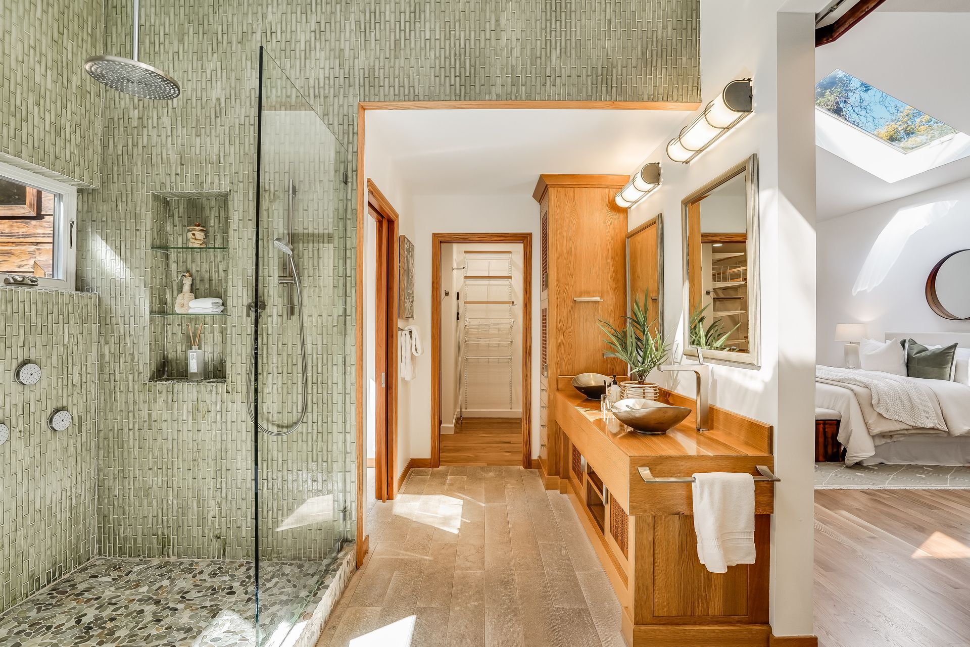 The primary suite is a true retreat. Located on the main living level, it is ample in size with natural light flooding from both the large skylight & sliders, which open onto two separate patios. The Balinese bath emits zen vibes with hand-built soaking tub overlooking blooming magnolia trees. Rain shower with pebbled floor, radiant heating and large walk-in closet complete this spa-like oasis.