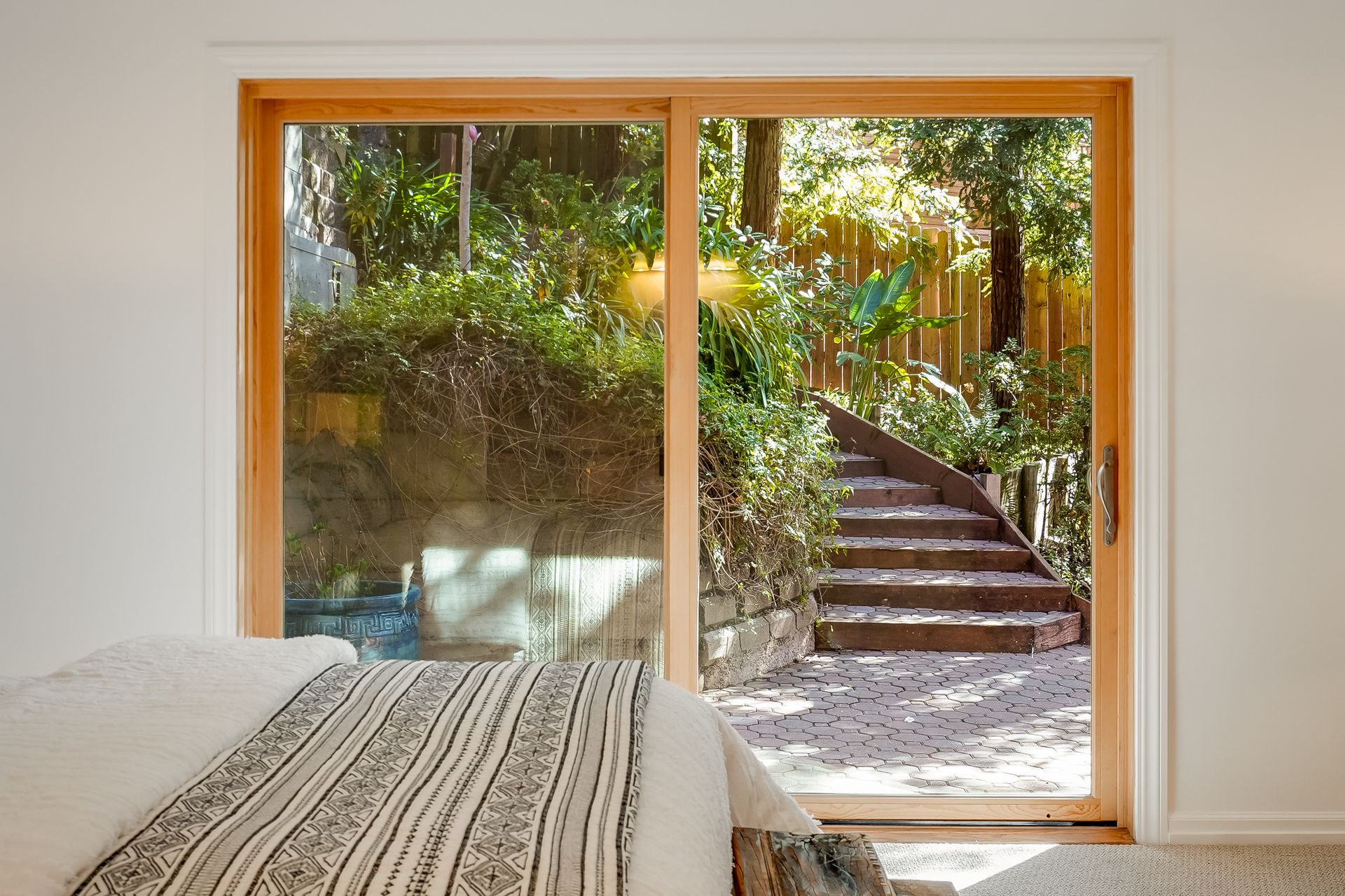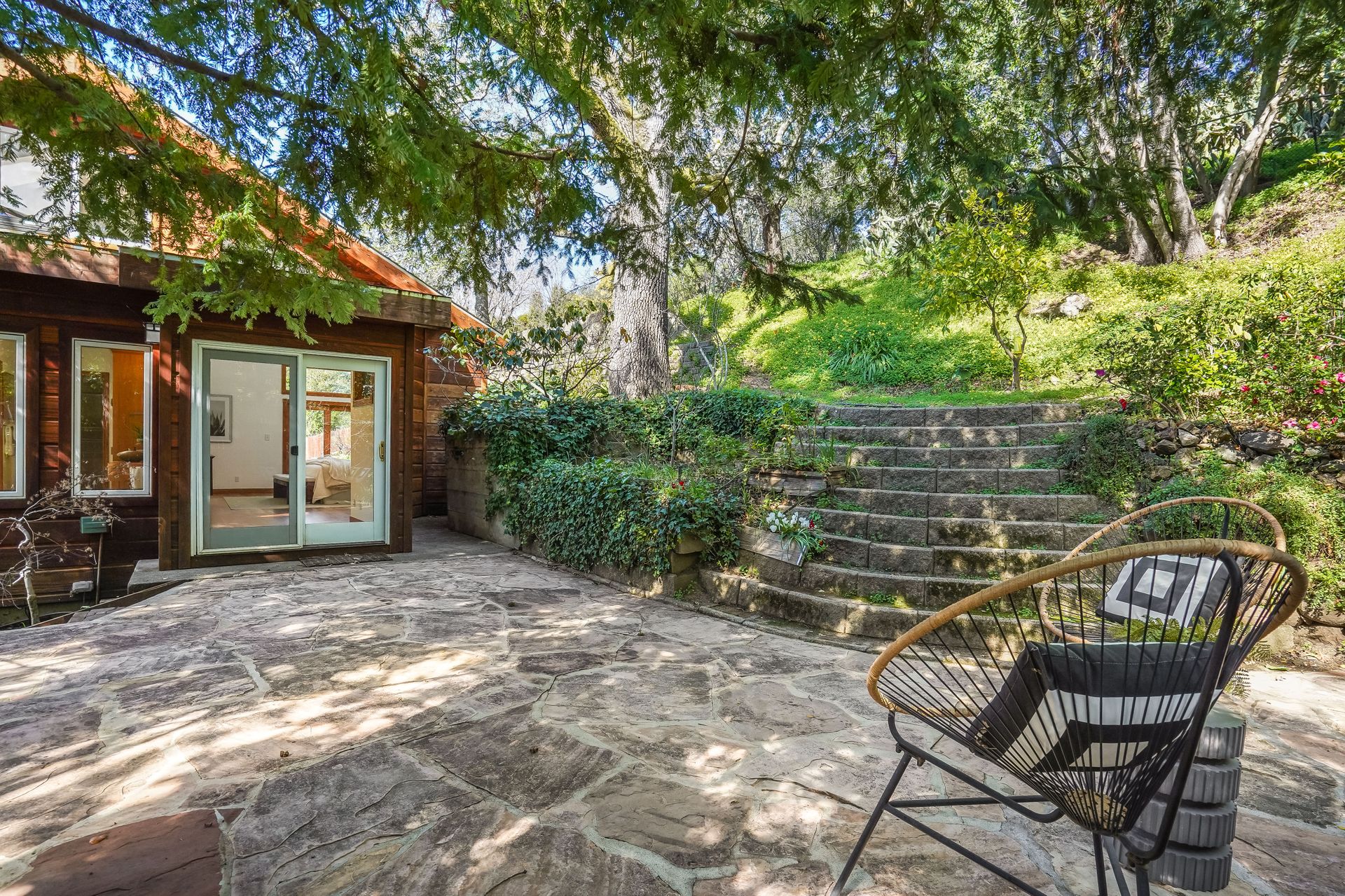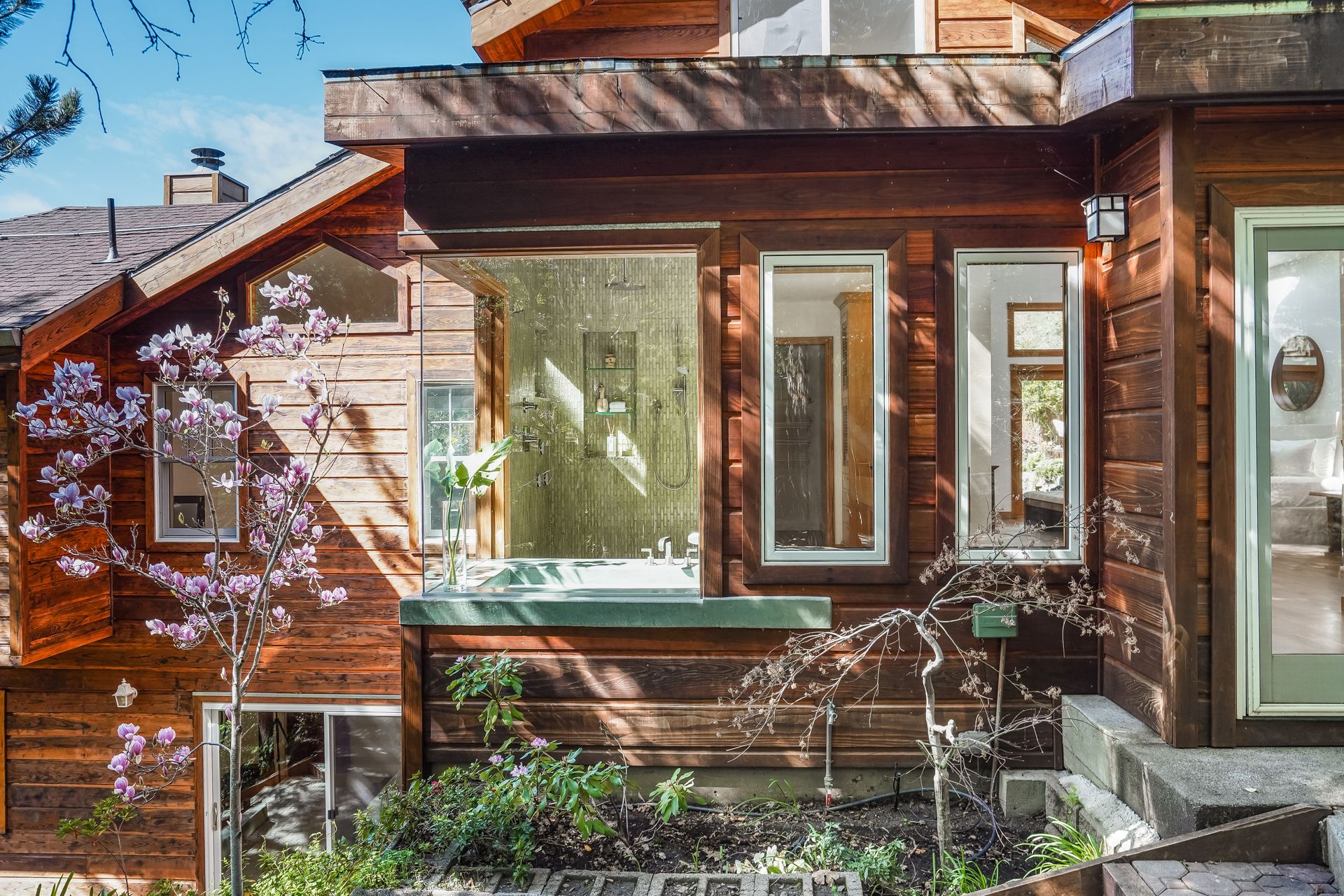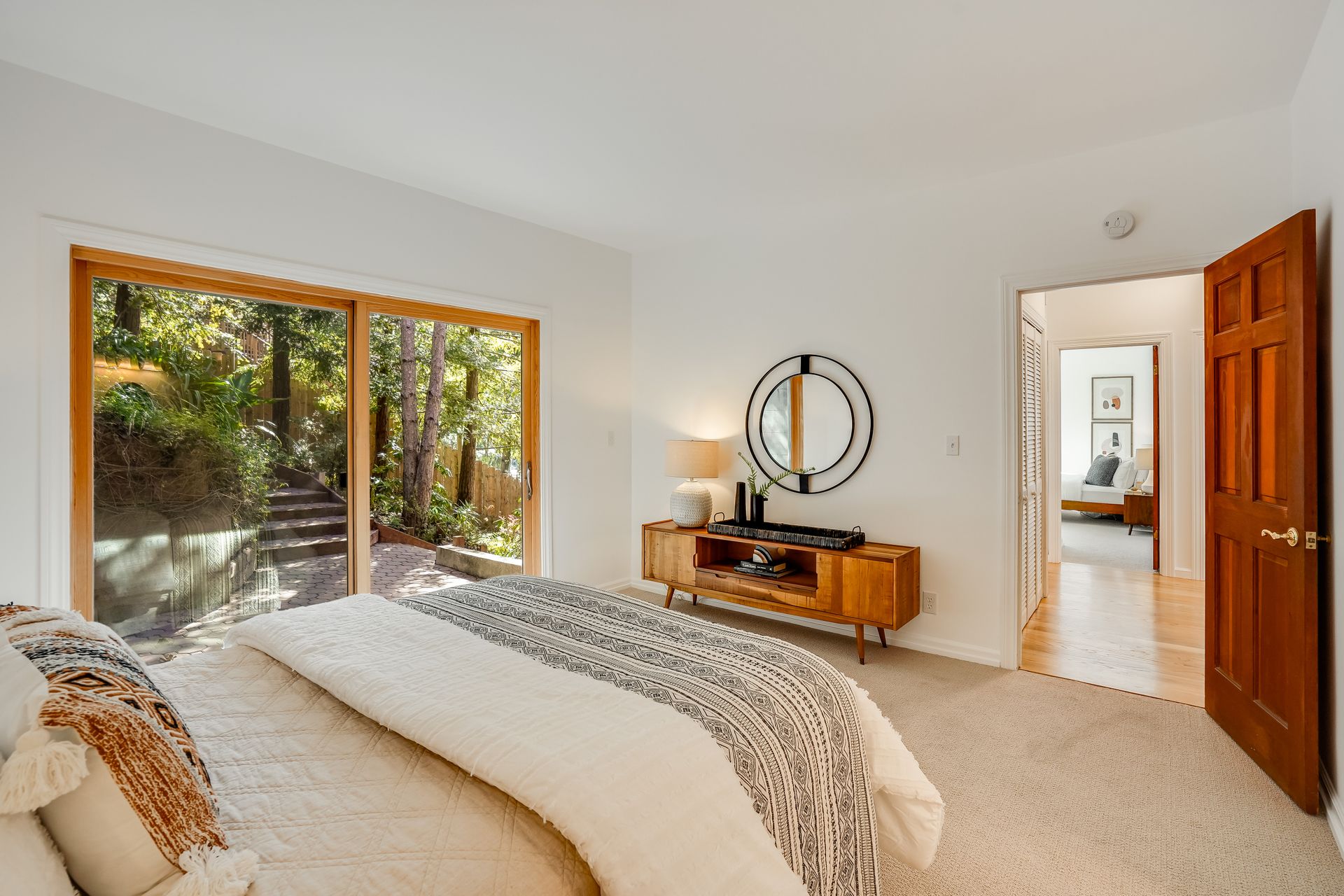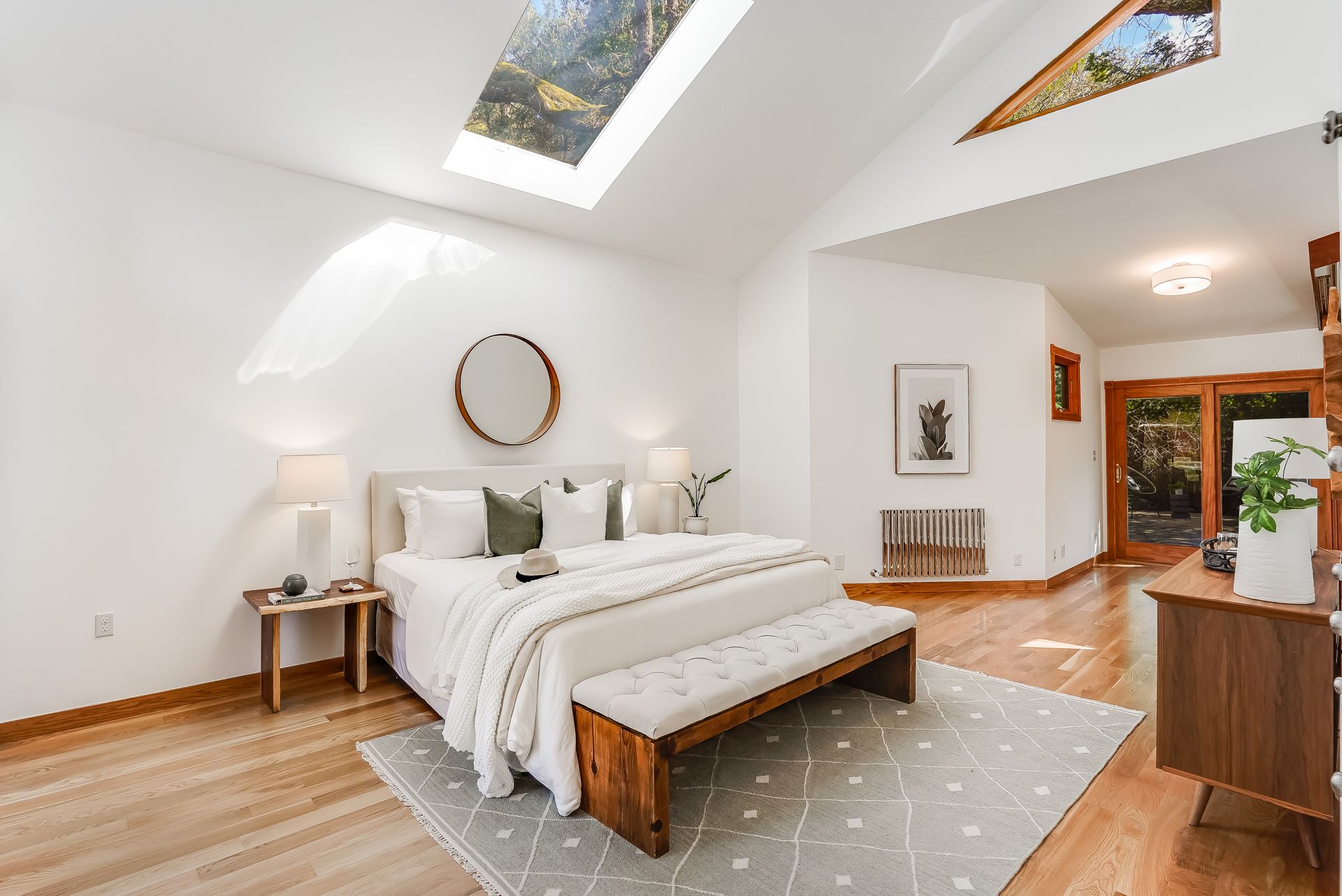 The primary suite is a true retreat. Located on the main living level, it is ample in size with natural light flooding from both the large skylight & sliders, which open onto two separate patios. The Balinese bath emits zen vibes with hand-built soaking tub overlooking blooming magnolia trees. Rain shower with pebbled floor, radiant heating and large walk-in closet complete this spa-like oasis.