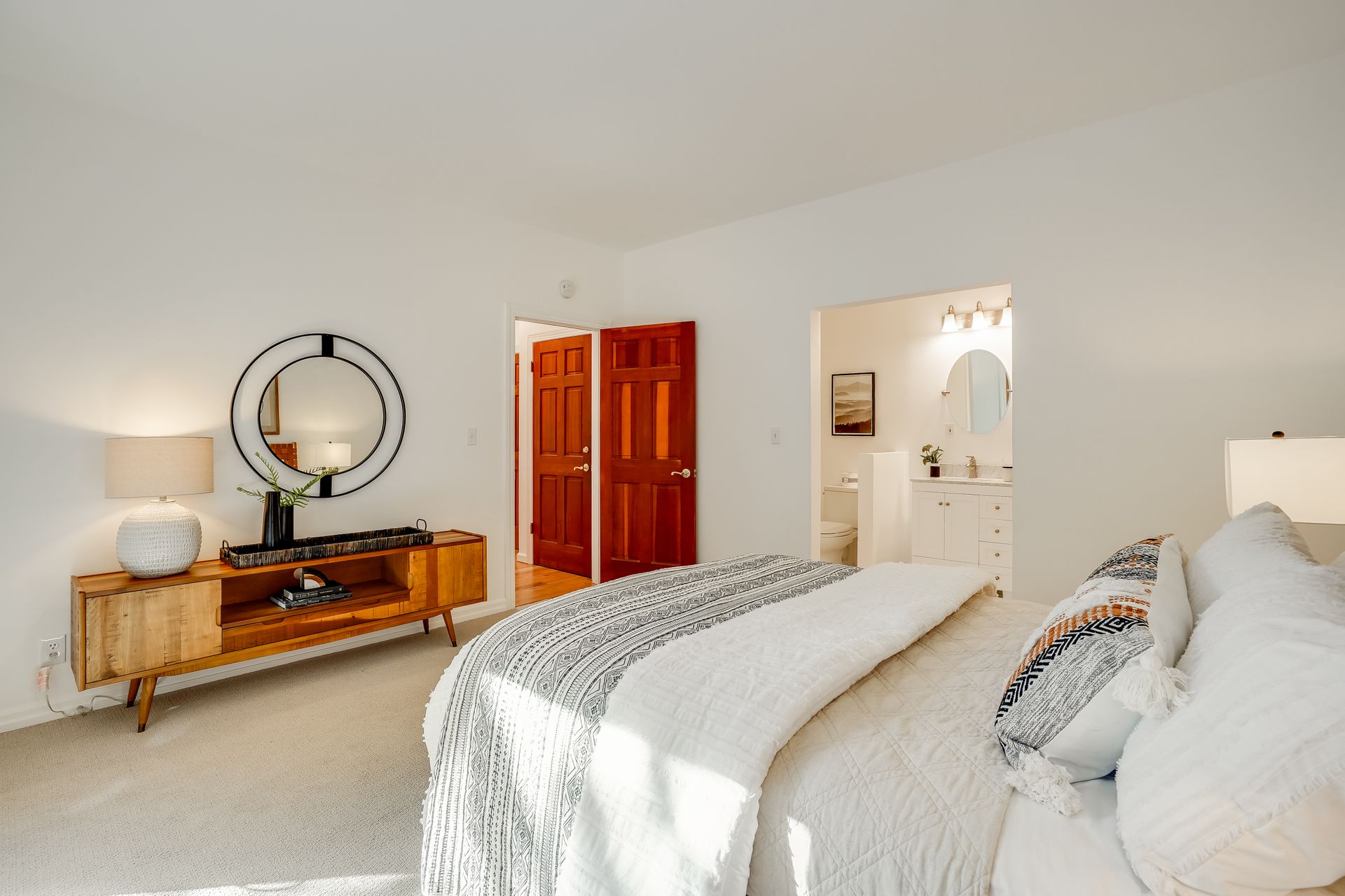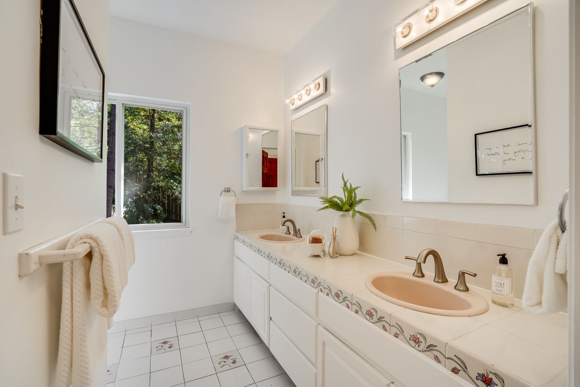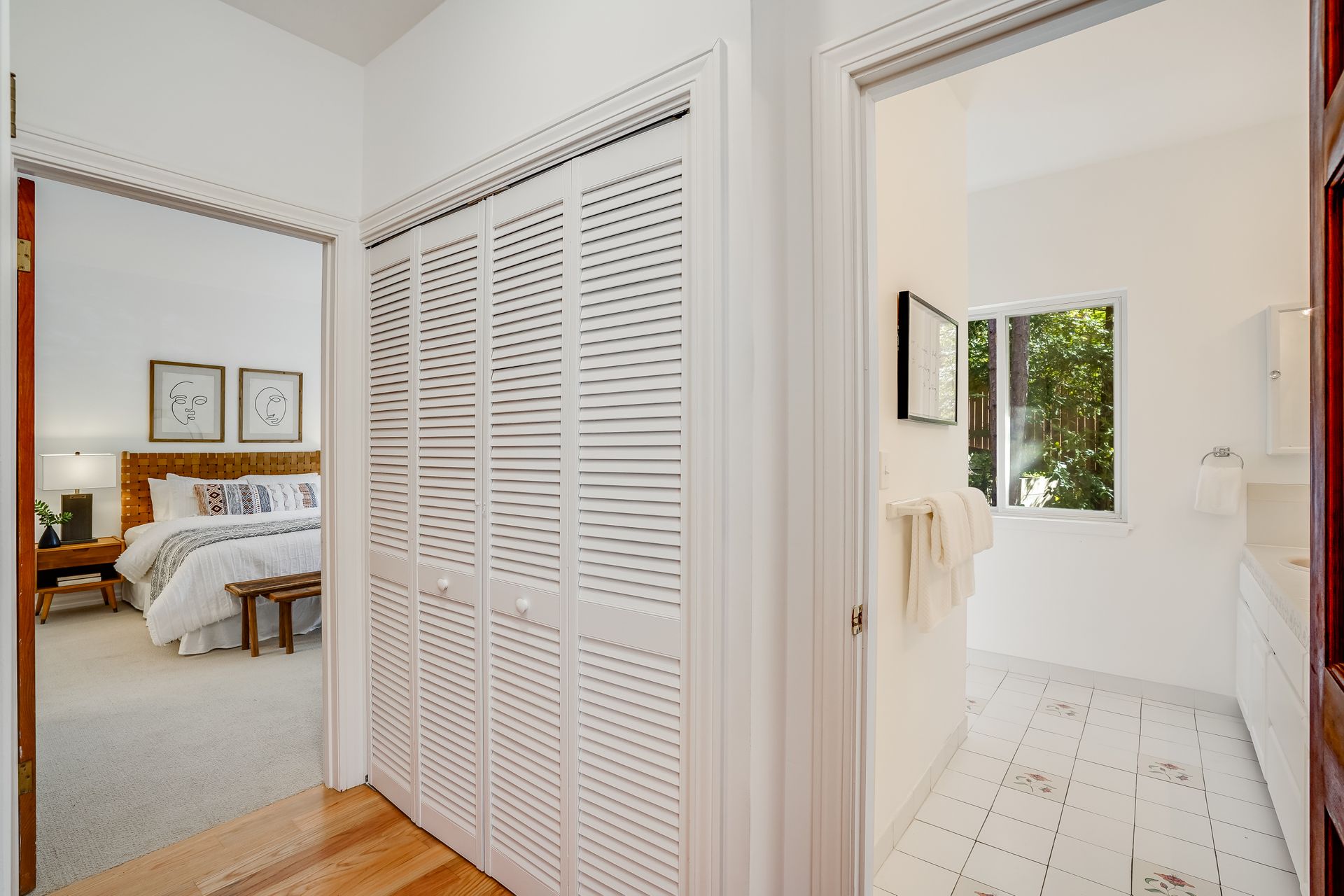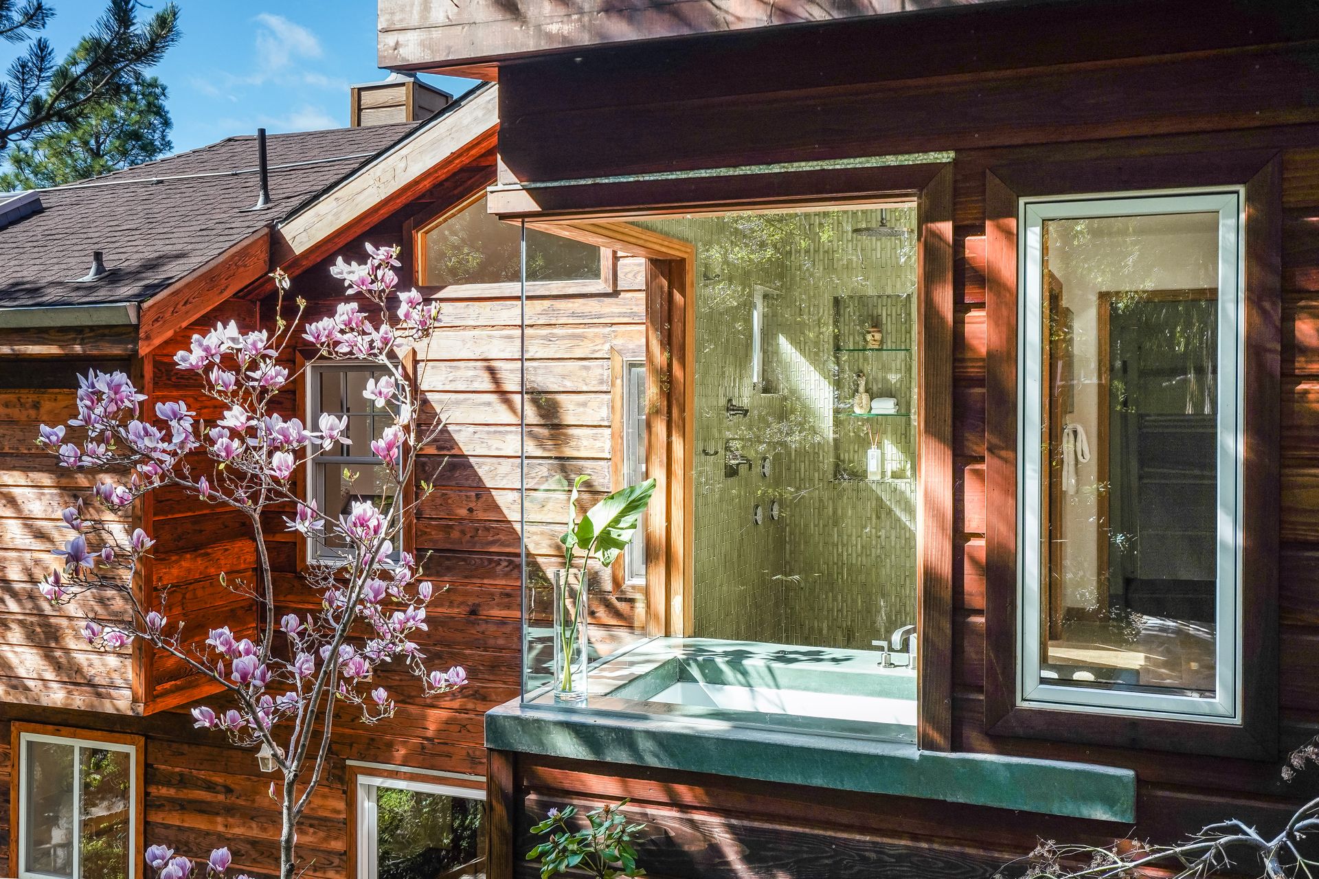 The primary suite is a true retreat. Located on the main living level, it is ample in size with natural light flooding from both the large skylight & sliders, which open onto two separate patios. The Balinese bath emits zen vibes with hand-built soaking tub overlooking blooming magnolia trees. Rain shower with pebbled floor, radiant heating and large walk-in closet complete this spa-like oasis.