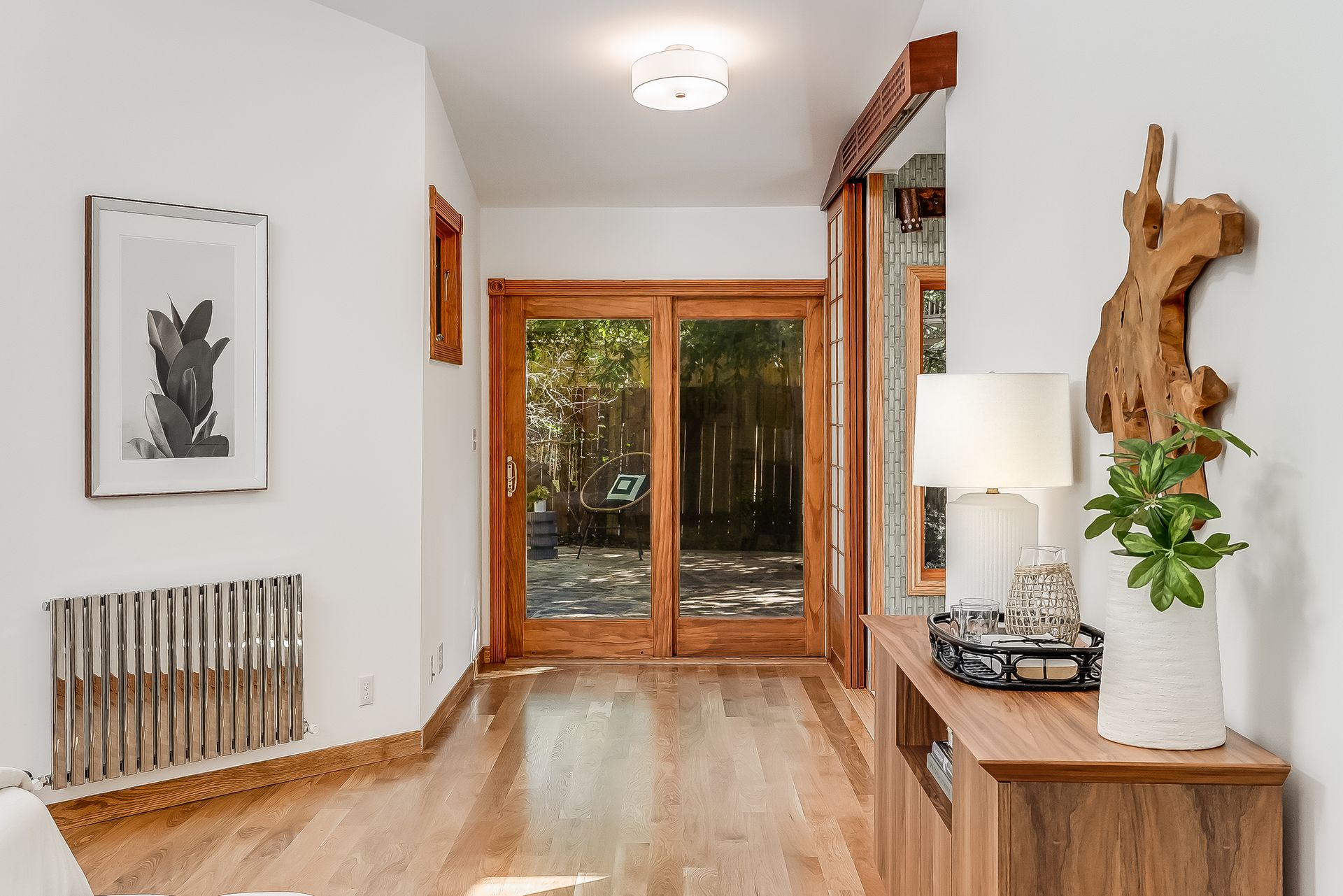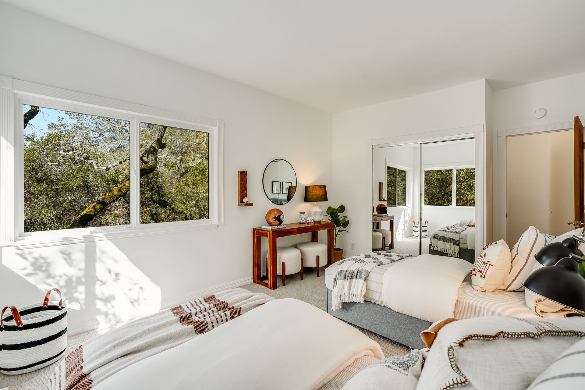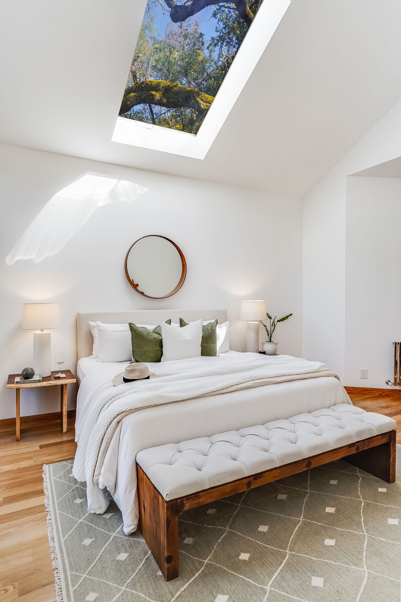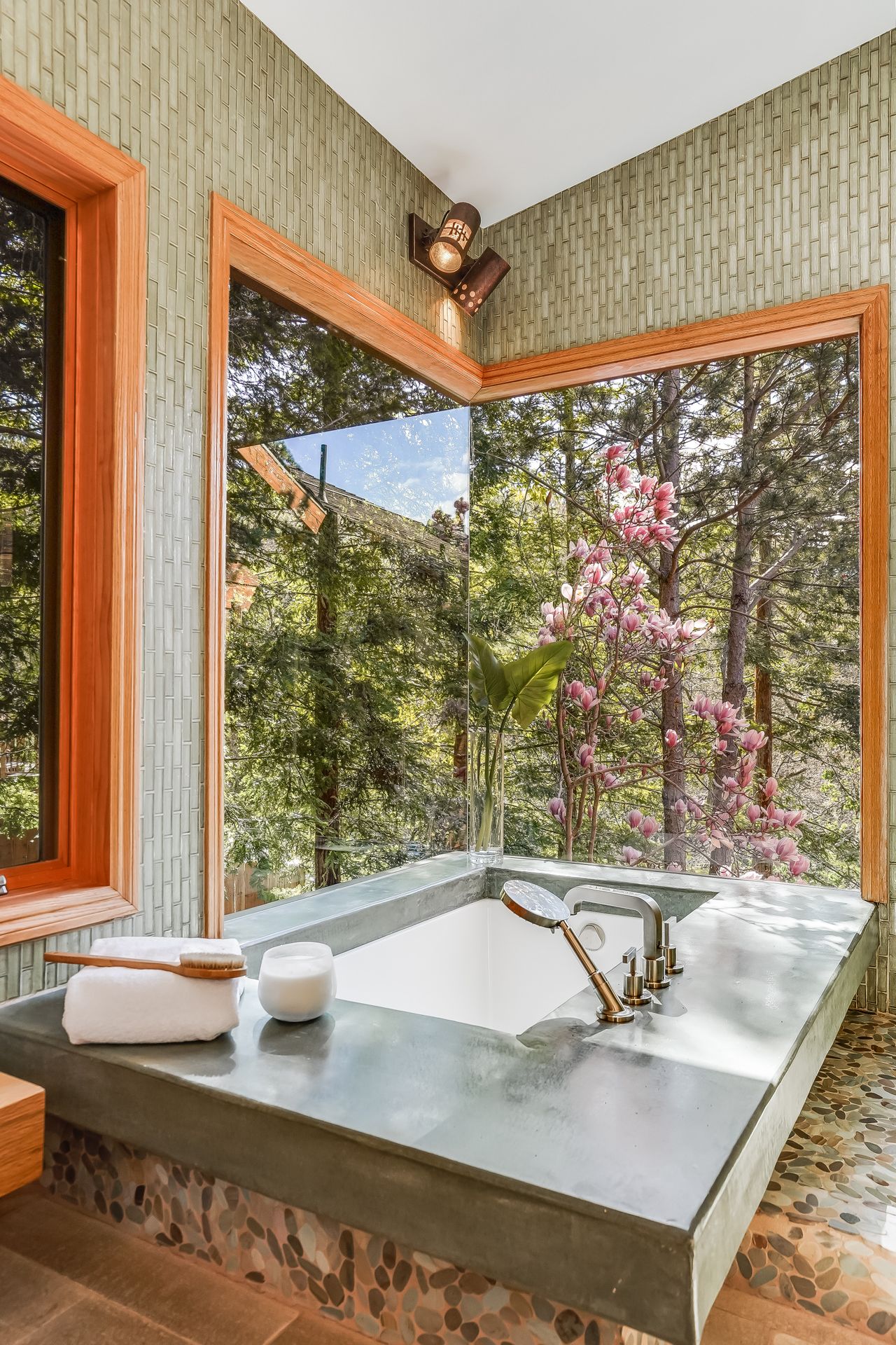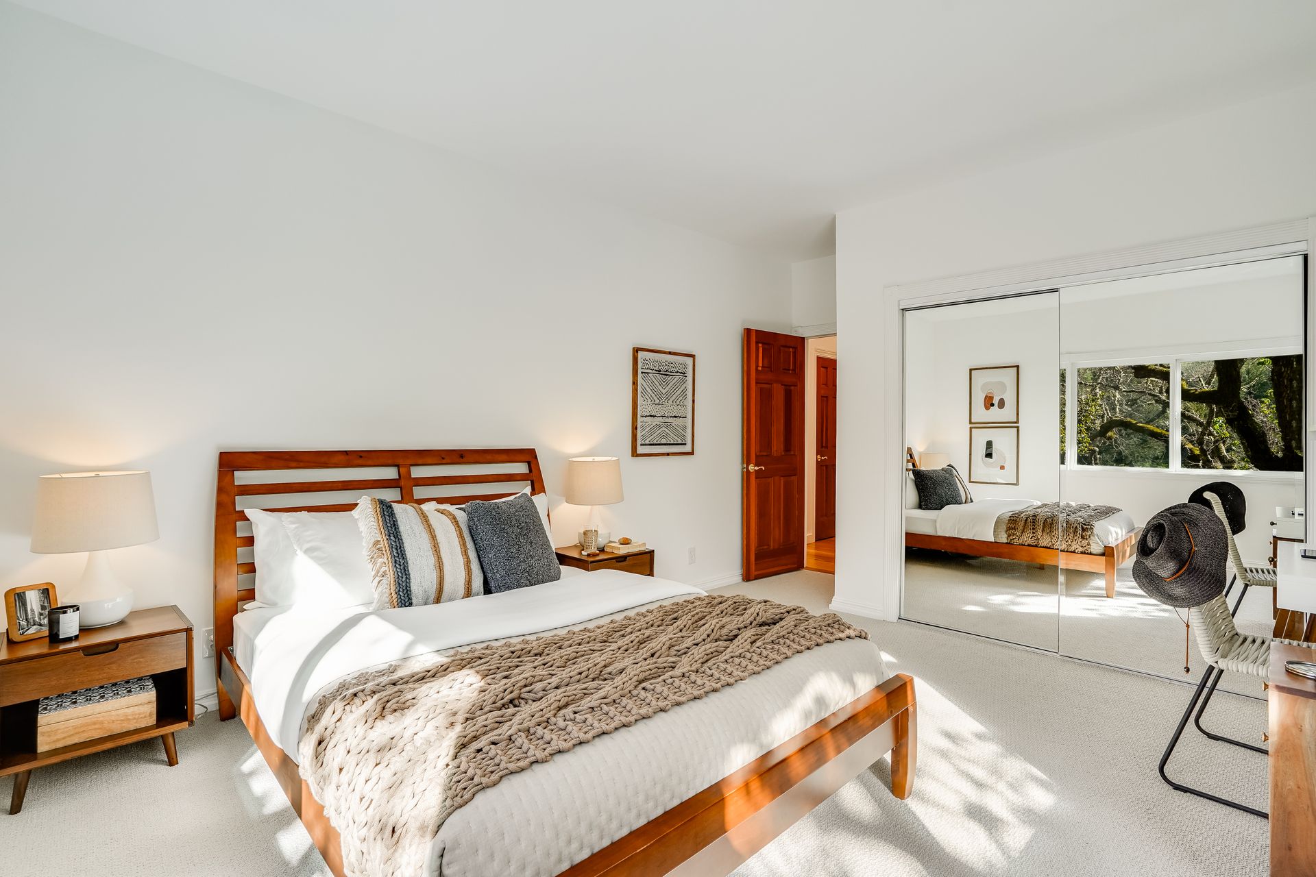 The primary suite is a true retreat. Located on the main living level, it is ample in size with natural light flooding from both the large skylight & sliders, which open onto two separate patios. The Balinese bath emits zen vibes with hand-built soaking tub overlooking blooming magnolia trees. Rain shower with pebbled floor, radiant heating and large walk-in closet complete this spa-like oasis.