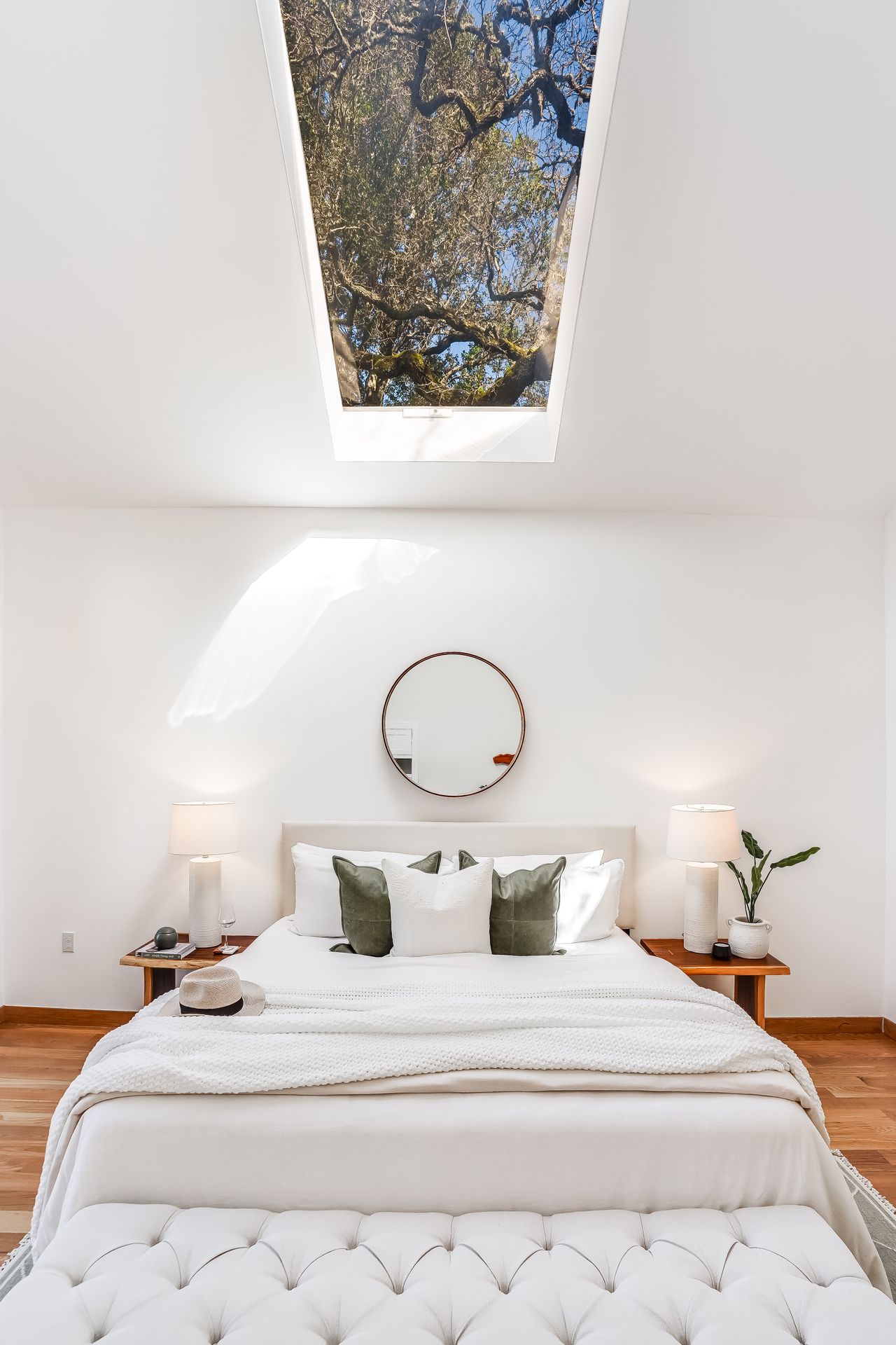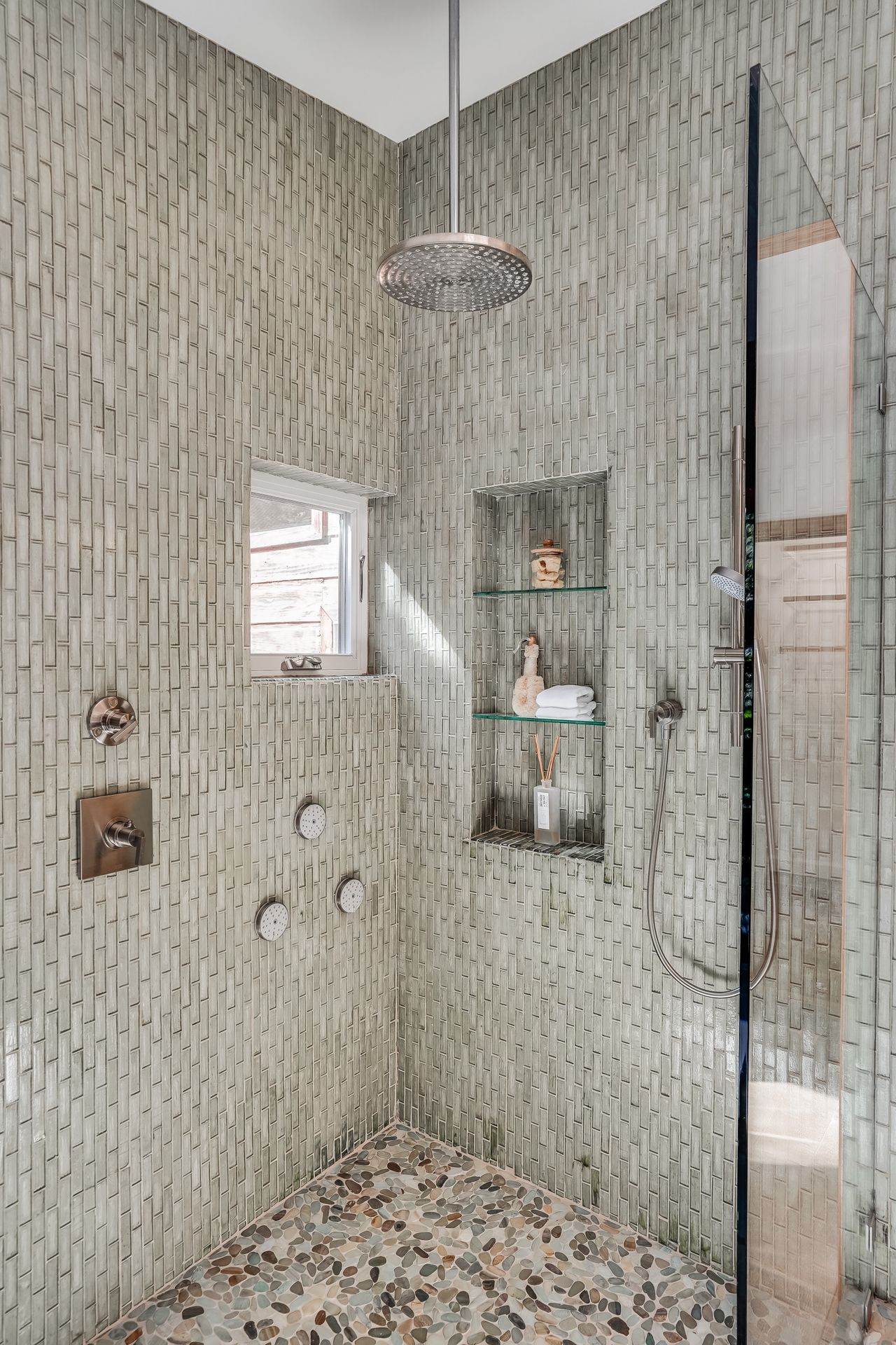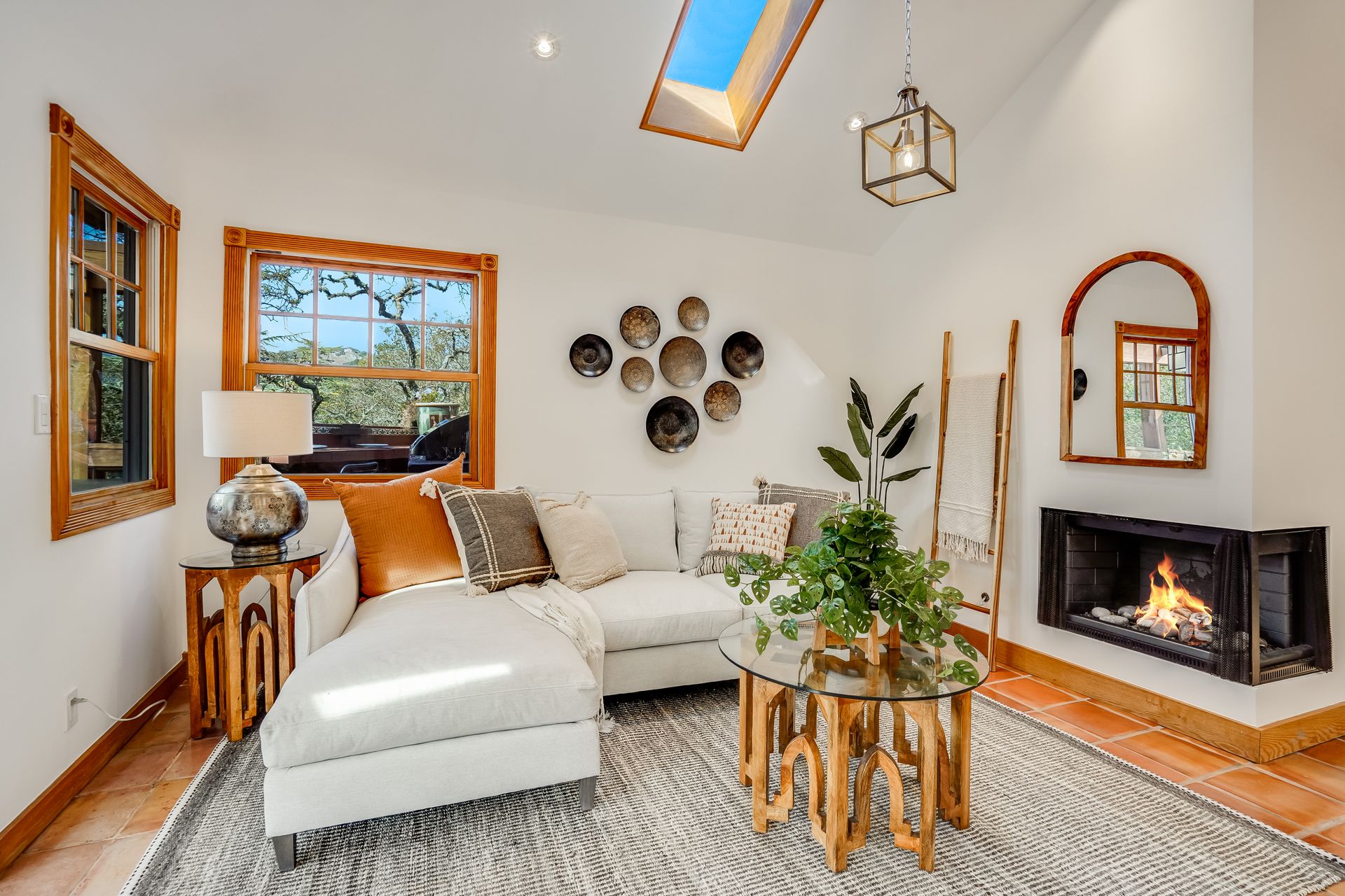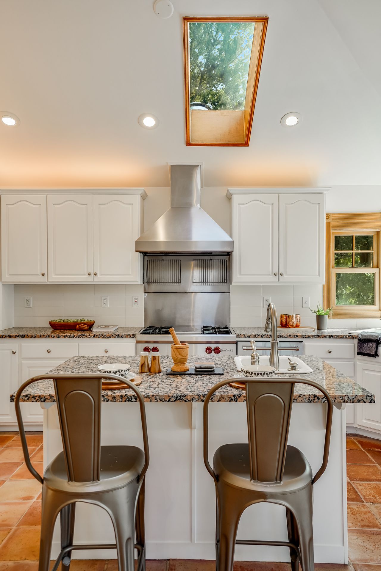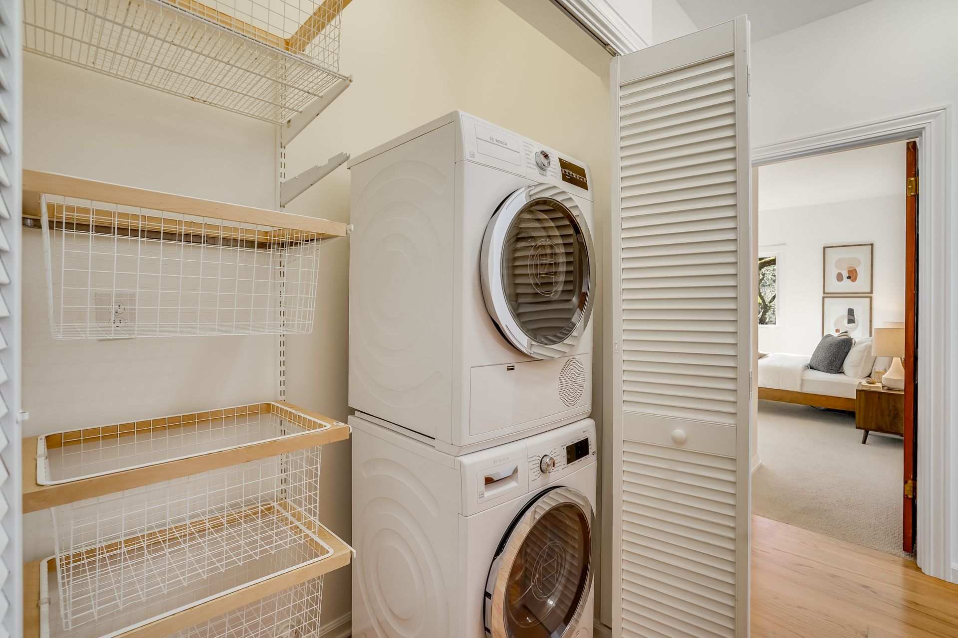 The primary suite is a true retreat. Located on the main living level, it is ample in size with natural light flooding from both the large skylight & sliders, which open onto two separate patios. The Balinese bath emits zen vibes with hand-built soaking tub overlooking blooming magnolia trees. Rain shower with pebbled floor, radiant heating and large walk-in closet complete this spa-like oasis.