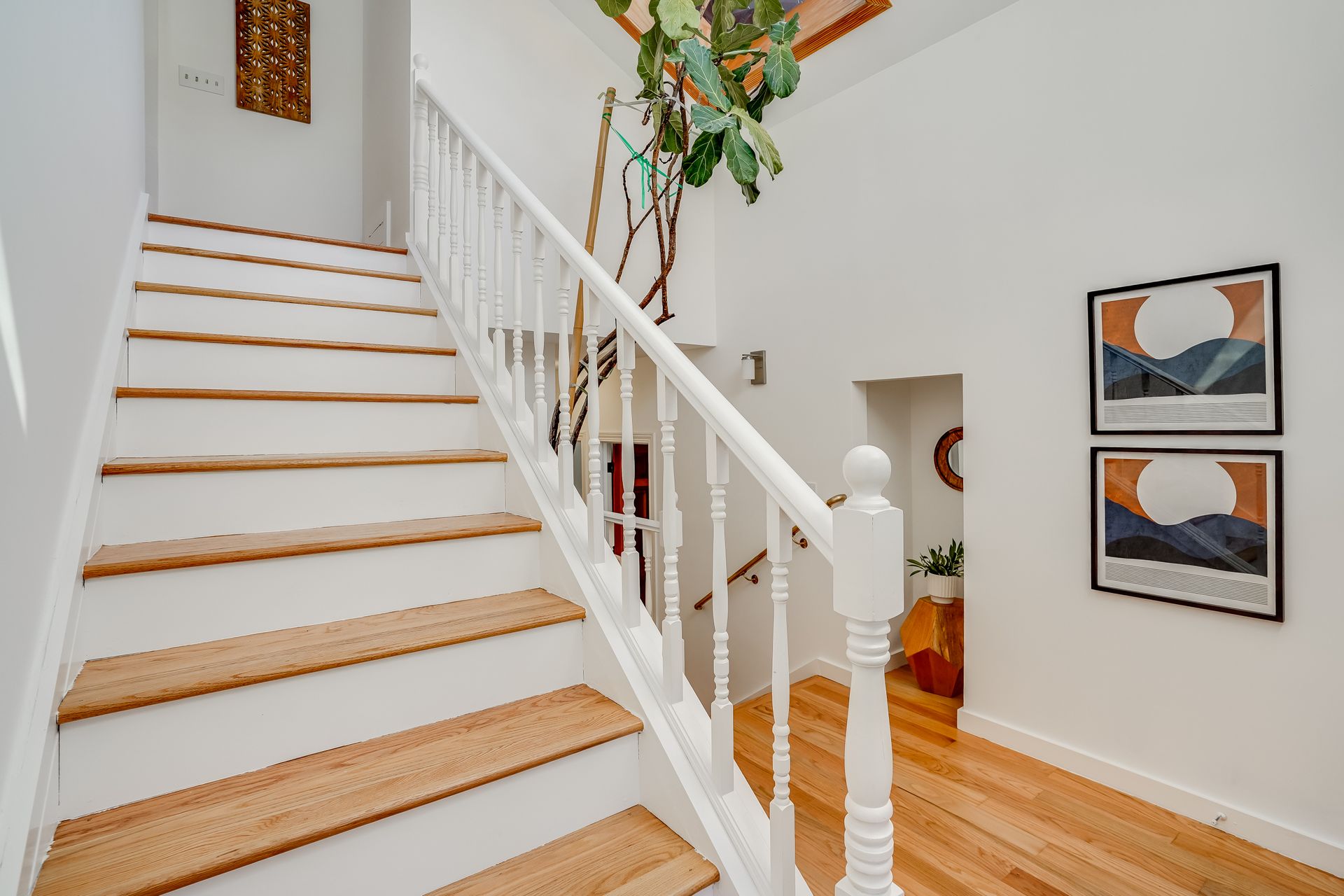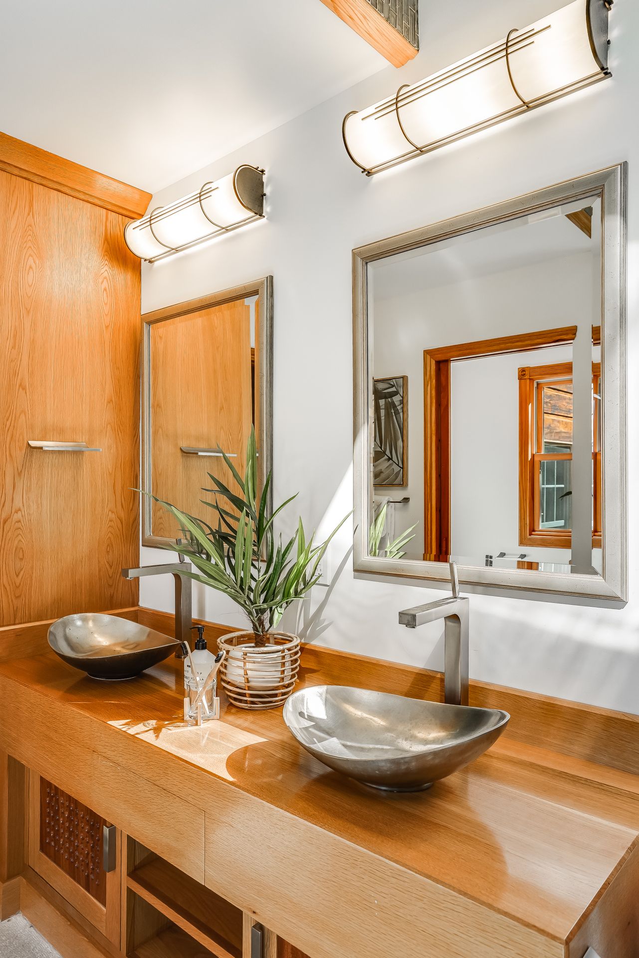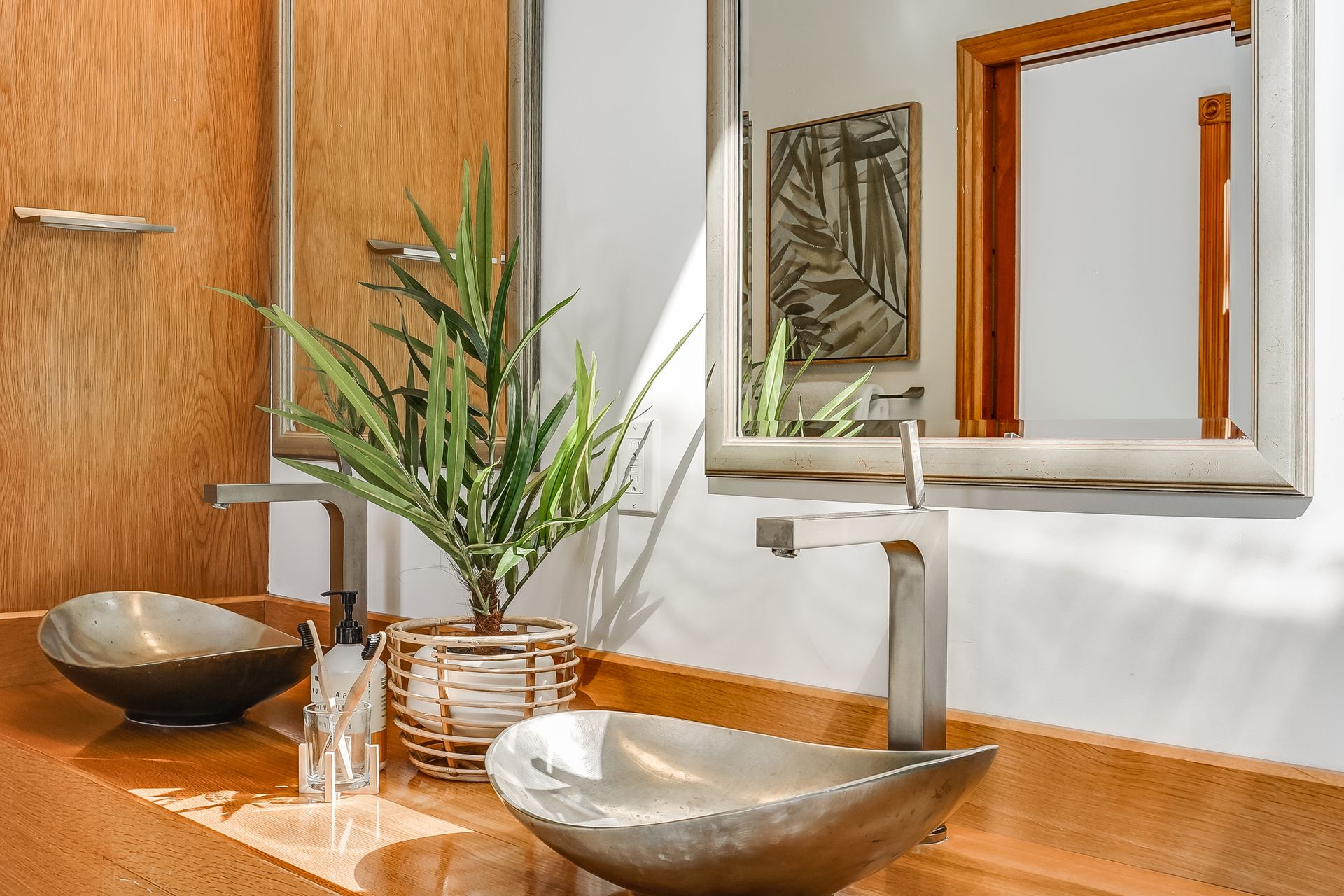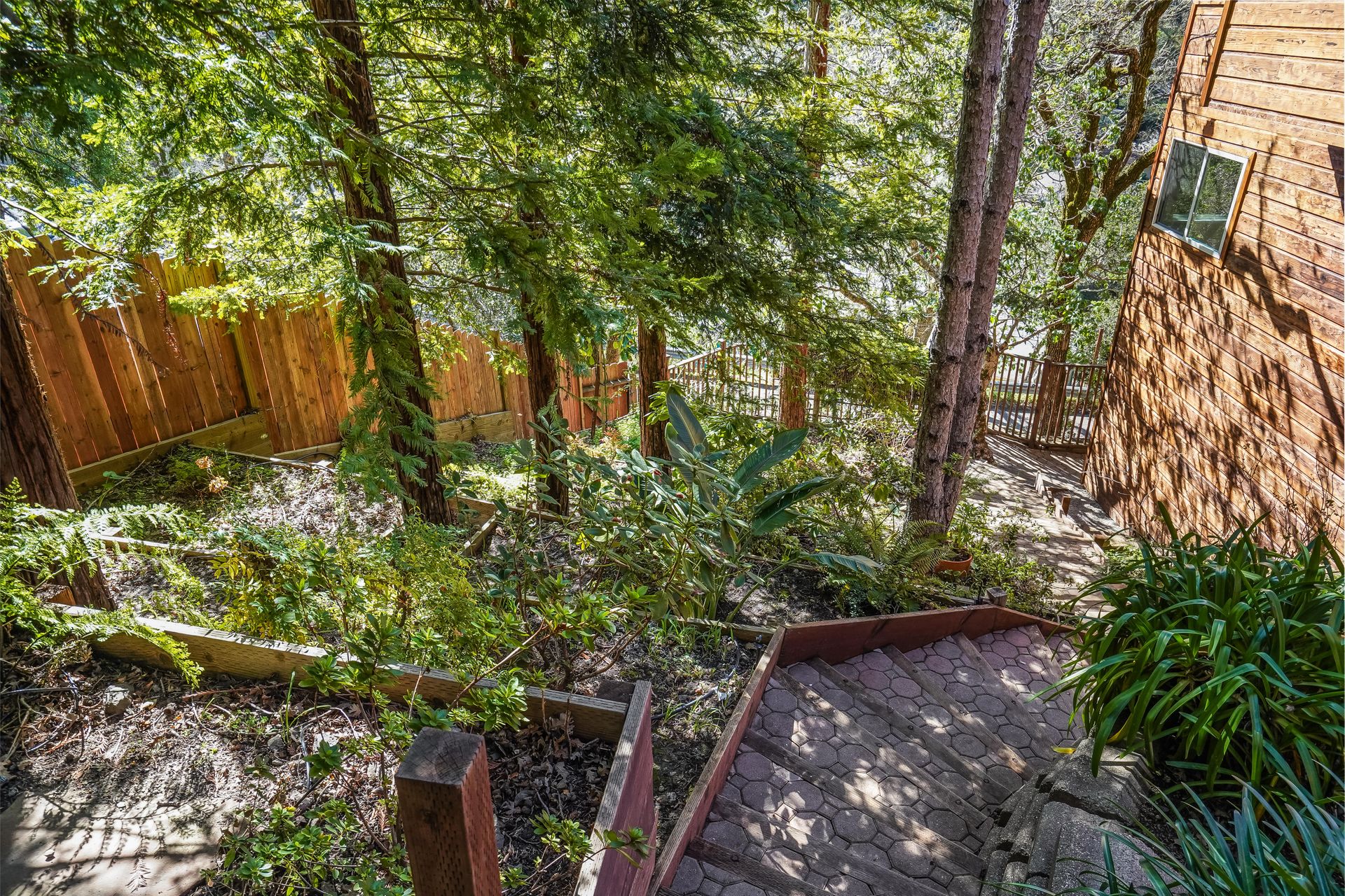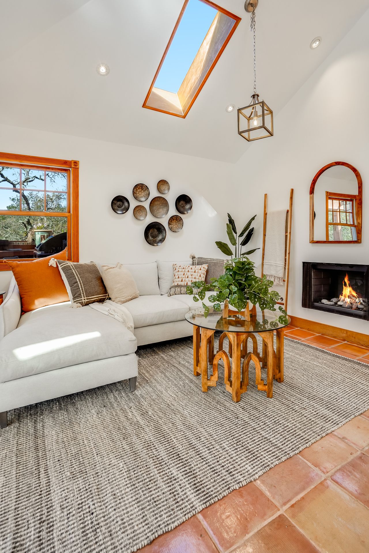 The primary suite is a true retreat. Located on the main living level, it is ample in size with natural light flooding from both the large skylight & sliders, which open onto two separate patios. The Balinese bath emits zen vibes with hand-built soaking tub overlooking blooming magnolia trees. Rain shower with pebbled floor, radiant heating and large walk-in closet complete this spa-like oasis.