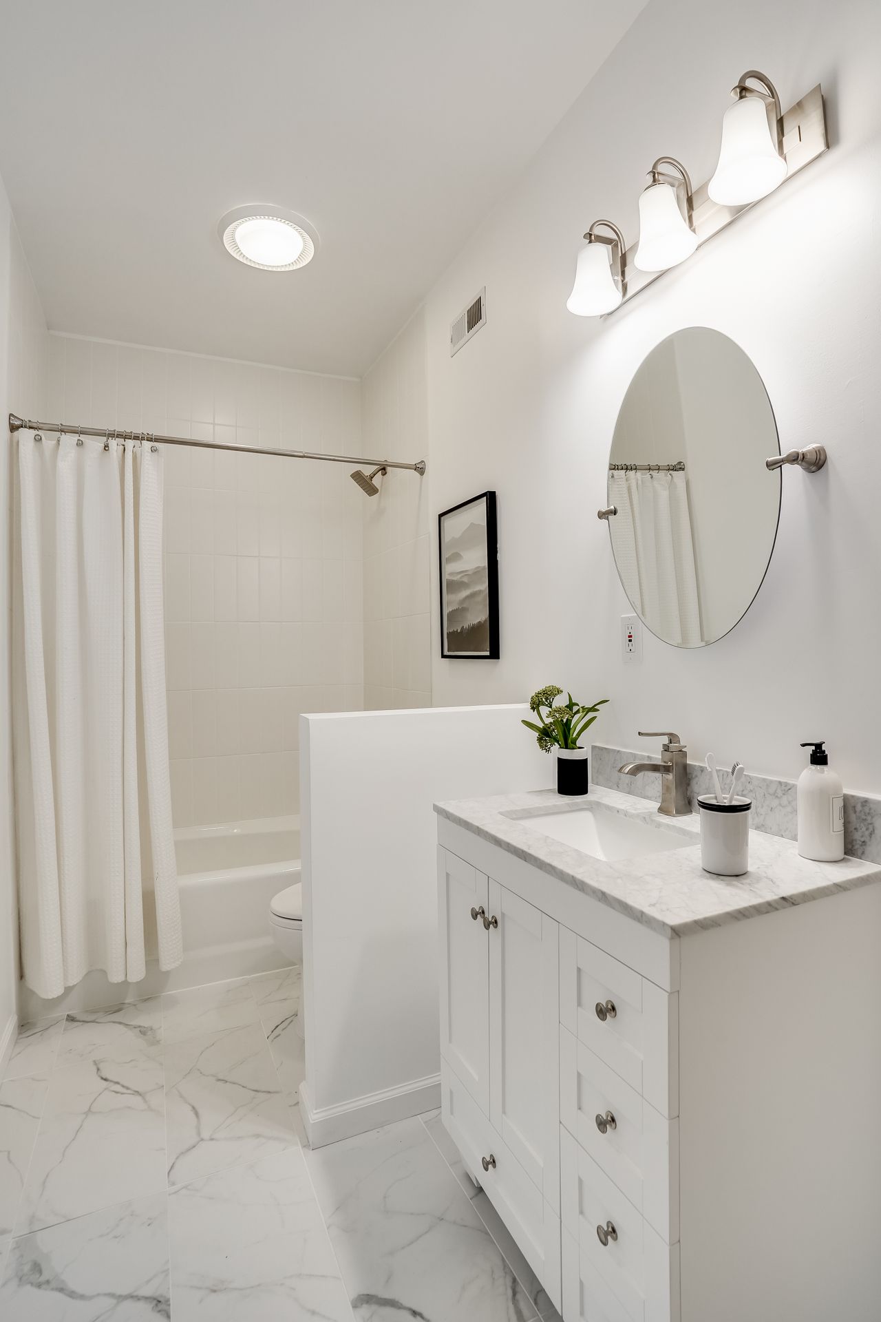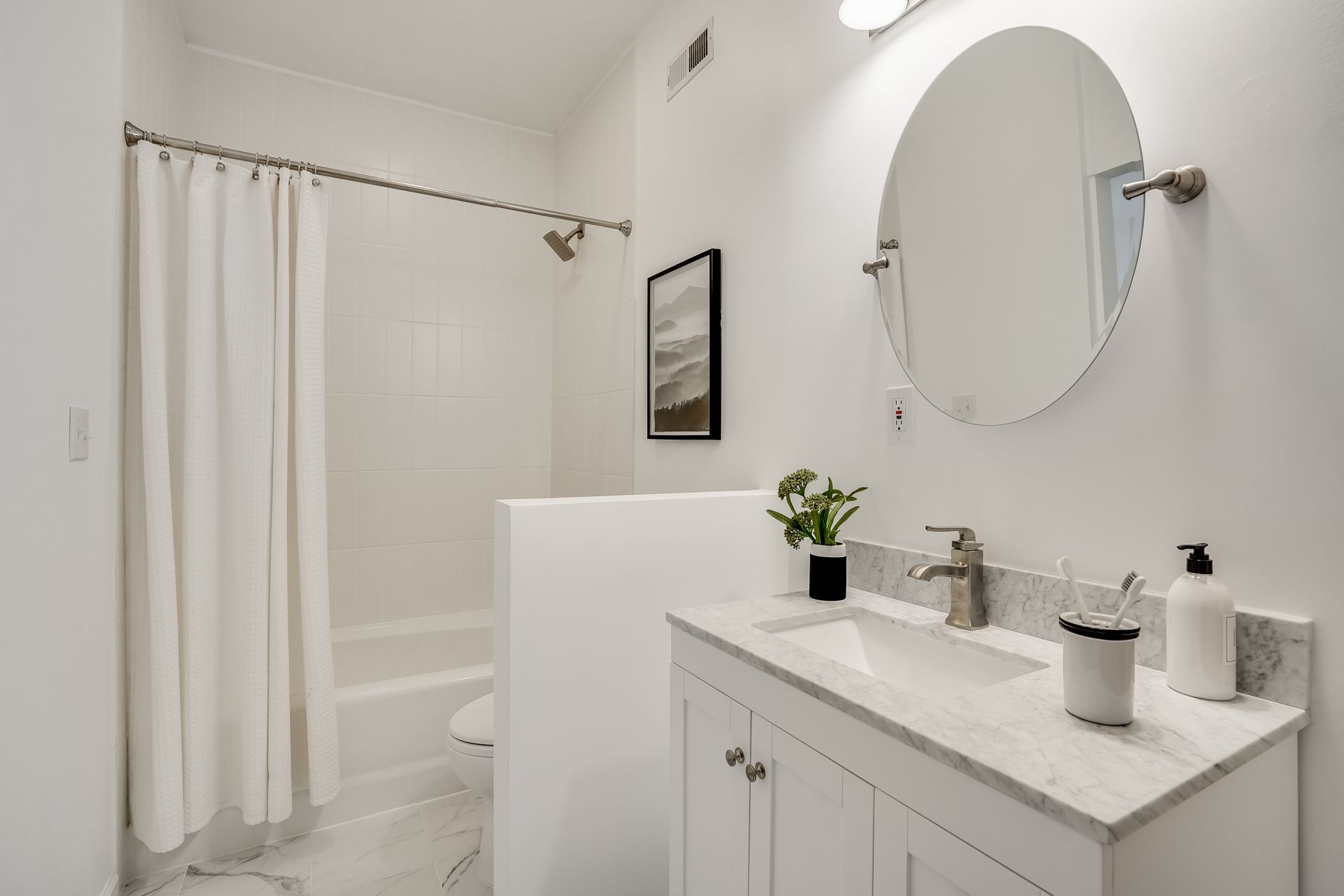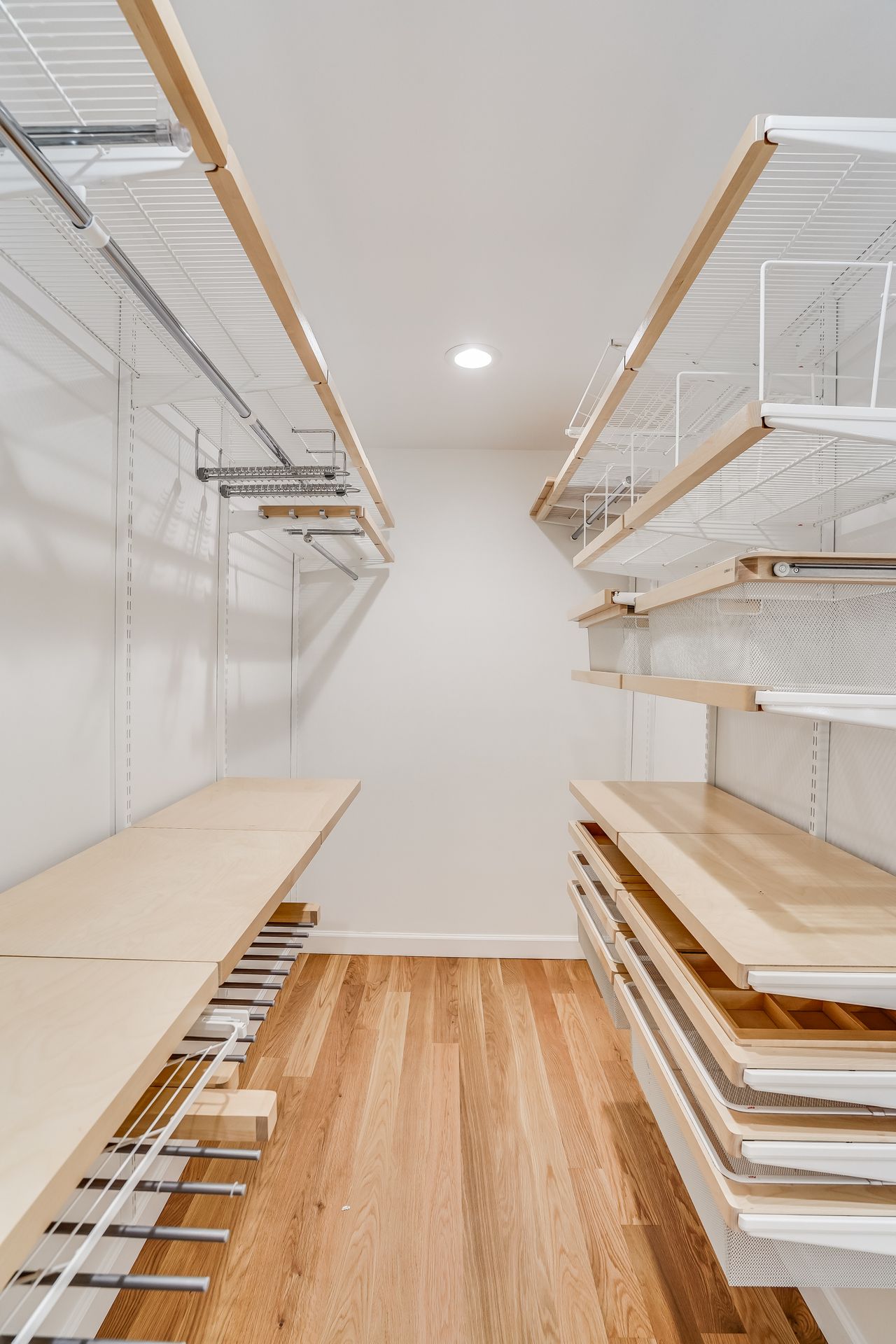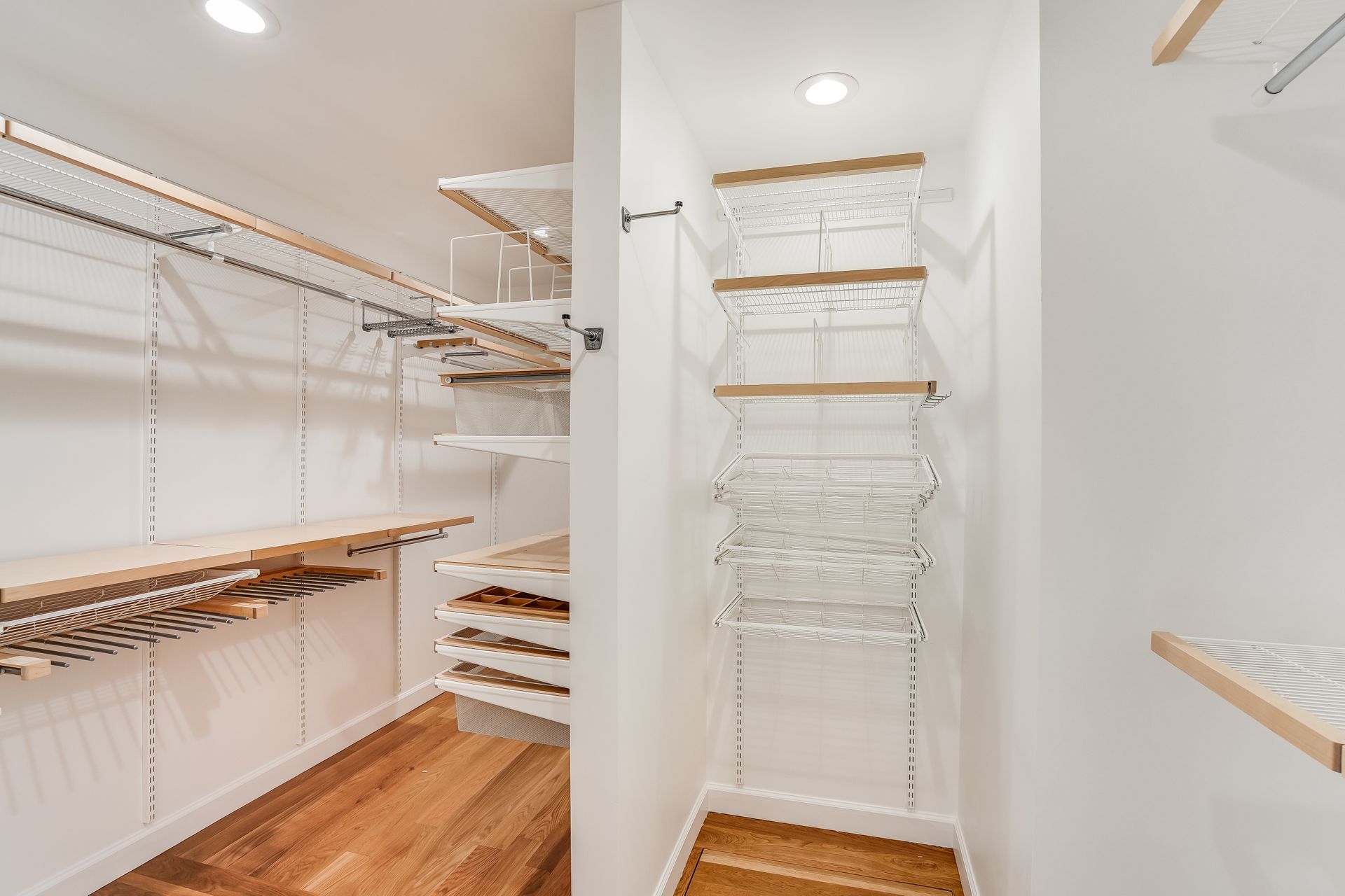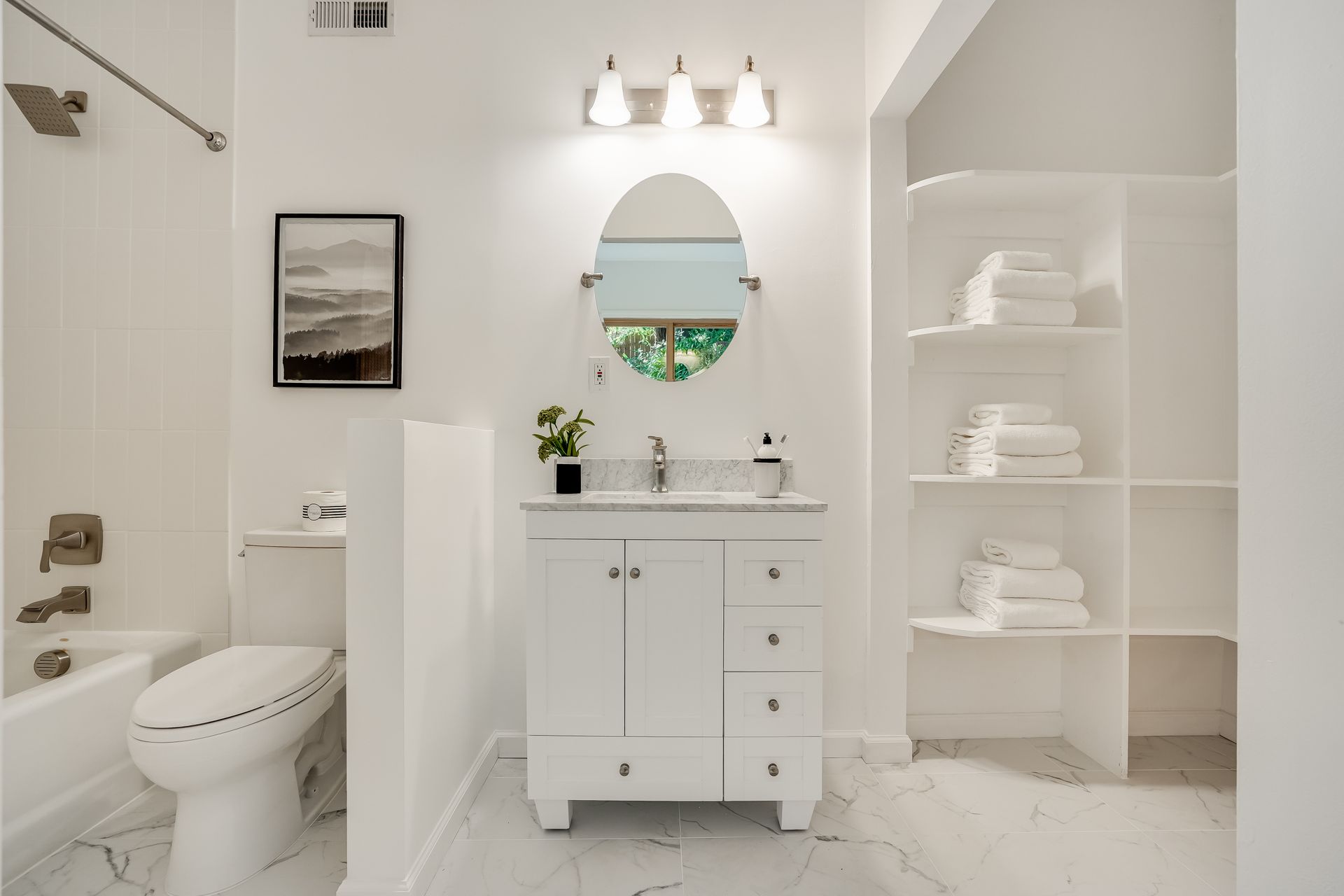 The primary suite is a true retreat. Located on the main living level, it is ample in size with natural light flooding from both the large skylight & sliders, which open onto two separate patios. The Balinese bath emits zen vibes with hand-built soaking tub overlooking blooming magnolia trees. Rain shower with pebbled floor, radiant heating and large walk-in closet complete this spa-like oasis.