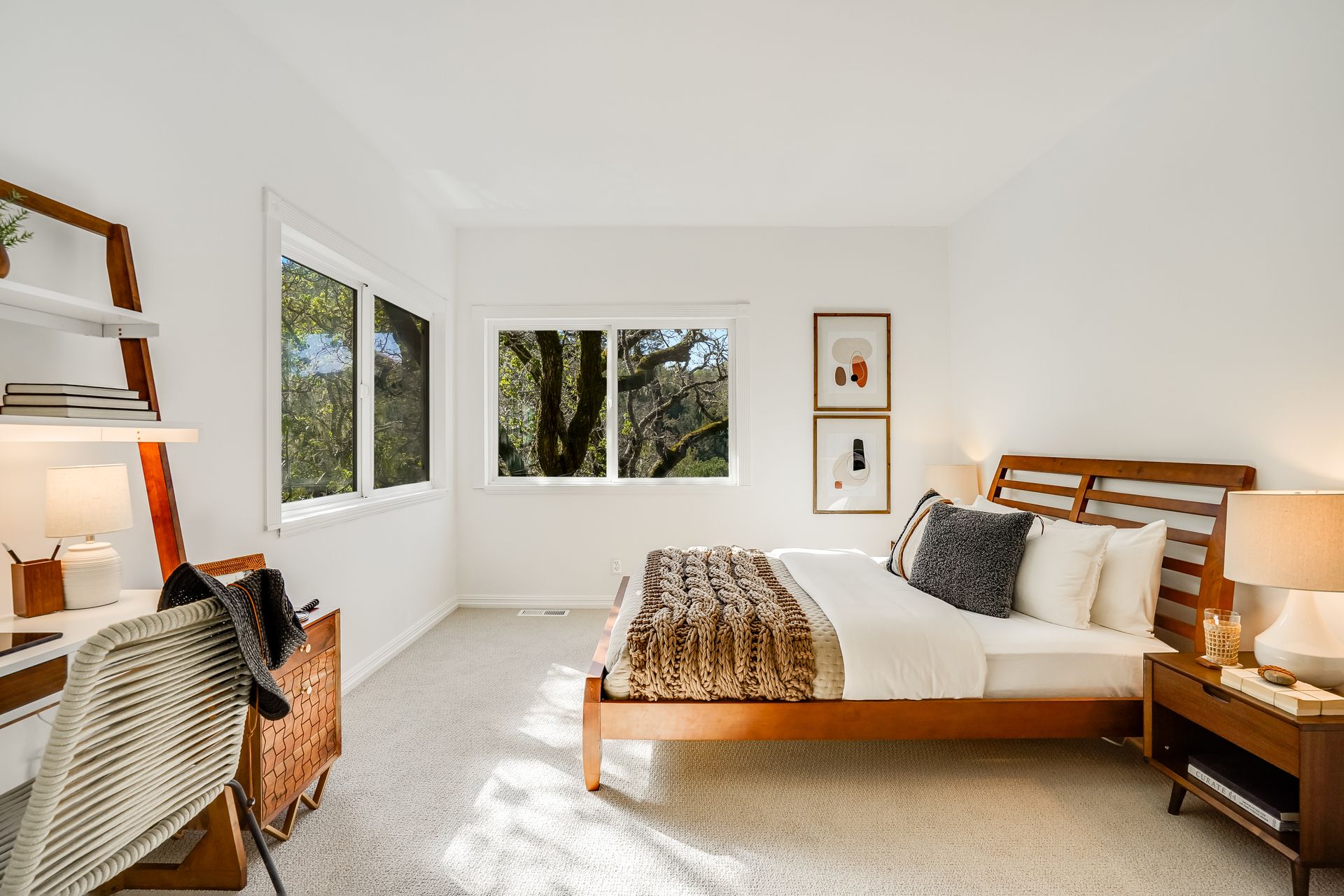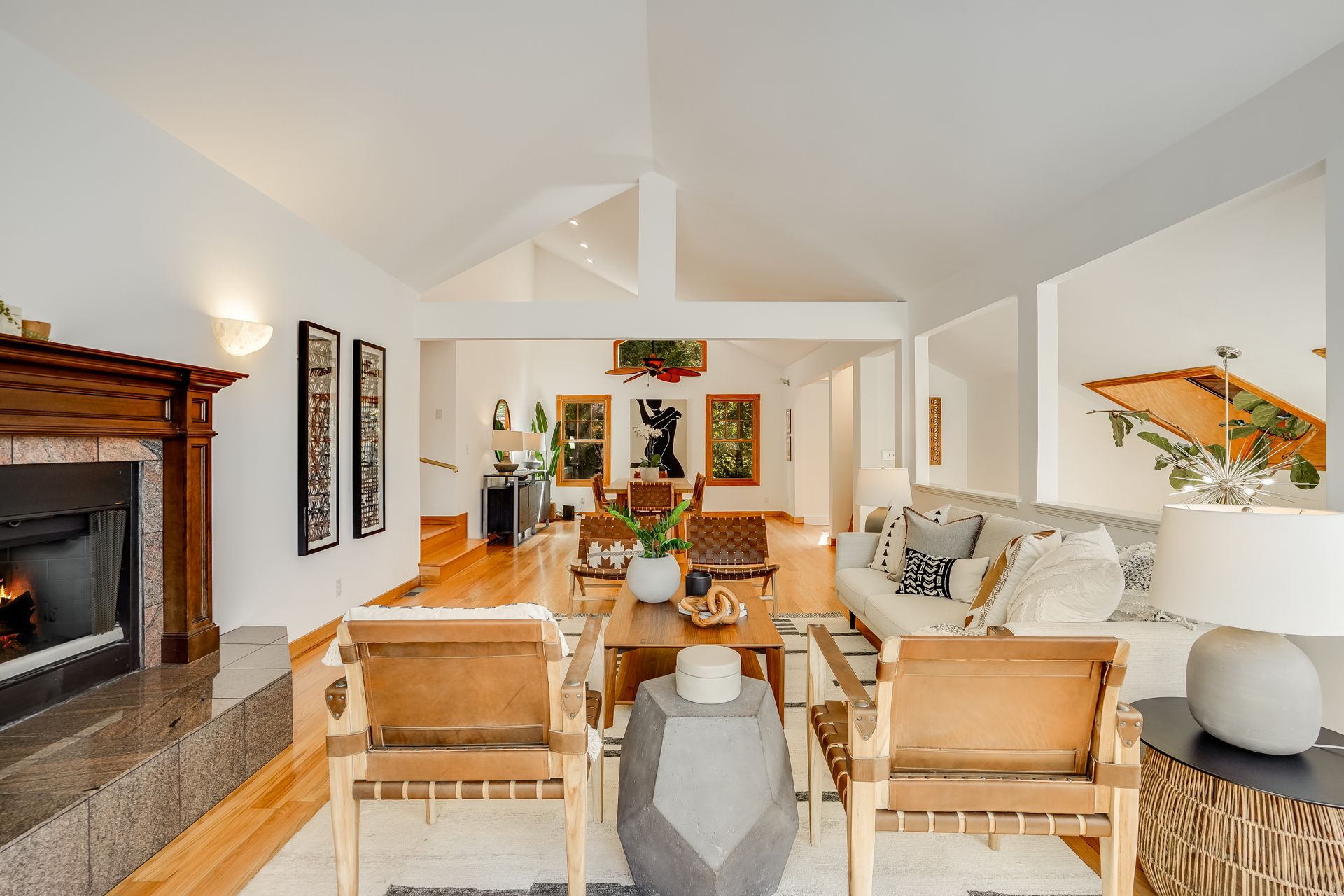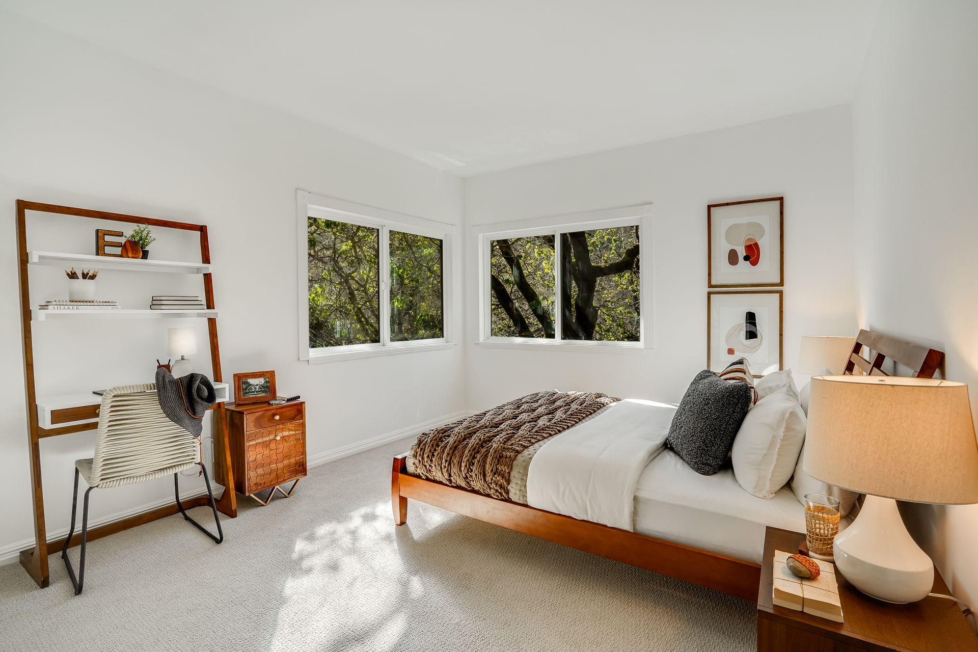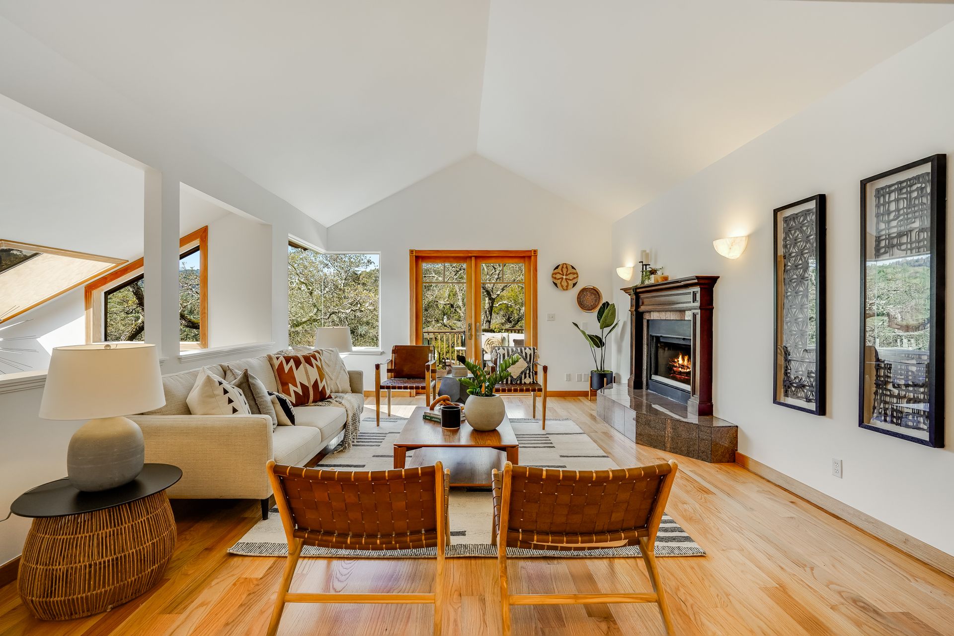 Crowning the main level is a versatile loft room full of sunlight and views. This space will accommodate any hobby or need. Three large bedrooms with high ceilings and corner windows comprise the lower level. Hallway bath, plus guest suite with remodeled bath & sliders opening onto redwood grove.