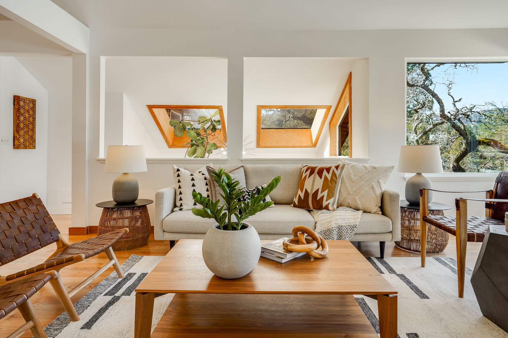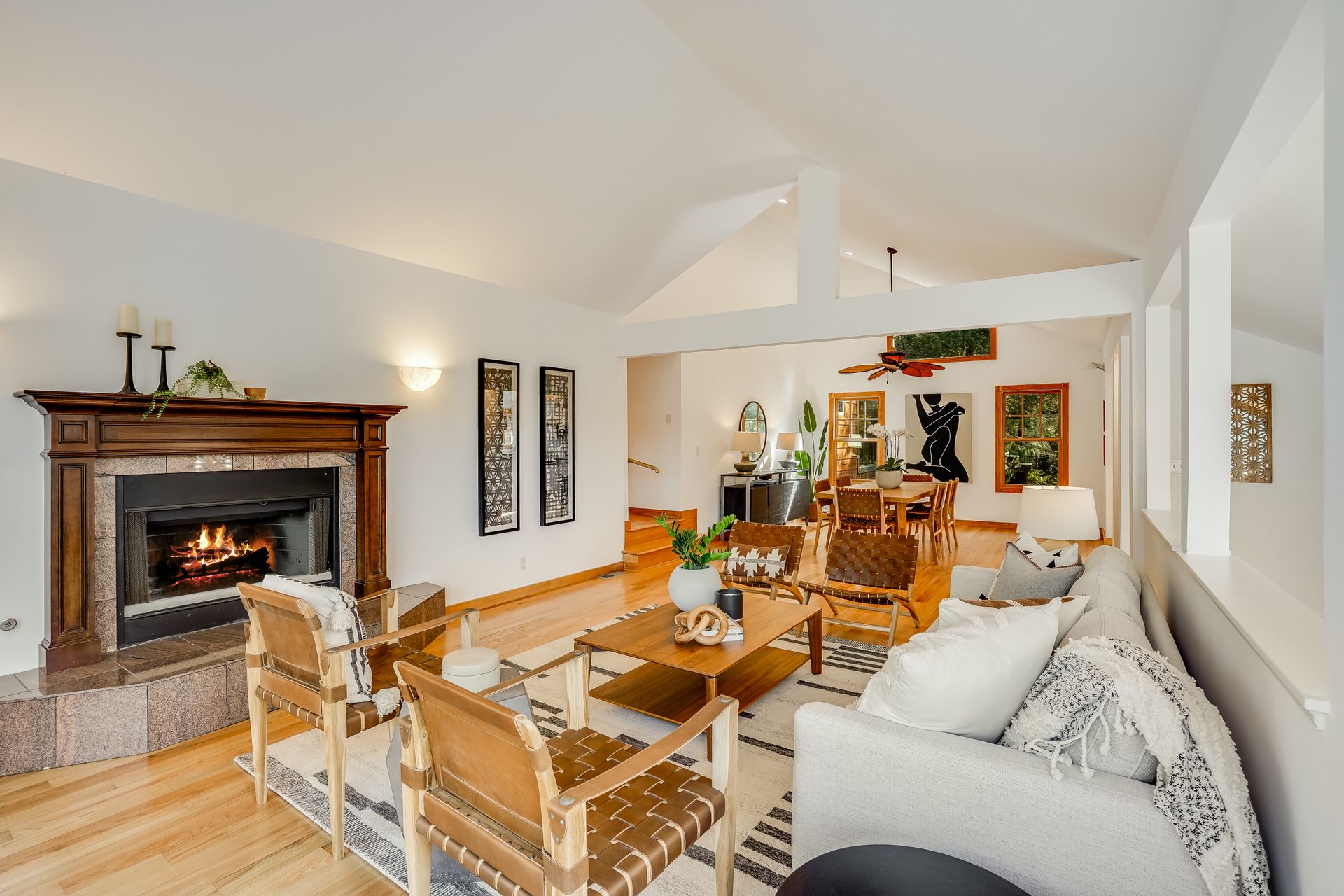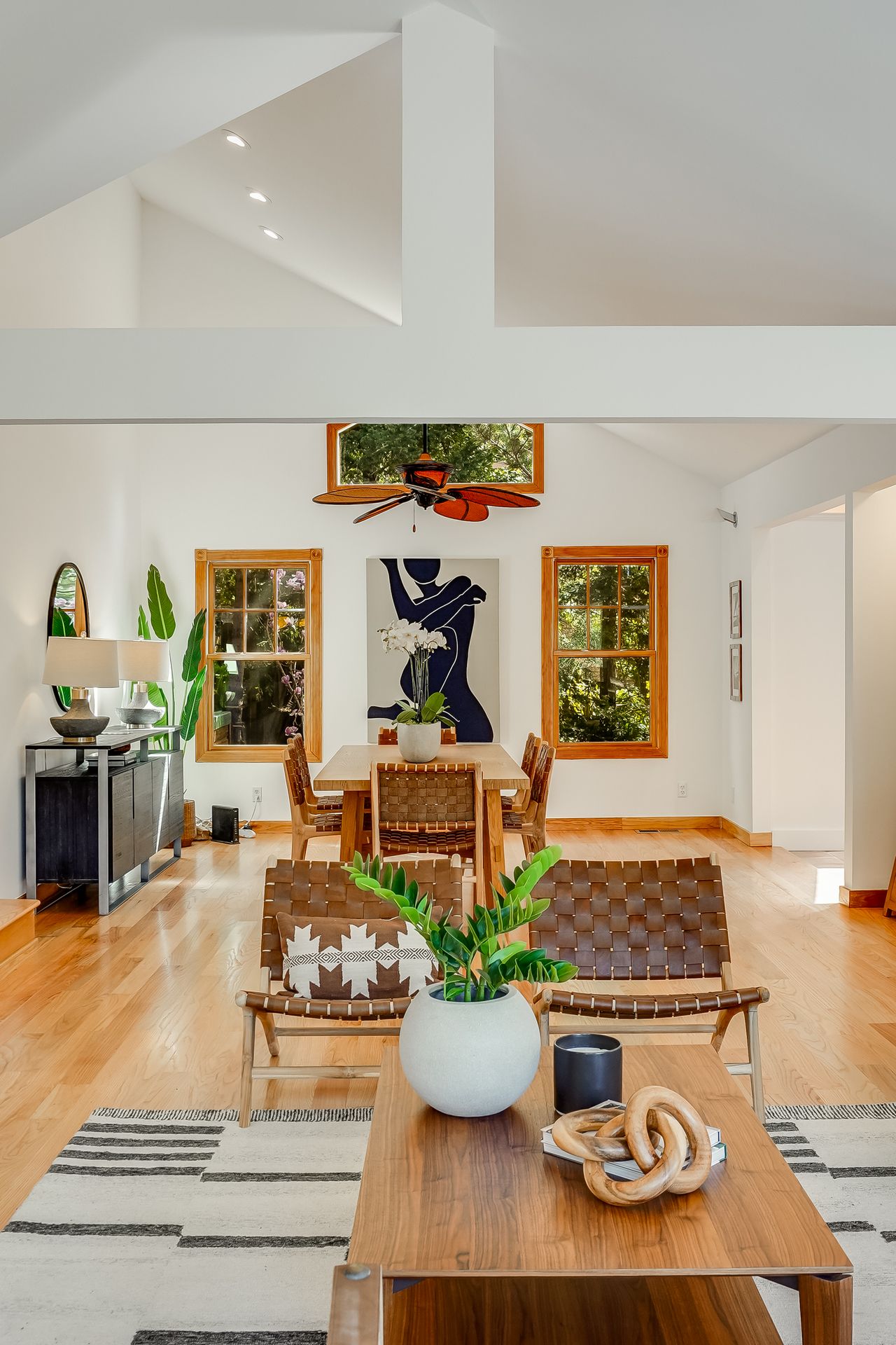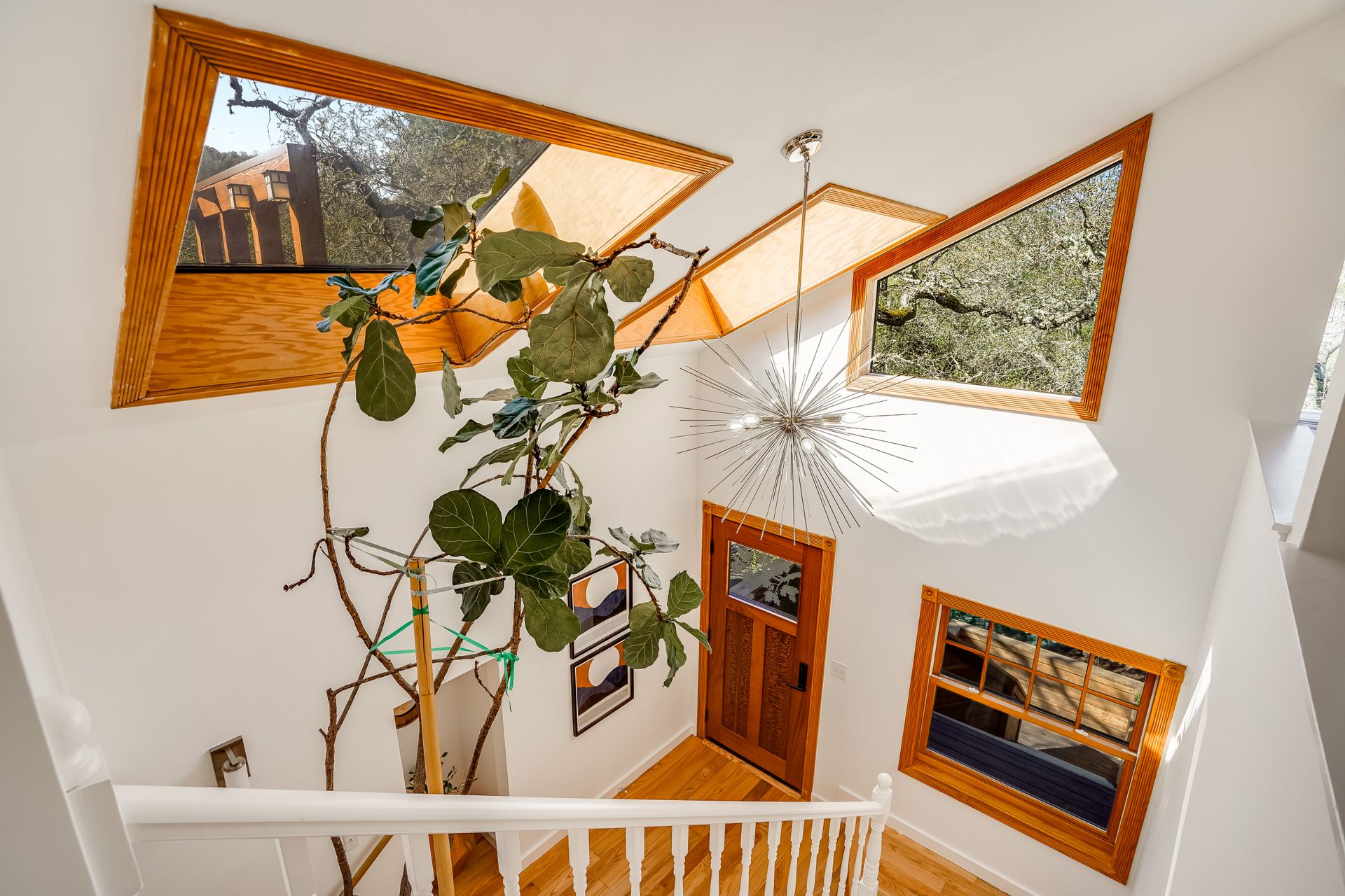 Crowning the main level is a versatile loft room full of sunlight and views. This space will accommodate any hobby or need. Three large bedrooms with high ceilings and corner windows comprise the lower level. Hallway bath, plus guest suite with remodeled bath & sliders opening onto redwood grove.