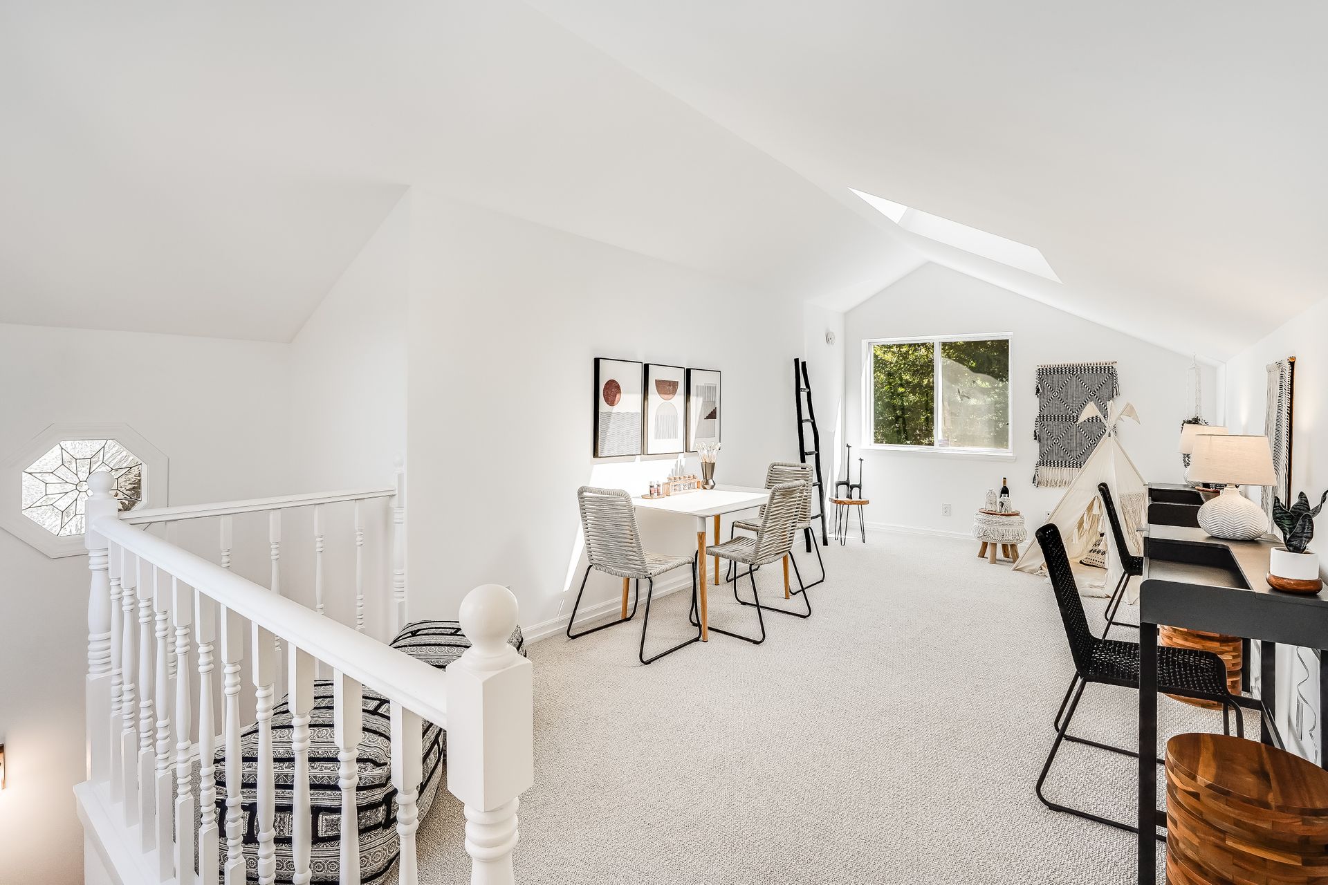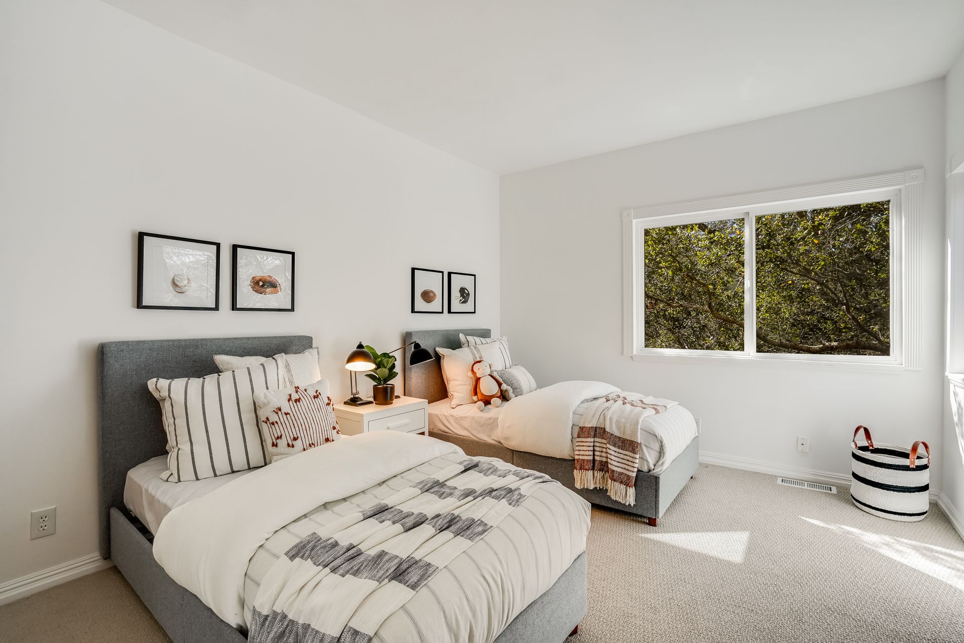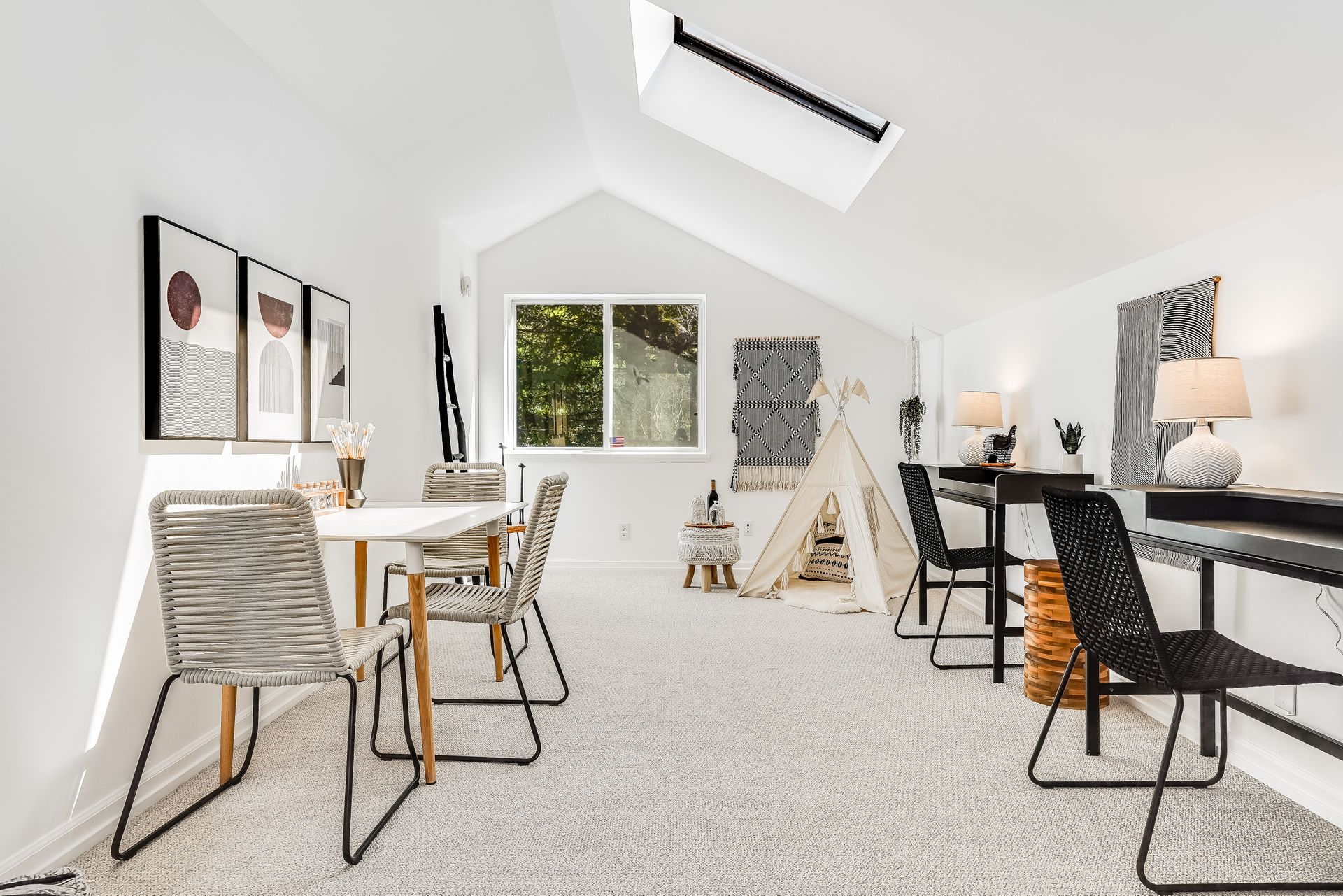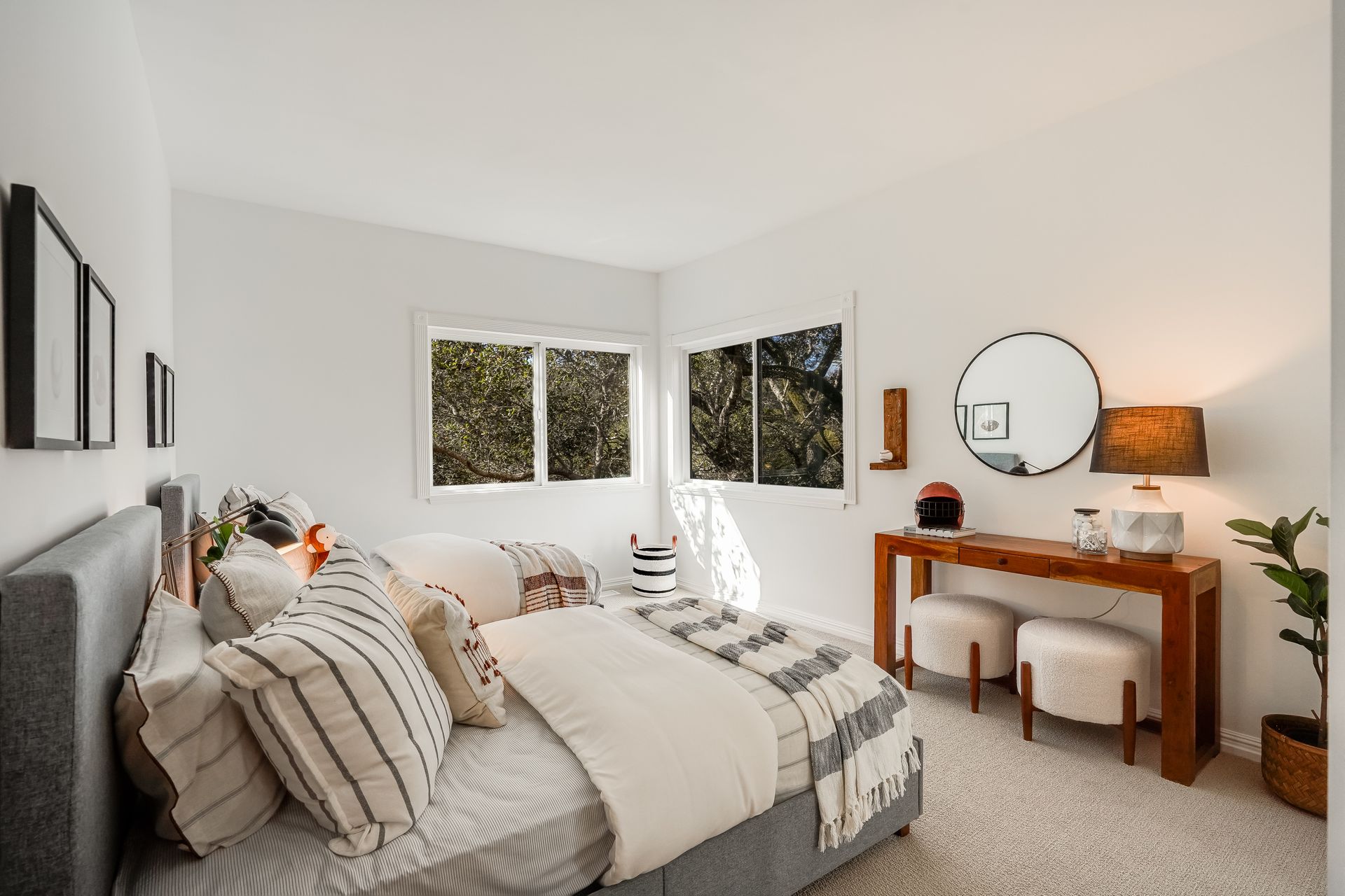 Crowning the main level is a versatile loft room full of sunlight and views. This space will accommodate any hobby or need. Three large bedrooms with high ceilings and corner windows comprise the lower level. Hallway bath, plus guest suite with remodeled bath & sliders opening onto redwood grove.
