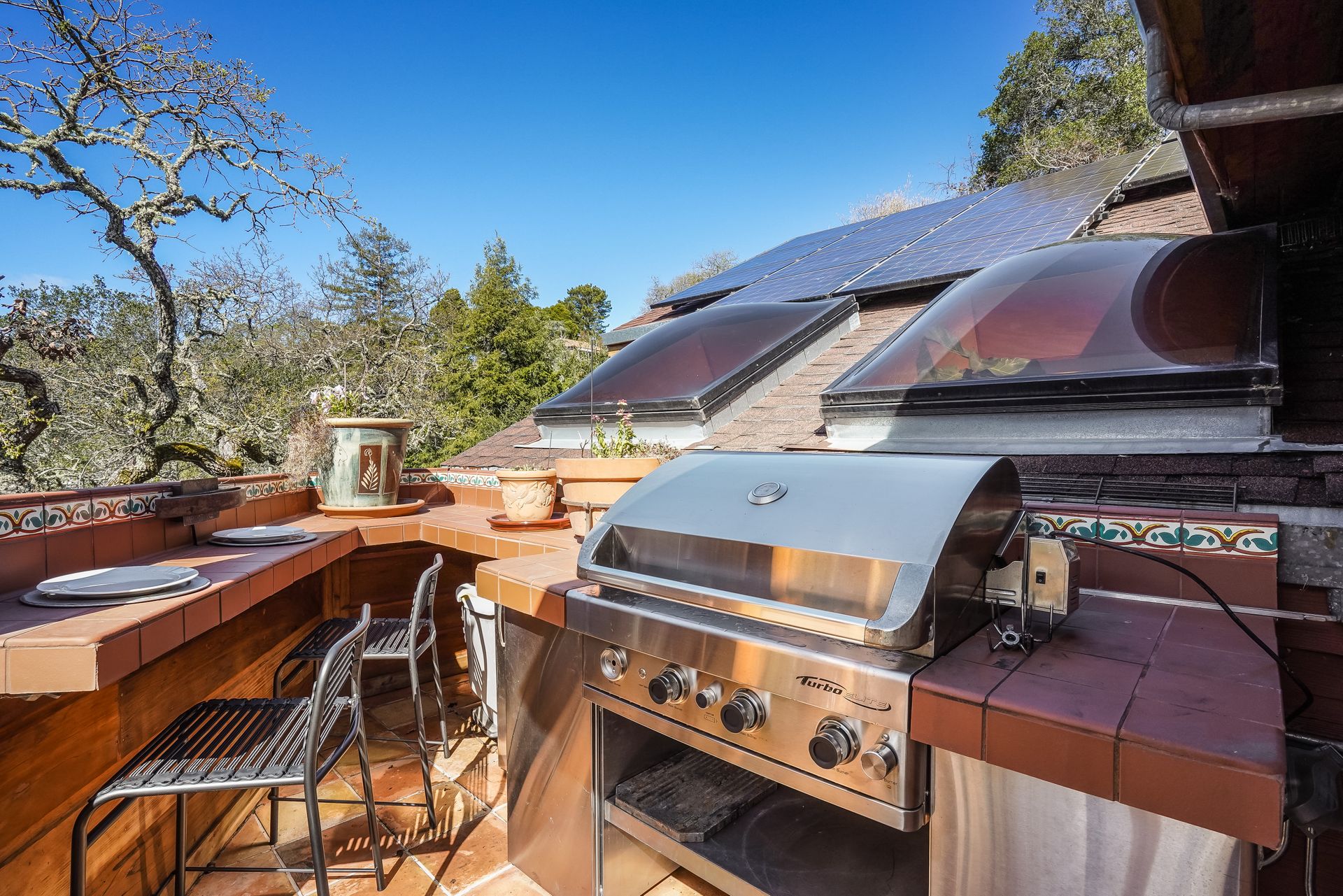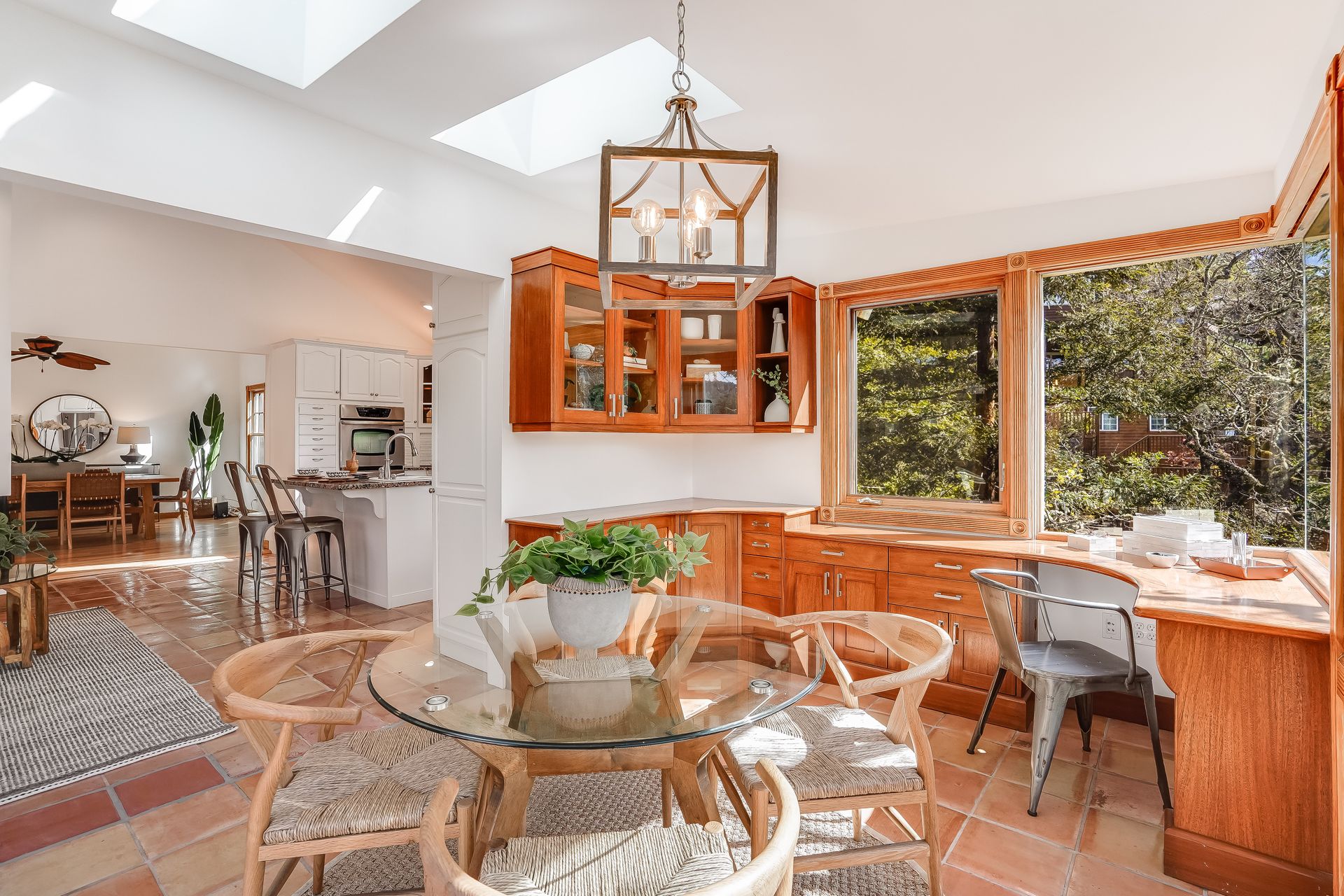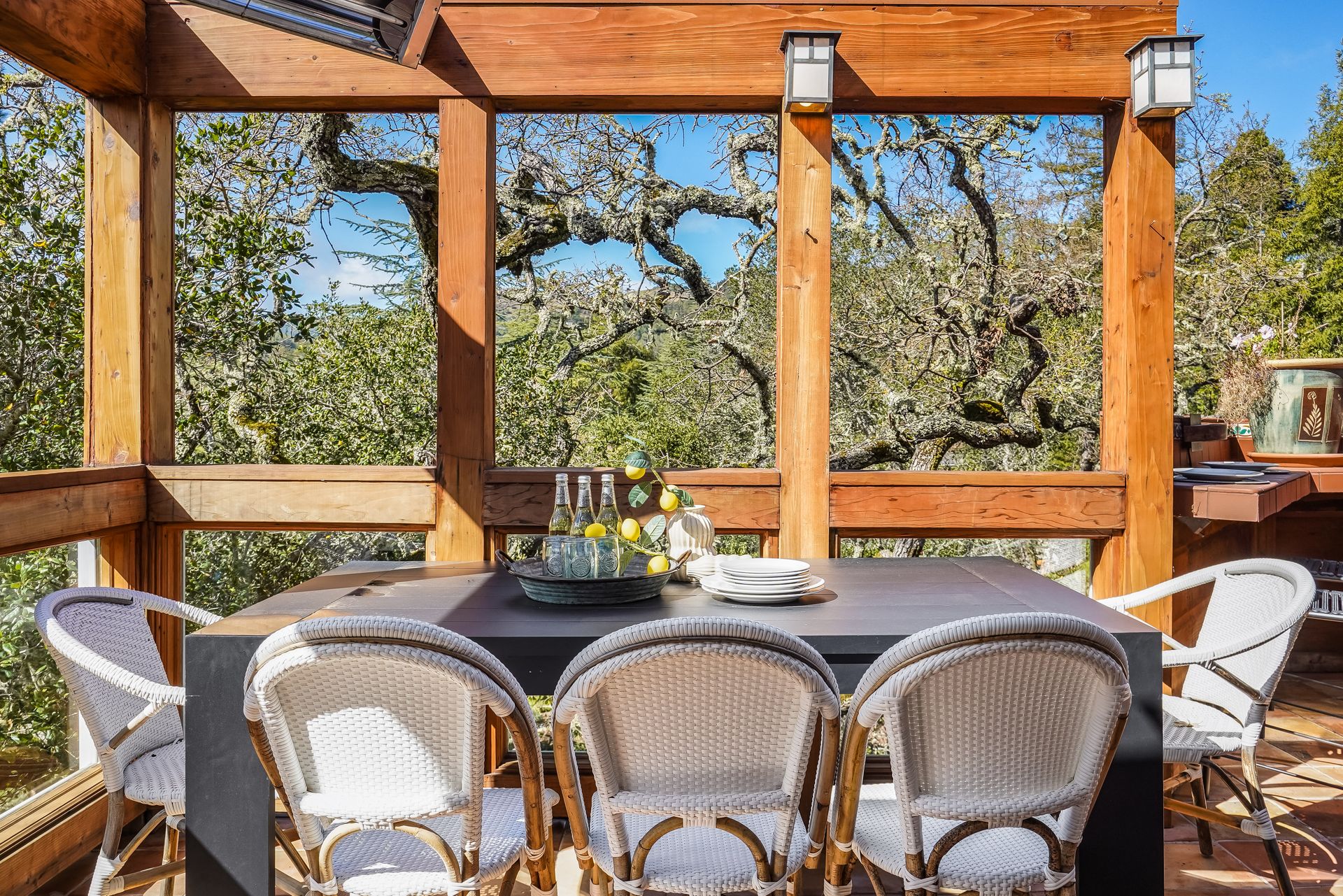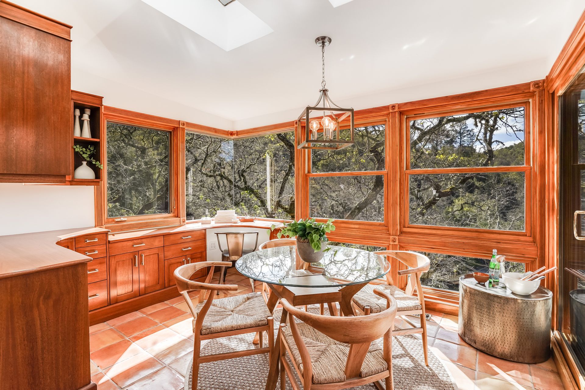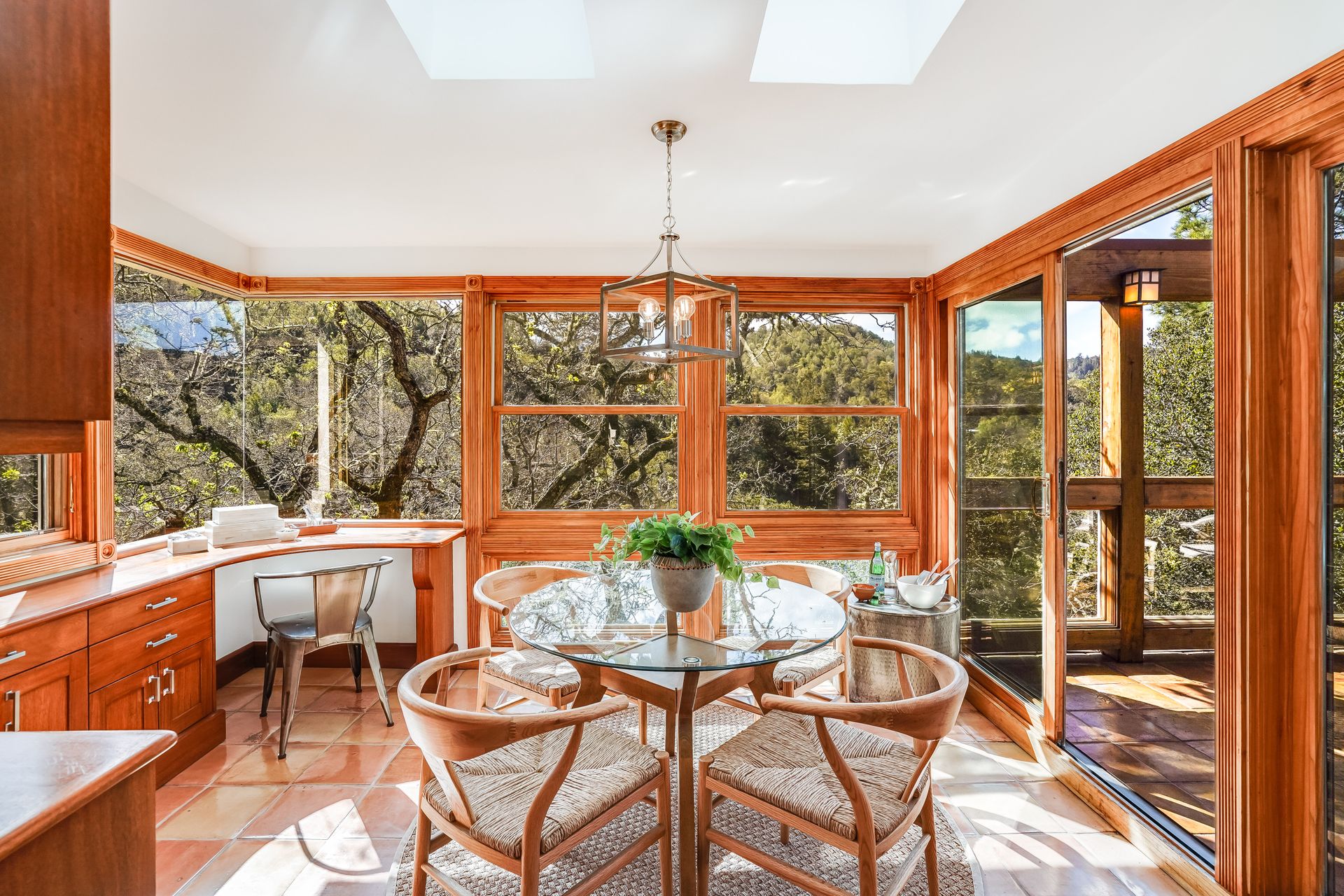 Walls of windows draw you into the adjoining breakfast room complete with mahogany built-in office/study area. Morning sunlight fills the room while peaceful hillside and redwood views beckon. Sliding doors open to a separate dining patio with built- in BBQ, sit up bar and heaters for casual outdoor dining.