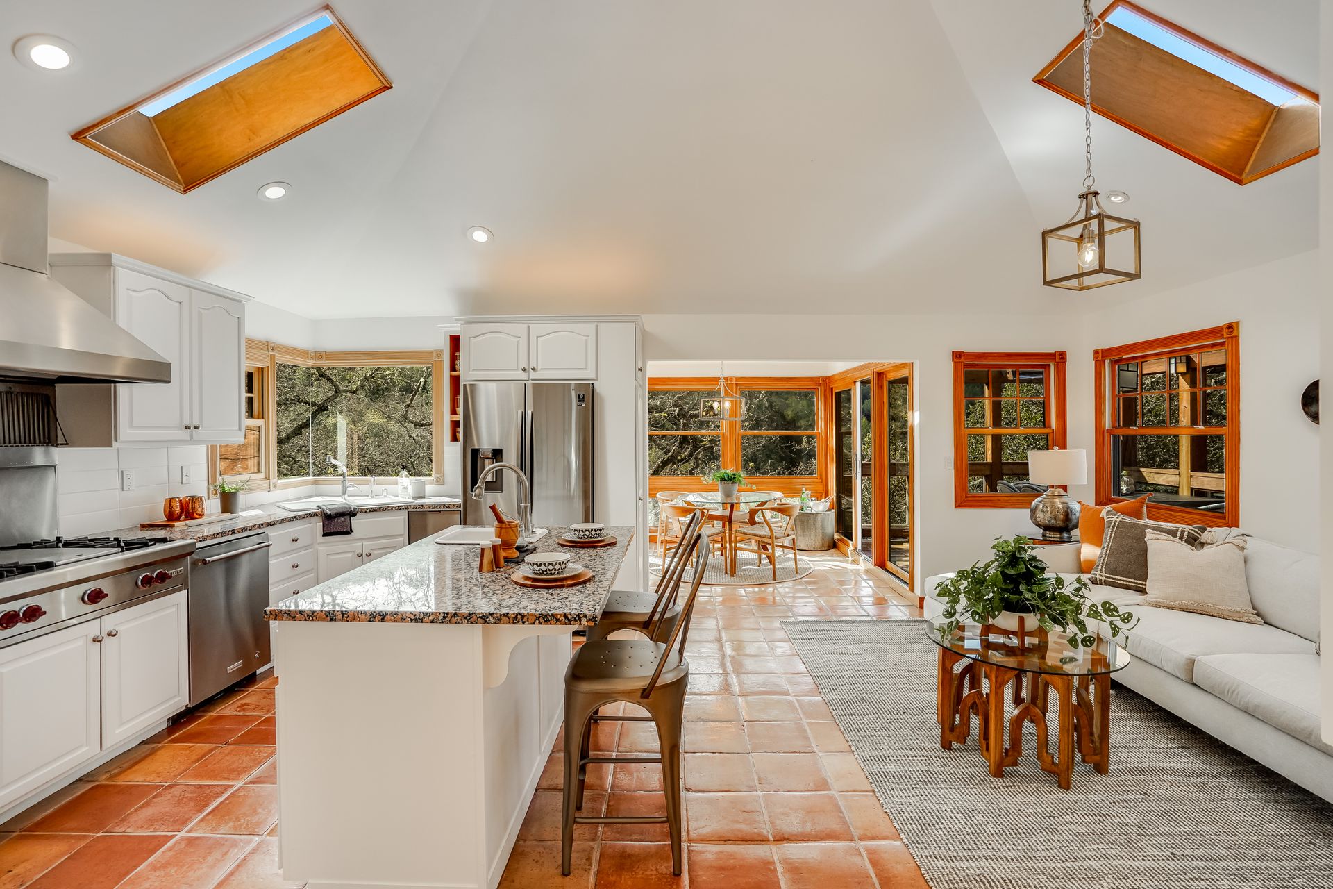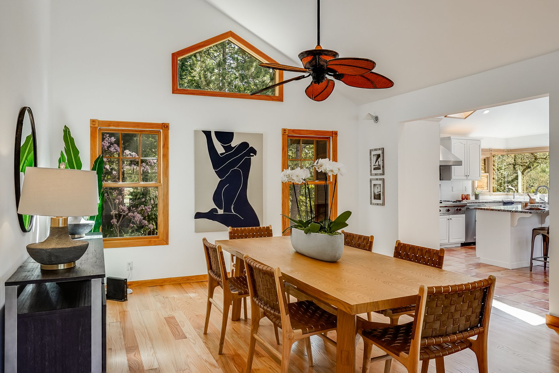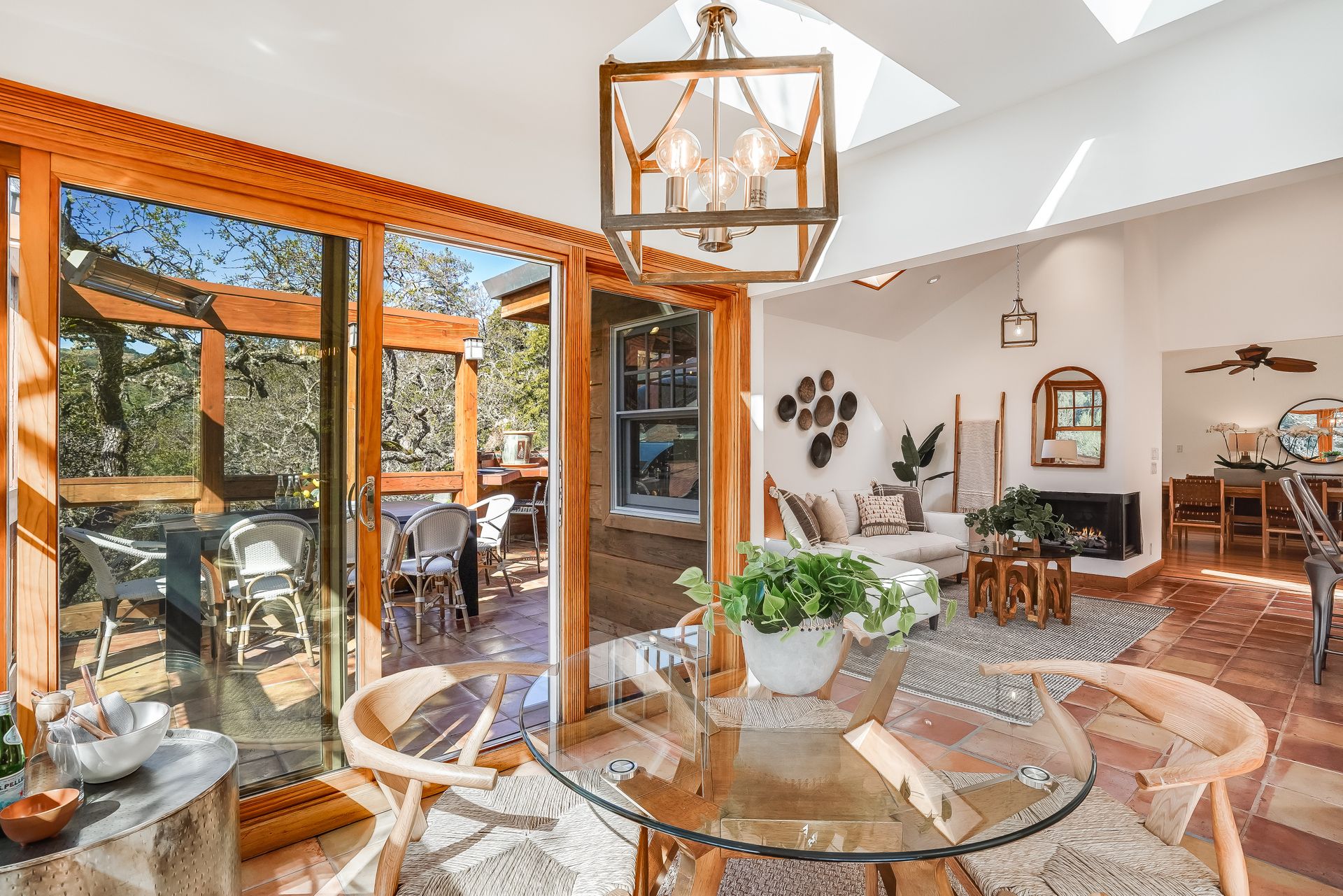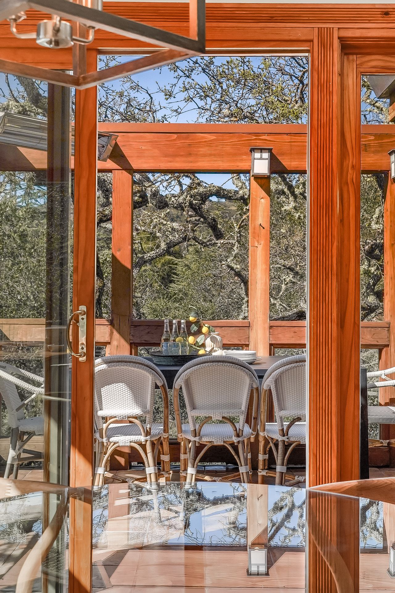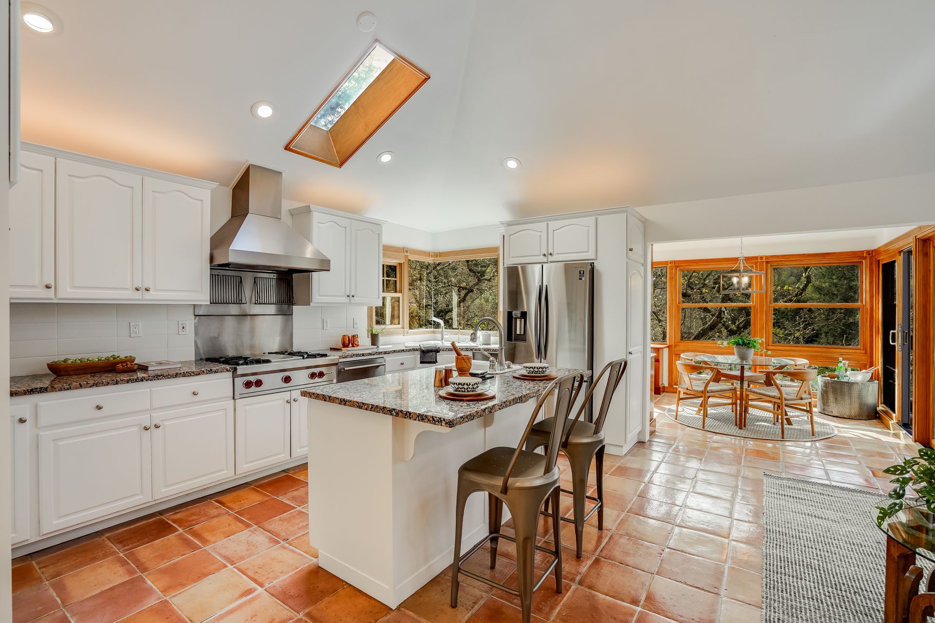 Walls of windows draw you into the adjoining breakfast room complete with mahogany built-in office/study area. Morning sunlight fills the room while peaceful hillside and redwood views beckon. Sliding doors open to a separate dining patio with built- in BBQ, sit up bar and heaters for casual outdoor dining.
