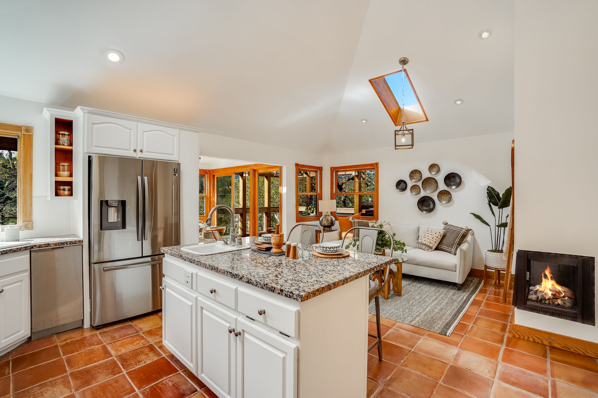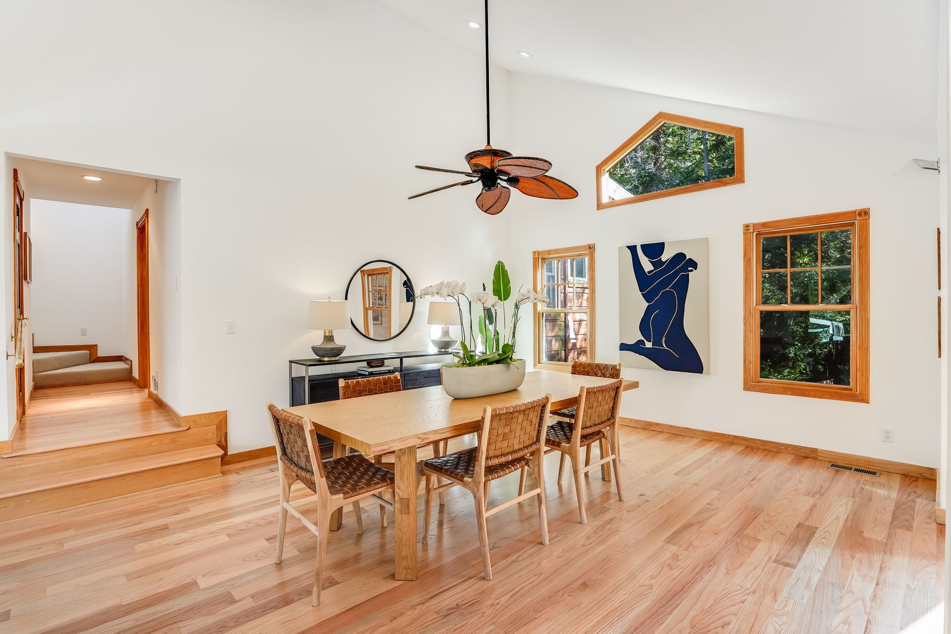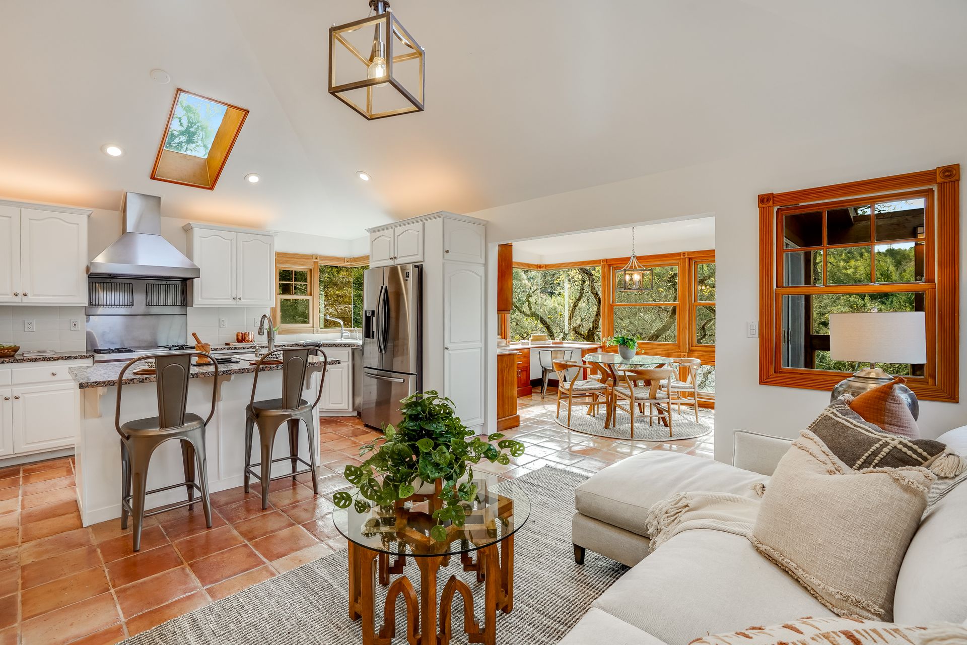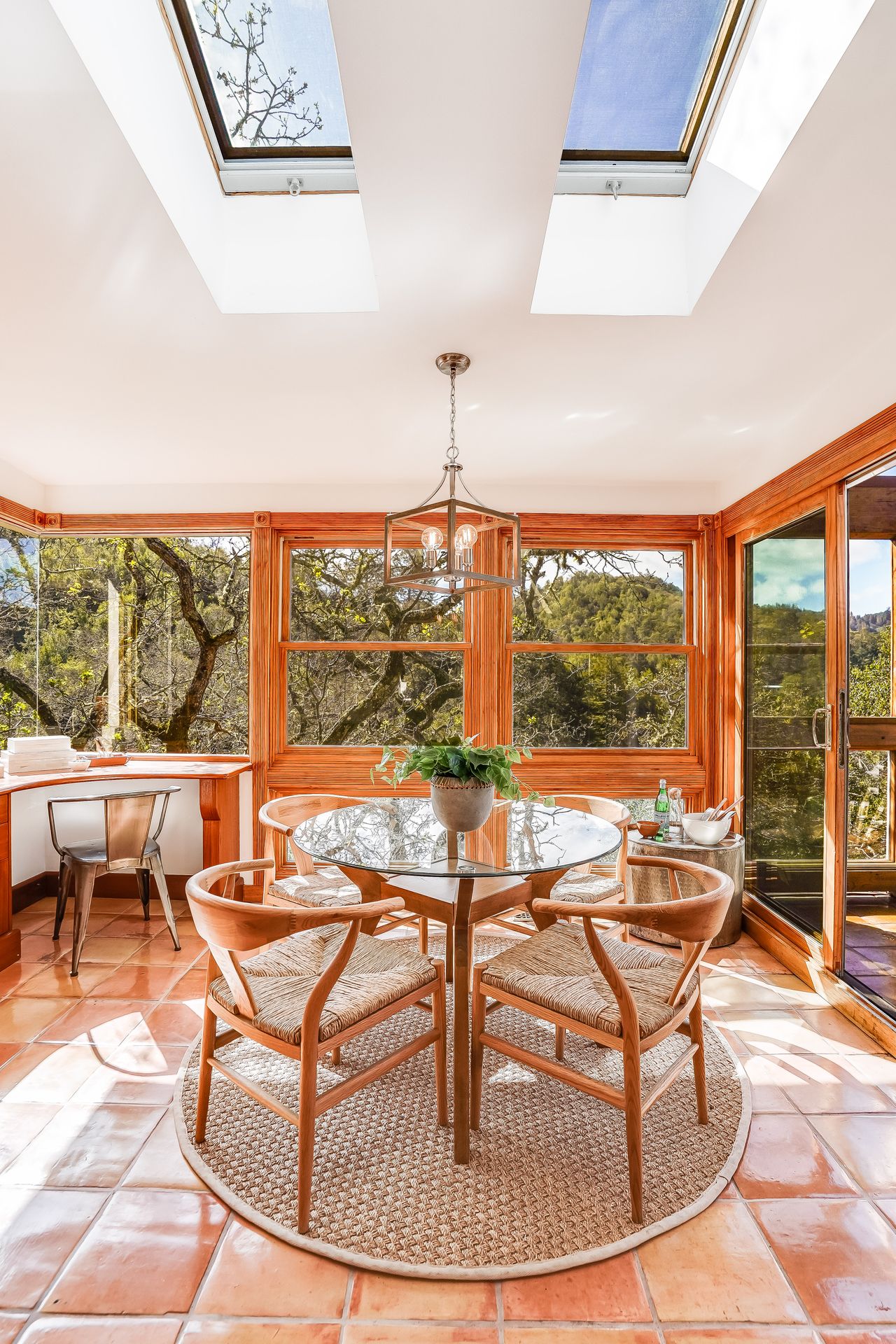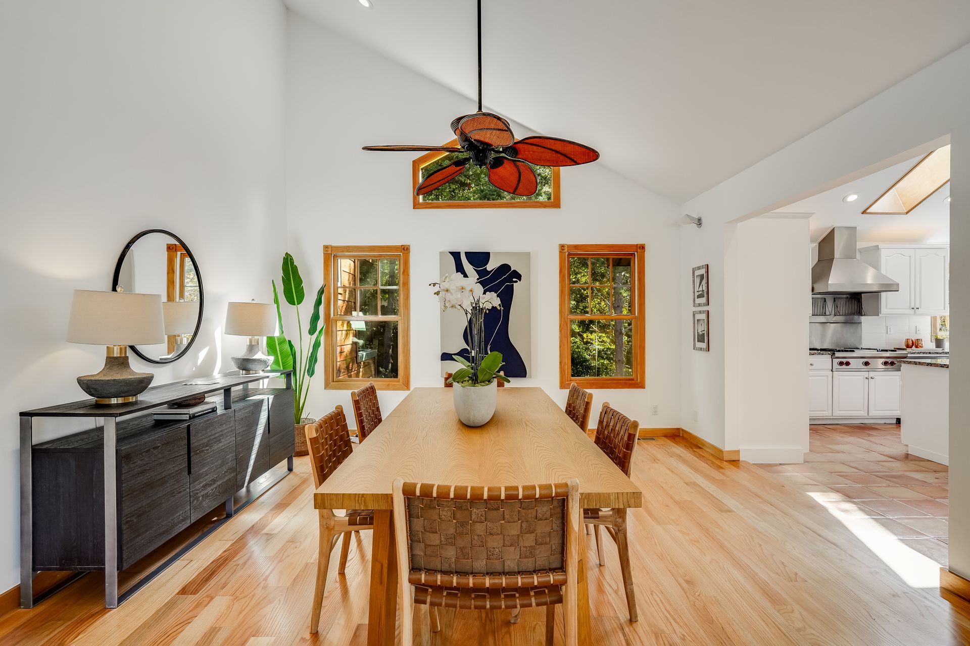 Walls of windows draw you into the adjoining breakfast room complete with mahogany built-in office/study area. Morning sunlight fills the room while peaceful hillside and redwood views beckon. Sliding doors open to a separate dining patio with built- in BBQ, sit up bar and heaters for casual outdoor dining.