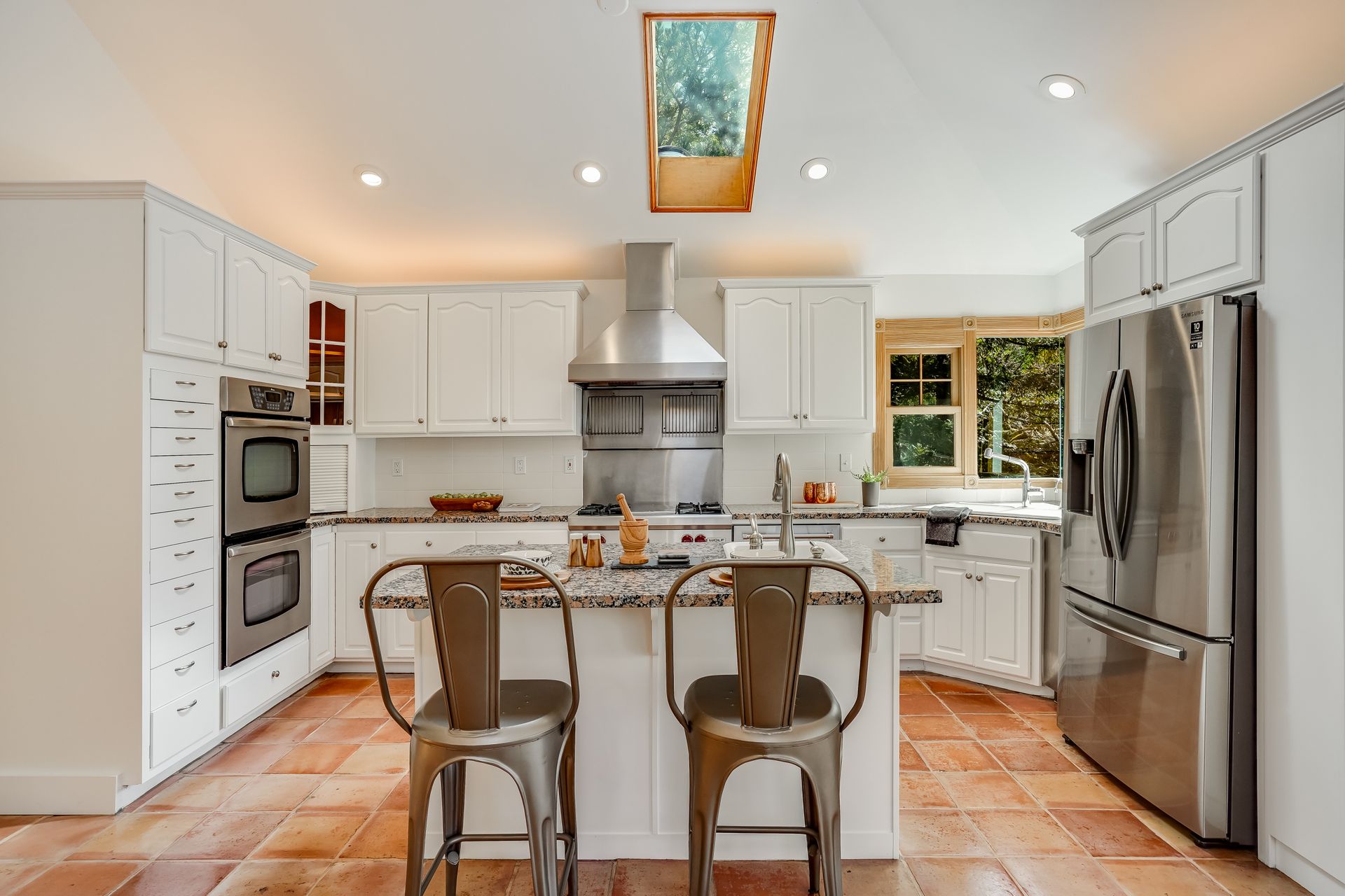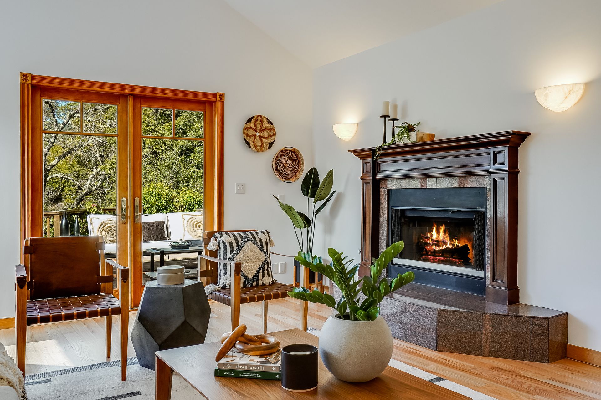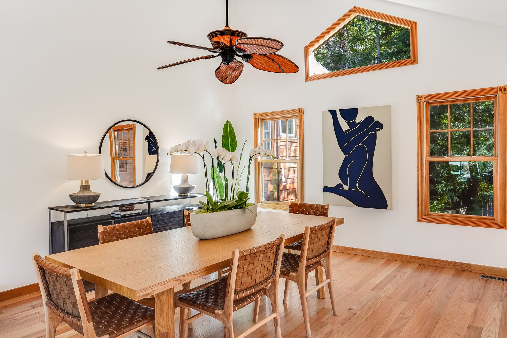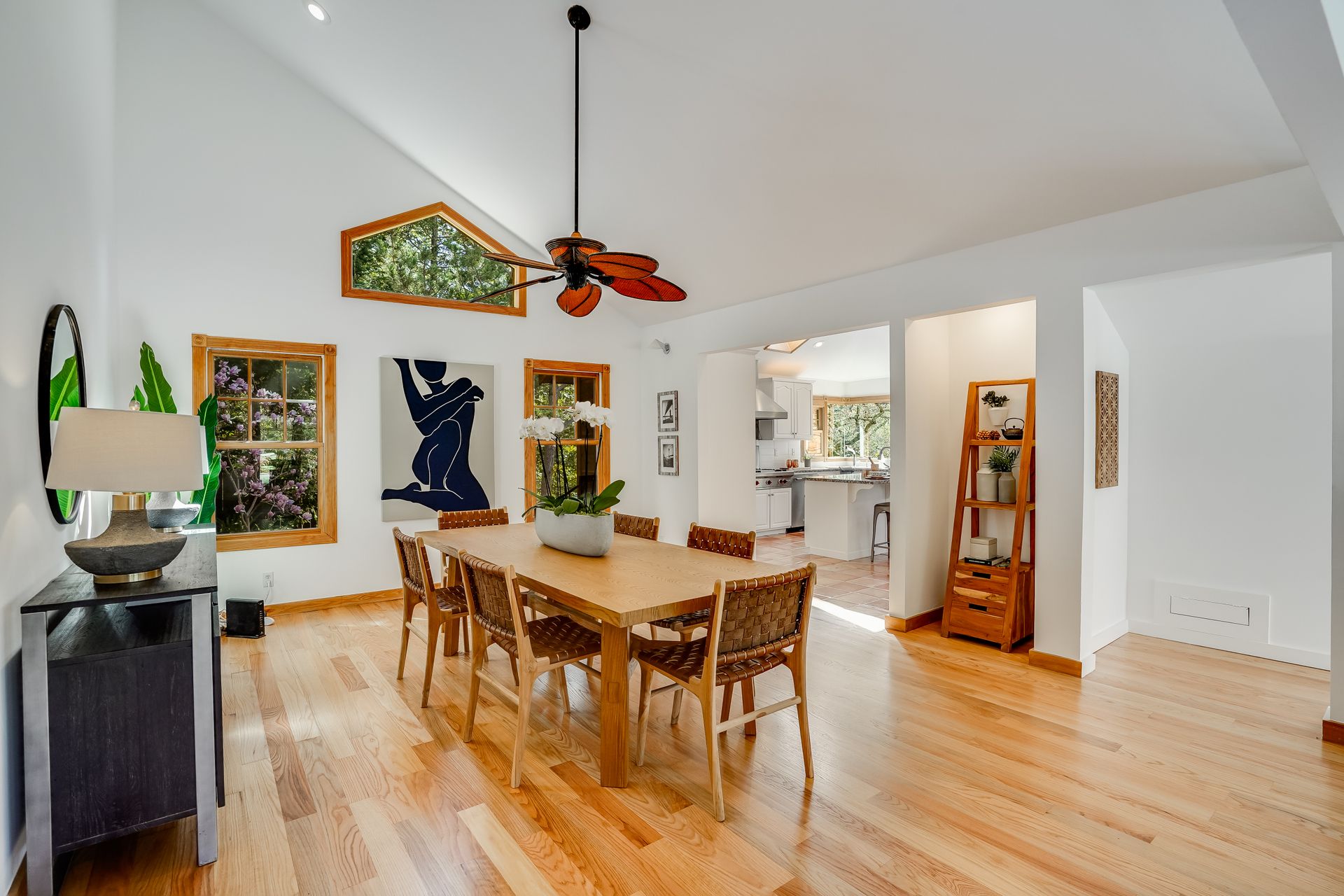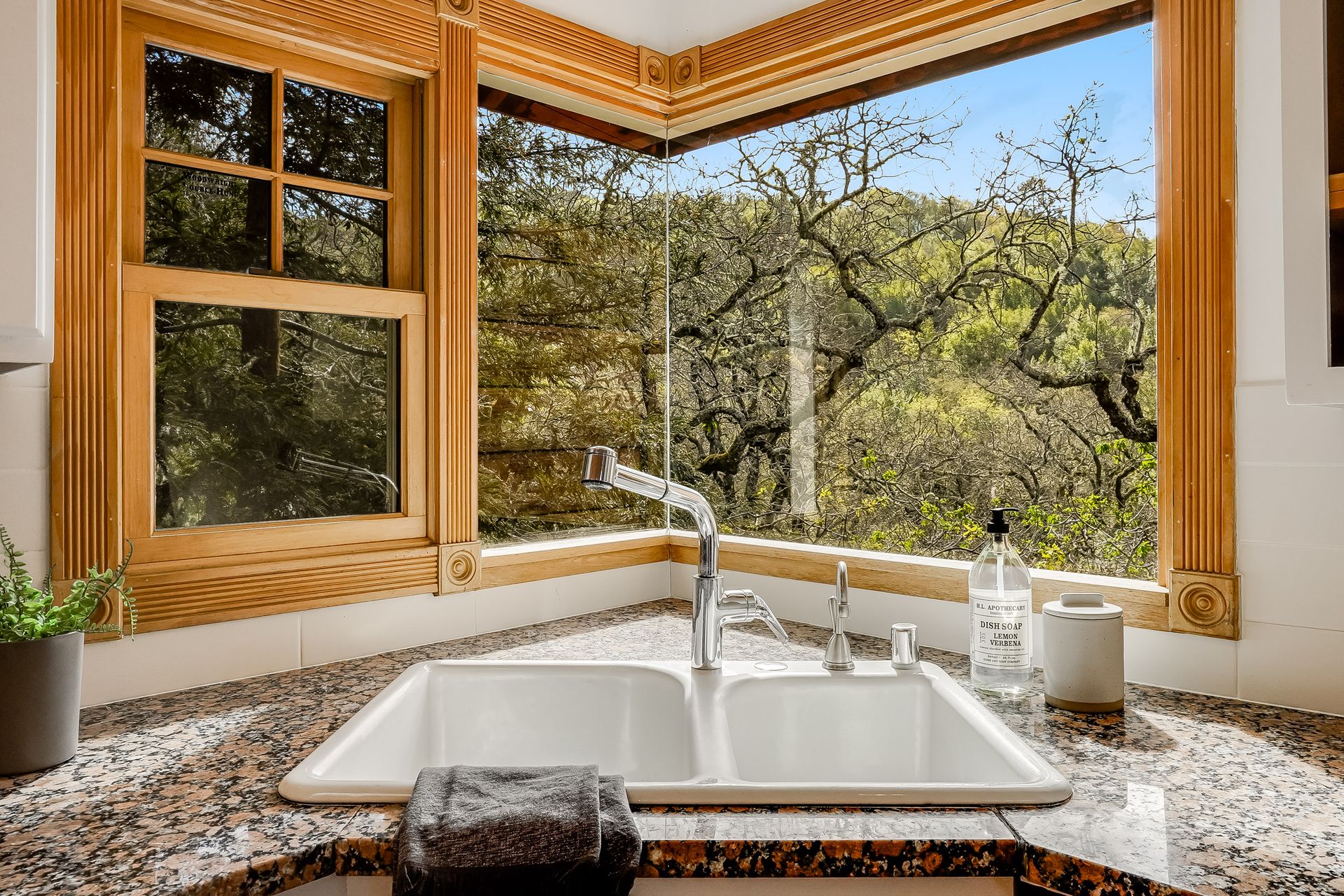 Walls of windows draw you into the adjoining breakfast room complete with mahogany built-in office/study area. Morning sunlight fills the room while peaceful hillside and redwood views beckon. Sliding doors open to a separate dining patio with built- in BBQ, sit up bar and heaters for casual outdoor dining.