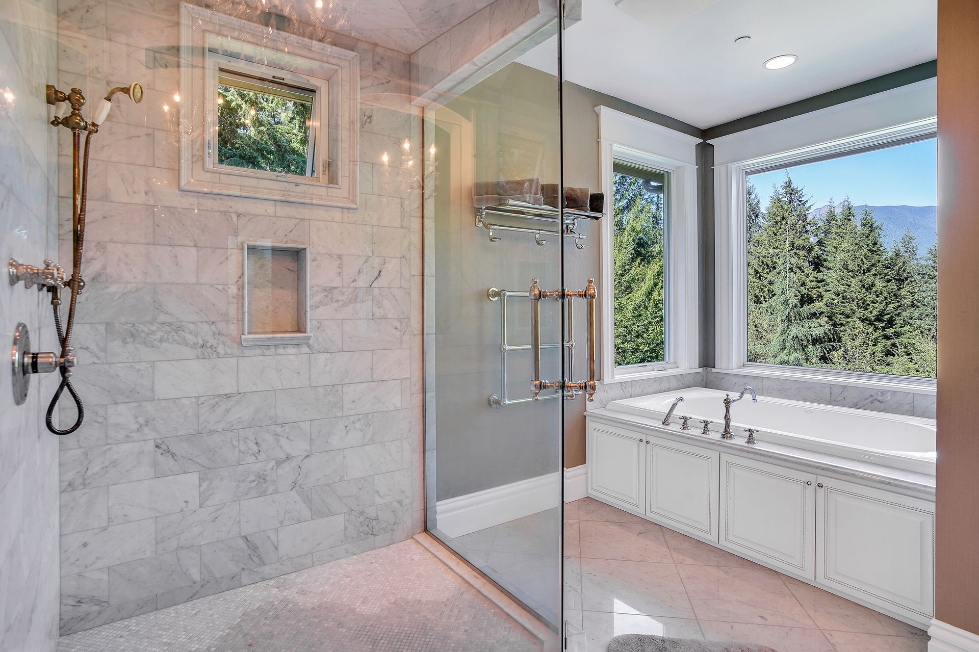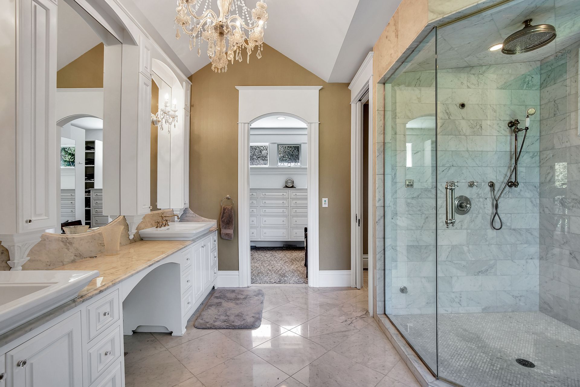 - Carrera marble shower and countertops, with steam shower and heated marble floors/towel rack in primary