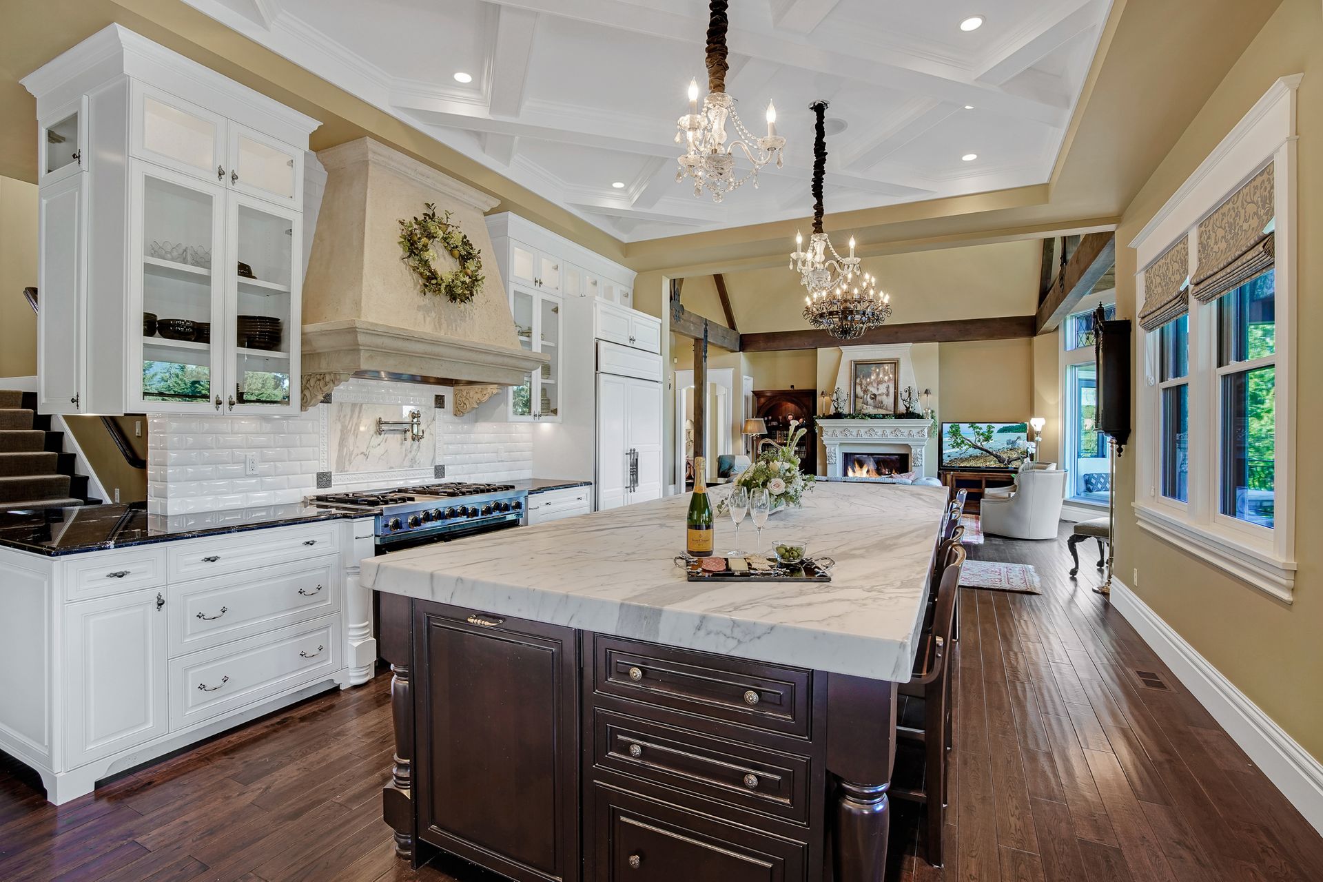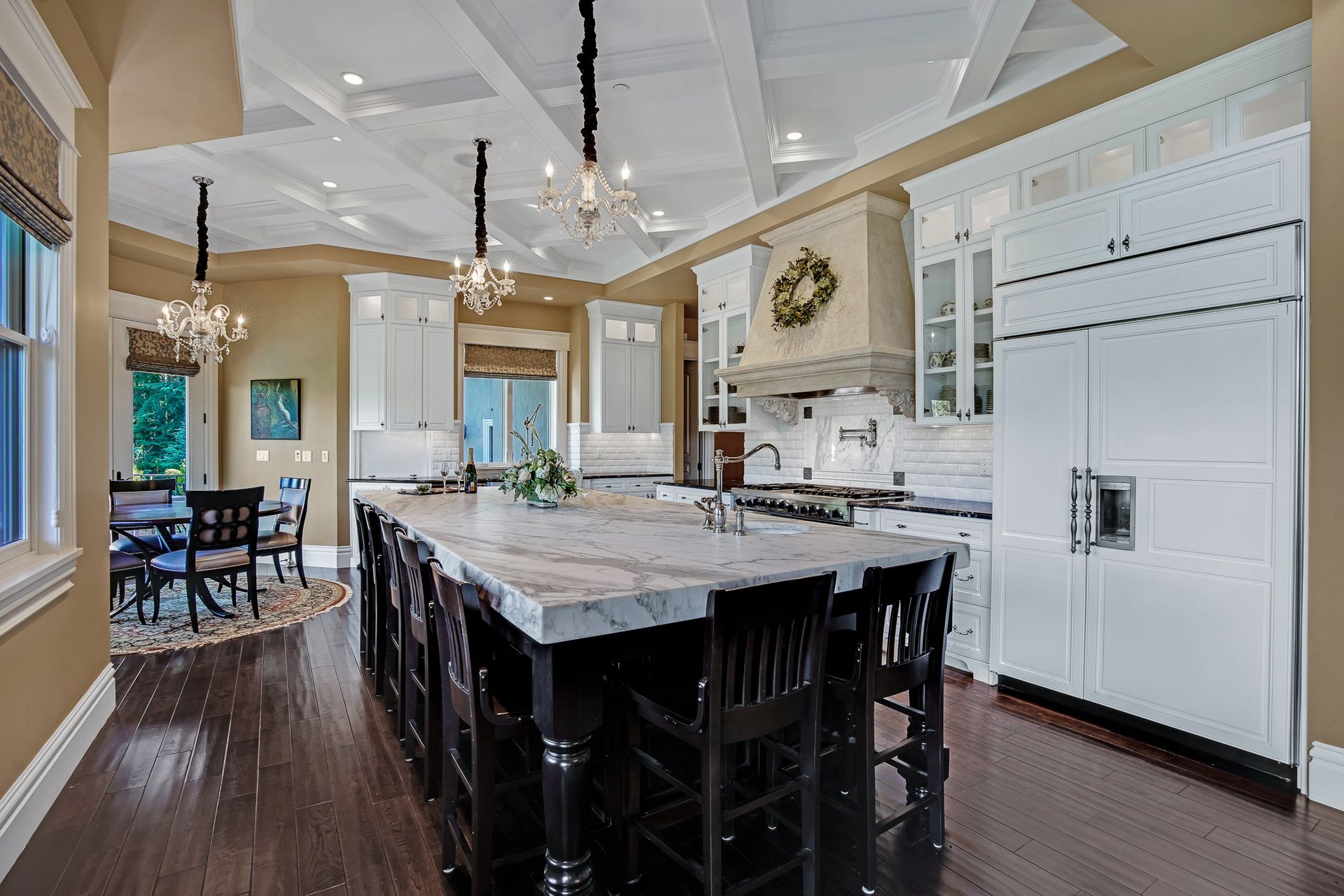 Indulge your culinary passions in the gourmet kitchen, where a 6-burner Wolf range, pot filler, Subzero refrigerator, and not one, but two dishwashers await. The Carrera marble island countertop adds a touch of luxury to every meal preparation.